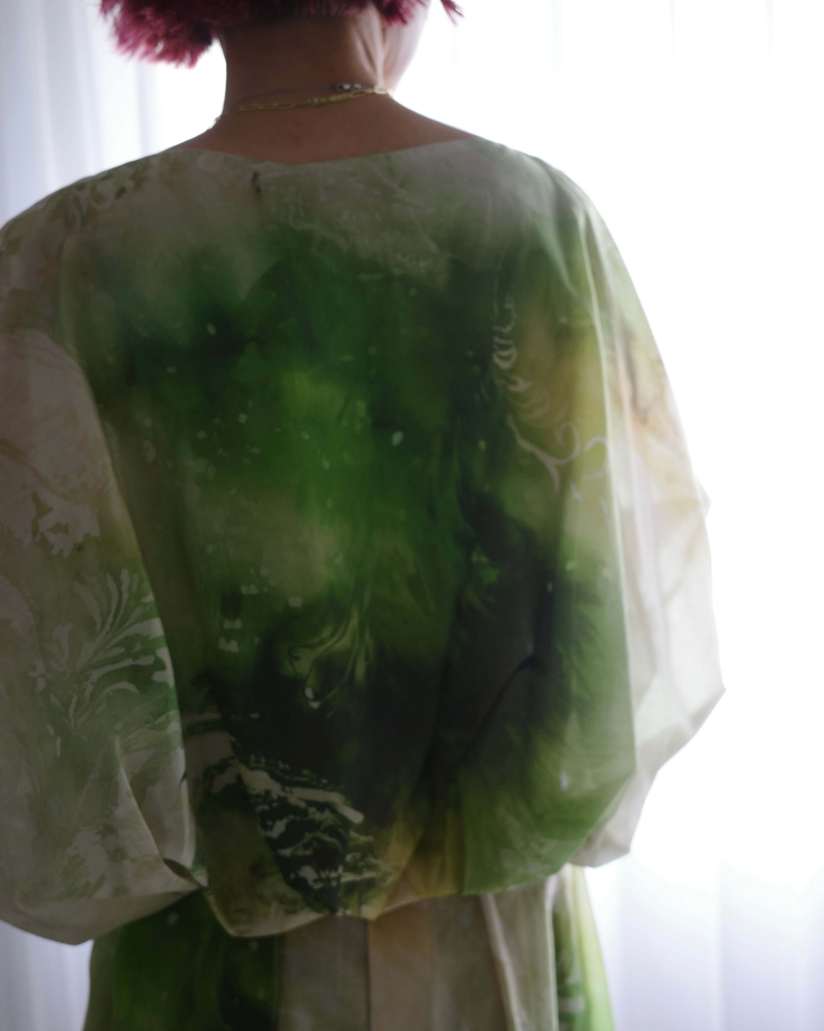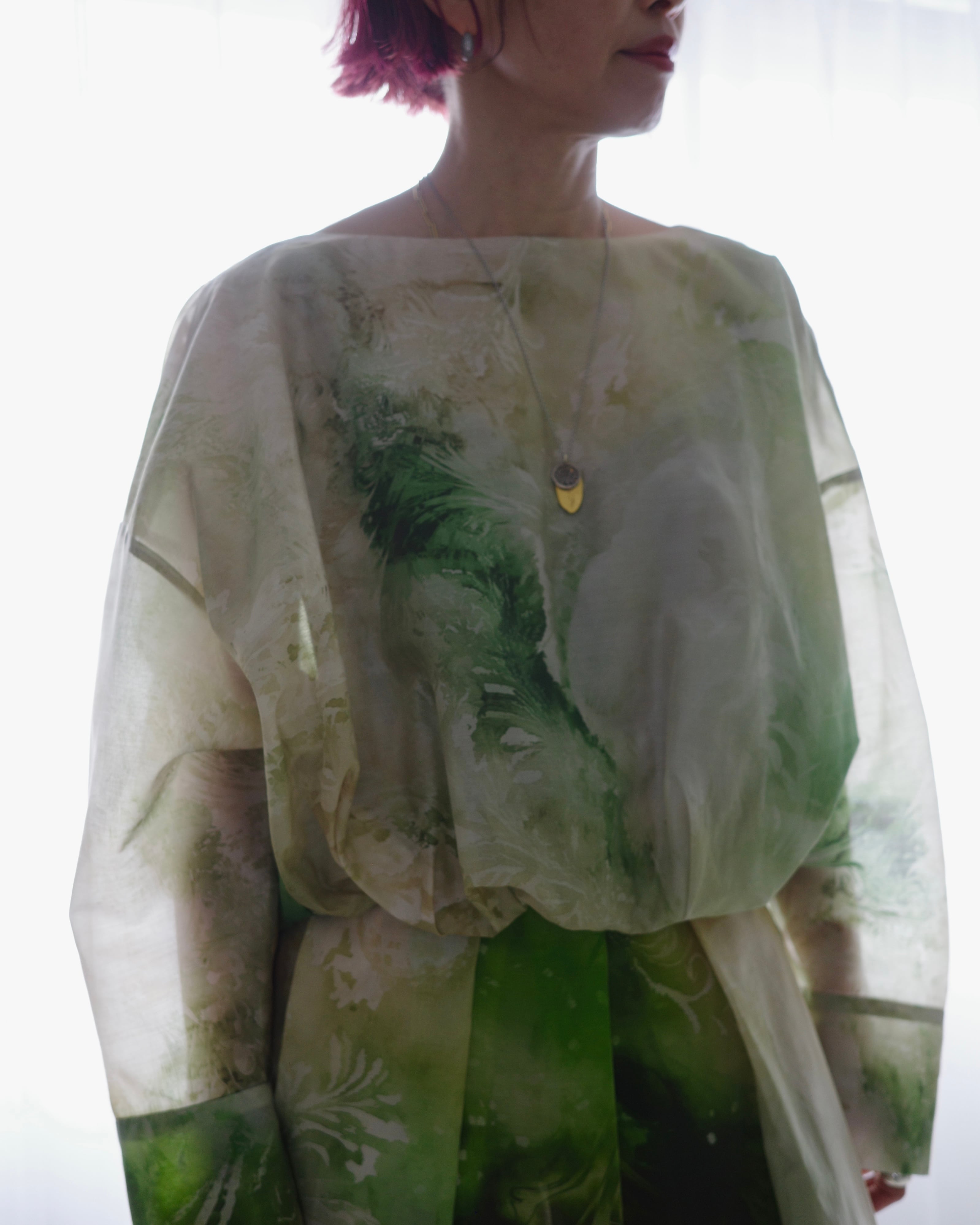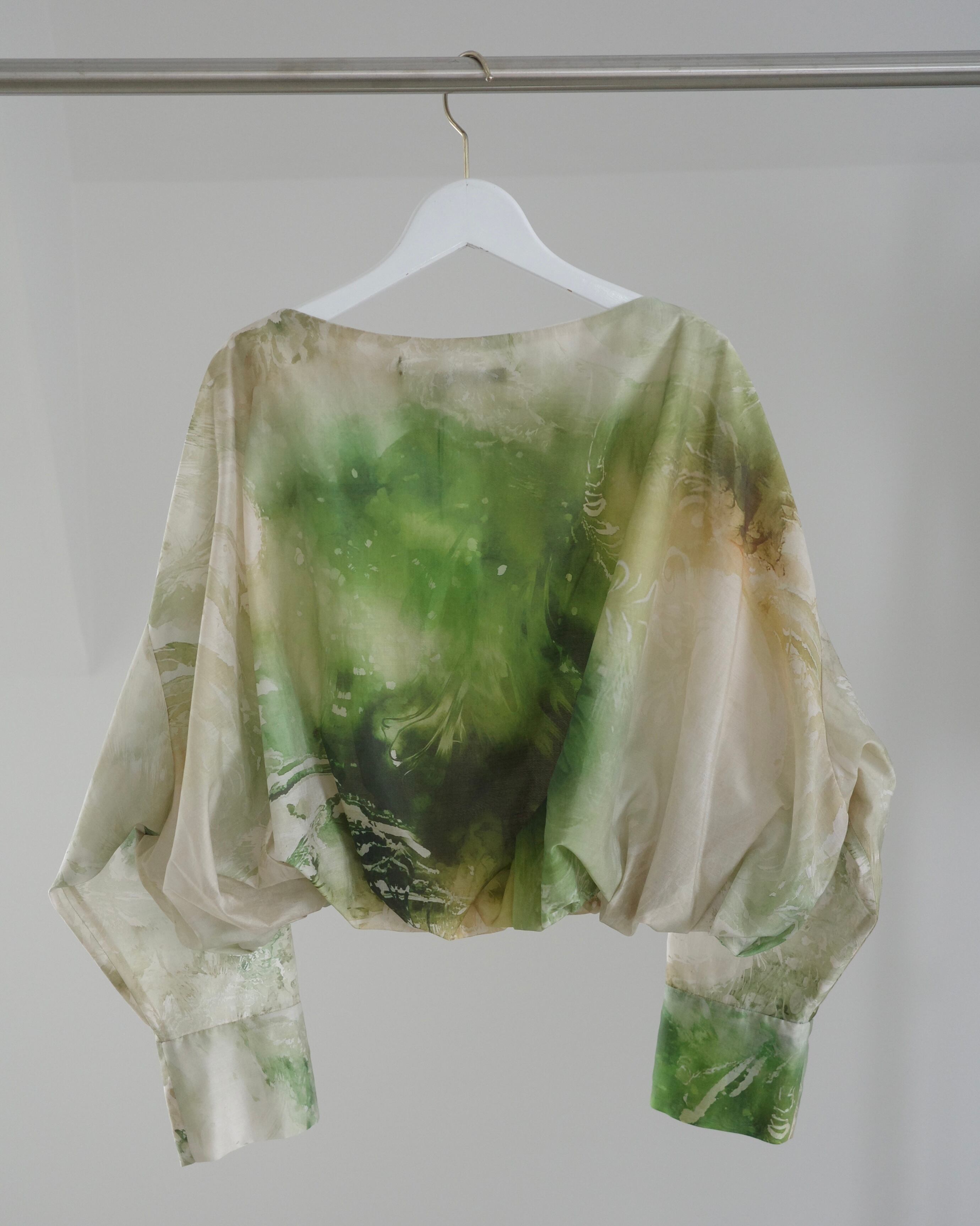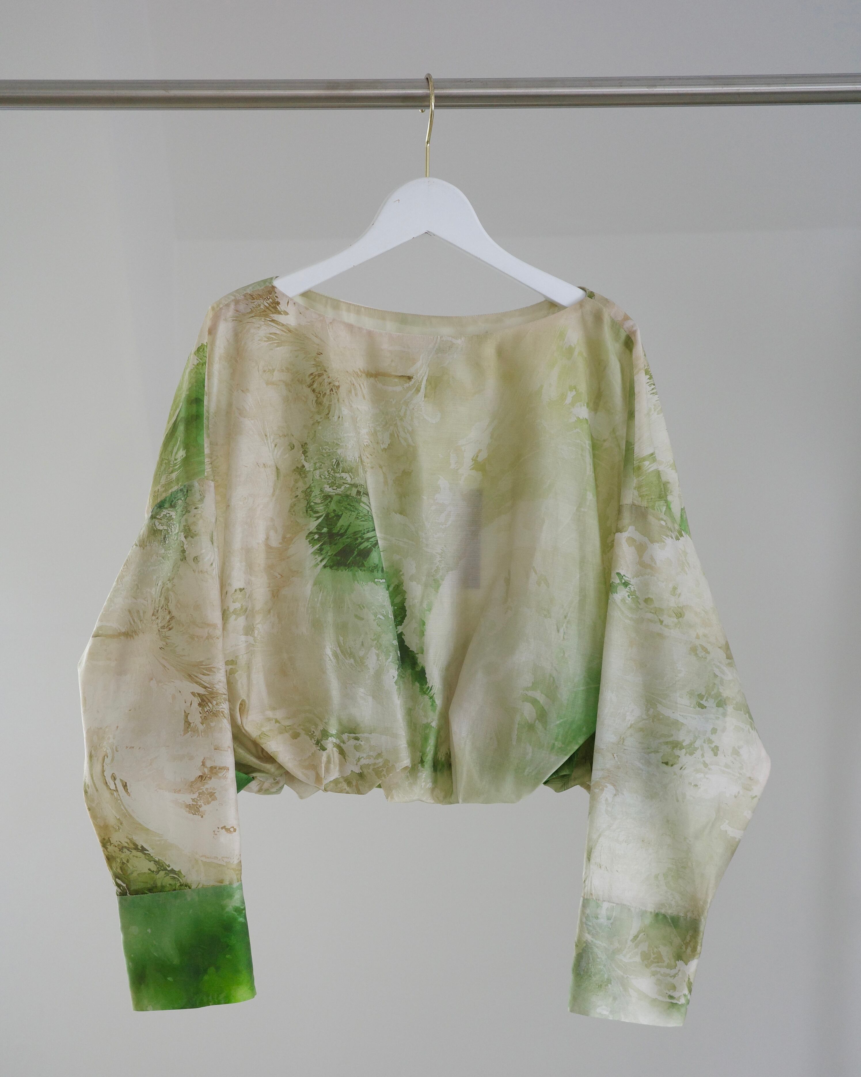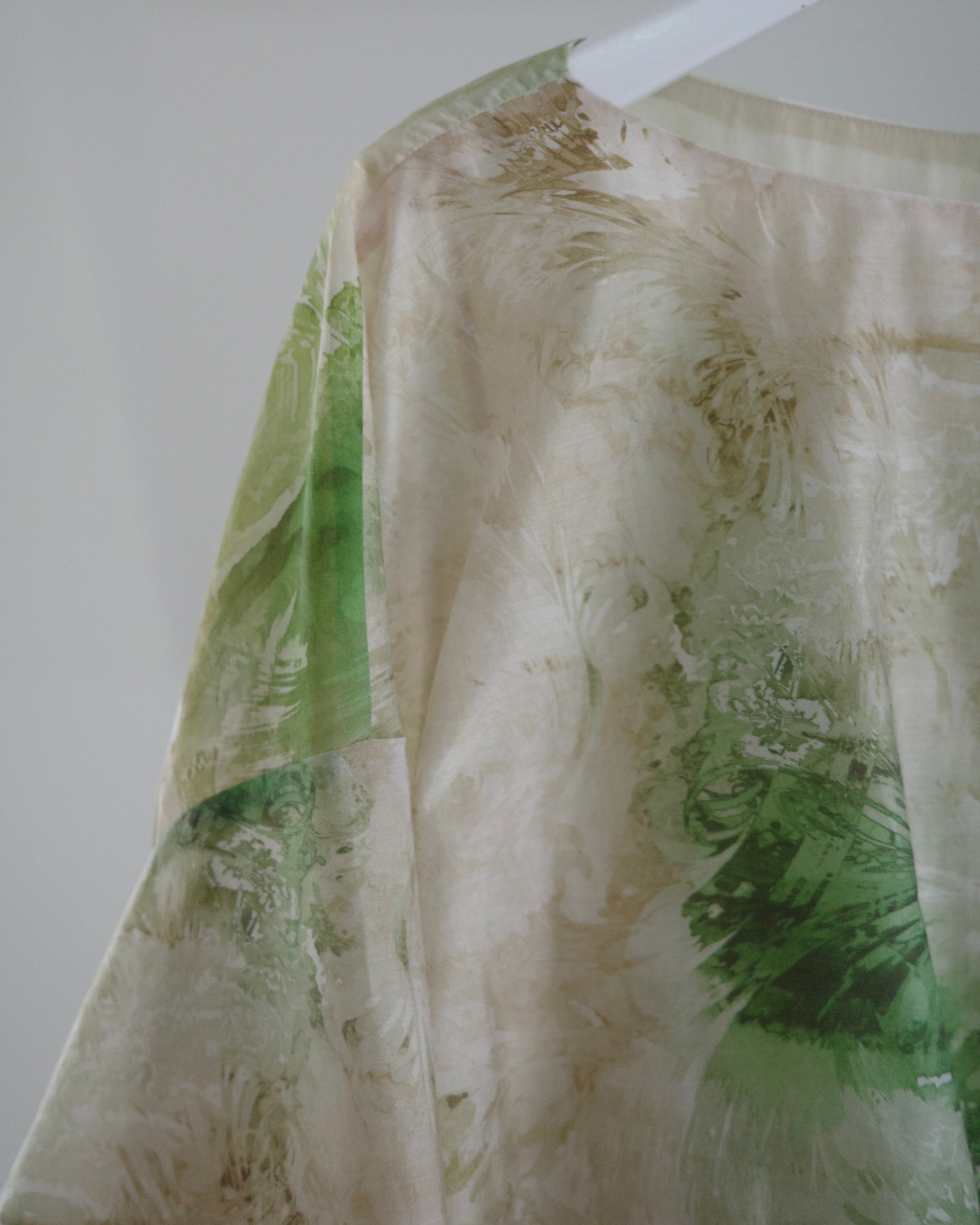 滑らかで艶やかなポリエステル素材に、ペイズリー柄がマーブリングのように溶け出した印象のアートワークをのせたトップス。