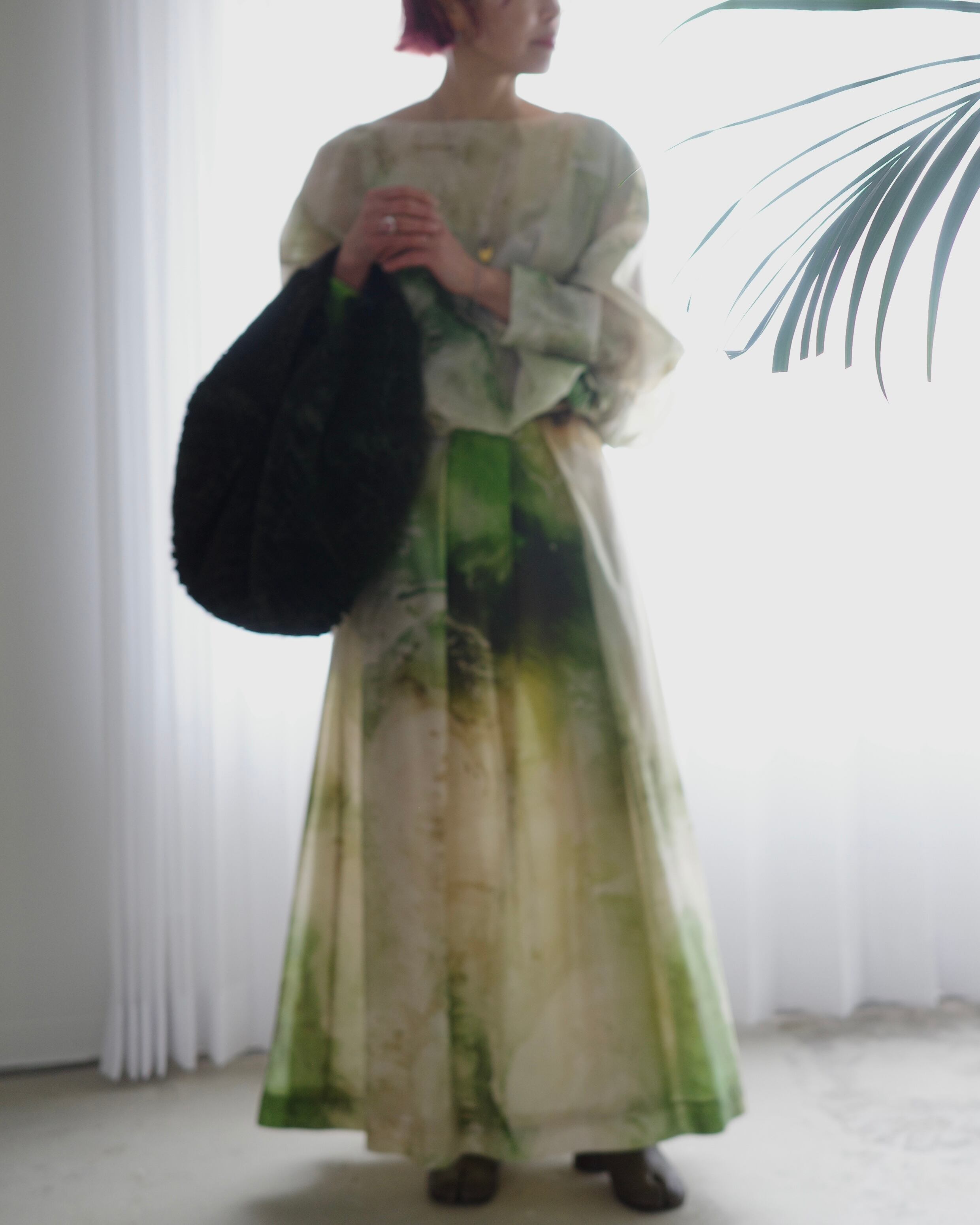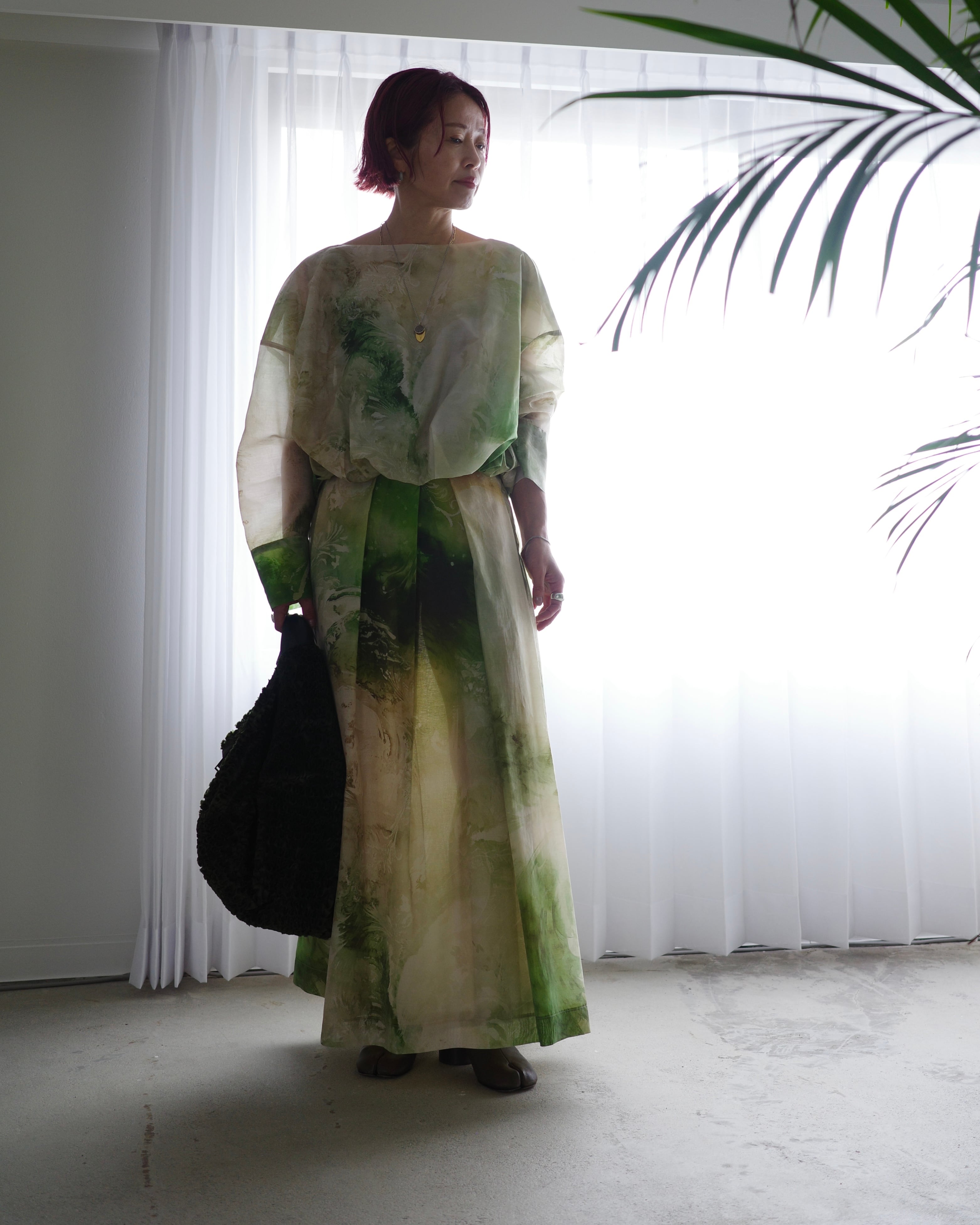 軽やかな素材感と抽象的なグラフィックが、一枚でスタイルを完成させる存在感を持っています。