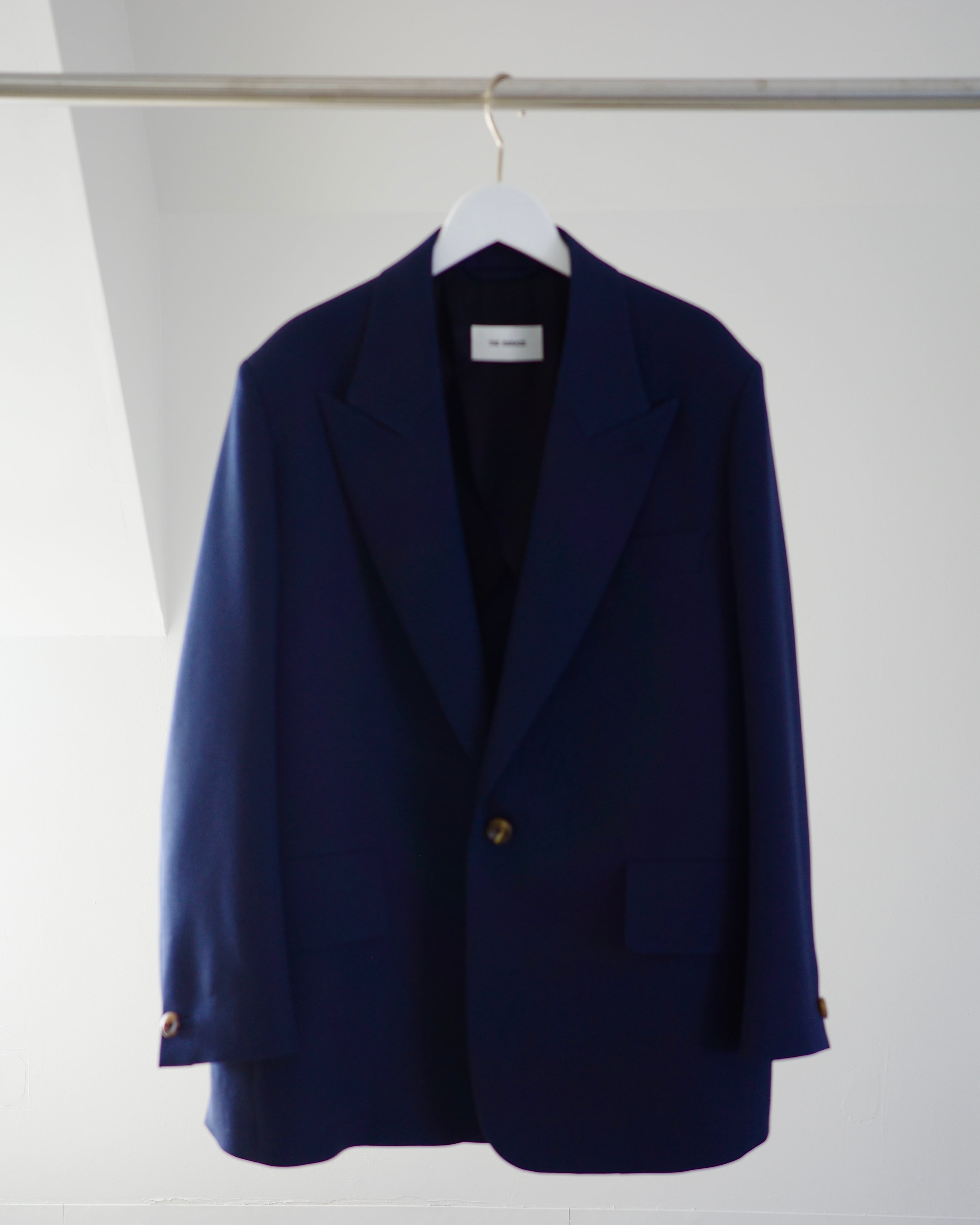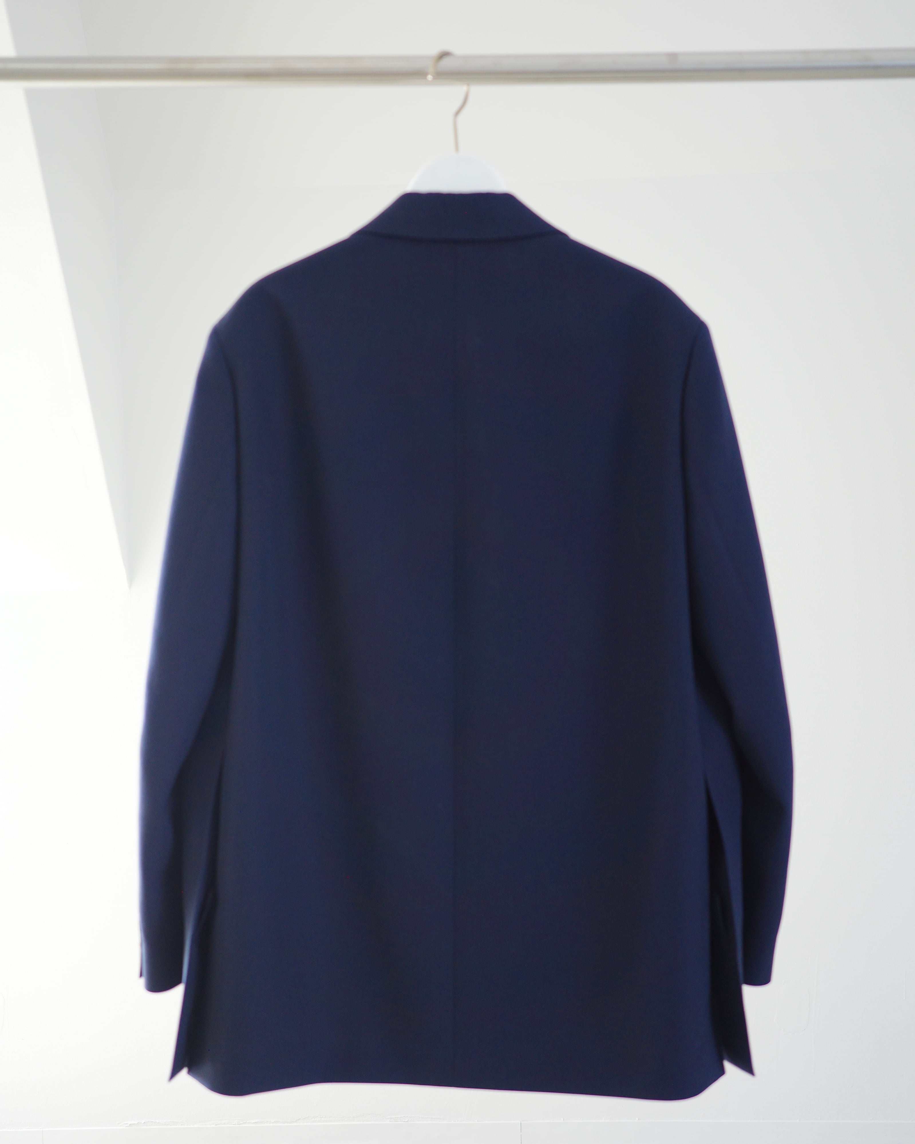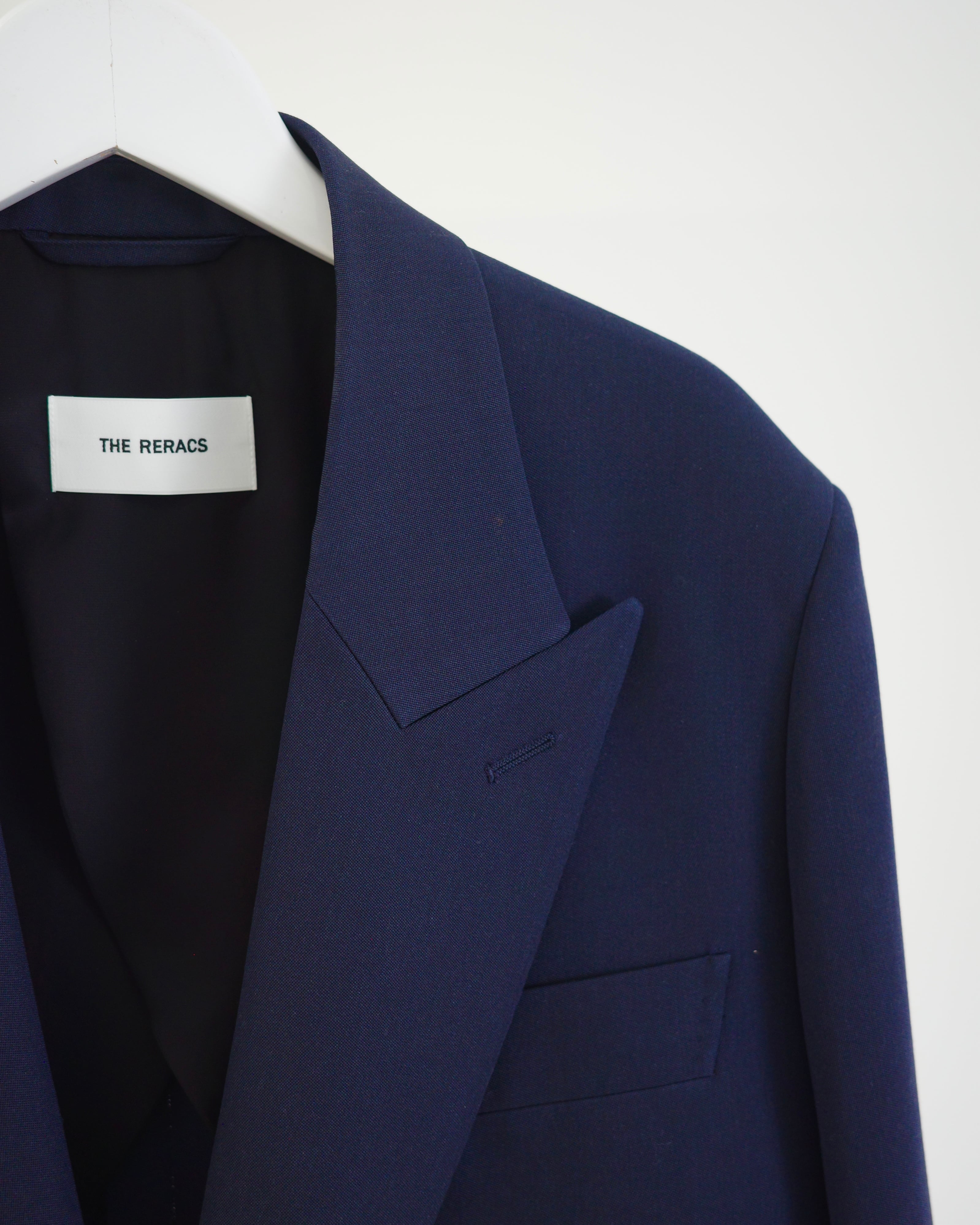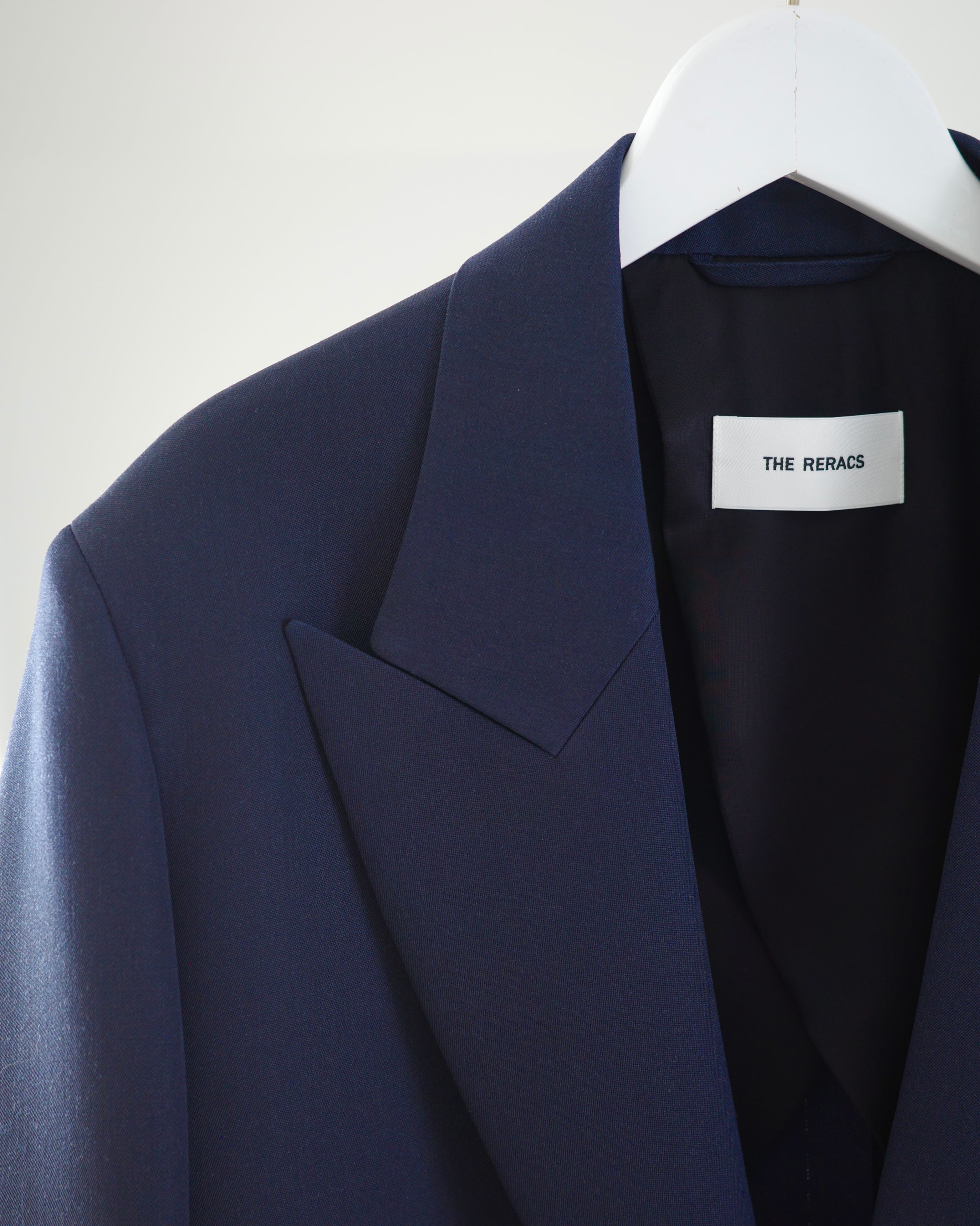 THE RERACSを象徴するテーラードカテゴリーから、クラシックなピークドラペルジャケットを現代的に再構築したモデル。構築的なショルダーラインと、ウエストを美しくシェイプさせた立体的なパターンが特徴です。上襟にはややワイドなピークドラペルを採用し、フォーマルな印象の中に力強さを宿したデザイン。フロントはやや低めのボタン位置と長めの着丈設定により、重心の安定したエレガントな佇まいを実現しています。素材には、ブランド独自開発によるウールバラシャ素材を使用。軽やかさと滑らかな光沢感を両立した、シーズンを問わず快適に着用可能です。モダンなフィッティングでありながら、クラシックの構築美を失わないTHE RERACSらしい一着です。