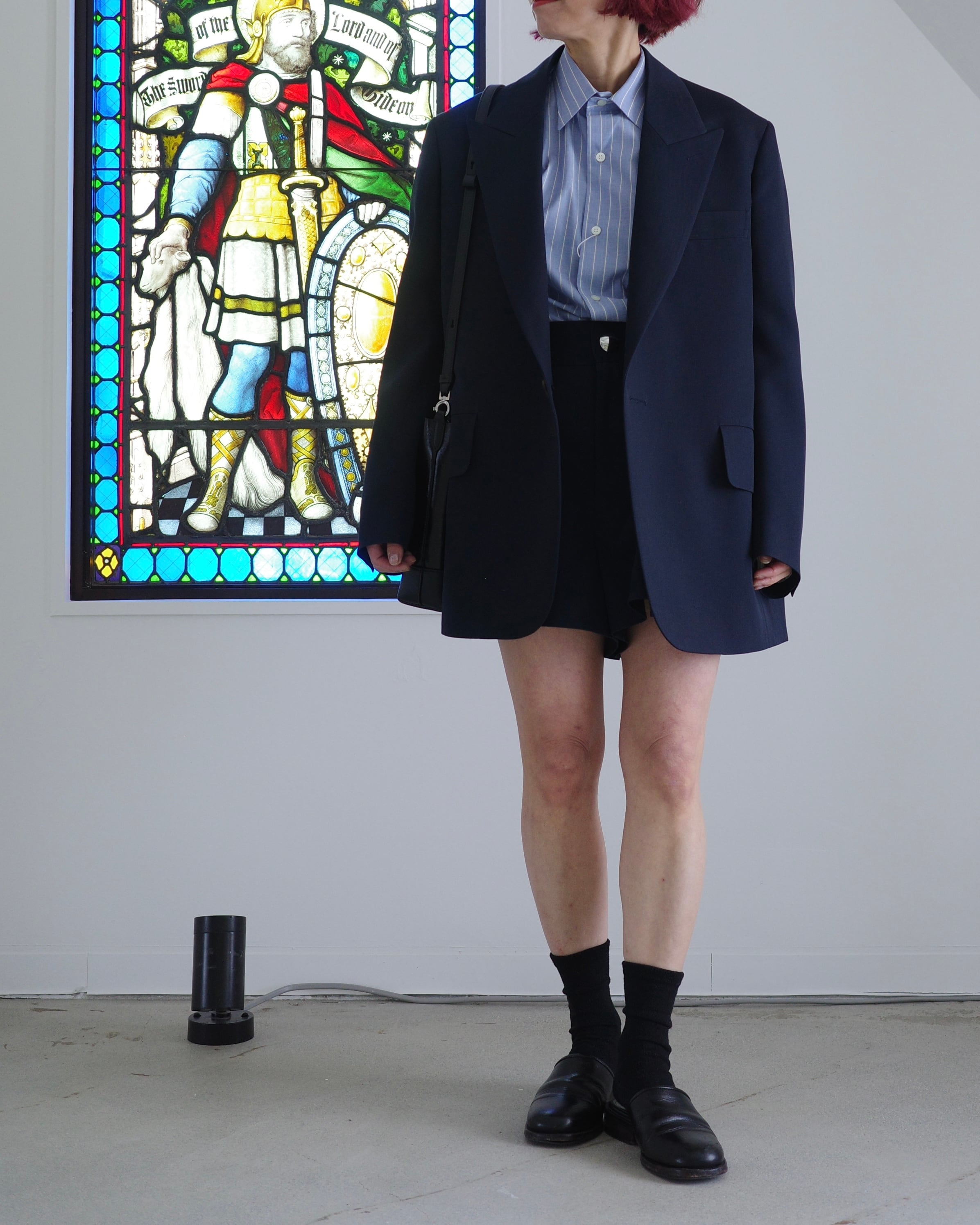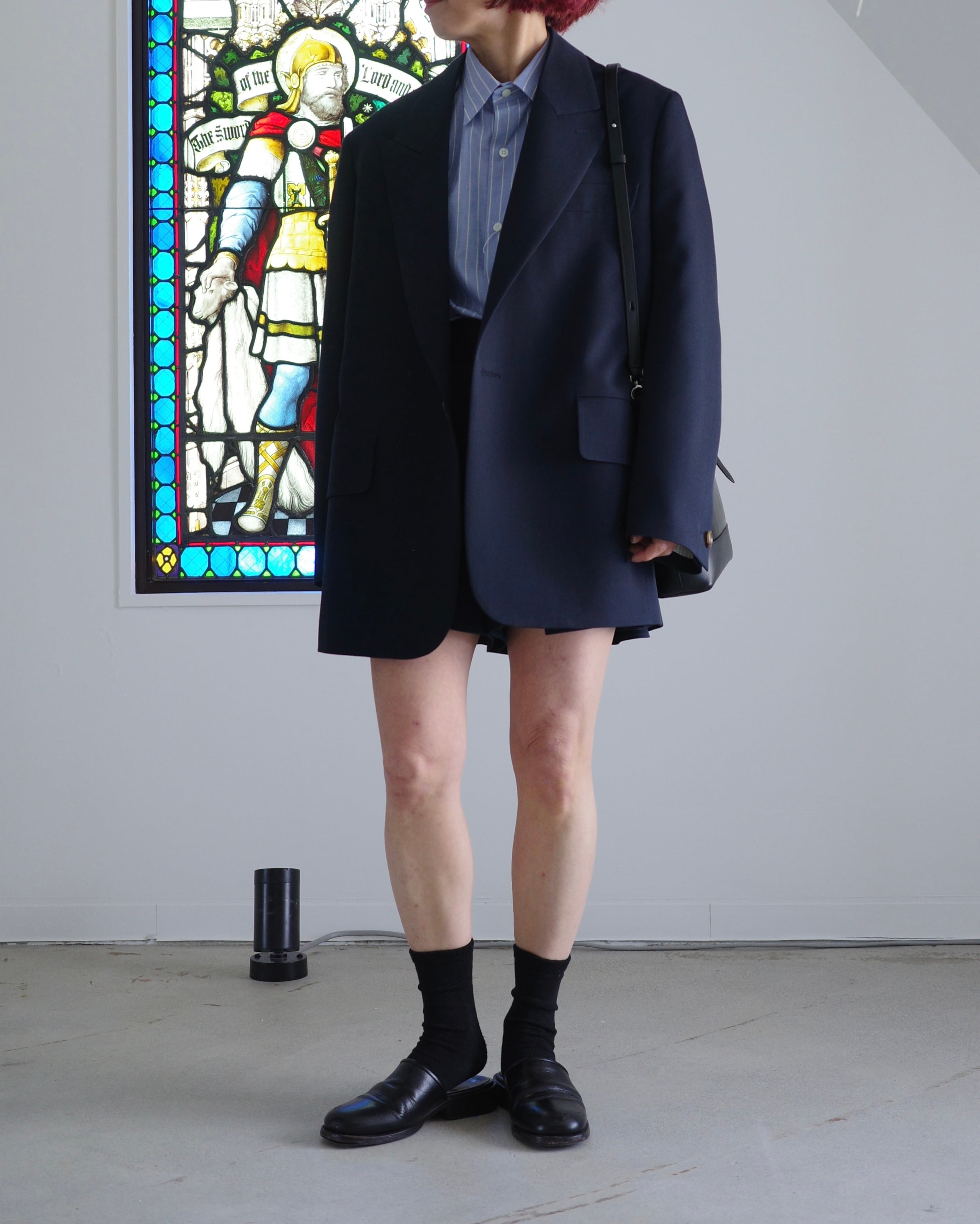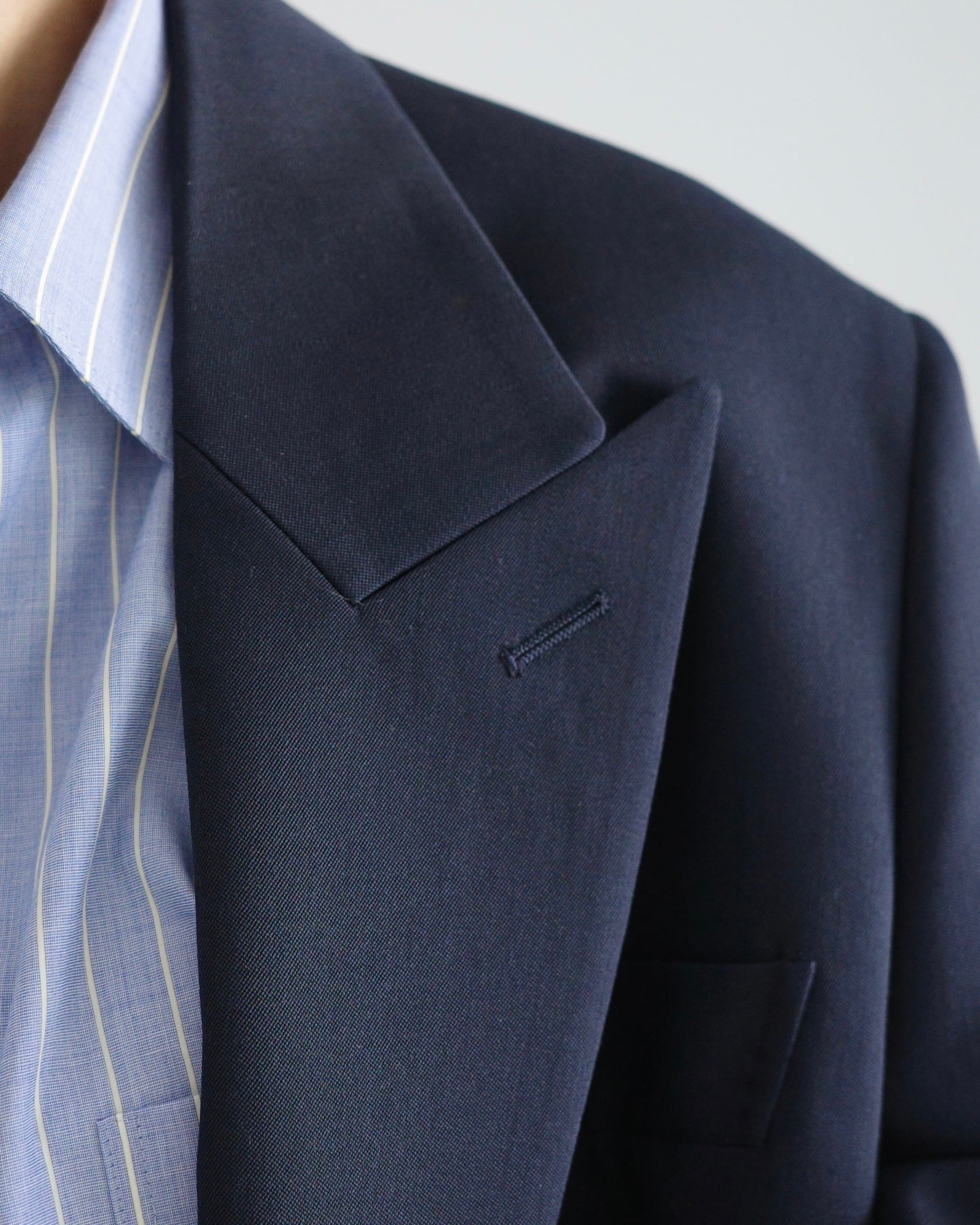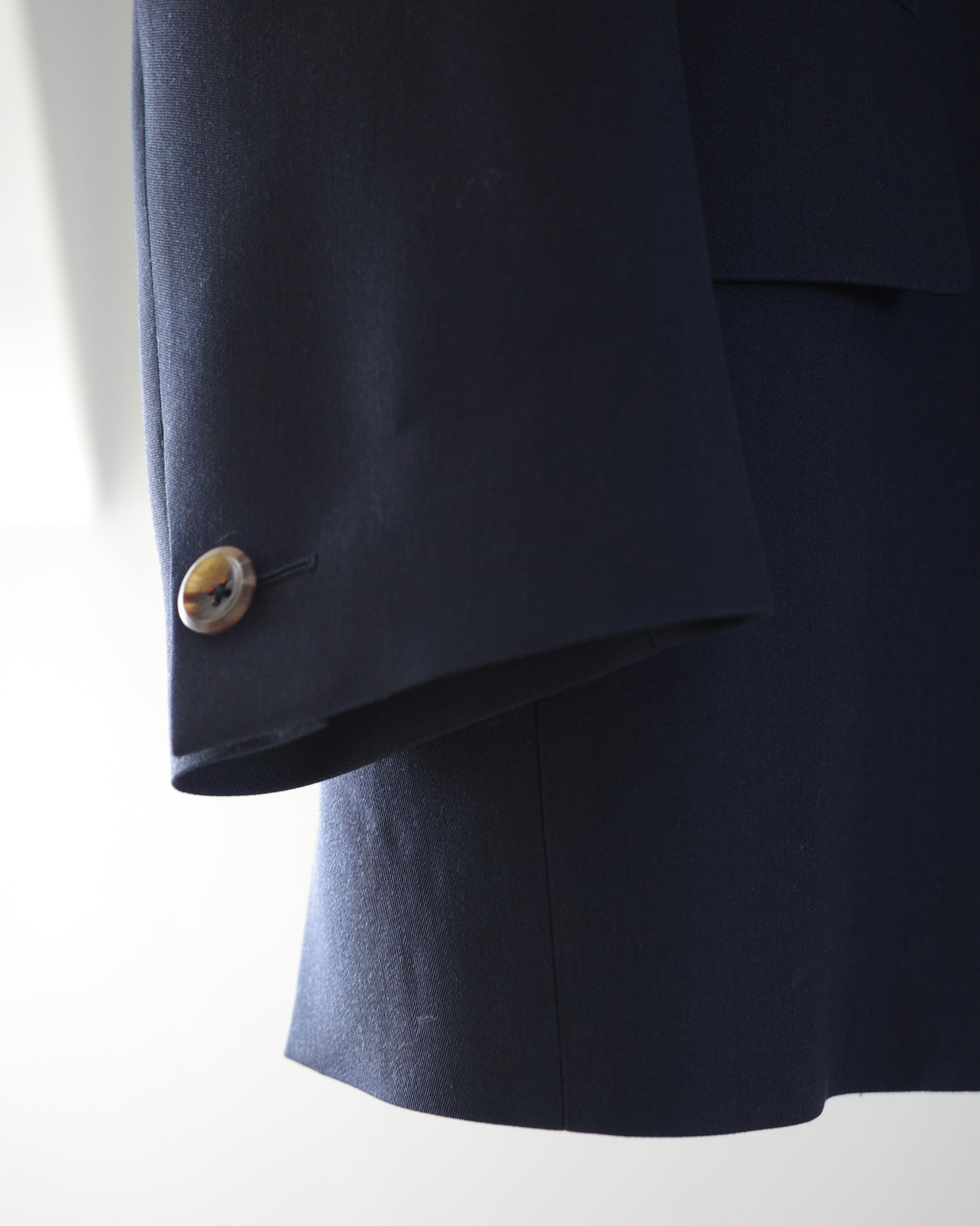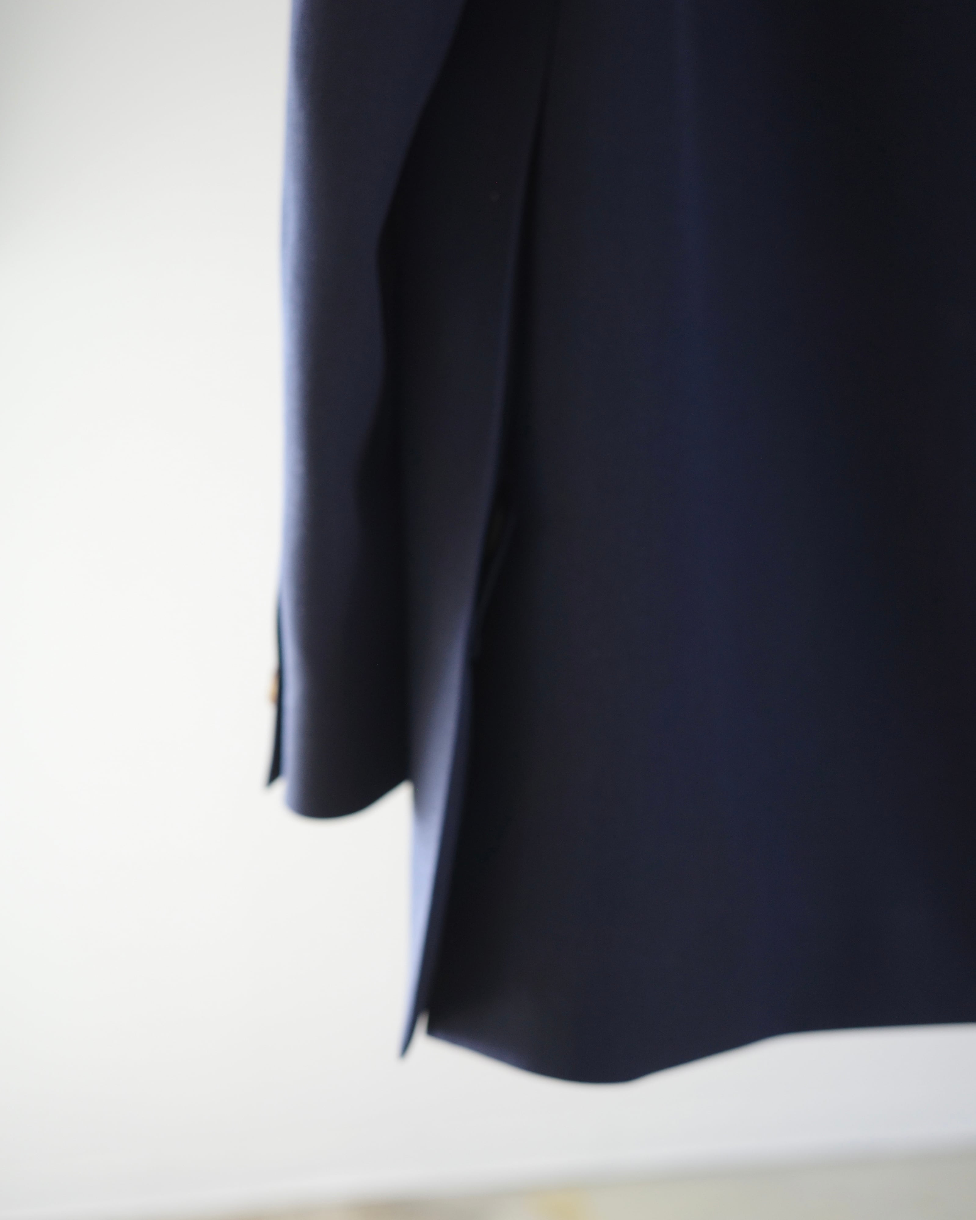 THE RERACSを象徴するテーラードカテゴリーから、クラシックなピークドラペルジャケットを現代的に再構築したモデル。構築的なショルダーラインと、ウエストを美しくシェイプさせた立体的なパターンが特徴です。上襟にはややワイドなピークドラペルを採用し、フォーマルな印象の中に力強さを宿したデザイン。フロントはやや低めのボタン位置と長めの着丈設定により、重心の安定したエレガントな佇まいを実現しています。素材には、ブランド独自開発によるウールバラシャ素材を使用。軽やかさと滑らかな光沢感を両立した、シーズンを問わず快適に着用可能です。モダンなフィッティングでありながら、クラシックの構築美を失わないTHE RERACSらしい一着です。