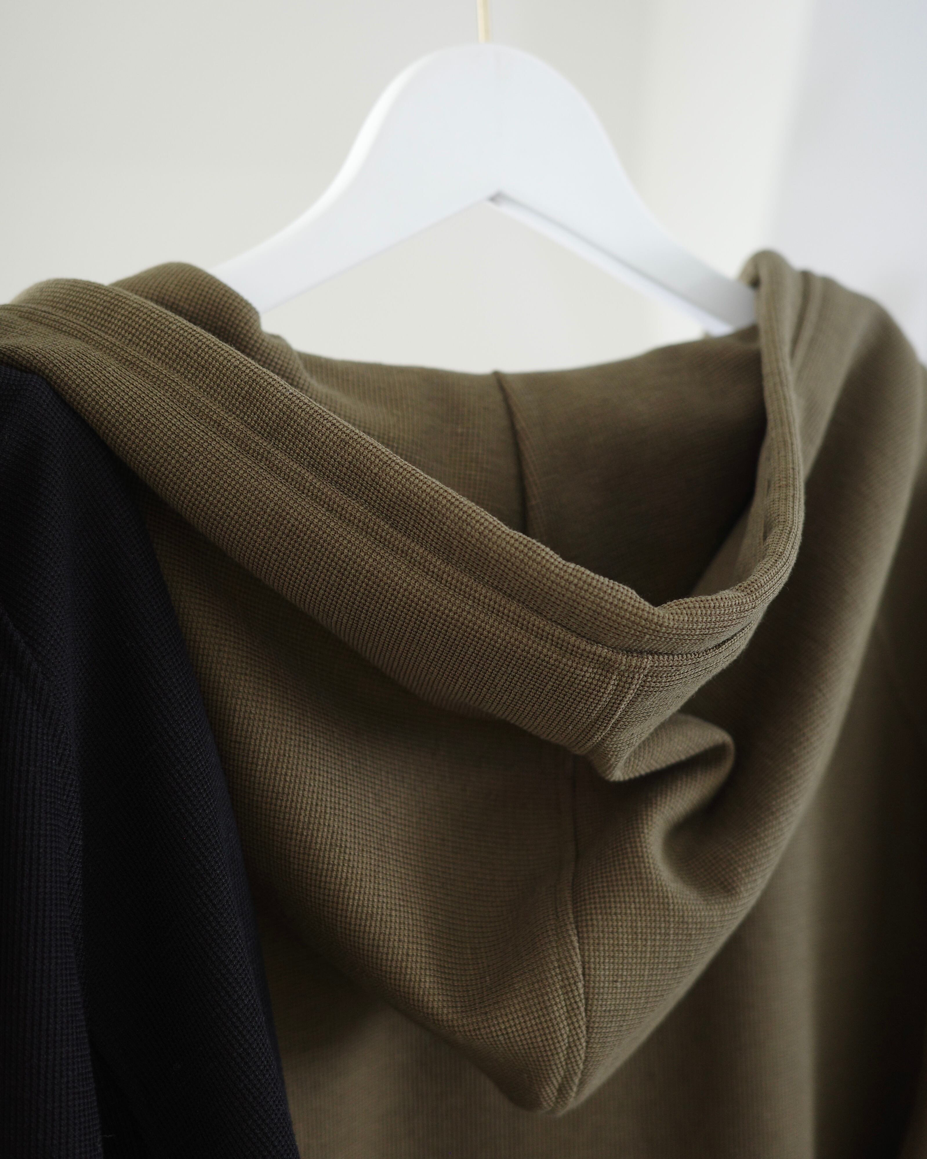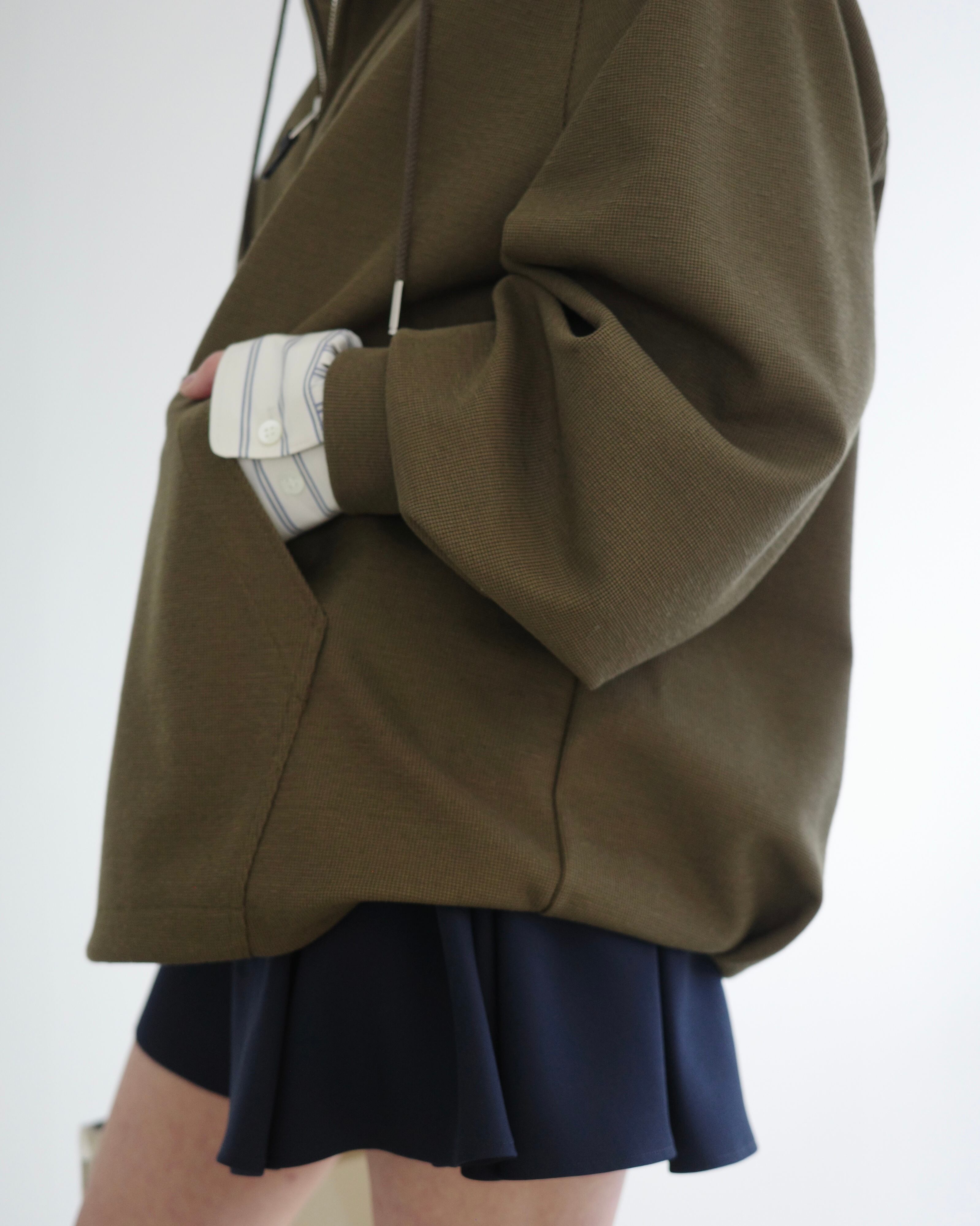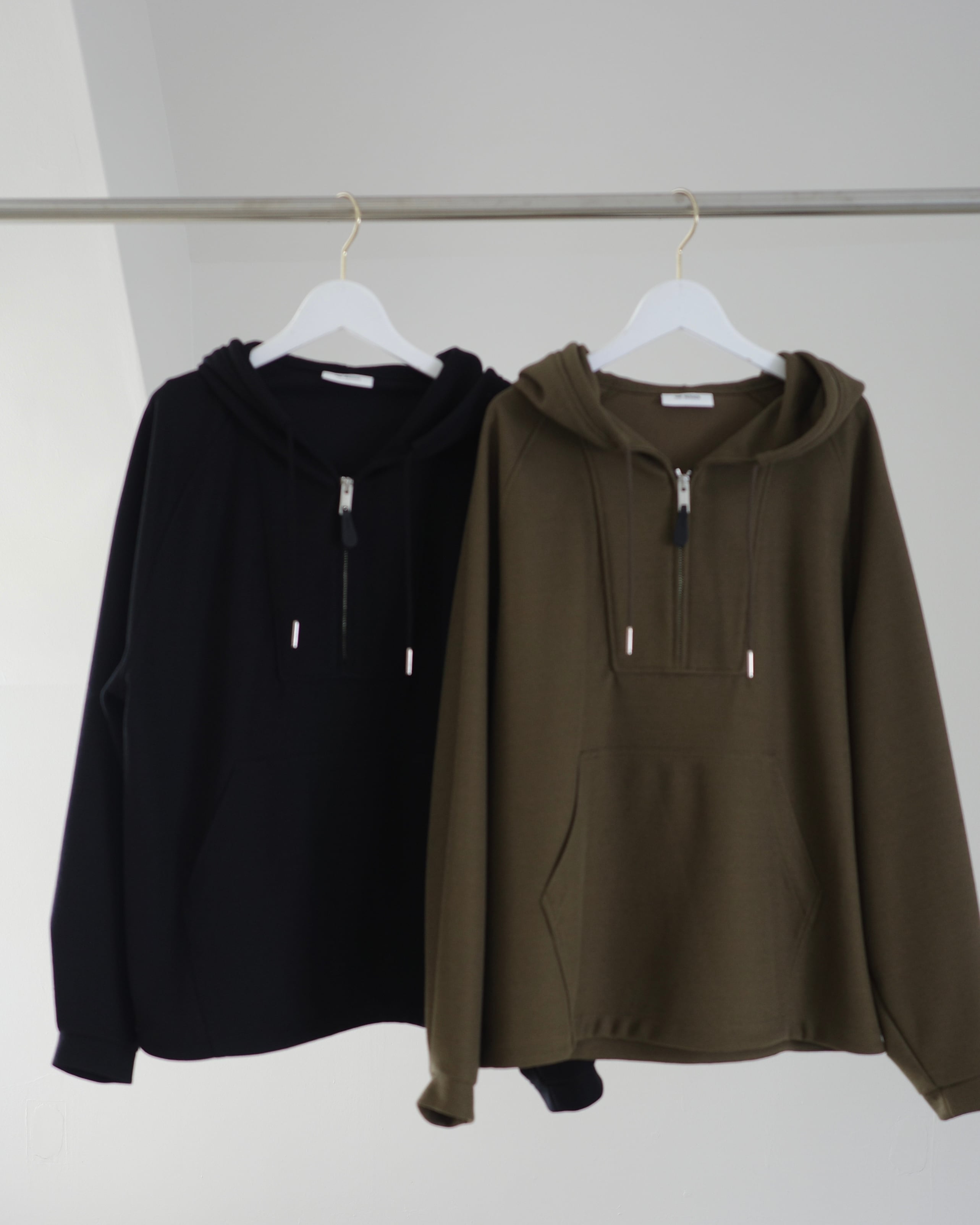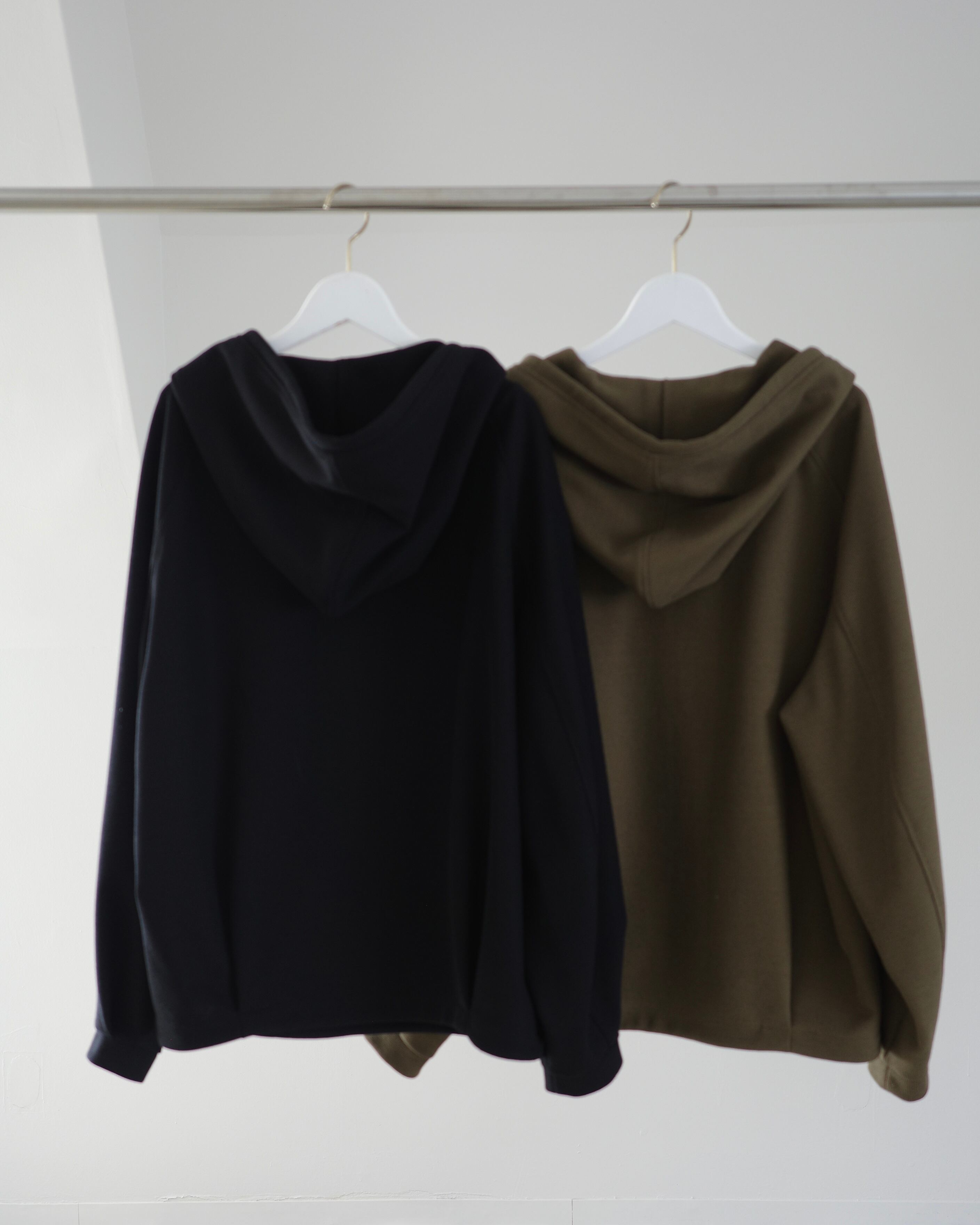 上質なコットンとラミーを組み合わせた素材は、真珠のように艶やかでシルキーな光沢を放ち、シンプルながらも高級感を漂わせます。フードは衿元から自然に広がり、シンプルなカンガルーポケットがデザインのアクセントに。ジップアップのデザインにより、簡単に着脱でき、スタイルを自由に調整できるのも魅力です。袖丈は少し長めに設定されており、腕に沿って優雅にドレープが生まれ、袖口にはタックが施されて立体感を演出します。ラグランスリーブデザインにより、肩ラインはカジュアルすぎず、エレガントな印象に仕上がります。軽量でシワになりにくく、デイリーユースにも最適。快適な着心地とともに、スタイルアップを叶える一着です。