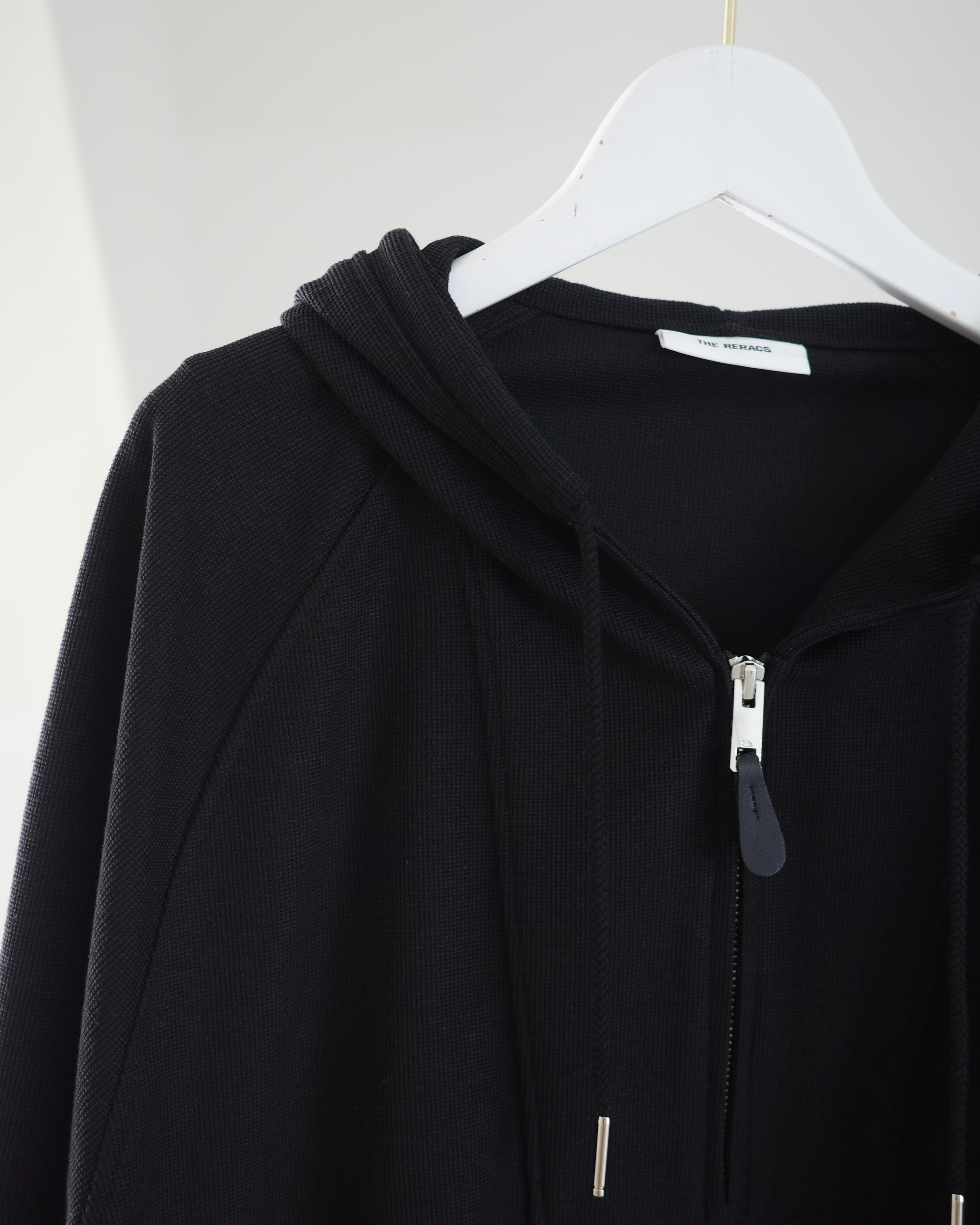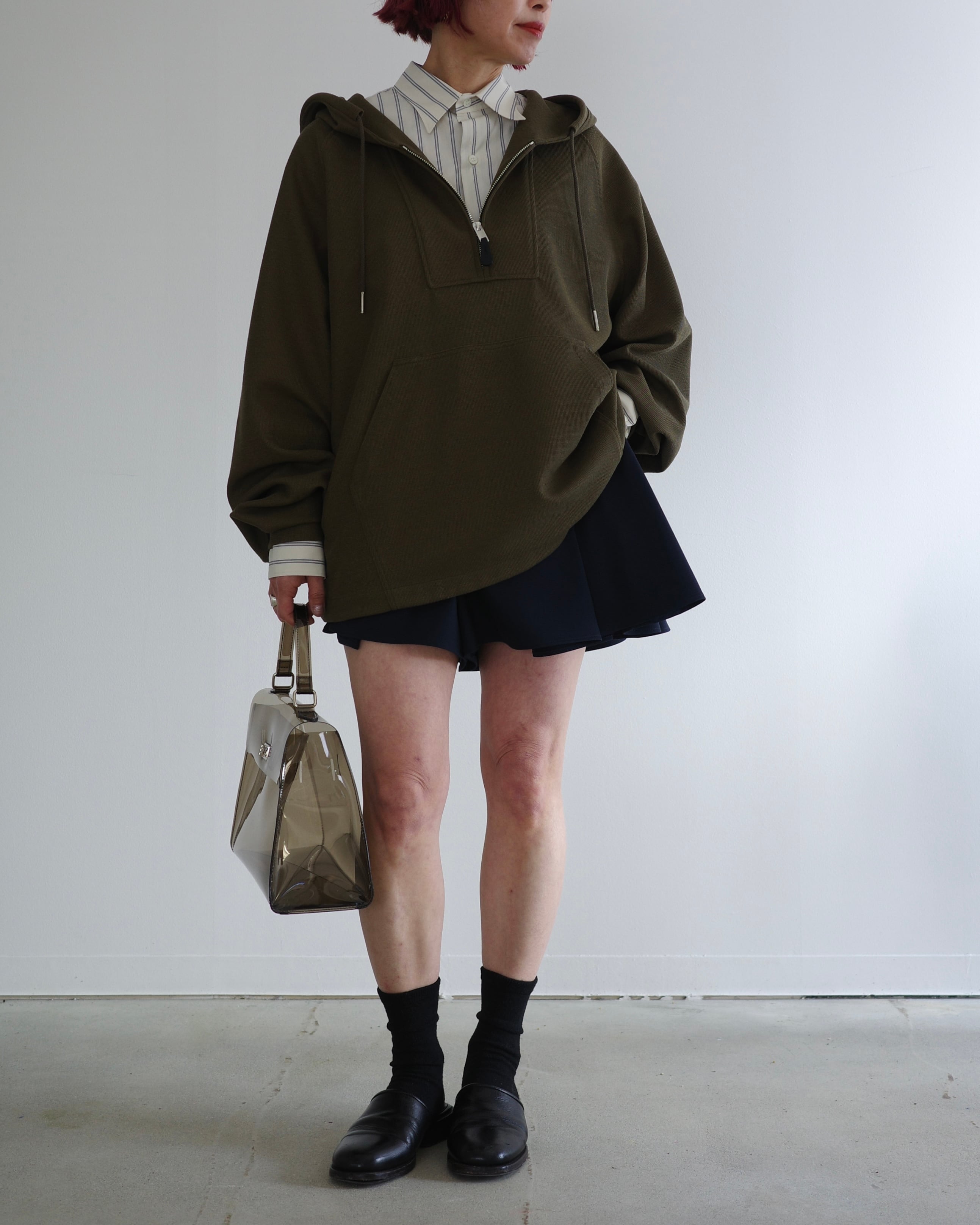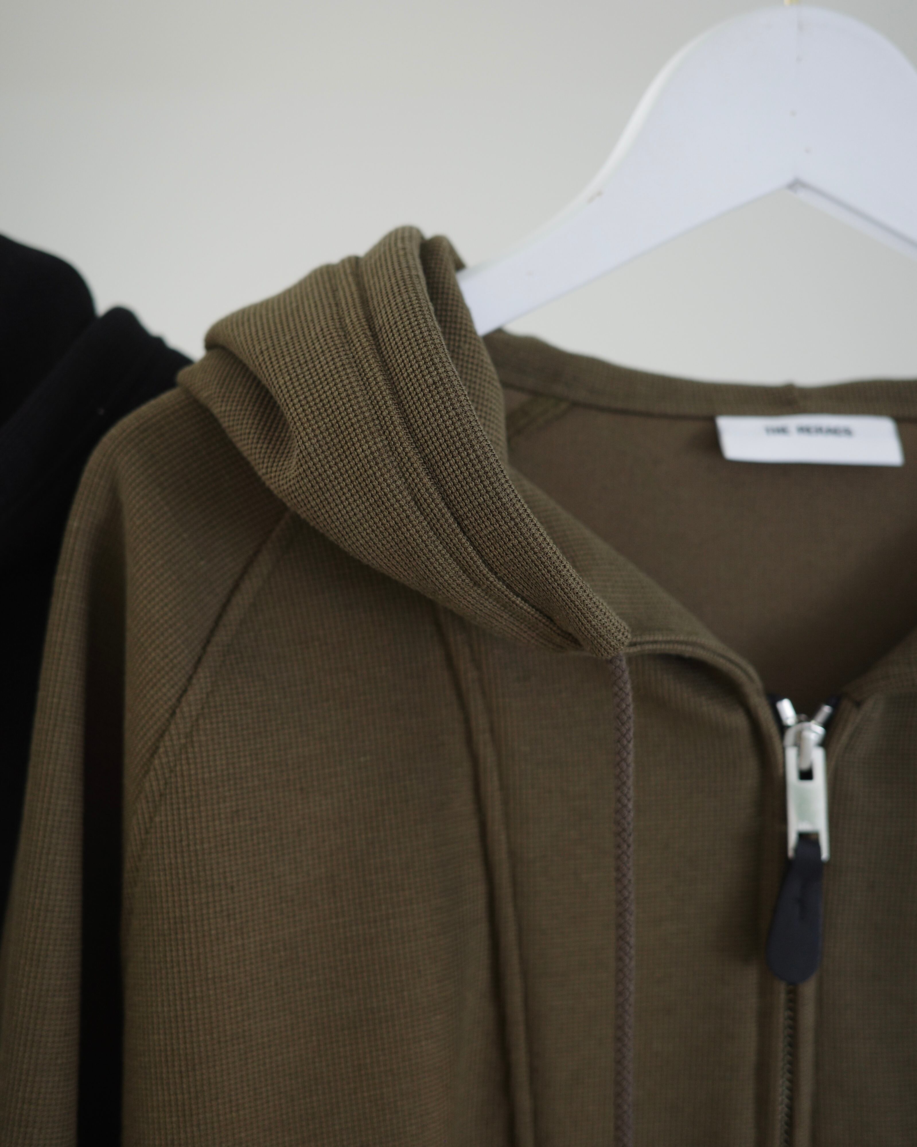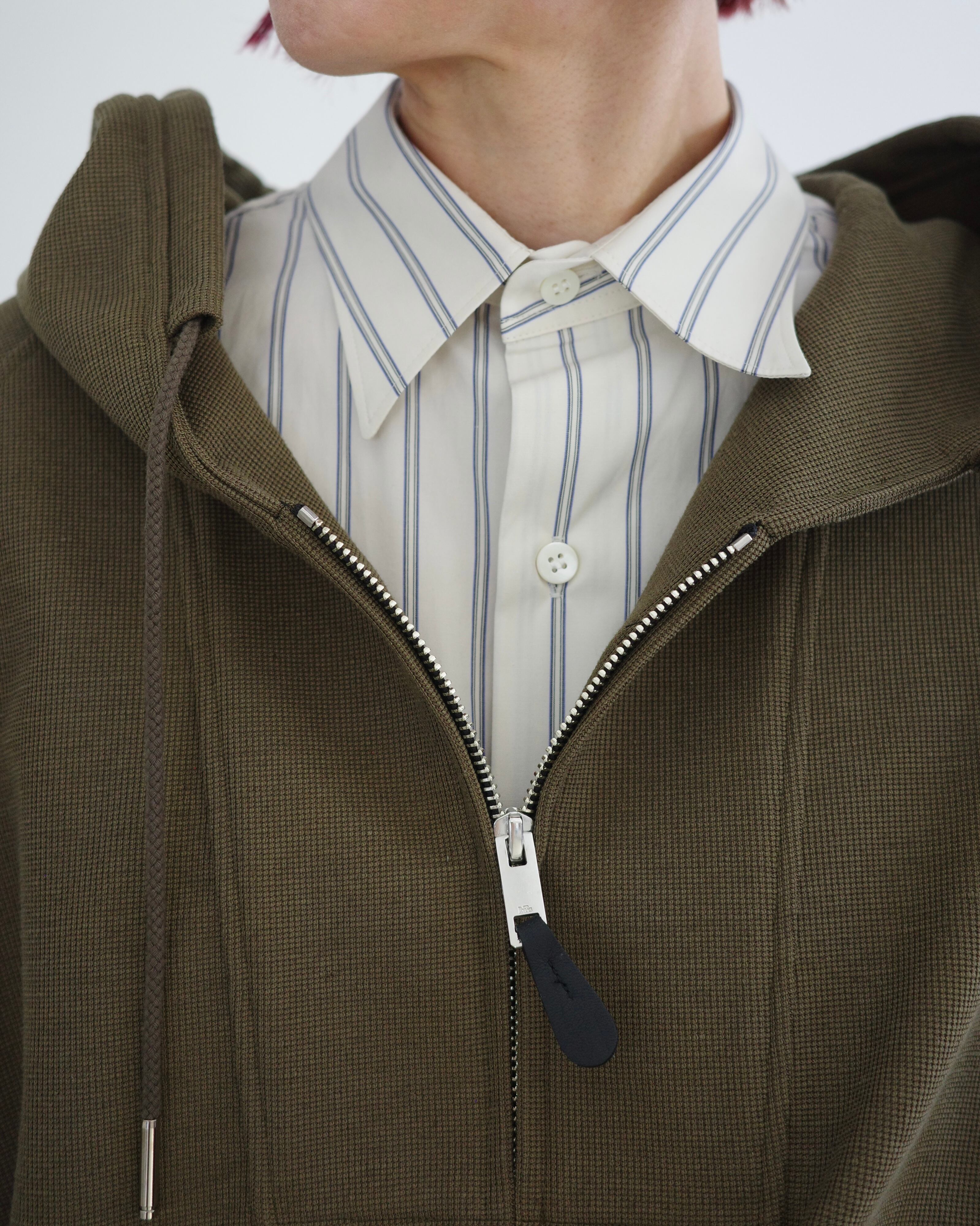 上質なコットンとラミーを組み合わせた素材は、真珠のように艶やかでシルキーな光沢を放ち、シンプルながらも高級感を漂わせます。フードは衿元から自然に広がり、シンプルなカンガルーポケットがデザインのアクセントに。ジップアップのデザインにより、簡単に着脱でき、スタイルを自由に調整できるのも魅力です。袖丈は少し長めに設定されており、腕に沿って優雅にドレープが生まれ、袖口にはタックが施されて立体感を演出します。ラグランスリーブデザインにより、肩ラインはカジュアルすぎず、エレガントな印象に仕上がります。軽量でシワになりにくく、デイリーユースにも最適。快適な着心地とともに、スタイルアップを叶える一着です。