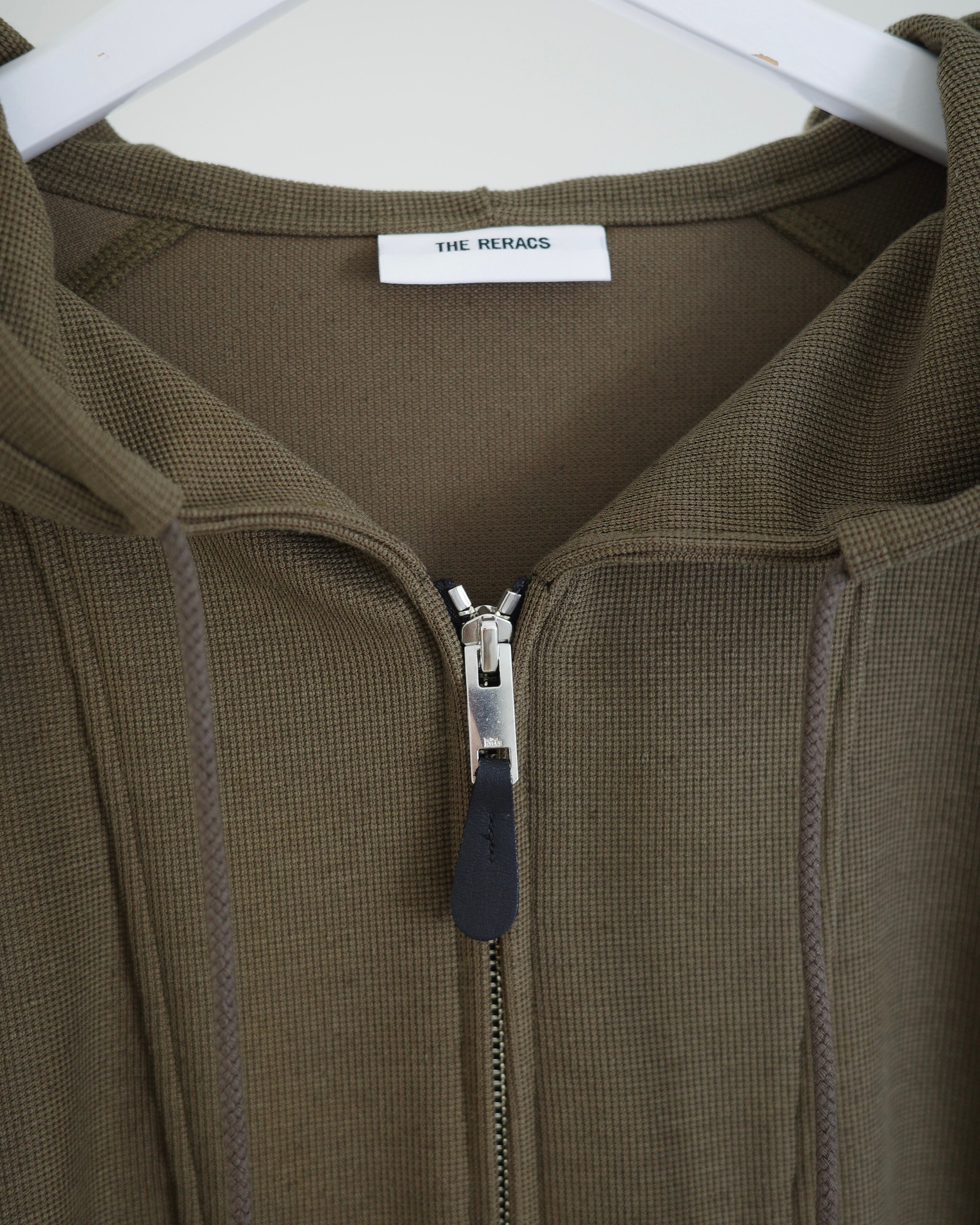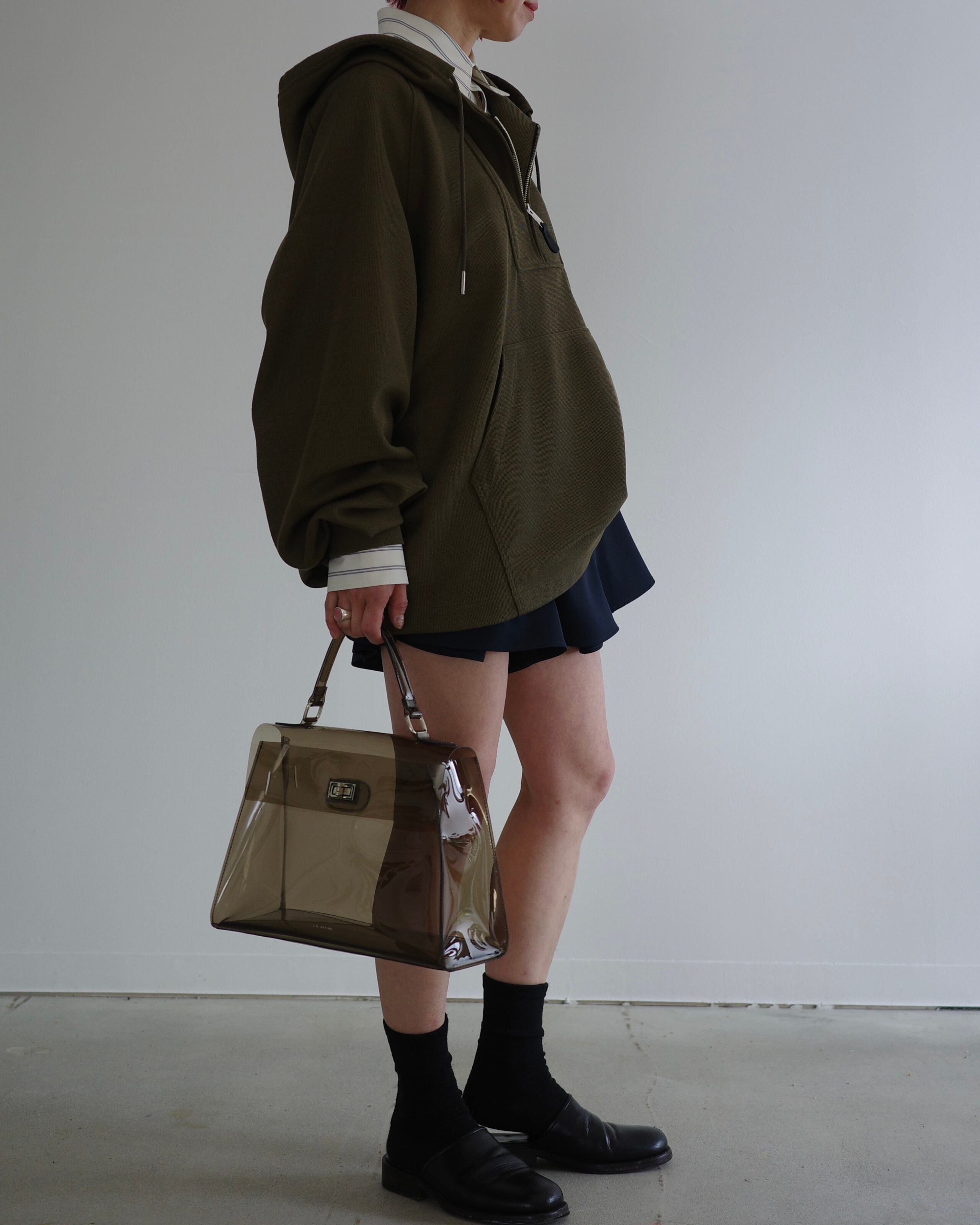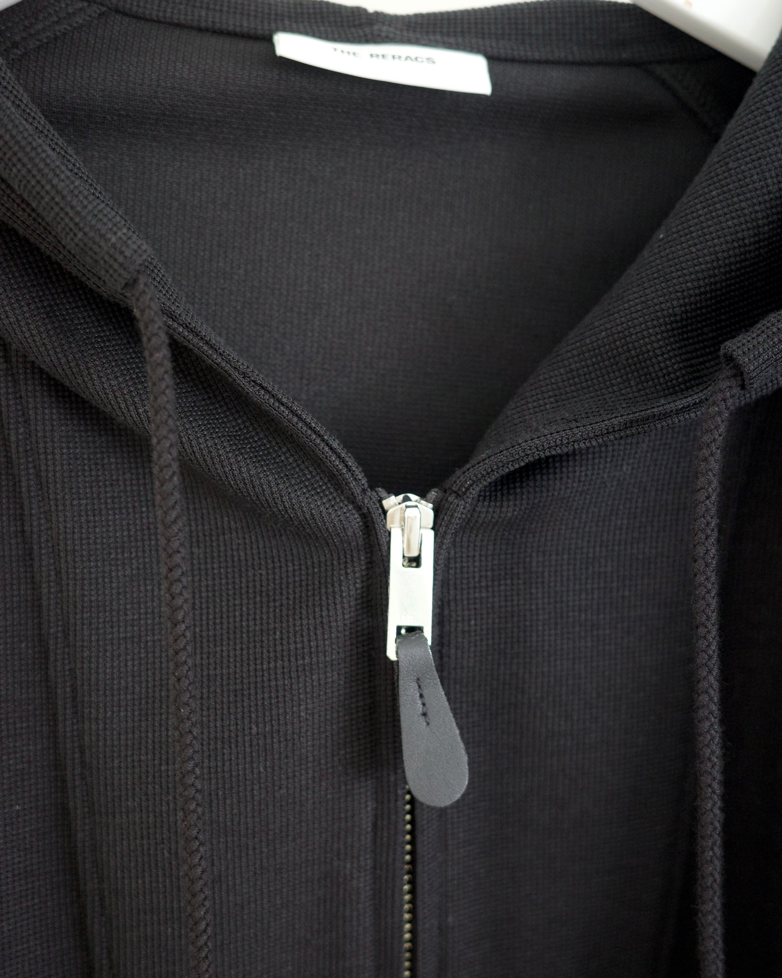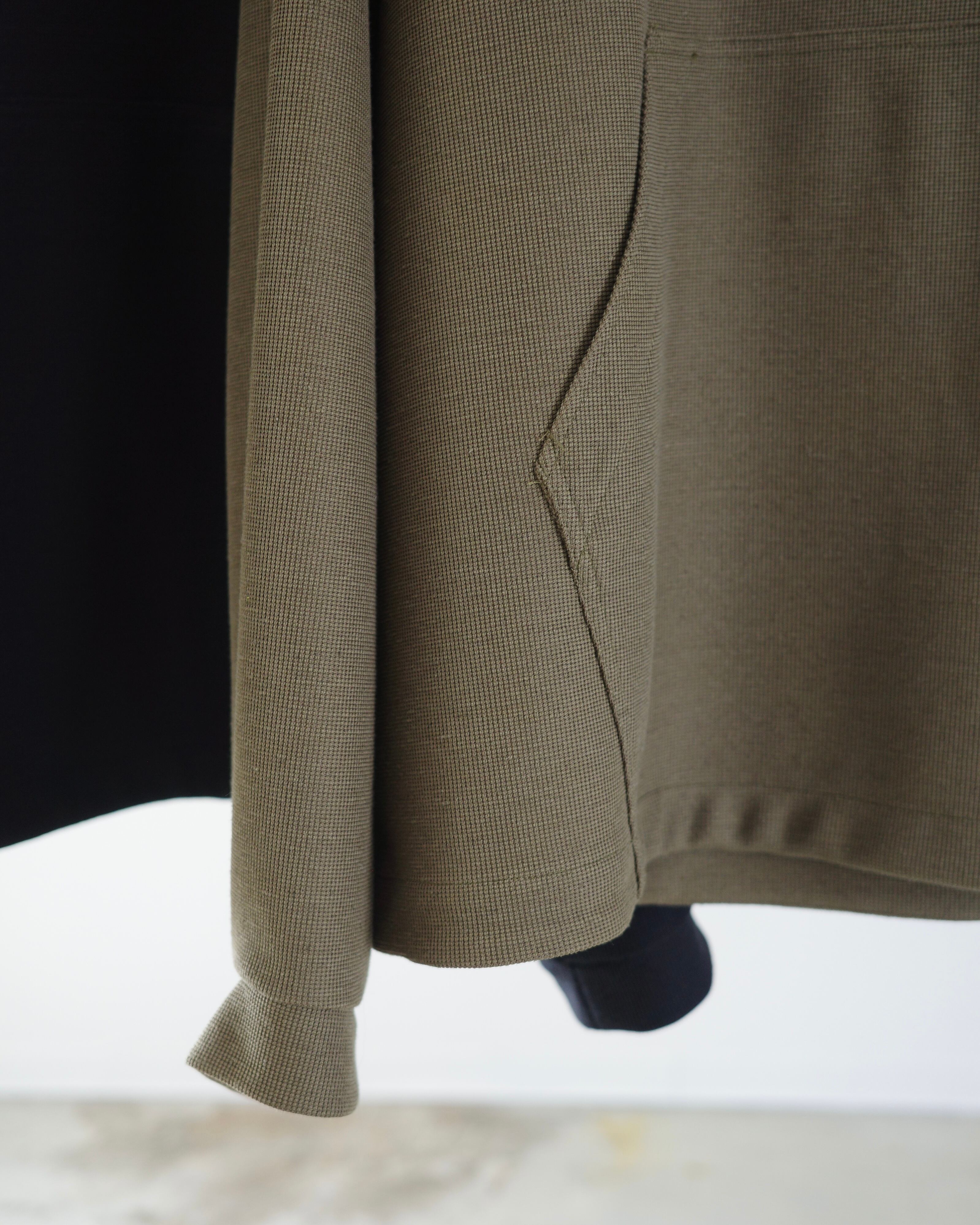 上質なコットンとラミーを組み合わせた素材は、真珠のように艶やかでシルキーな光沢を放ち、シンプルながらも高級感を漂わせます。フードは衿元から自然に広がり、シンプルなカンガルーポケットがデザインのアクセントに。ジップアップのデザインにより、簡単に着脱でき、スタイルを自由に調整できるのも魅力です。袖丈は少し長めに設定されており、腕に沿って優雅にドレープが生まれ、袖口にはタックが施されて立体感を演出します。ラグランスリーブデザインにより、肩ラインはカジュアルすぎず、エレガントな印象に仕上がります。軽量でシワになりにくく、デイリーユースにも最適。快適な着心地とともに、スタイルアップを叶える一着です。