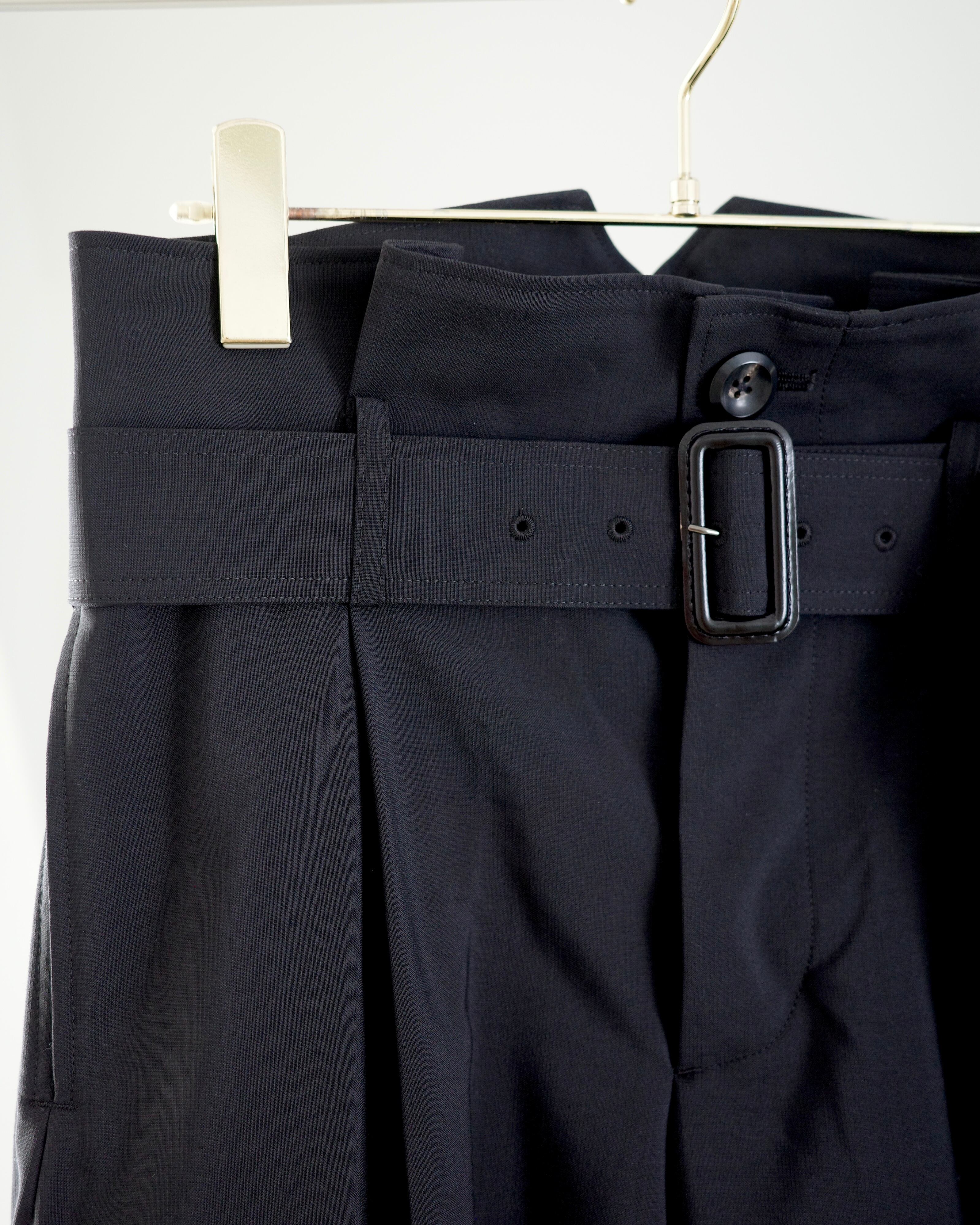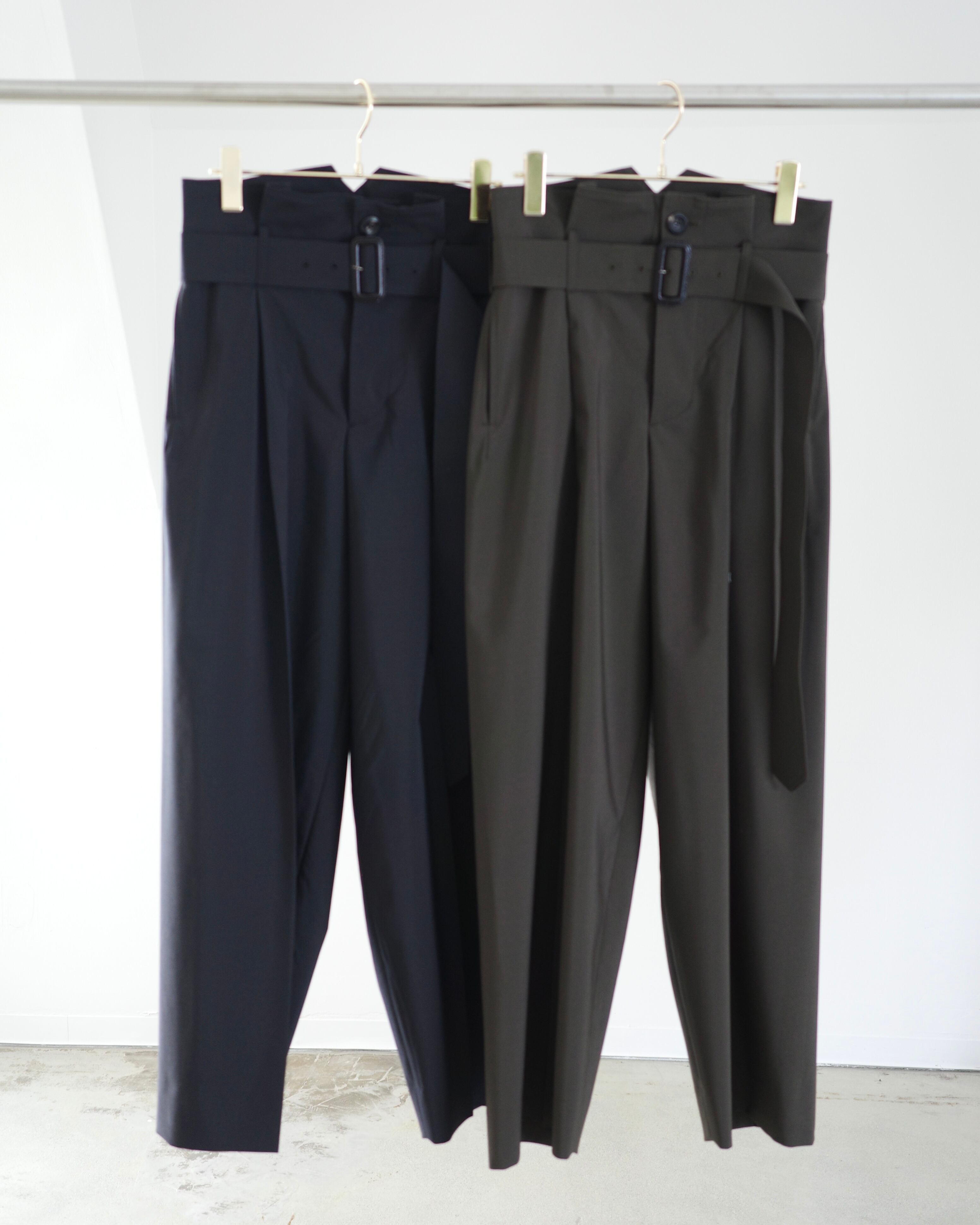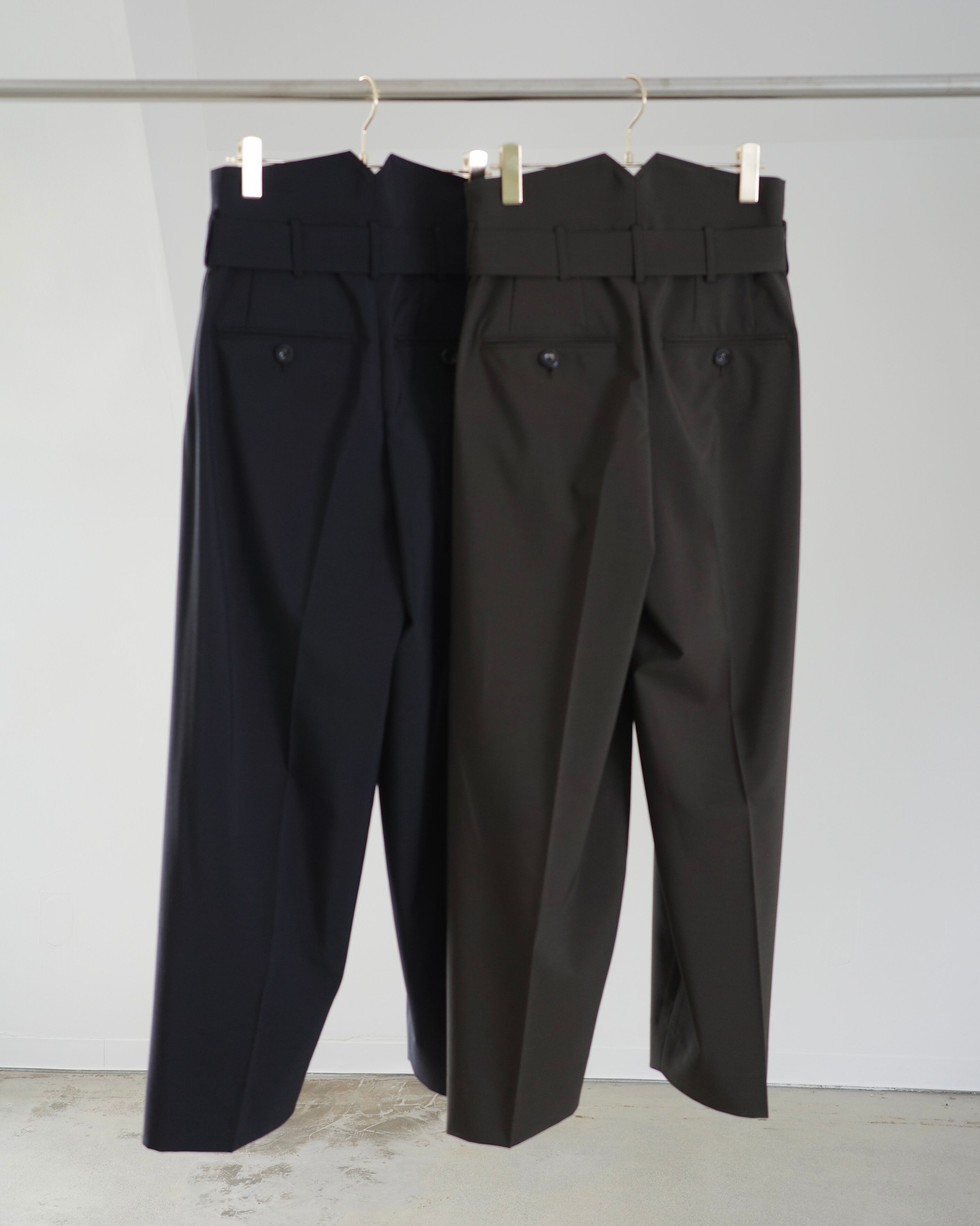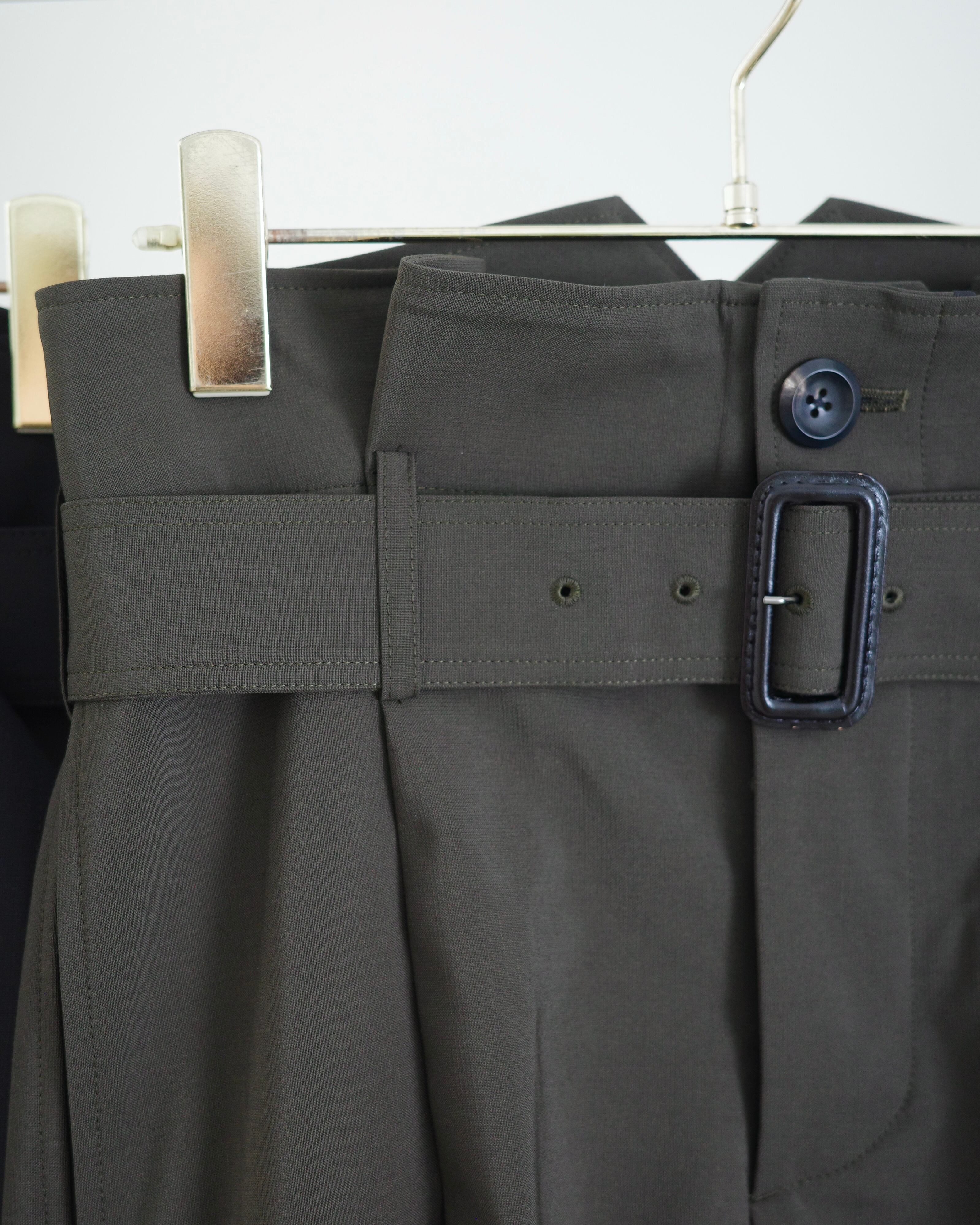 細番手の梳毛糸を高密度に織ったツイル素材で仕立てたウエストベルトがアクセントのパレードパンツ。滑らかで光沢があり耐久性も高い高級ウール生地を用いることで、上品な見た目と快適な穿き心地を両立しています。イギリス軍スコットランド連隊のパレード用ウールトラウザーズをベースに、アウトタックで腰回りにダイナミックなボリュームを持たせ、裾に向けて緩やかにテーパードすることで立体的で洗練されたラインを形成。伝統的なミリタリーの力強さを残しつつ、ドレスパンツのような上品さを加えたパターン設計により現代のスタイルにも自然に馴染む一着に仕上げています。ウエストベルトや腰回りのディテールがアクセントとなり、着こなしのバランスを美しく整え、耐久性と快適さを兼ね備えた長く愛用できる存在感のあるパンツです。