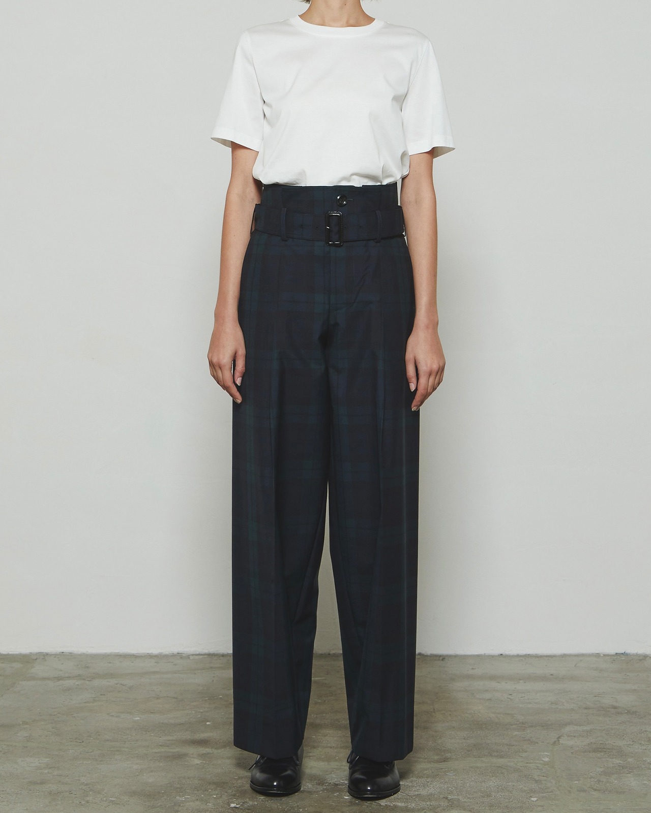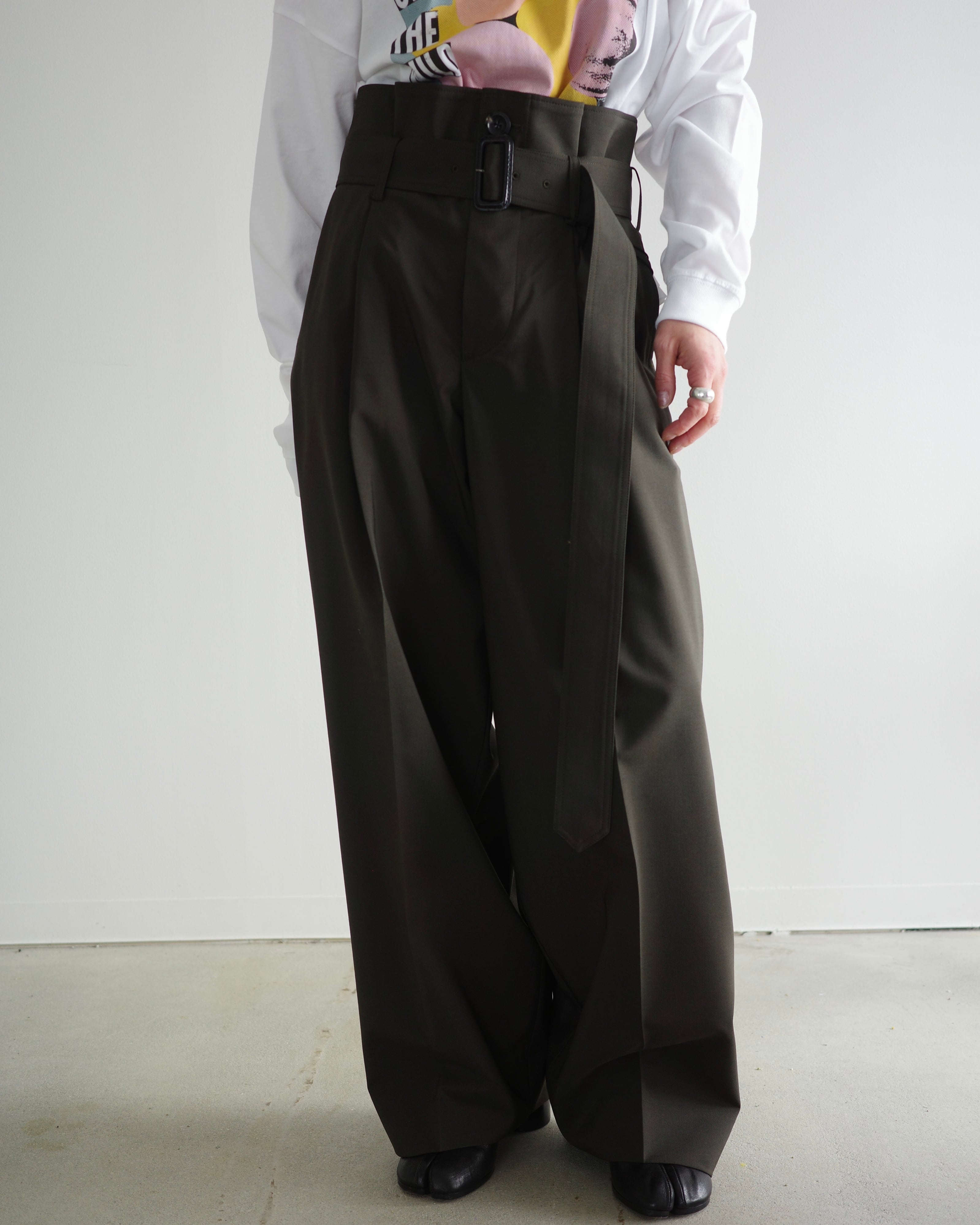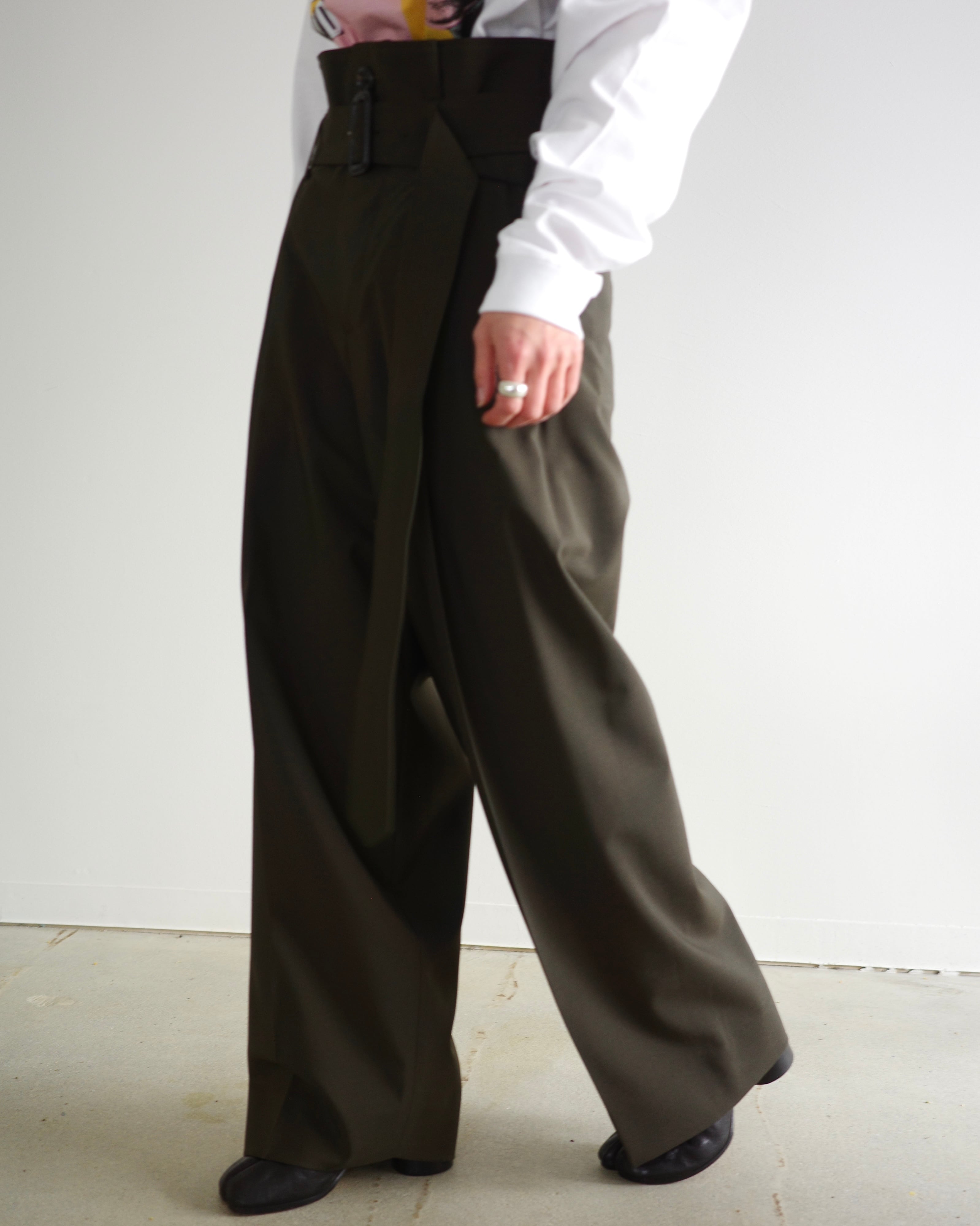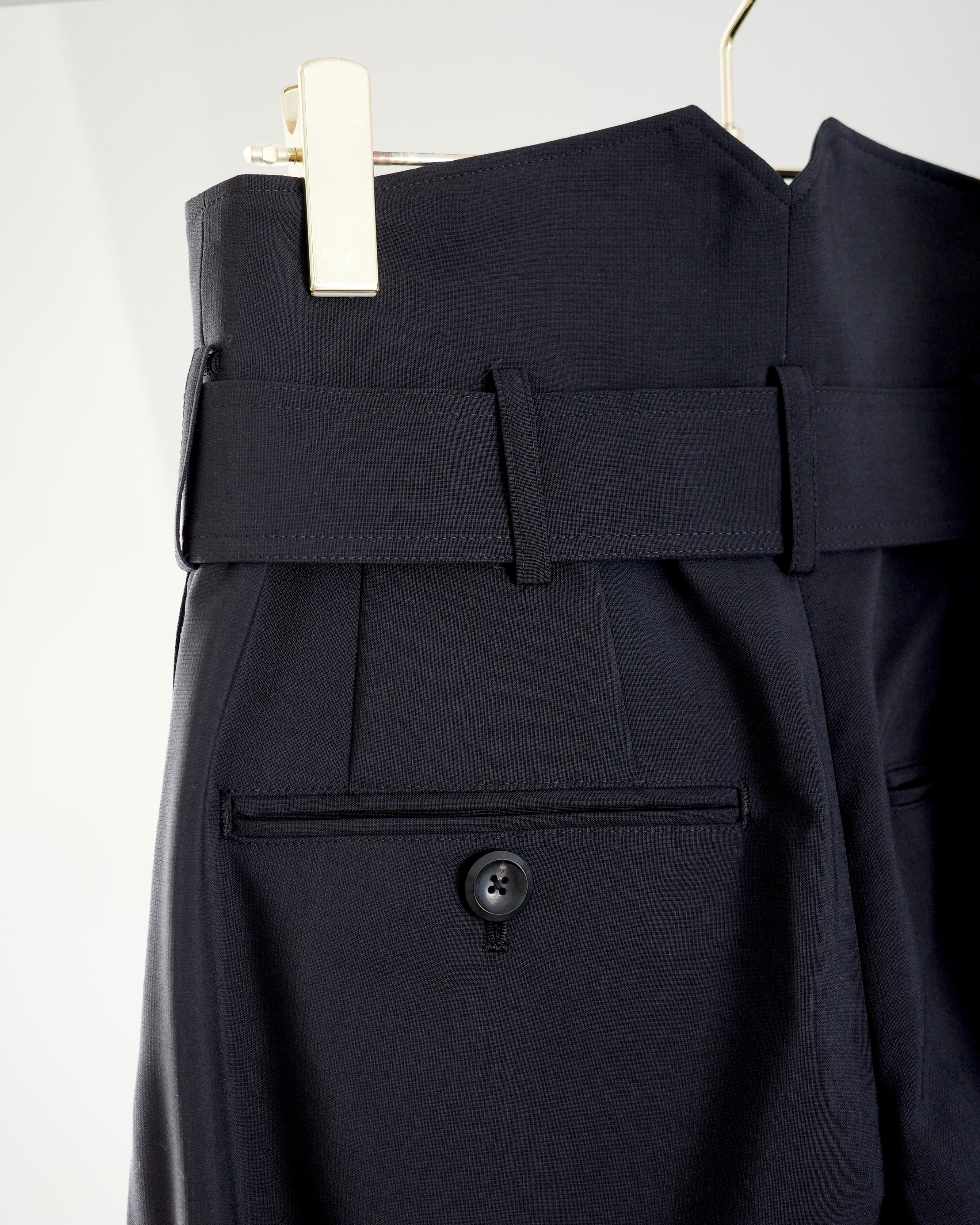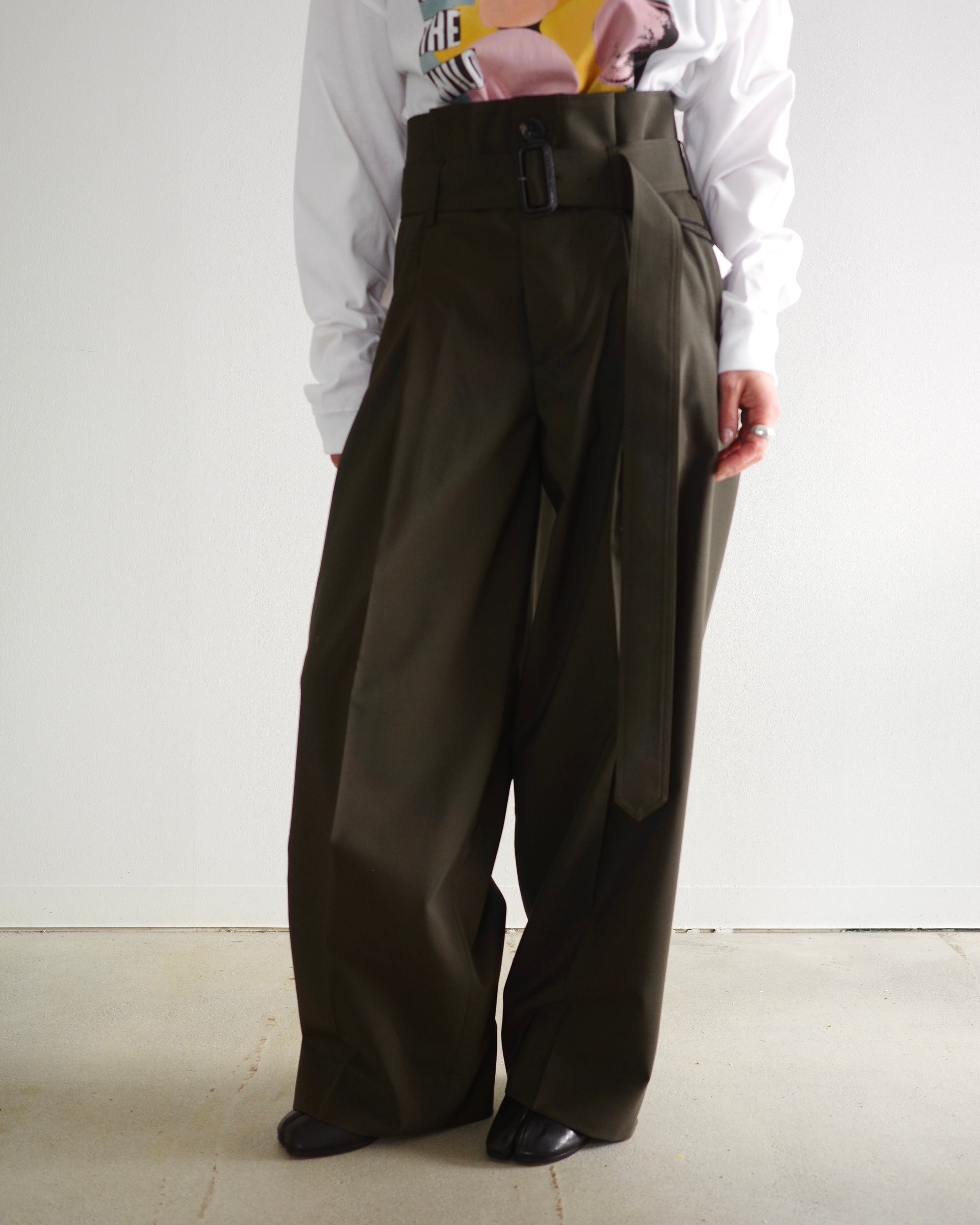 細番手の梳毛糸を高密度に織ったツイル素材で仕立てたウエストベルトがアクセントのパレードパンツ。滑らかで光沢があり耐久性も高い高級ウール生地を用いることで、上品な見た目と快適な穿き心地を両立しています。イギリス軍スコットランド連隊のパレード用ウールトラウザーズをベースに、アウトタックで腰回りにダイナミックなボリュームを持たせ、裾に向けて緩やかにテーパードすることで立体的で洗練されたラインを形成。伝統的なミリタリーの力強さを残しつつ、ドレスパンツのような上品さを加えたパターン設計により現代のスタイルにも自然に馴染む一着に仕上げています。ウエストベルトや腰回りのディテールがアクセントとなり、着こなしのバランスを美しく整え、耐久性と快適さを兼ね備えた長く愛用できる存在感のあるパンツです。