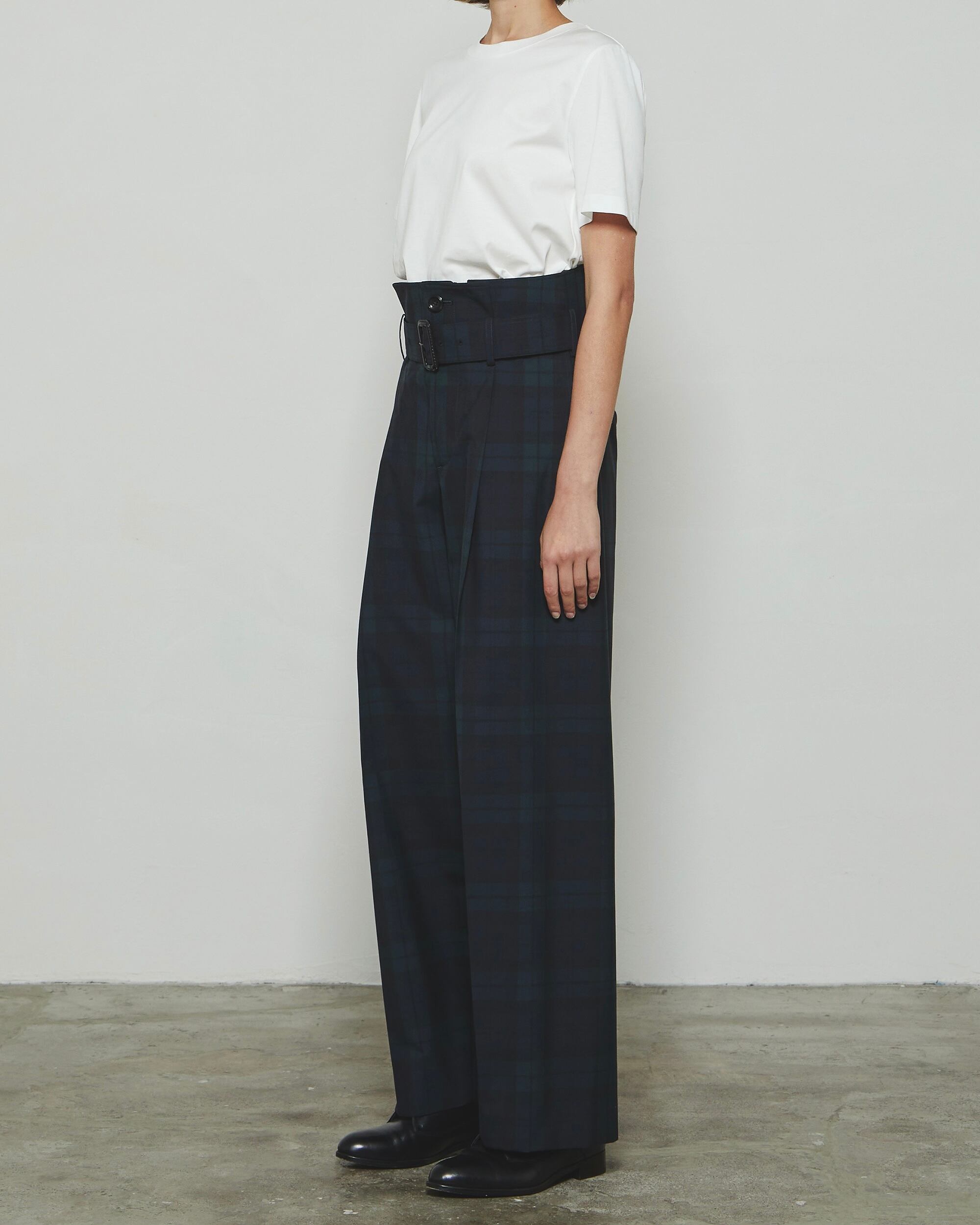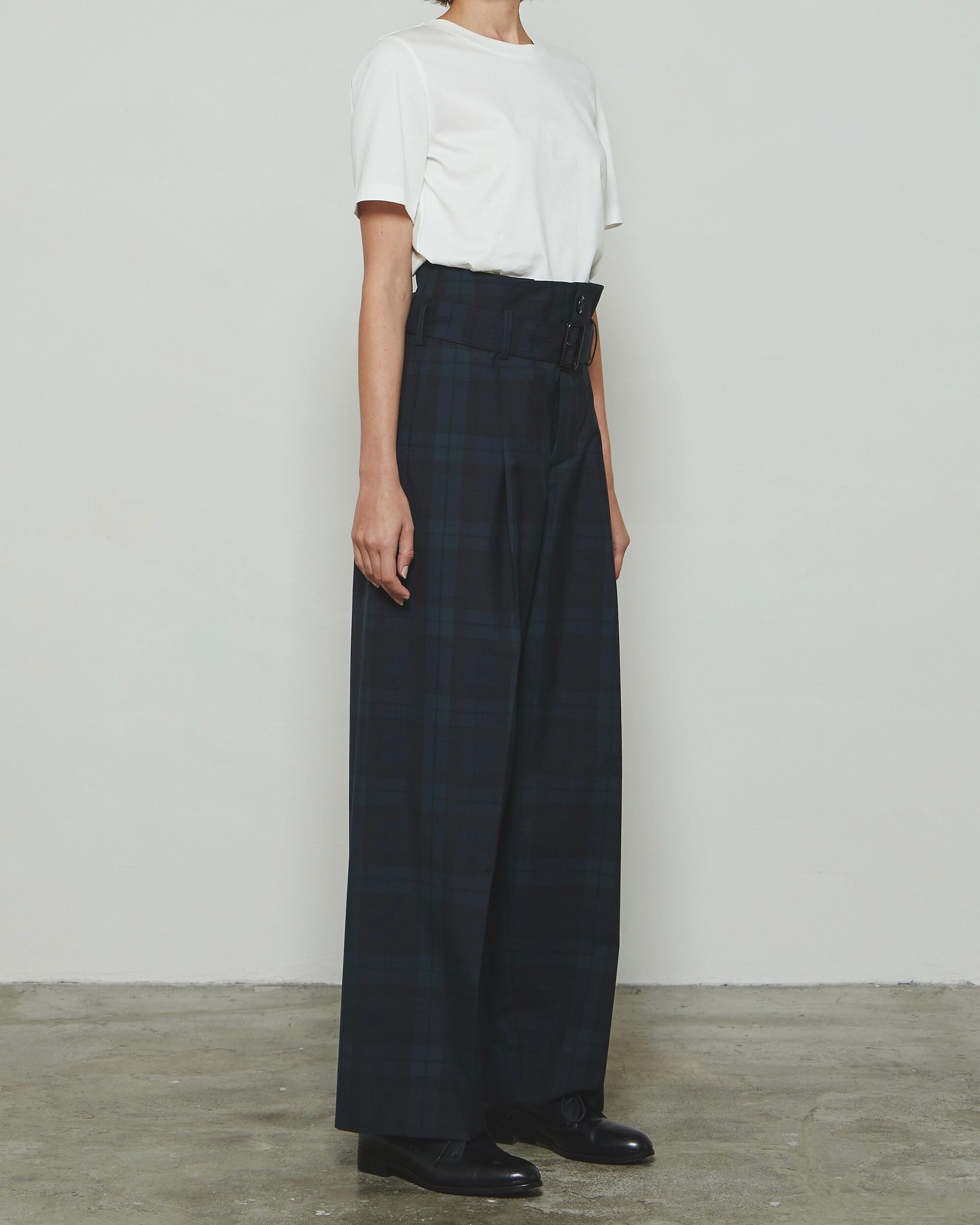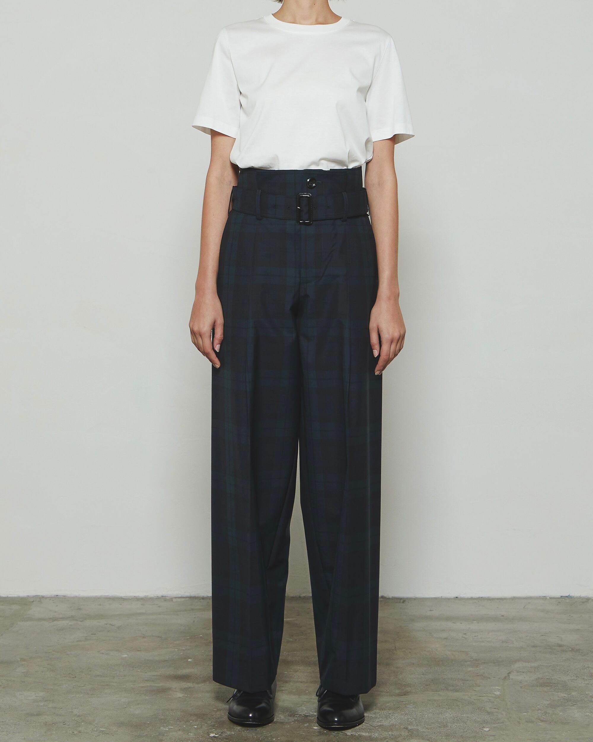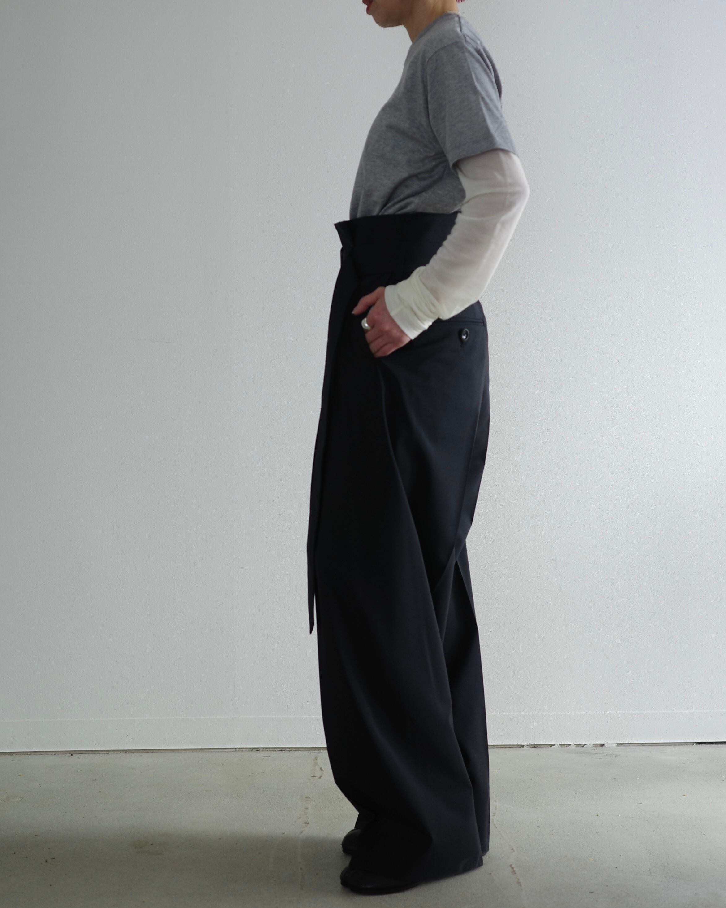 細番手の梳毛糸を高密度に織ったツイル素材で仕立てたウエストベルトがアクセントのパレードパンツ。滑らかで光沢があり耐久性も高い高級ウール生地を用いることで、上品な見た目と快適な穿き心地を両立しています。イギリス軍スコットランド連隊のパレード用ウールトラウザーズをベースに、アウトタックで腰回りにダイナミックなボリュームを持たせ、裾に向けて緩やかにテーパードすることで立体的で洗練されたラインを形成。伝統的なミリタリーの力強さを残しつつ、ドレスパンツのような上品さを加えたパターン設計により現代のスタイルにも自然に馴染む一着に仕上げています。ウエストベルトや腰回りのディテールがアクセントとなり、着こなしのバランスを美しく整え、耐久性と快適さを兼ね備えた長く愛用できる存在感のあるパンツです。