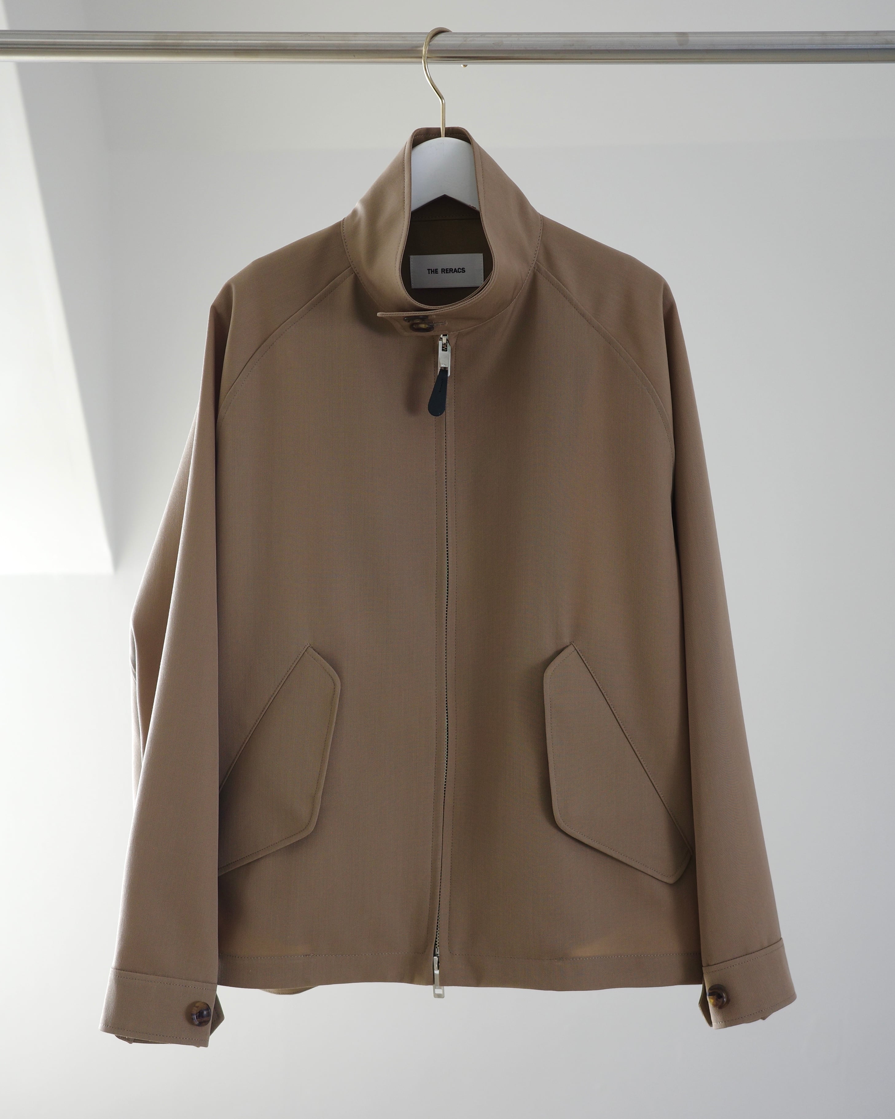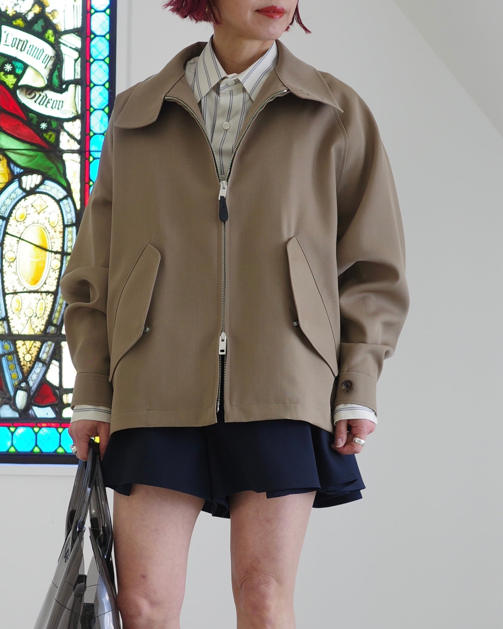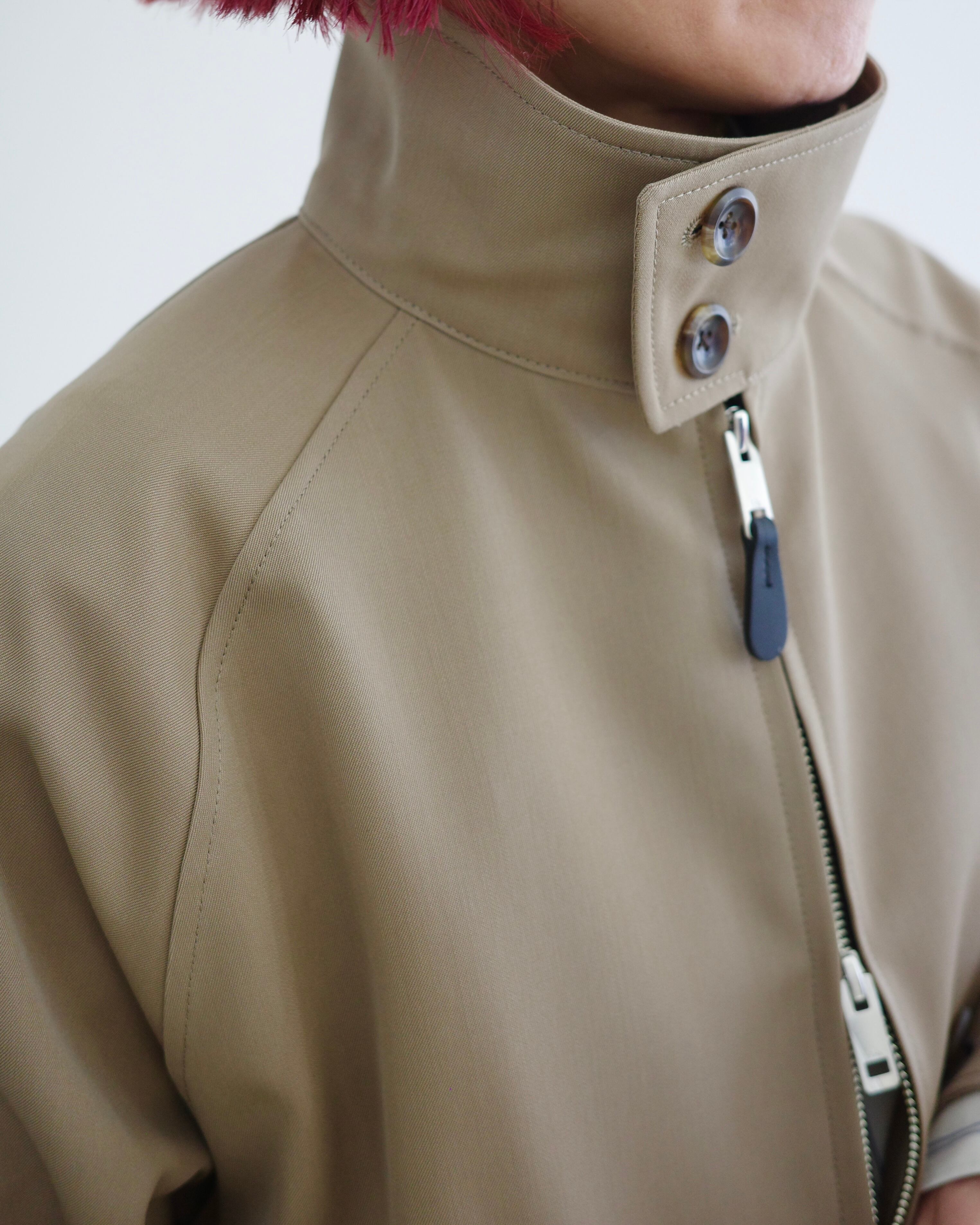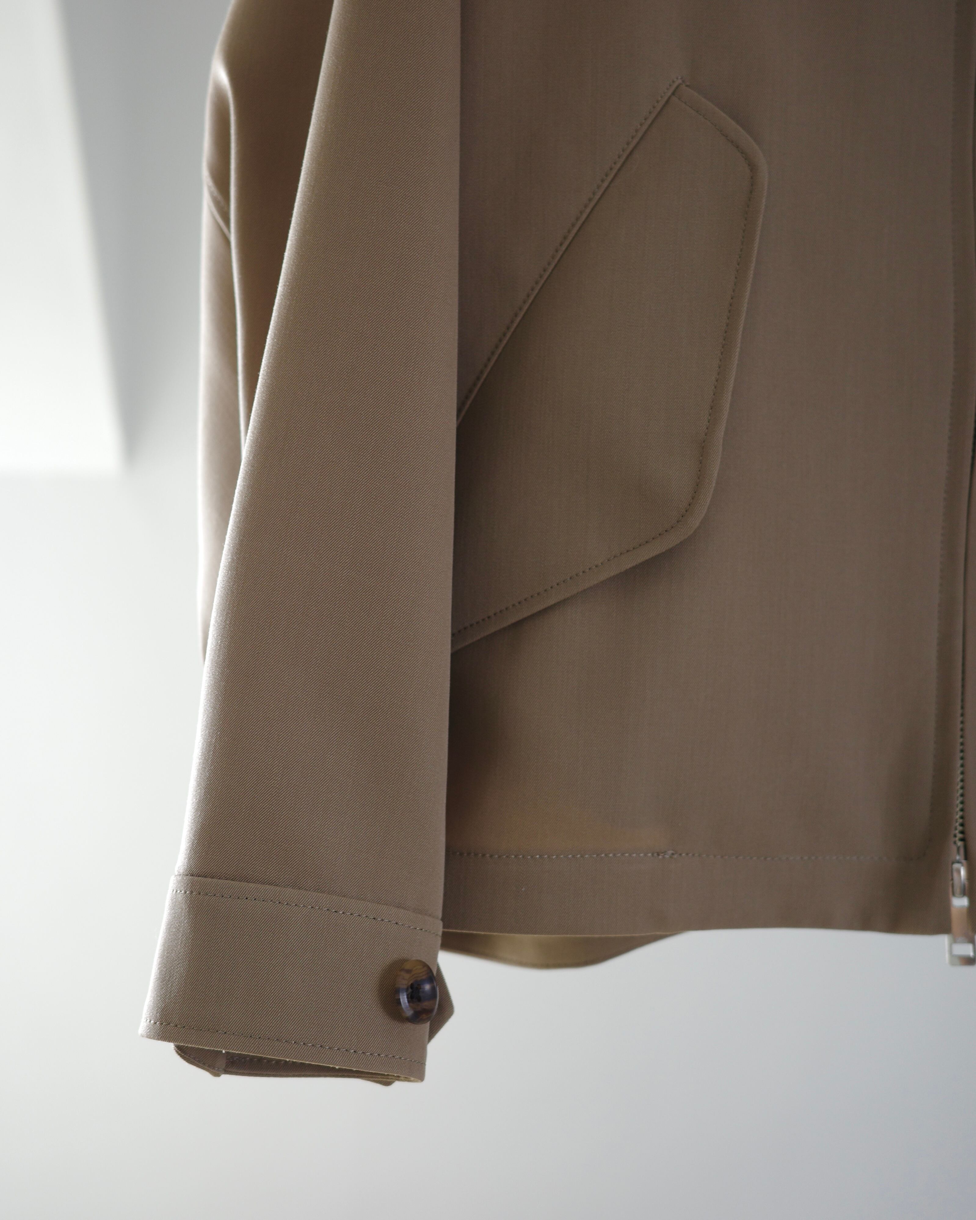 ウール素材を使用したハリントンジャケット。カジュアルな印象を持つハリントンのディティールを、ギャバジン特有の光沢感と滑らかな質感を合わせることで、トラディショナルとは一線を画したデザインへと昇華しております。フロントに大きく配置されたフラップポケット、首元のオリジナル水牛釦がデザインのアクセントとなっております。緻密に計算されたパターン設計により生み出されたドロップショルダーは重力に従って直下し、アームホールに無駄なしわが起こりにくく、バストの抱きも美しく見せるデザインとなっています。 襟元は通常通り立てて着用する他に、折り返してブルゾンの様に着用することができ、様々なスタイリングが可能な一着に仕上げております。