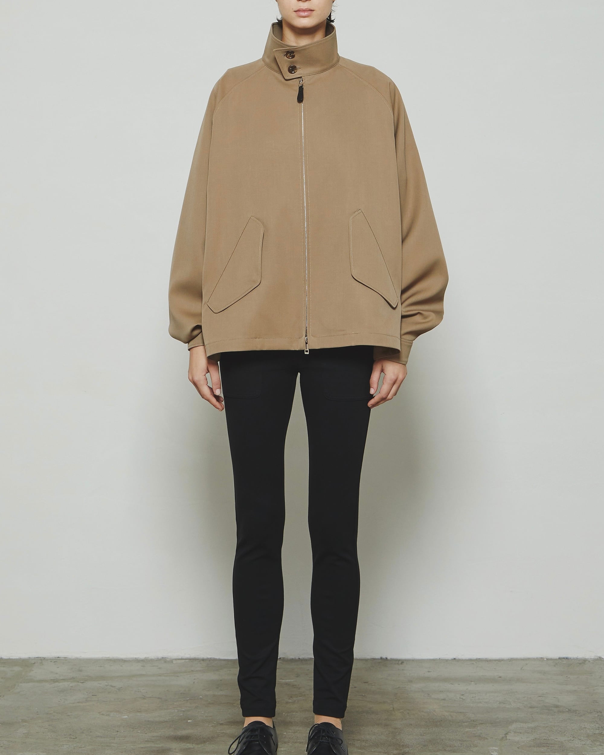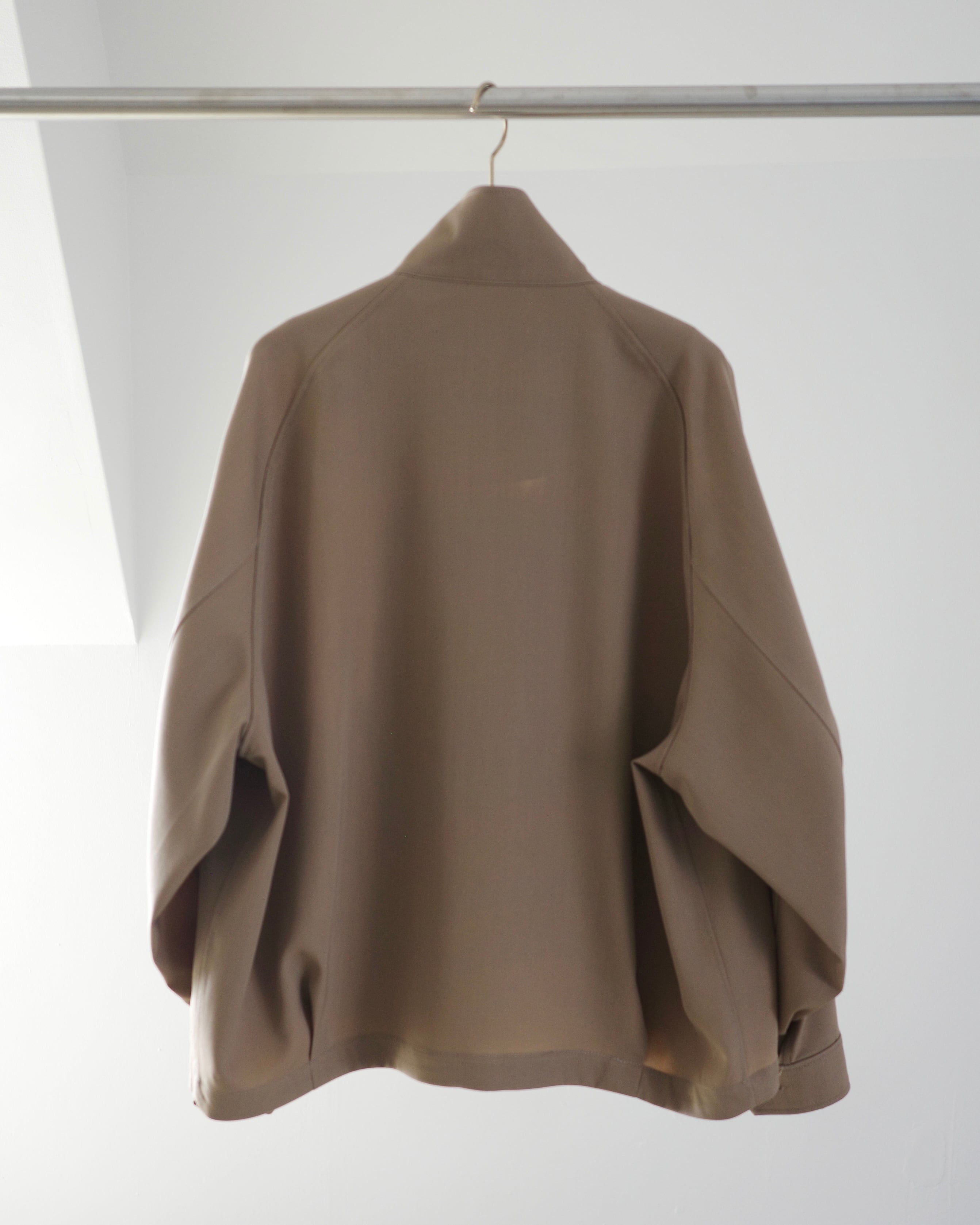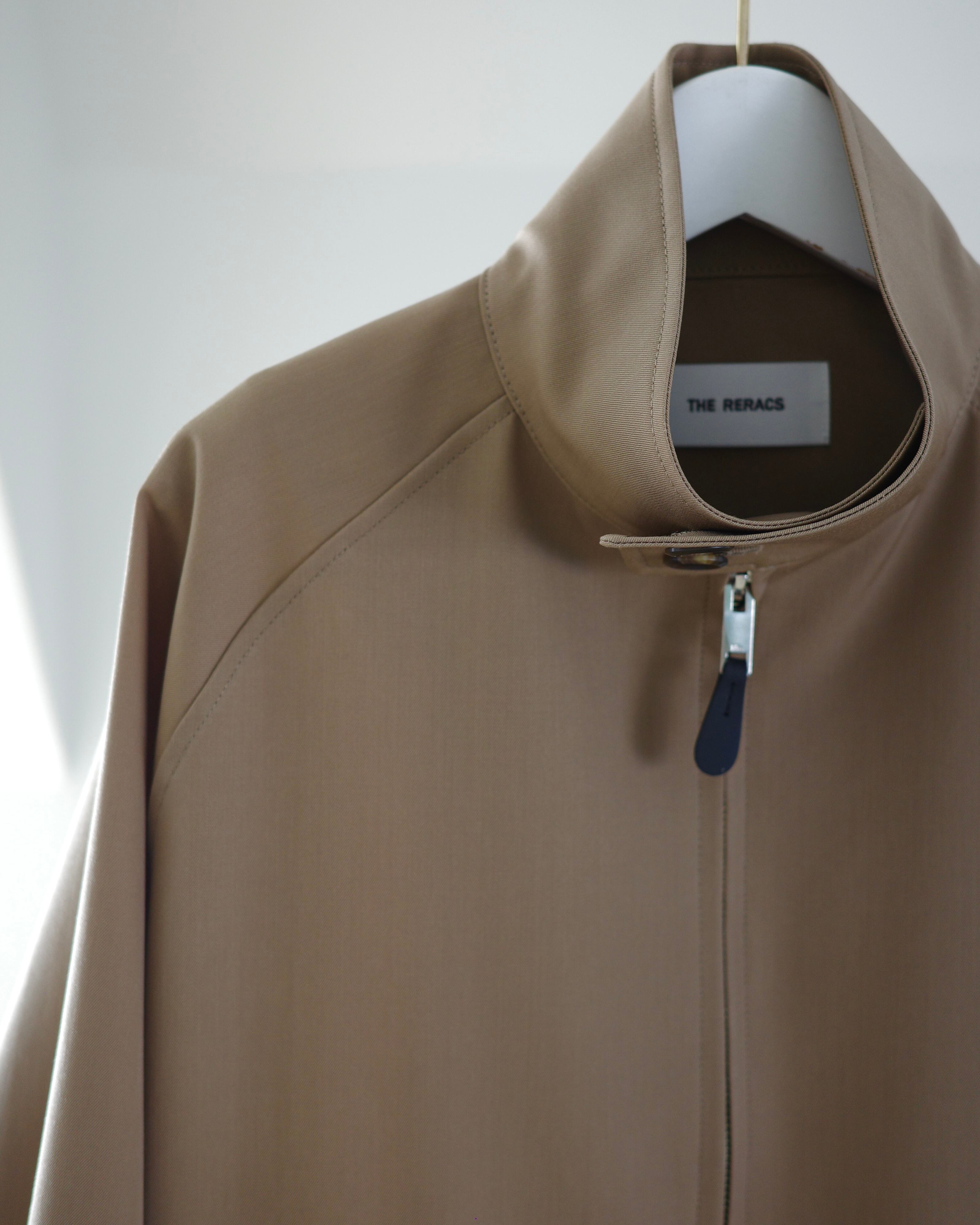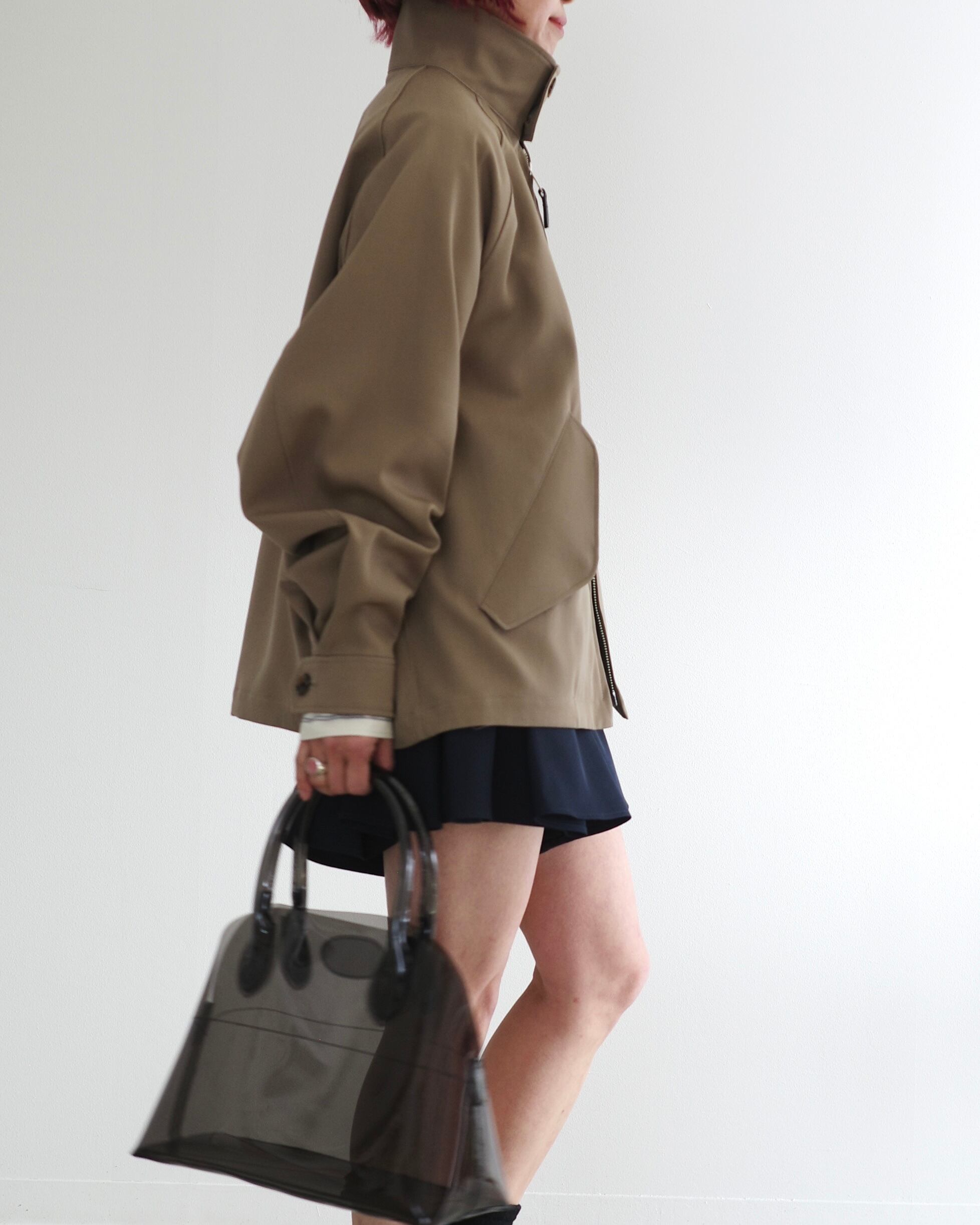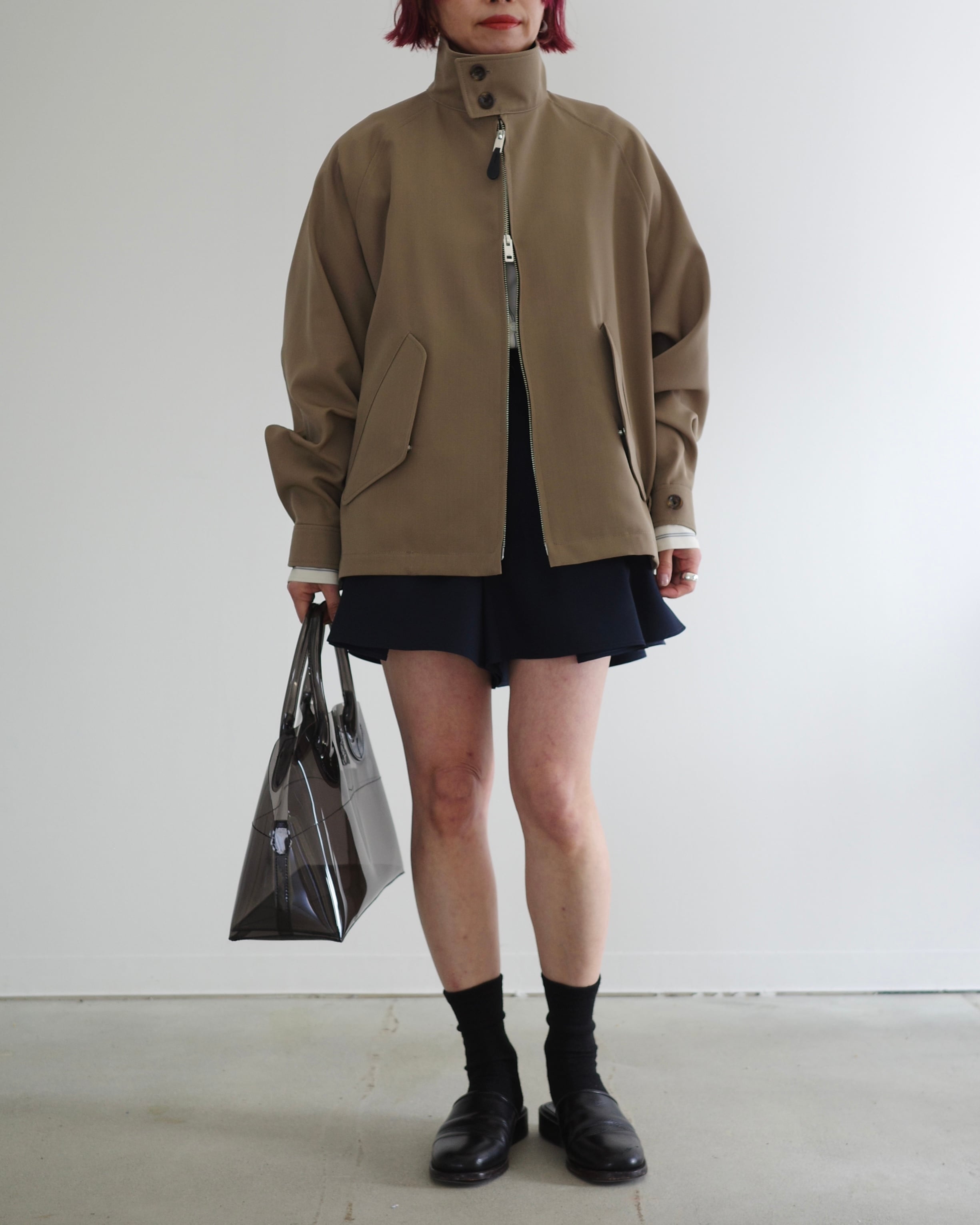 ウール素材を使用したハリントンジャケット。カジュアルな印象を持つハリントンのディティールを、ギャバジン特有の光沢感と滑らかな質感を合わせることで、トラディショナルとは一線を画したデザインへと昇華しております。フロントに大きく配置されたフラップポケット、首元のオリジナル水牛釦がデザインのアクセントとなっております。緻密に計算されたパターン設計により生み出されたドロップショルダーは重力に従って直下し、アームホールに無駄なしわが起こりにくく、バストの抱きも美しく見せるデザインとなっています。 襟元は通常通り立てて着用する他に、折り返してブルゾンの様に着用することができ、様々なスタイリングが可能な一着に仕上げております。