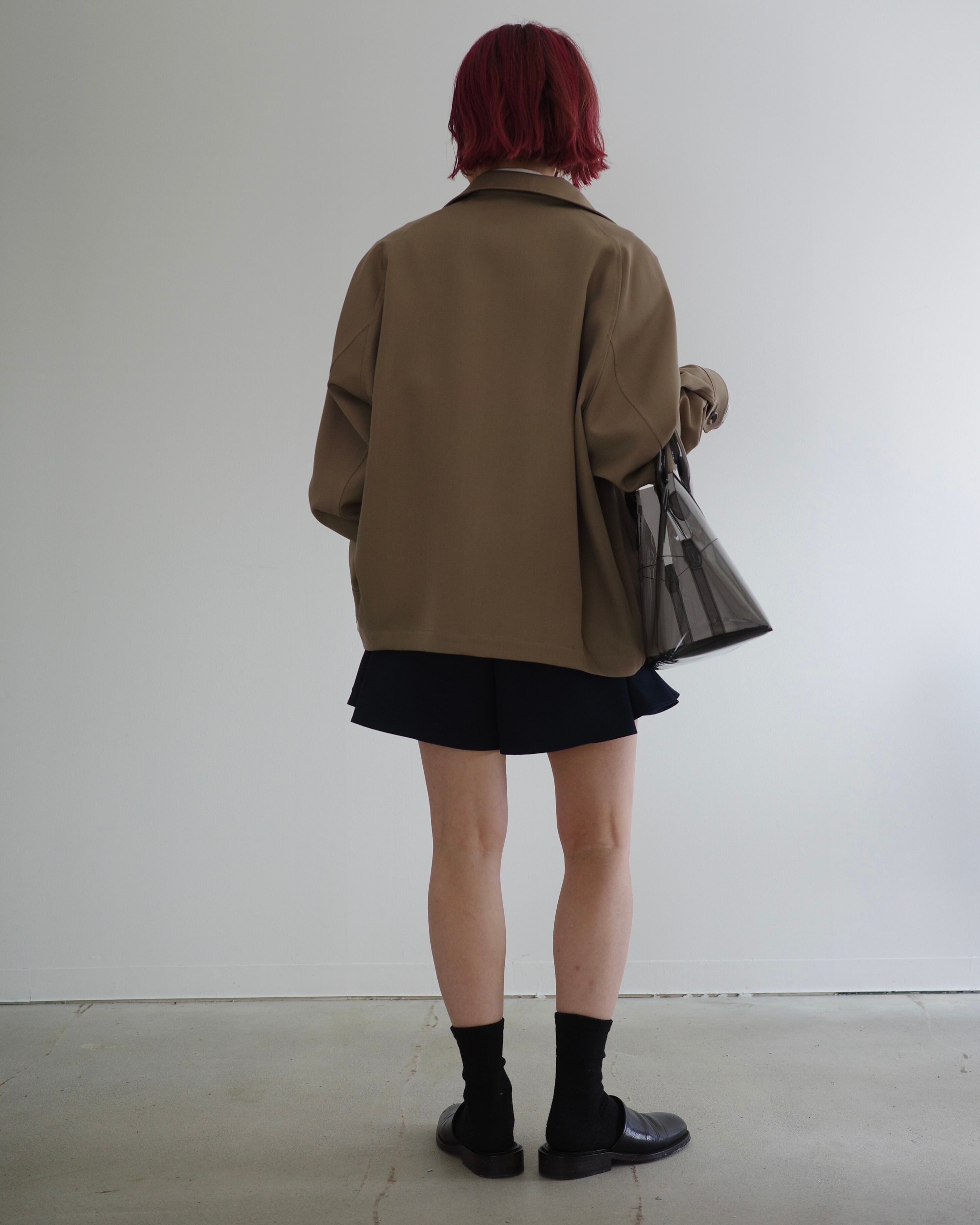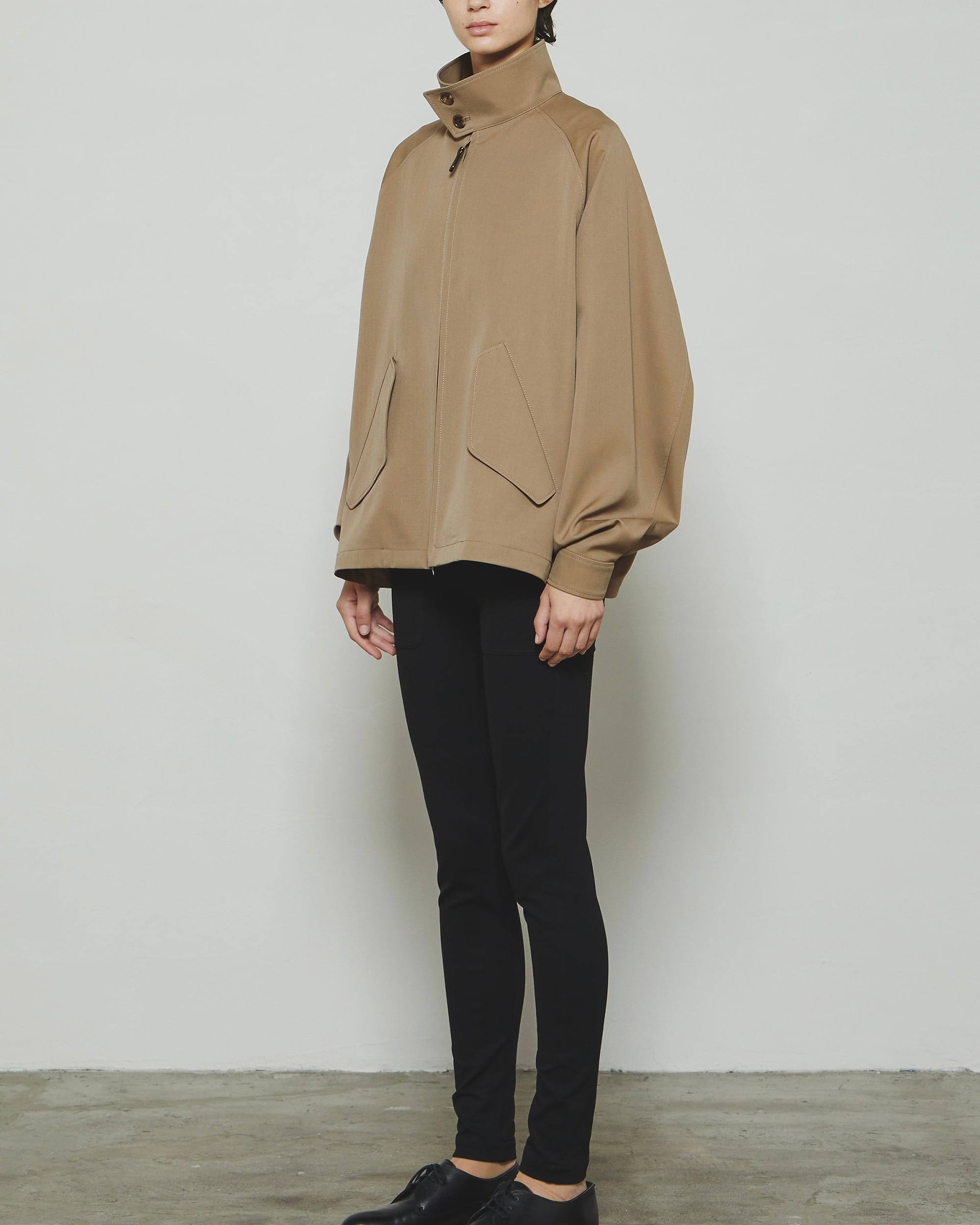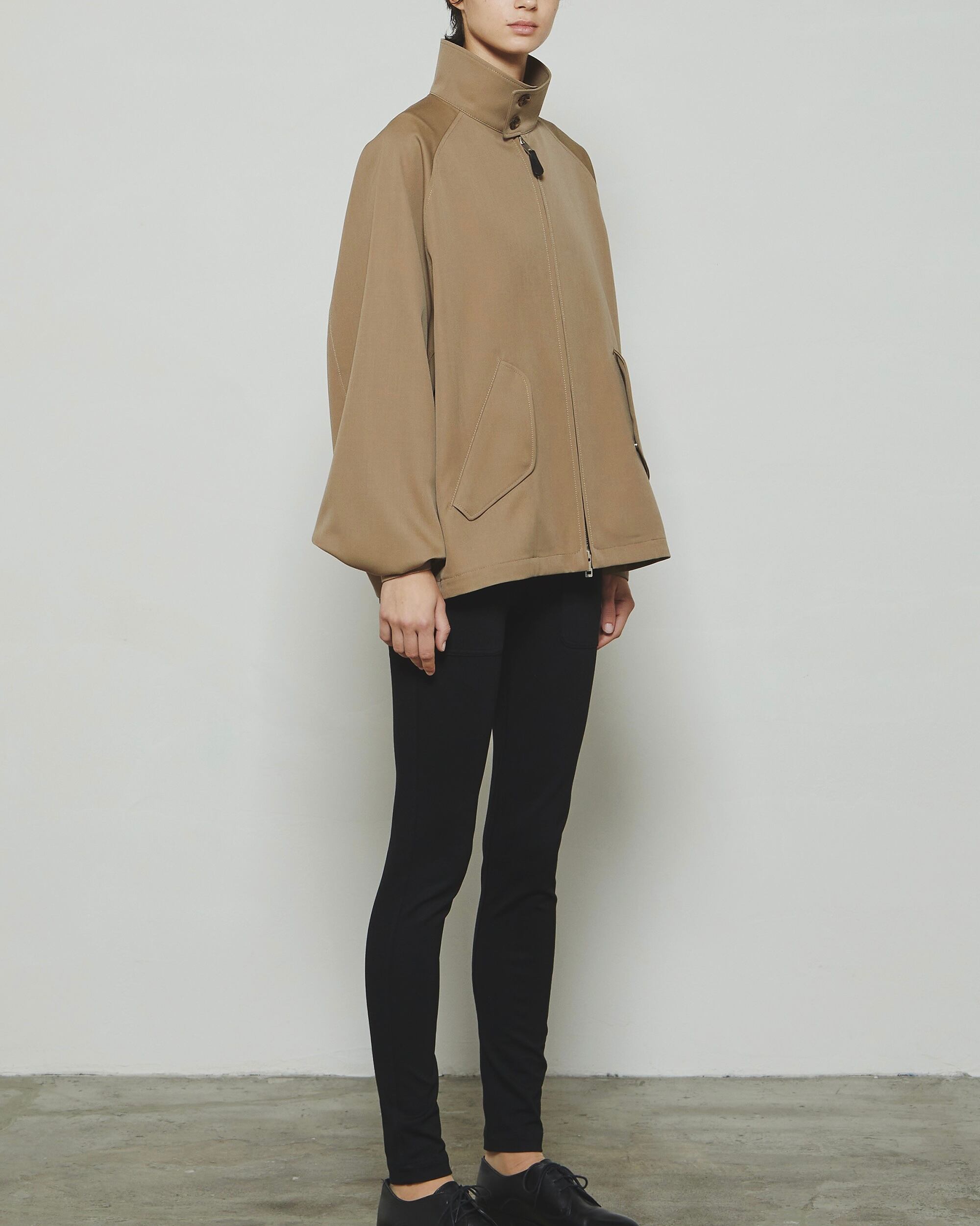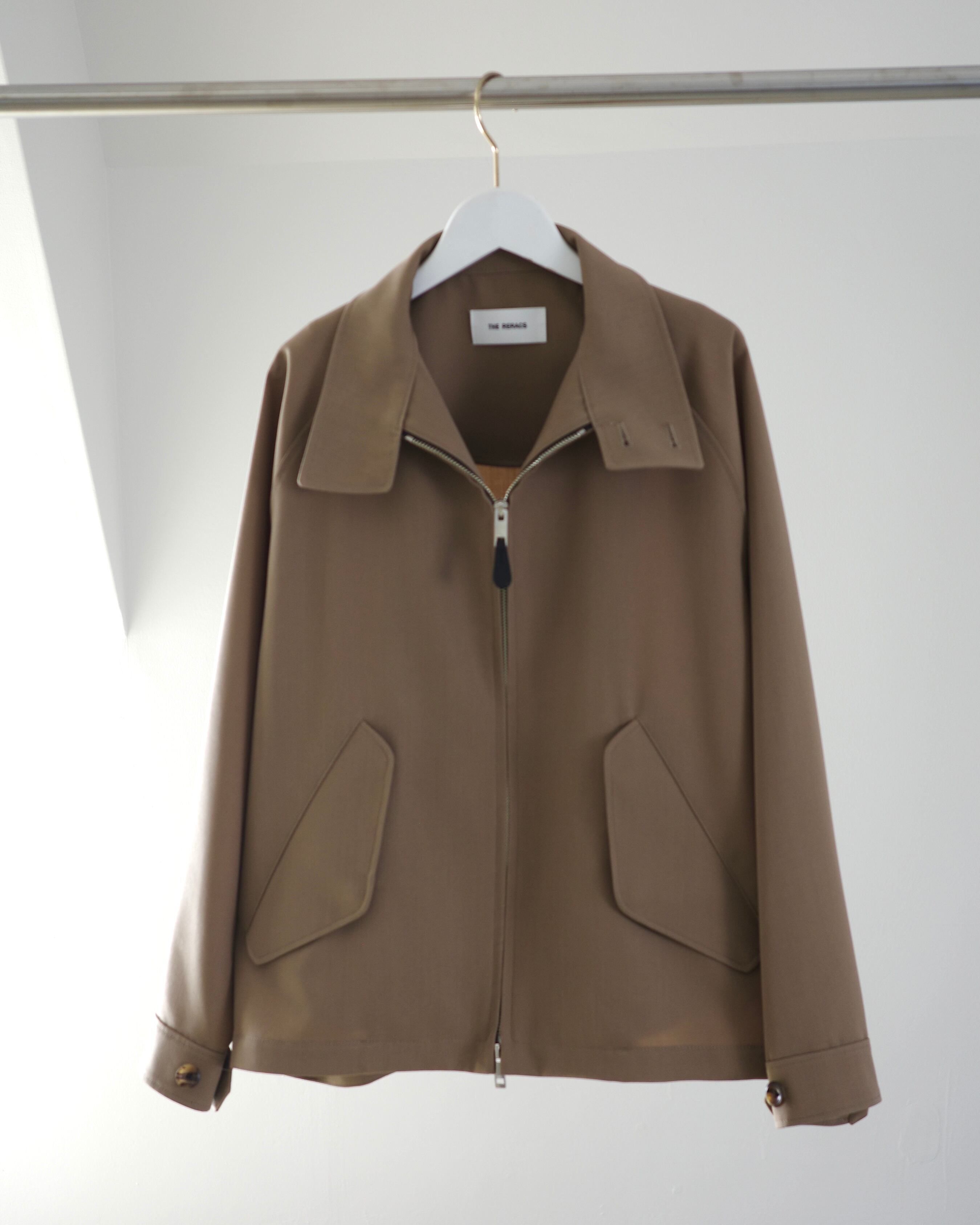 ウール素材を使用したハリントンジャケット。カジュアルな印象を持つハリントンのディティールを、ギャバジン特有の光沢感と滑らかな質感を合わせることで、トラディショナルとは一線を画したデザインへと昇華しております。フロントに大きく配置されたフラップポケット、首元のオリジナル水牛釦がデザインのアクセントとなっております。緻密に計算されたパターン設計により生み出されたドロップショルダーは重力に従って直下し、アームホールに無駄なしわが起こりにくく、バストの抱きも美しく見せるデザインとなっています。 襟元は通常通り立てて着用する他に、折り返してブルゾンの様に着用することができ、様々なスタイリングが可能な一着に仕上げております。