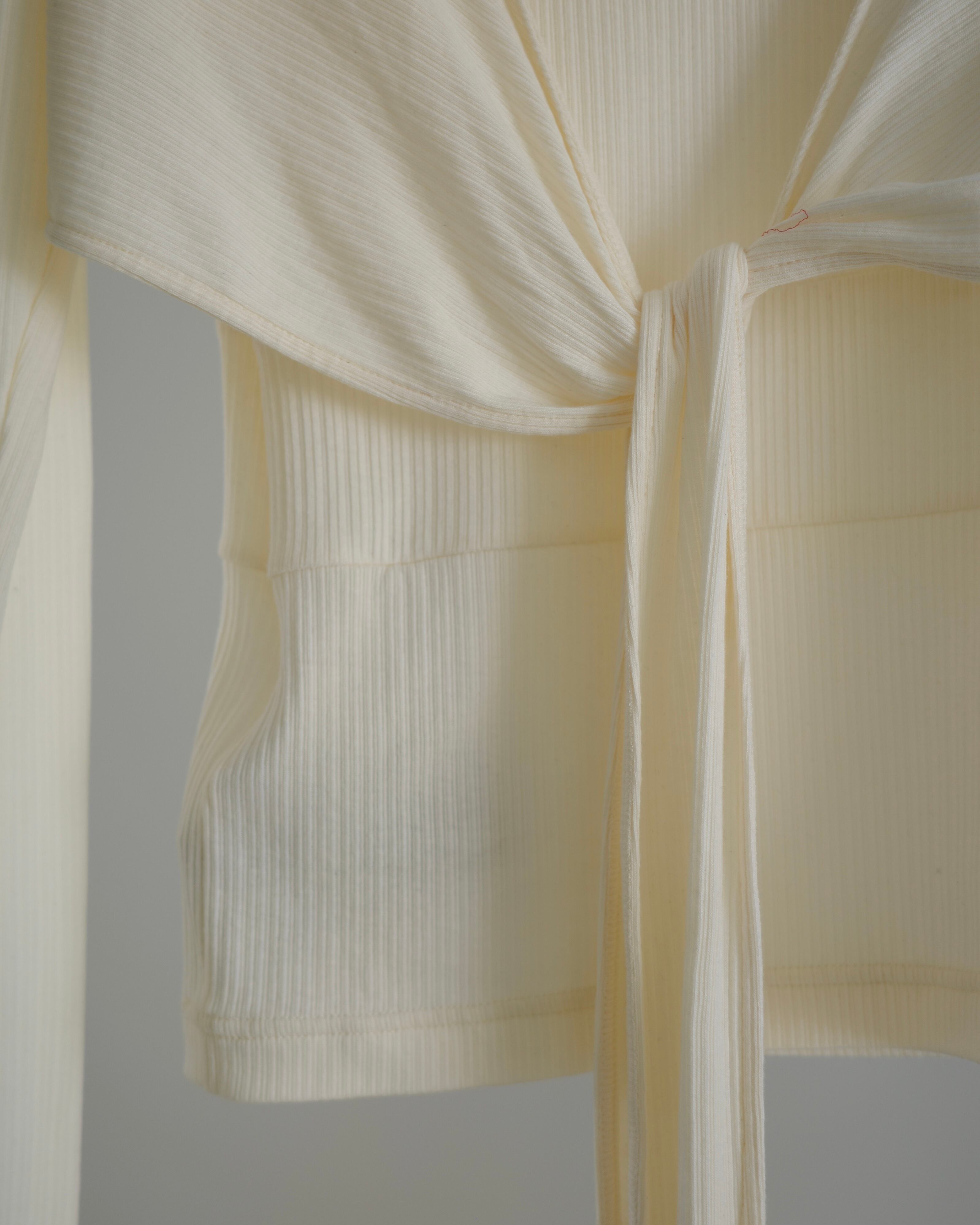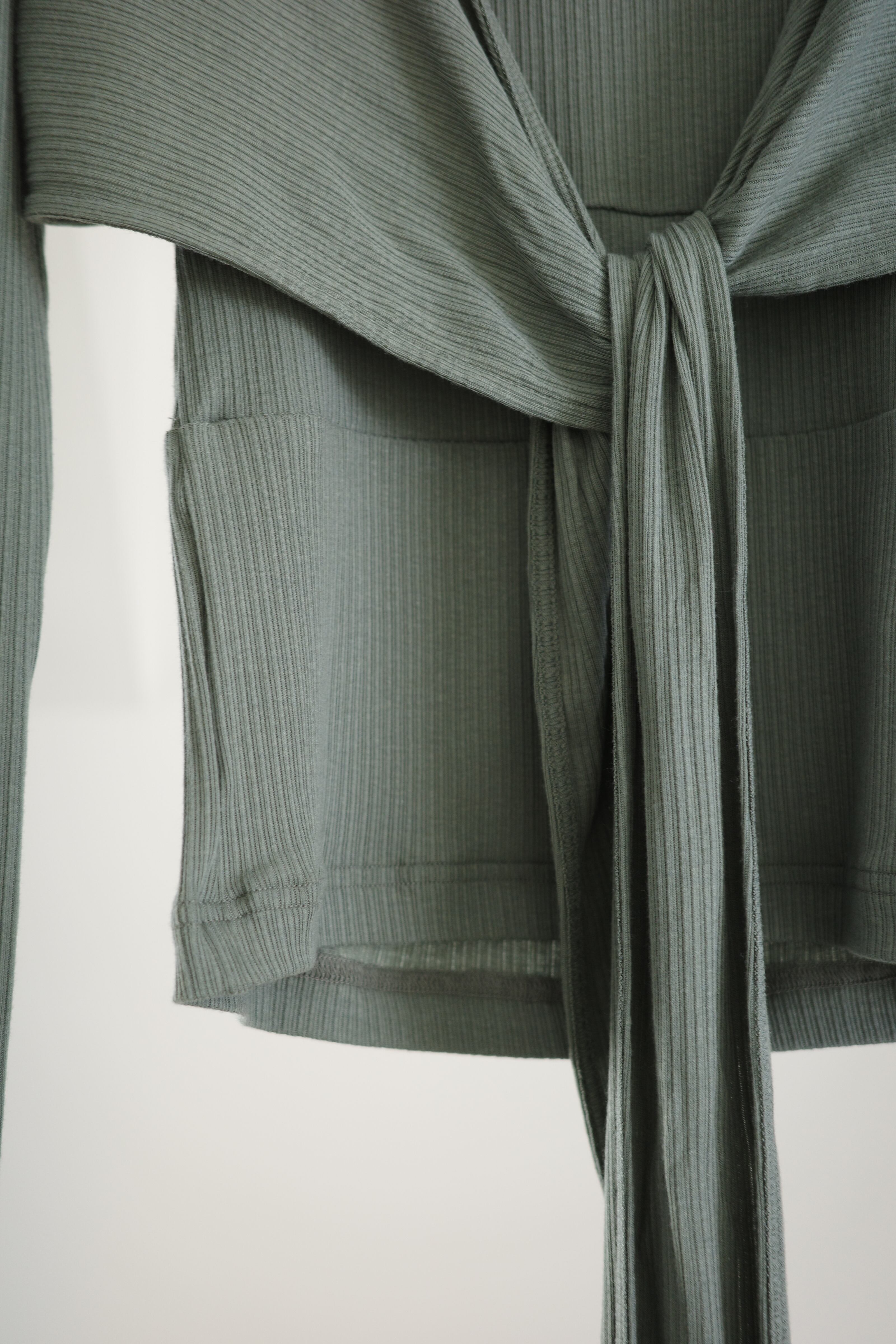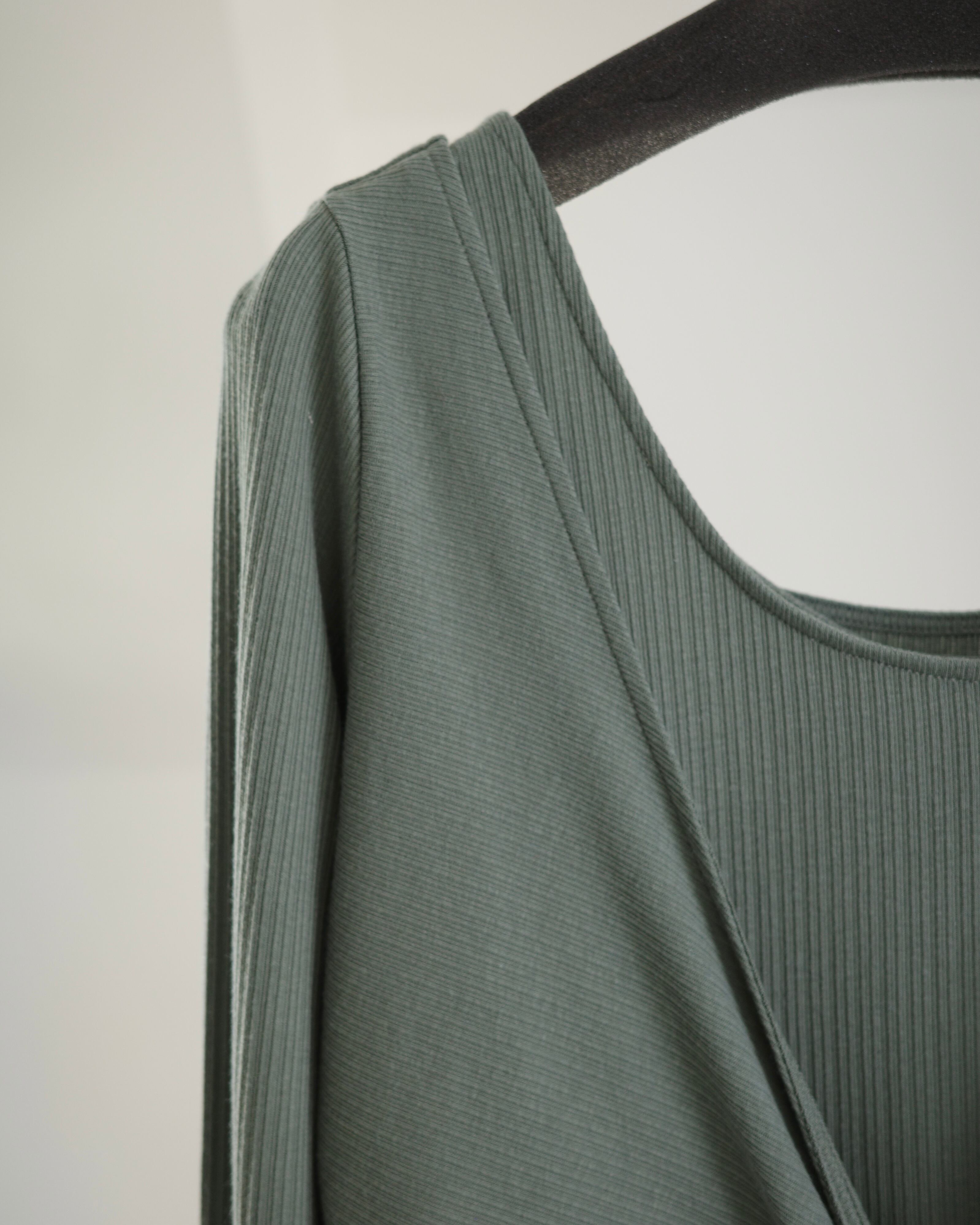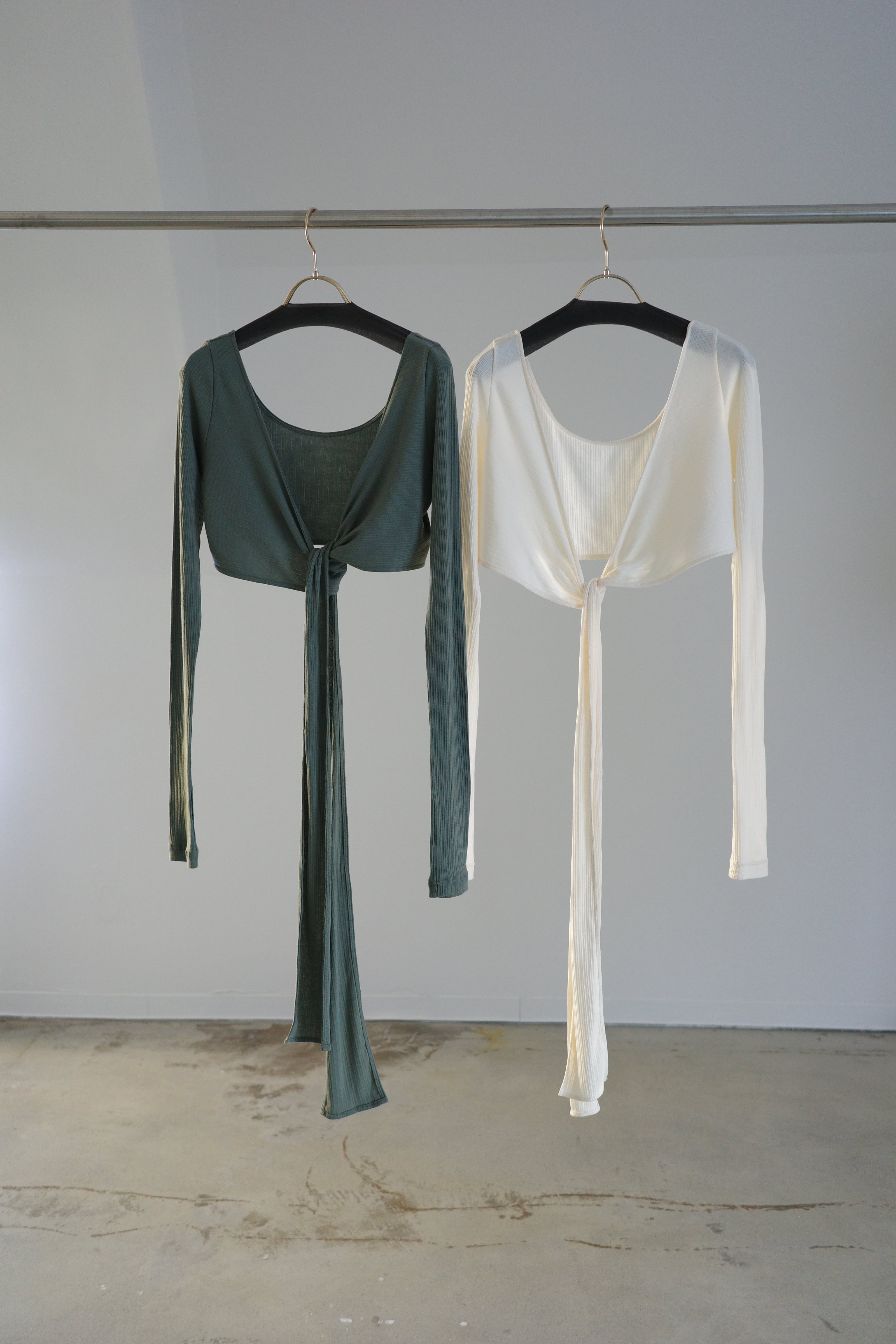 ・長袖トップスは巻きつけて着用するラップデザイン