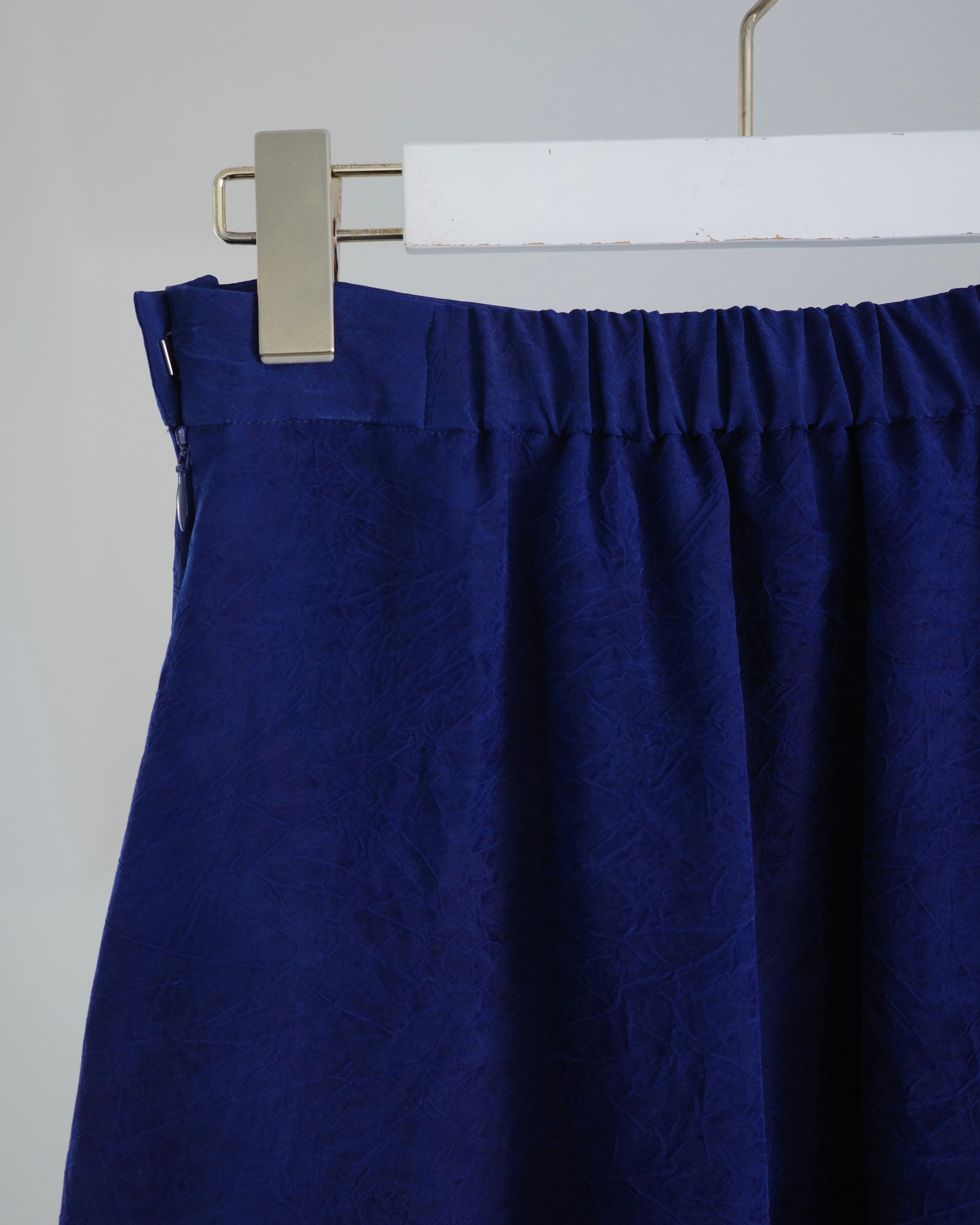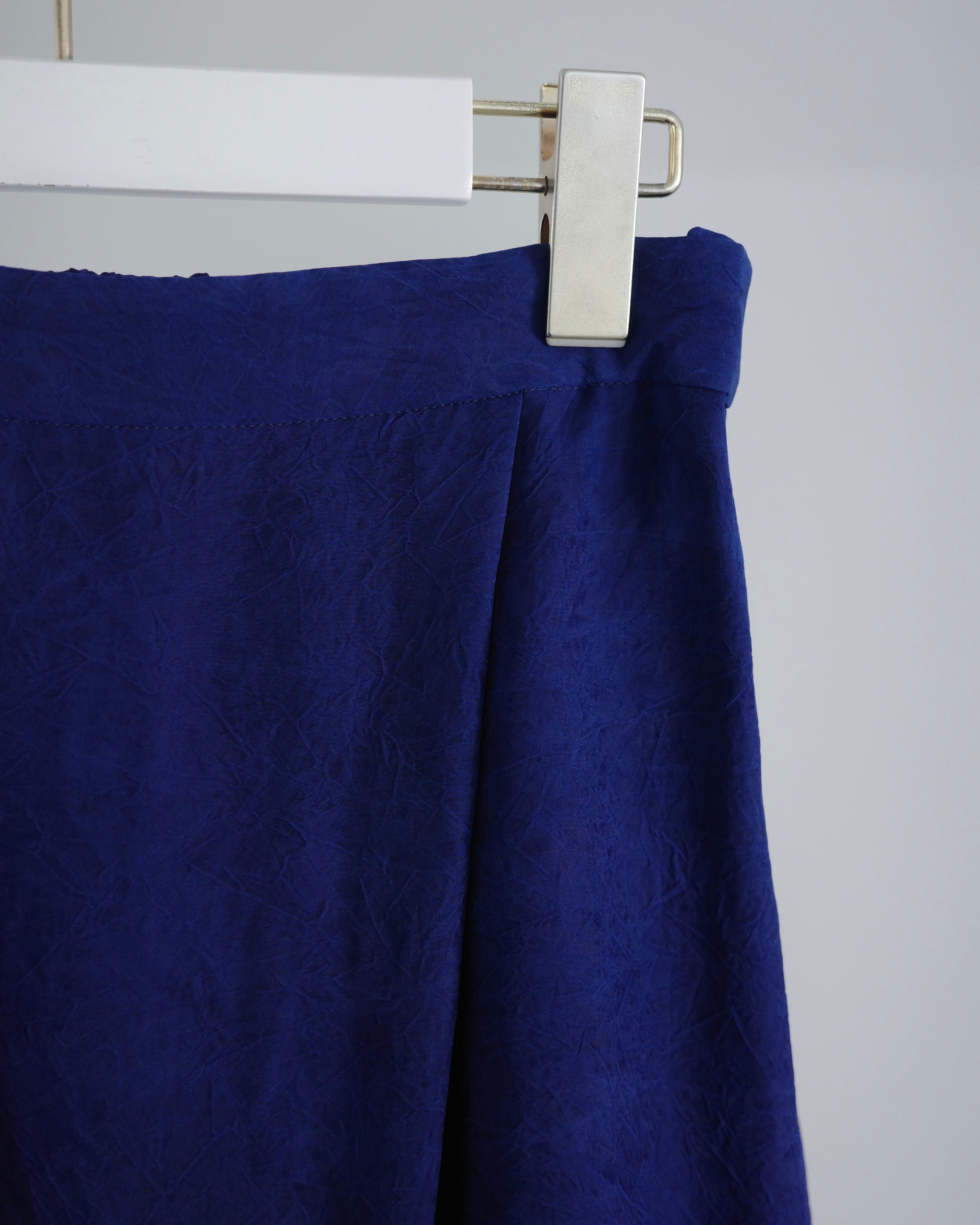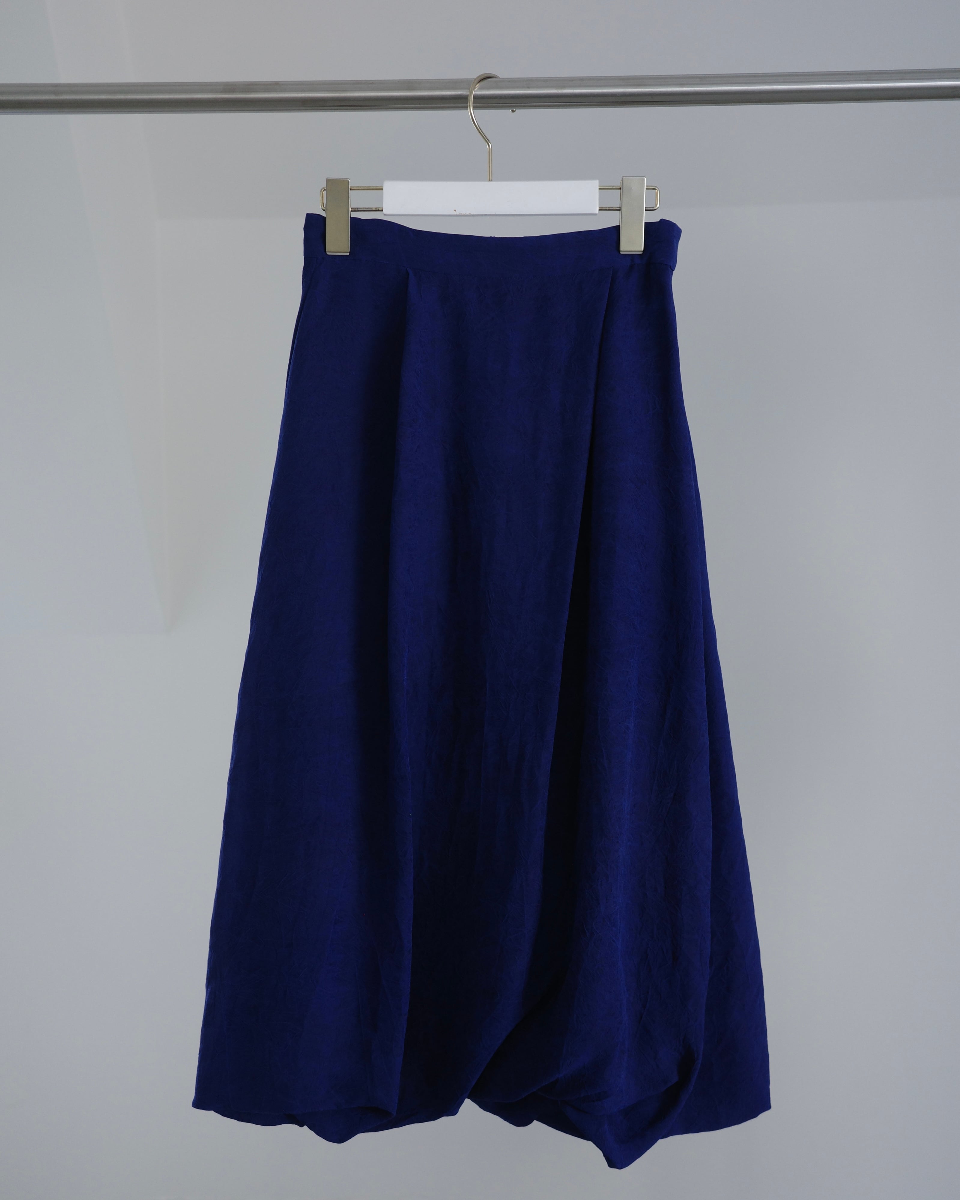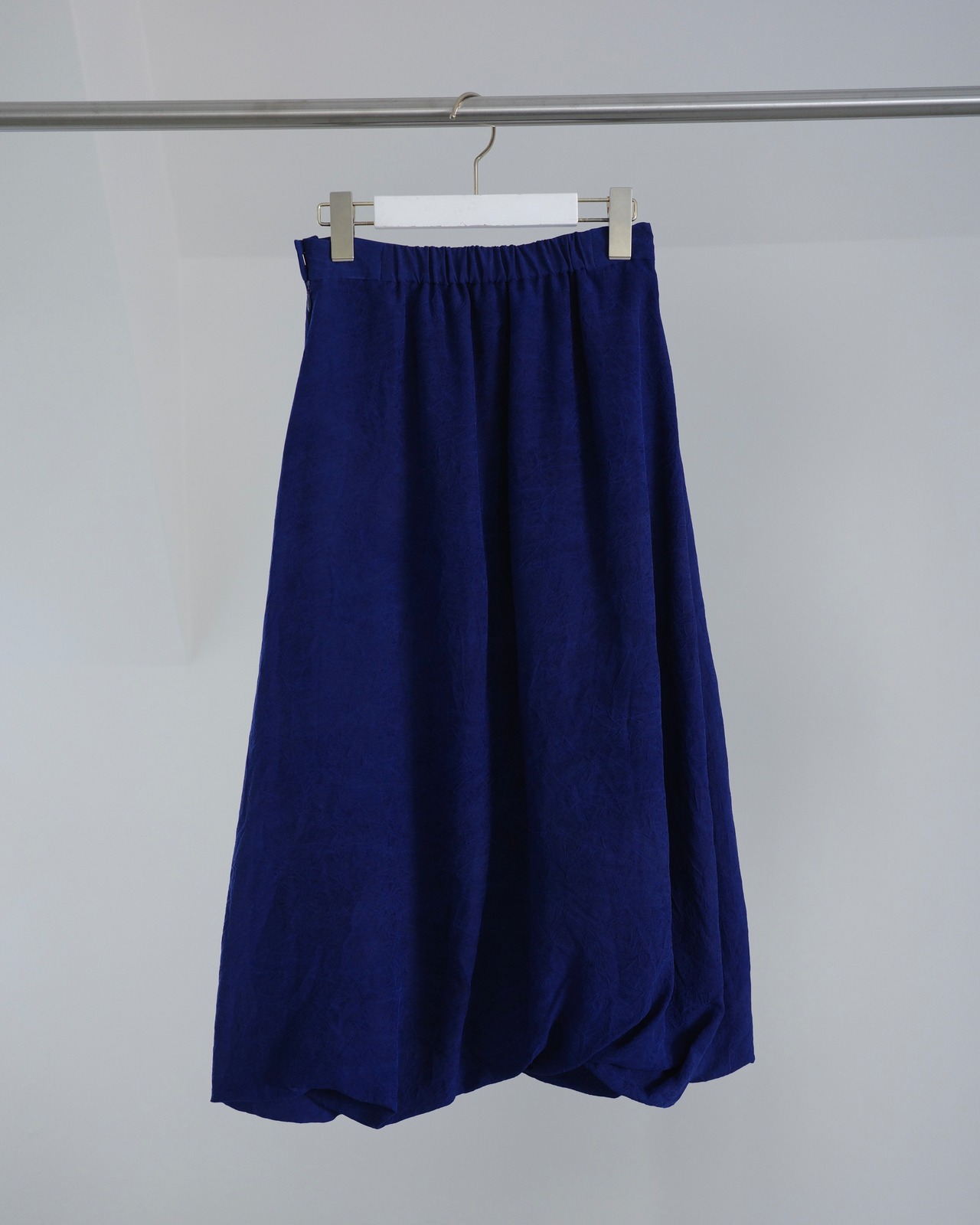 キュプラの生地に塩縮加工を施し、仕上げは加工による細かなシワを美しくセット。凹凸を抑えつつニュアンスのあるクリーンな表情に整えている。塩素によるわずかな色ムラが独特の陰影を生み、その特別感はまるで一点物。加工の質感と上品な透け感が合わさることで、エレガントな雰囲気を纏う。