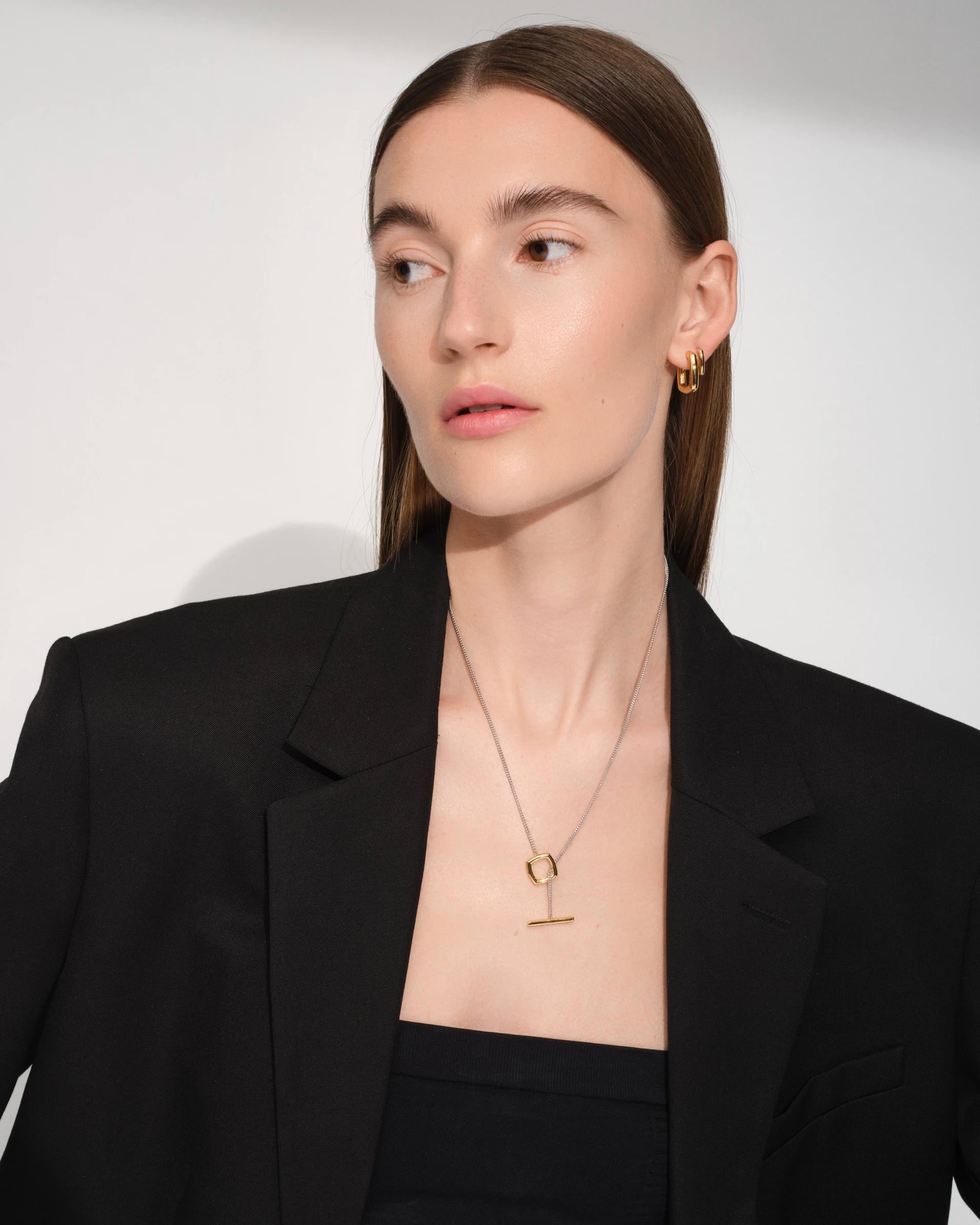 フレームペンダントデュオは、スリムなカーブチェーンにカスタムメイドのTバーとリングクラスプをセットしたコンテンポラリーなネックレスです。クッションシェイプをデザインの中心に据えたフレームコレクションは、私たちの最初のシグネチャースタイルへのオマージュです。