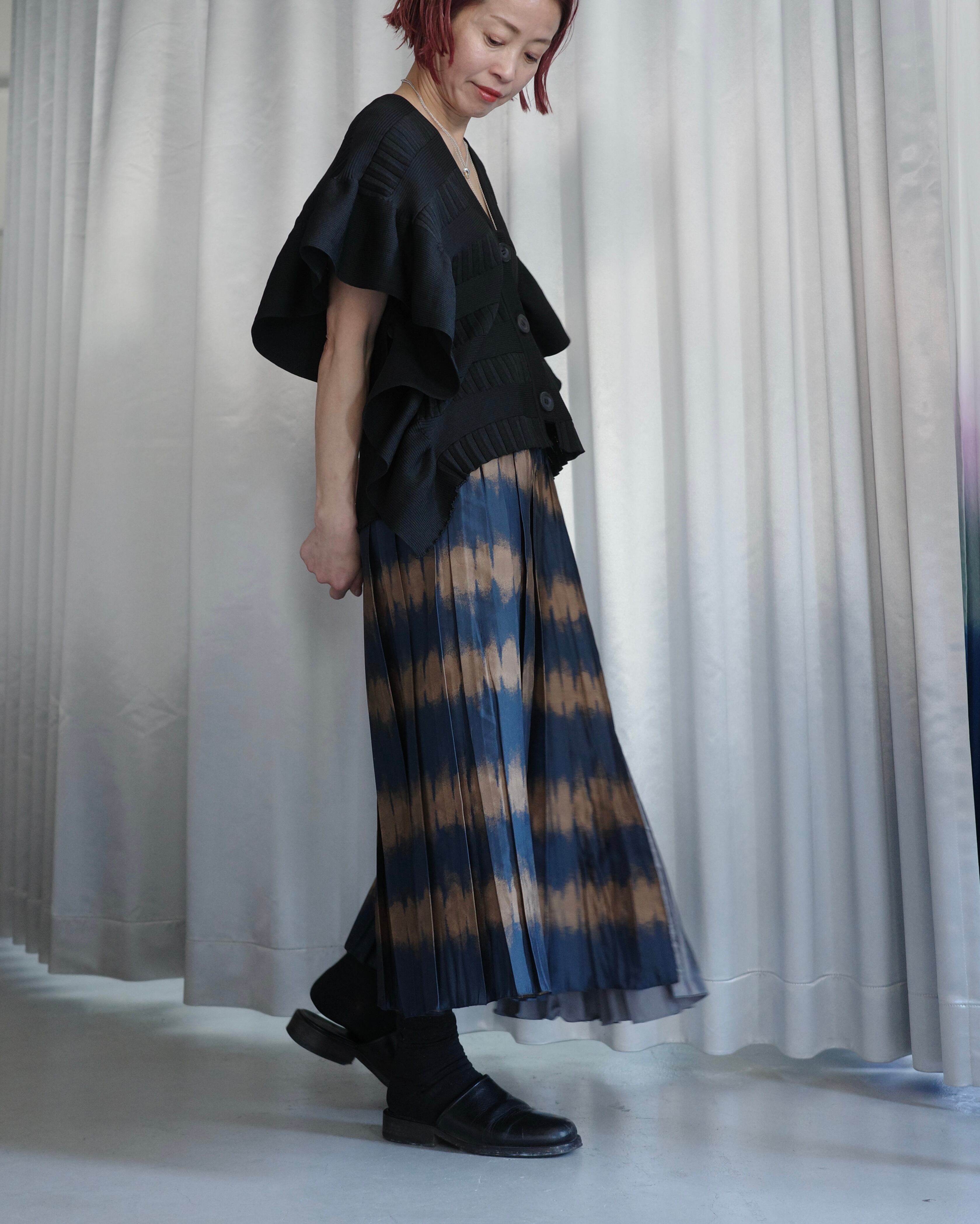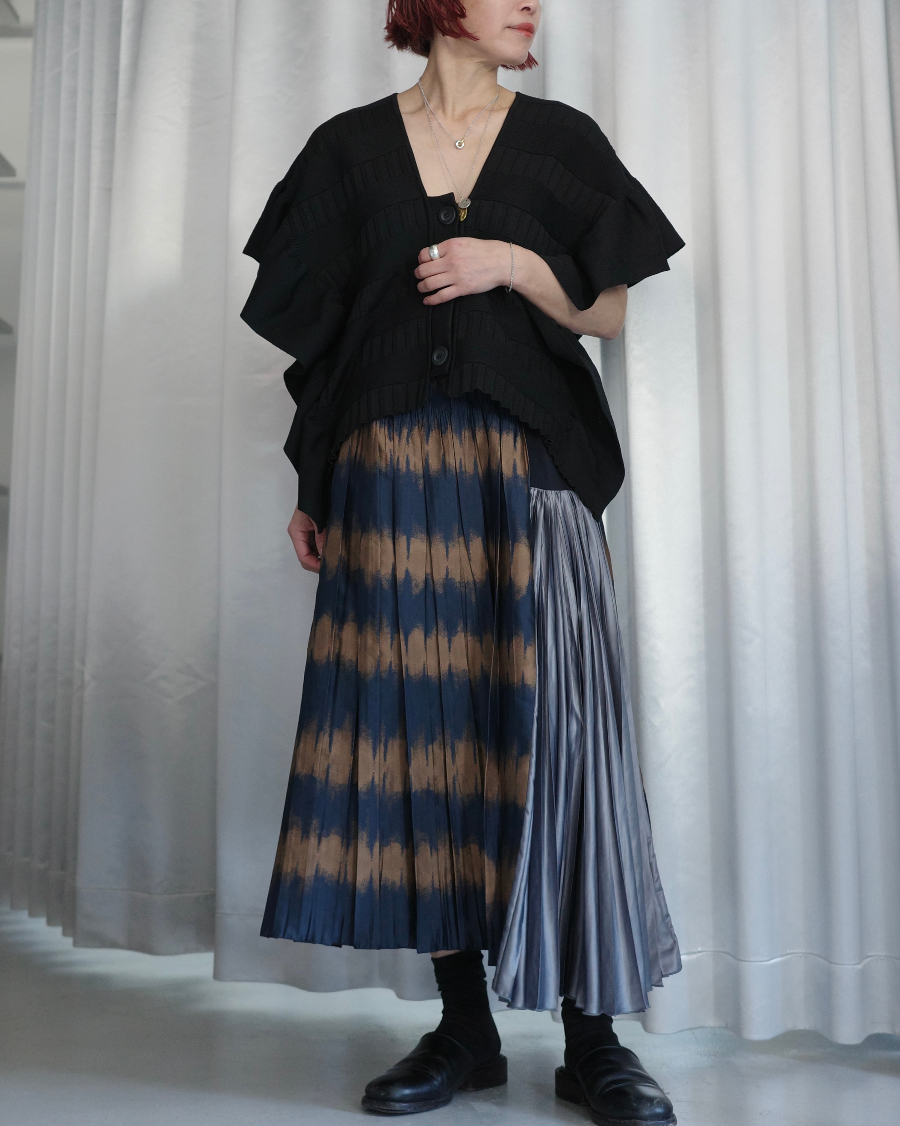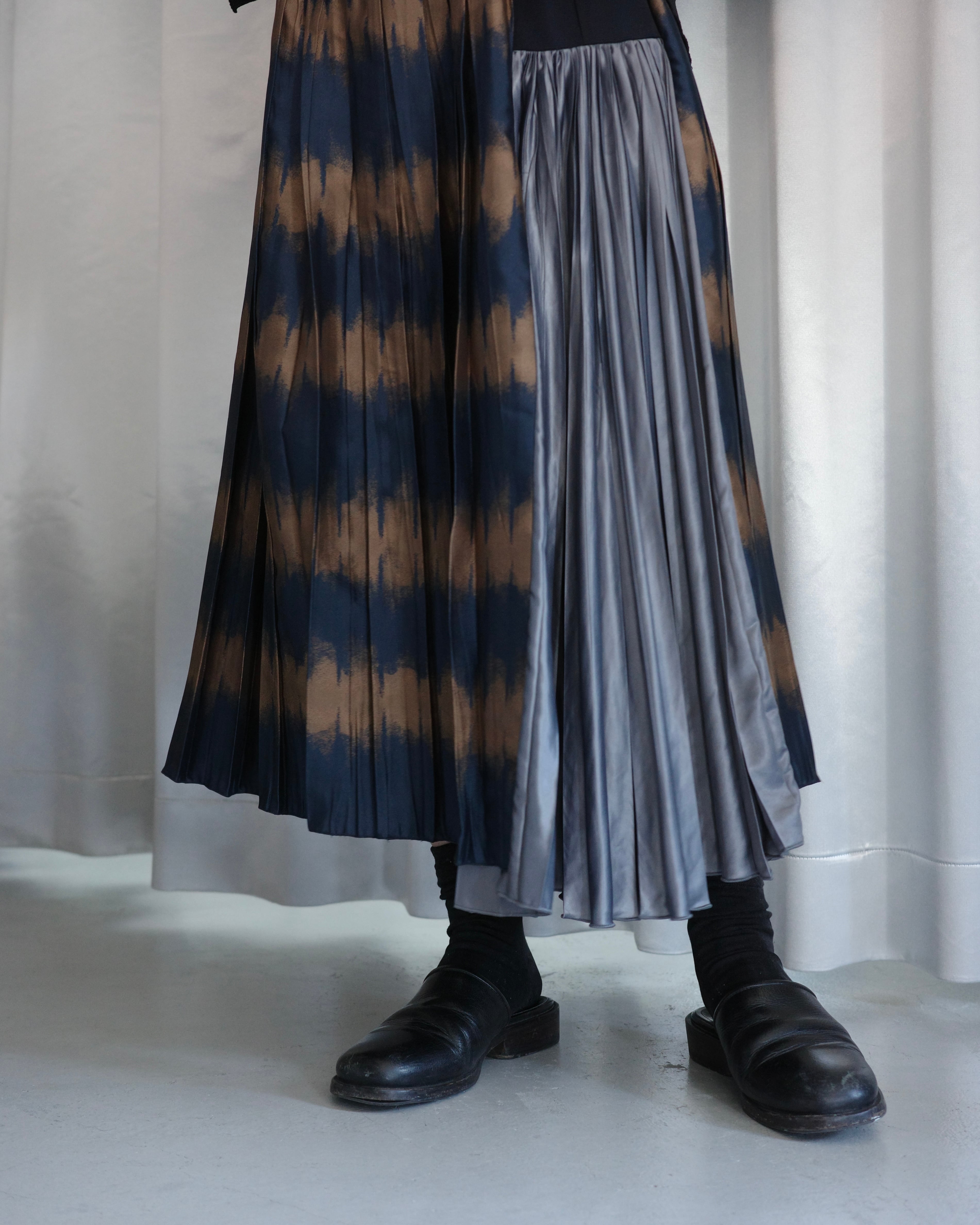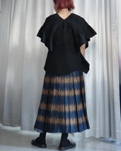 異なるピッチの3種類のプリーツを組み合わせ、アシンメトリーに構成したデザインが動くたびに奥行きのある表情を演出。