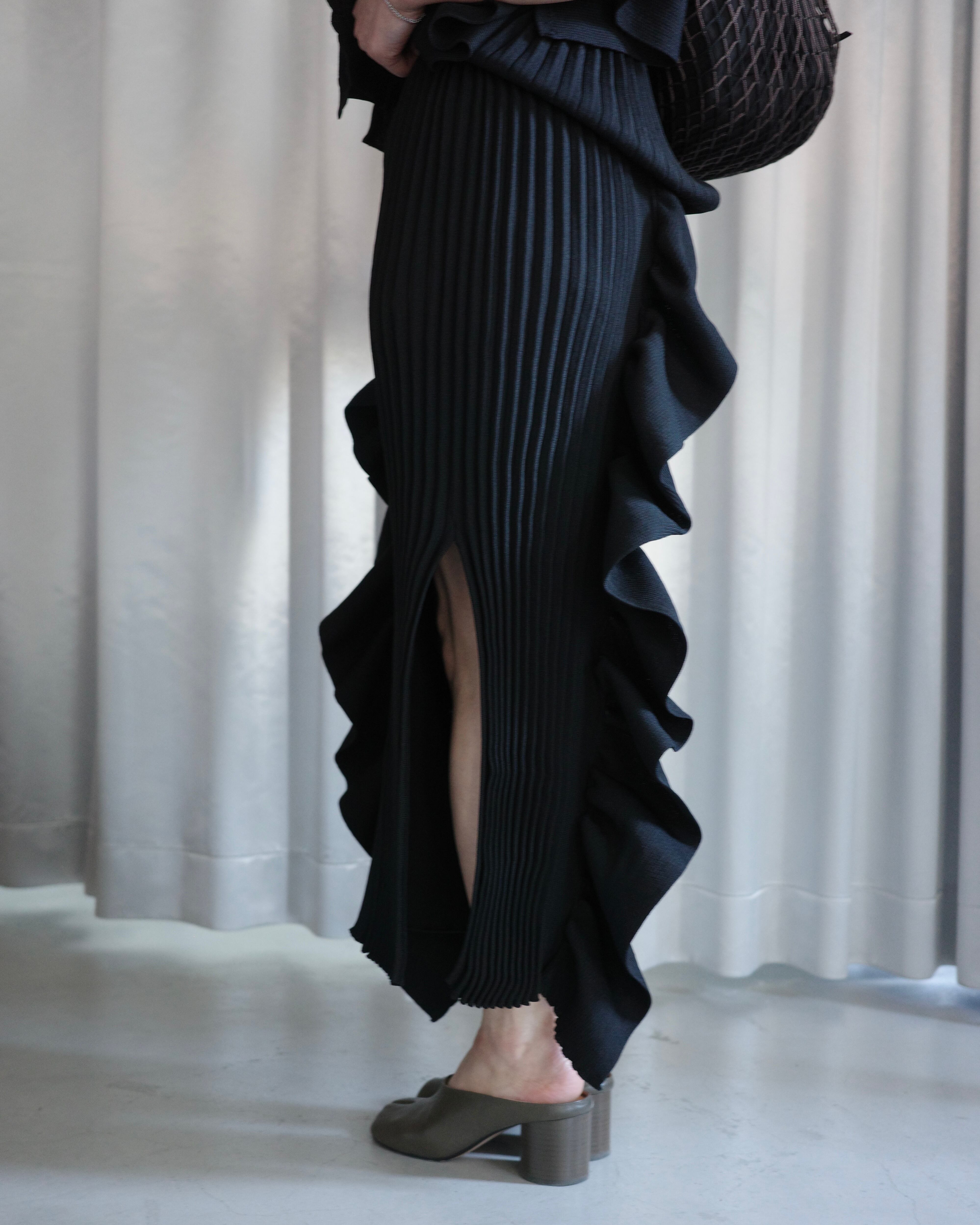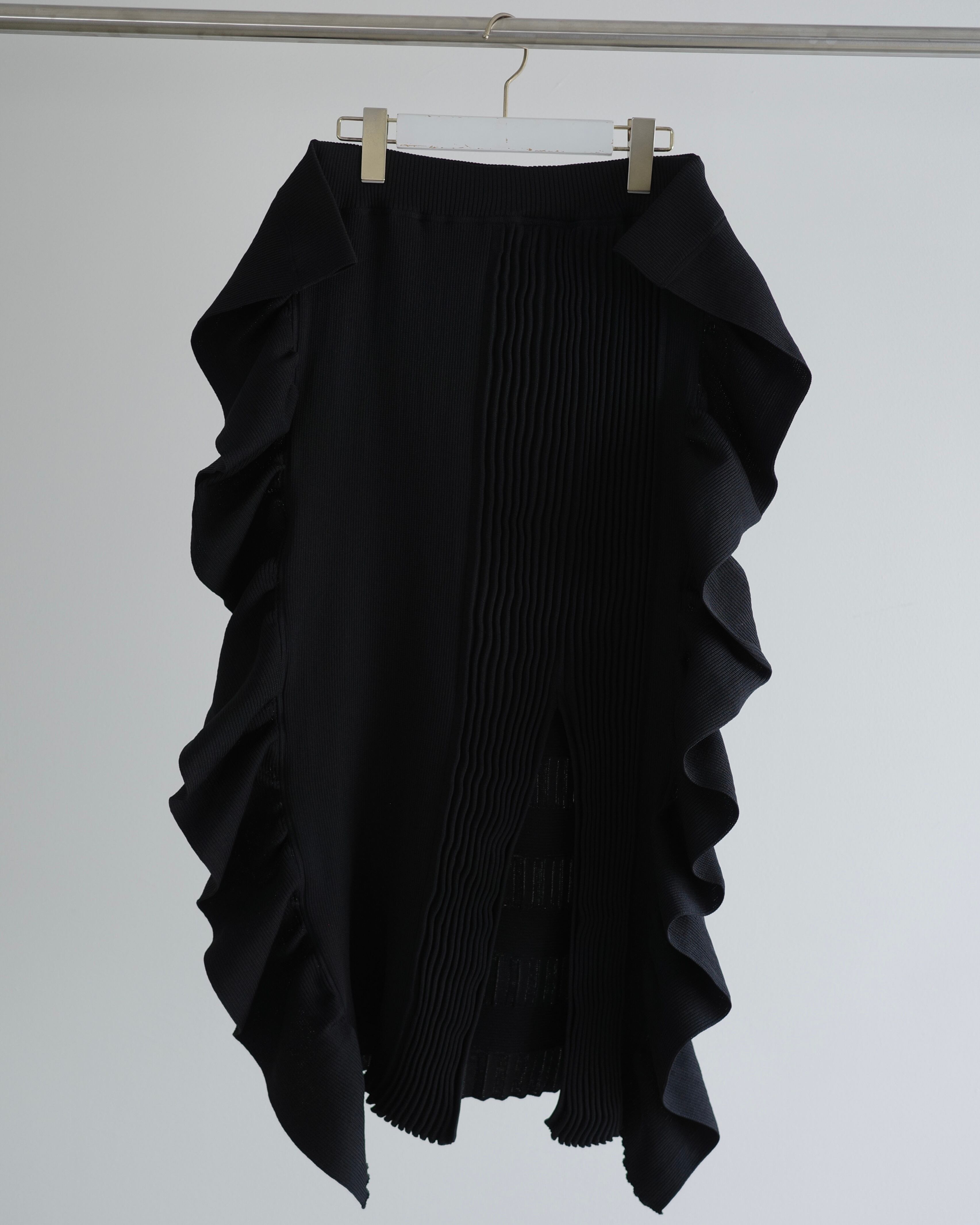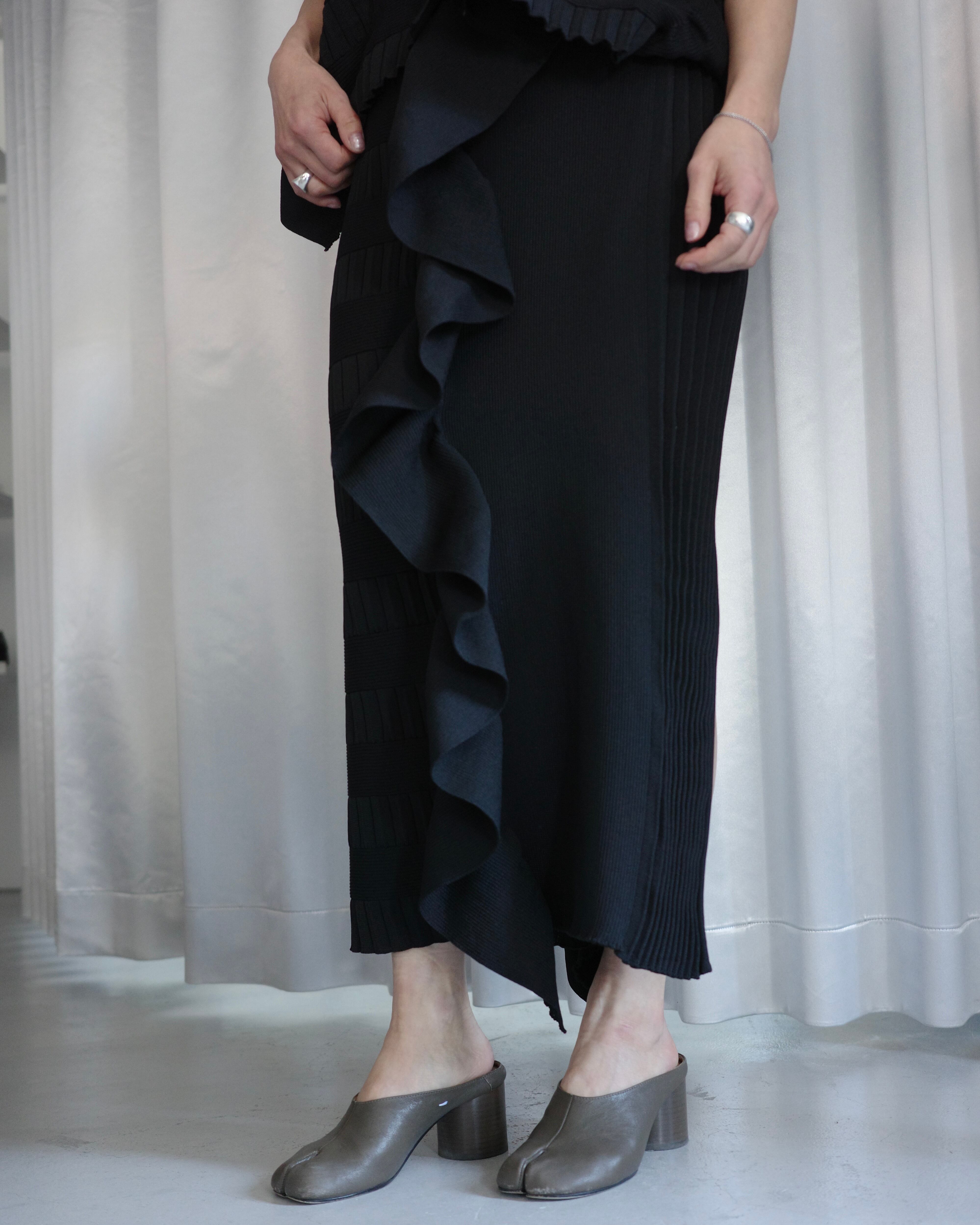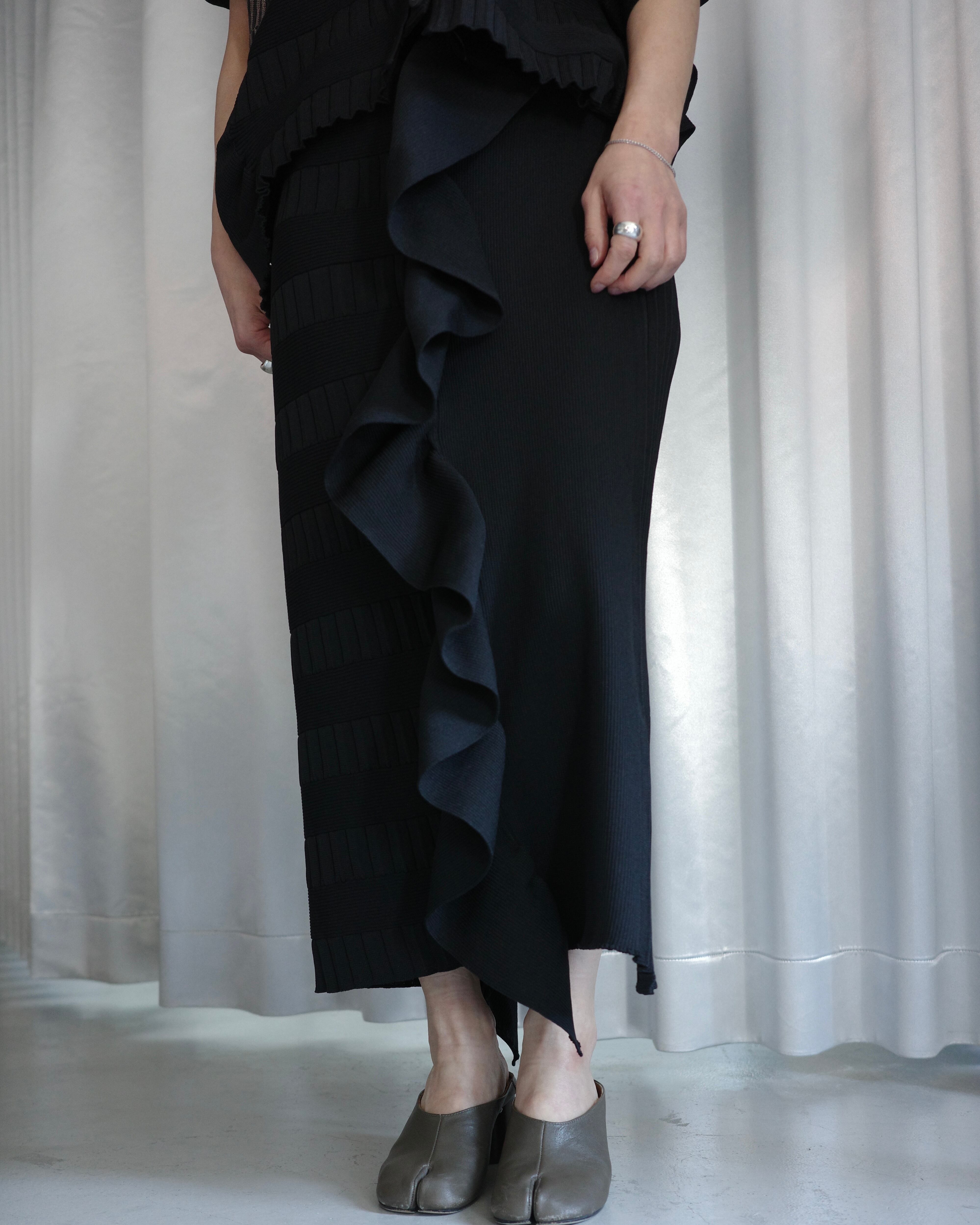 立体的なフリルデザインが印象的なニットスカートは、前後で編地を切り替えた奥行きのある表情が魅力の一着。