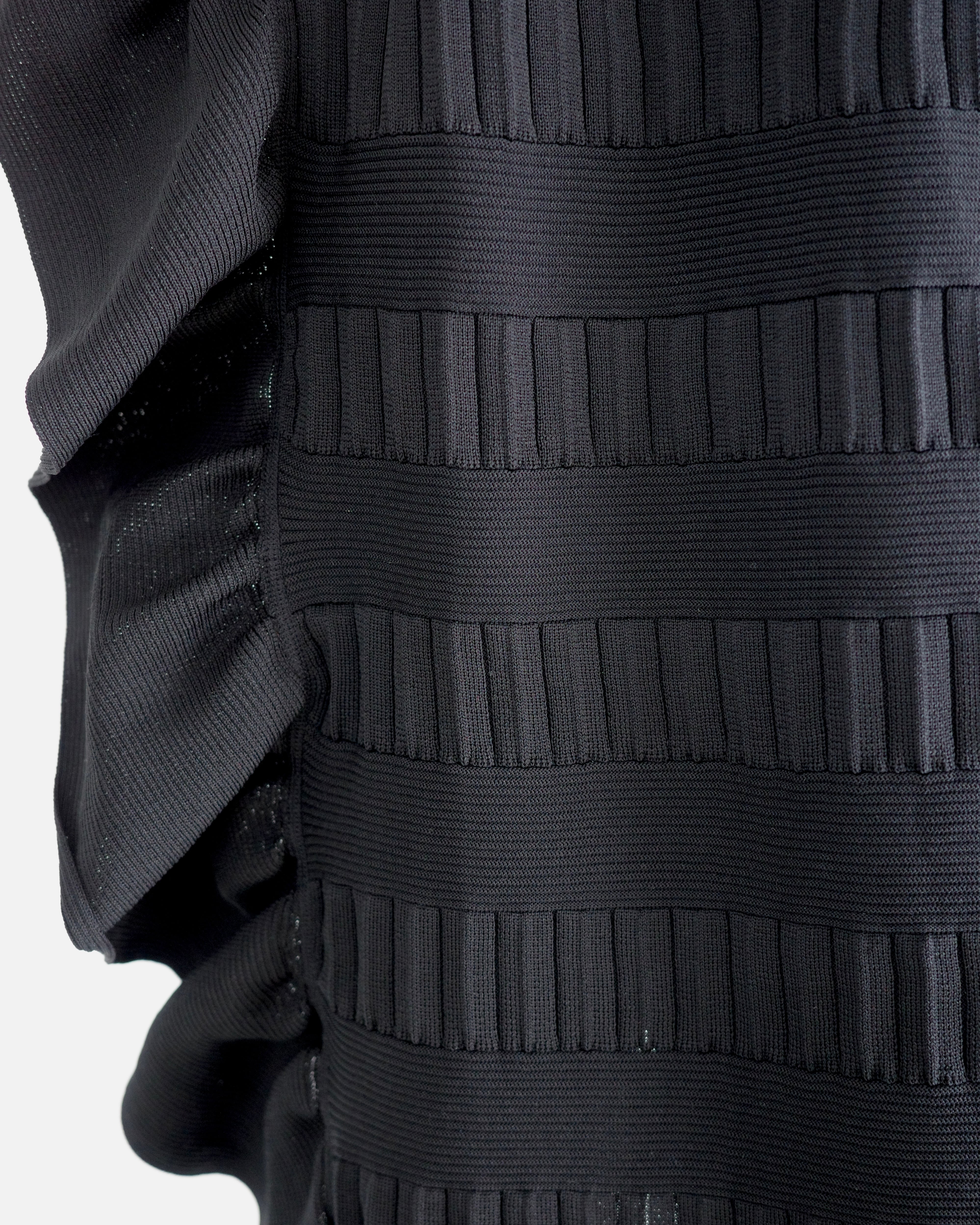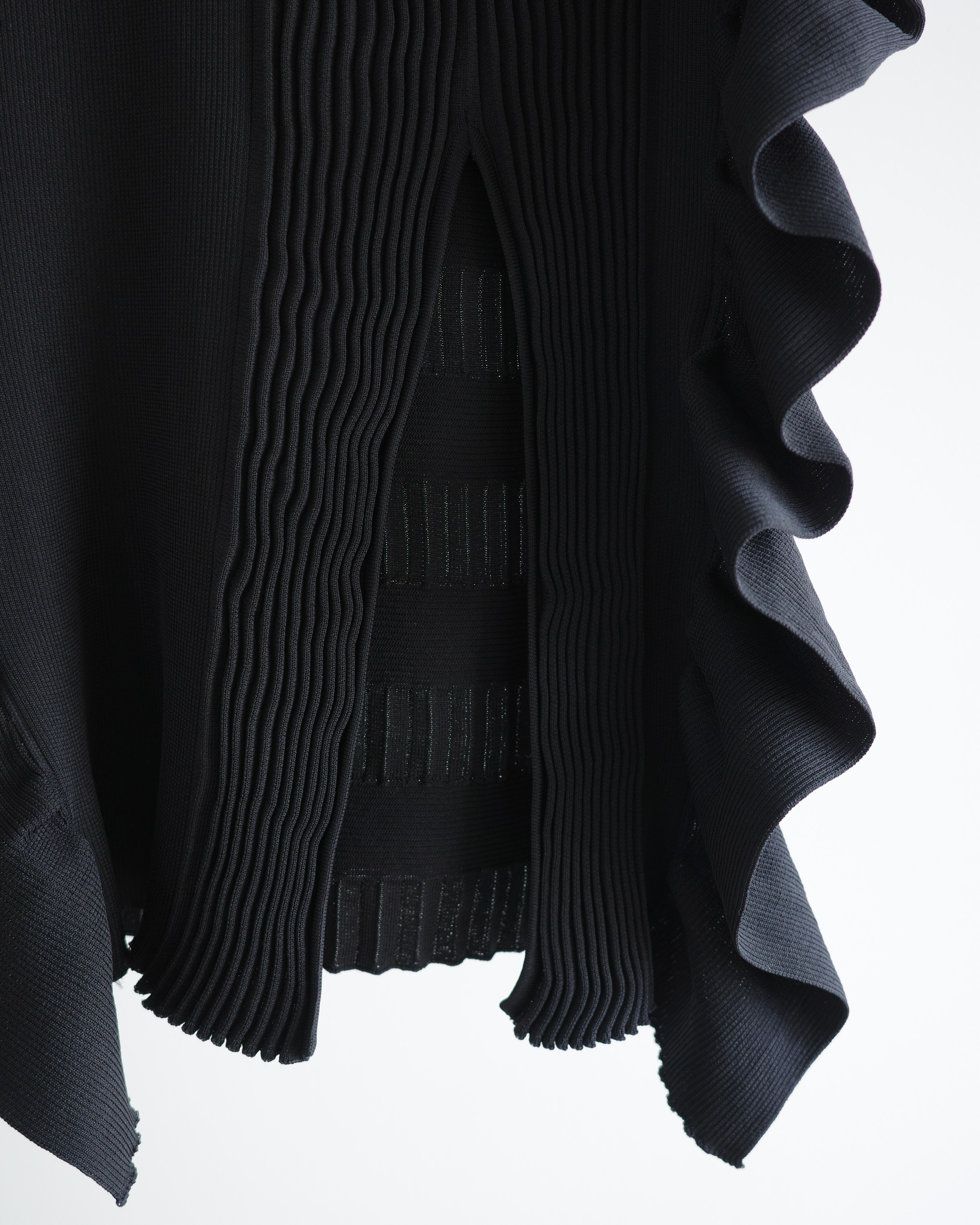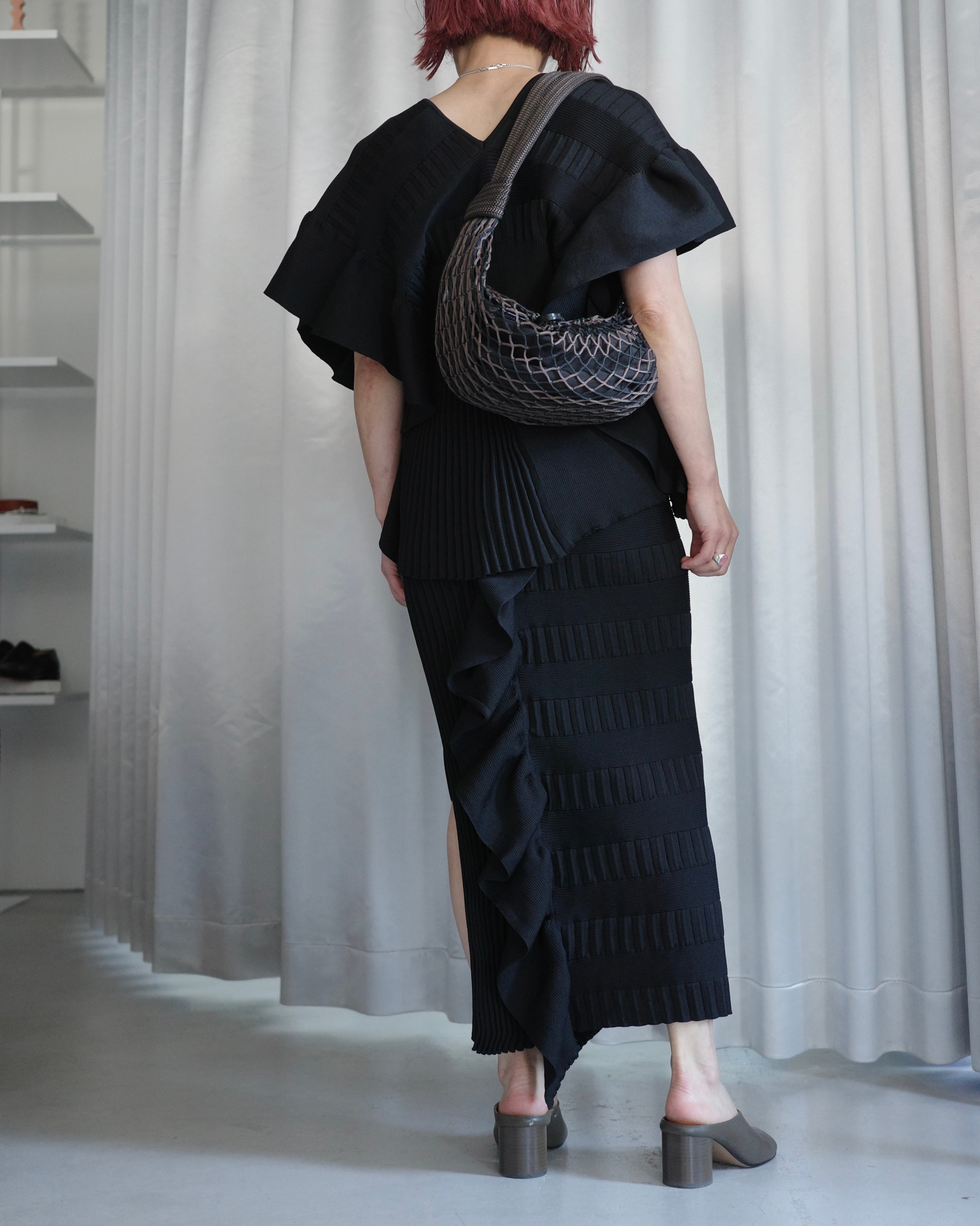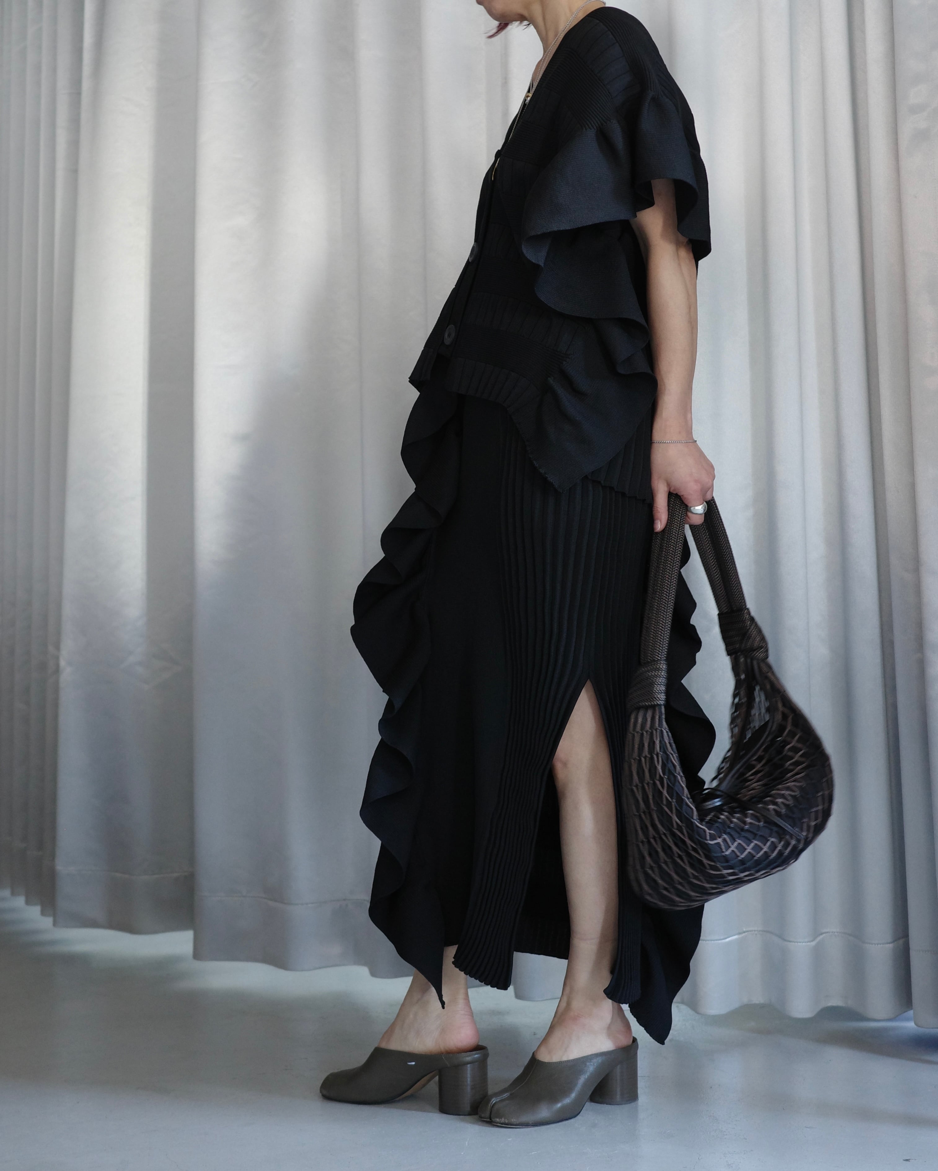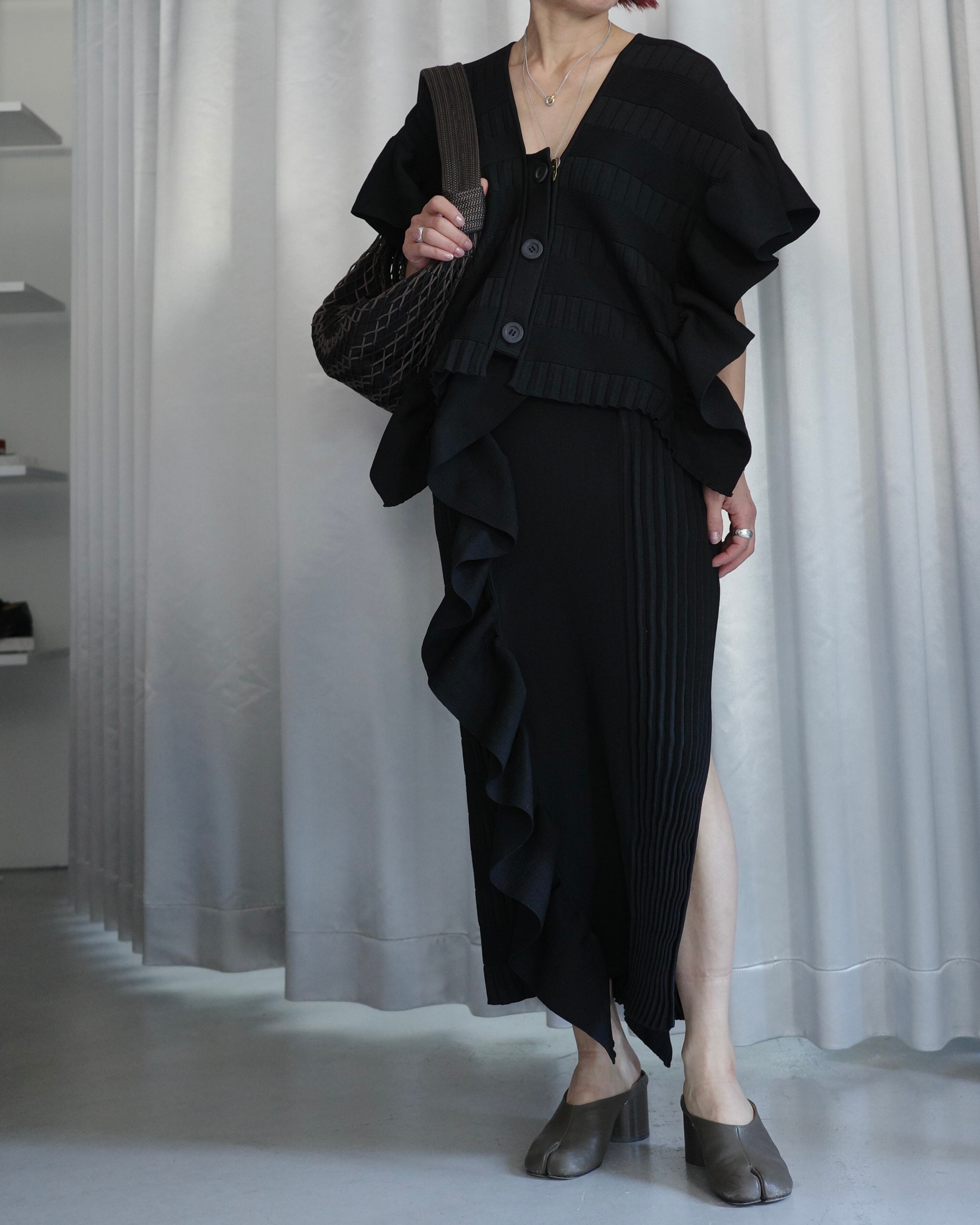 立体的なフリルデザインが印象的なニットスカートは、前後で編地を切り替えた奥行きのある表情が魅力の一着。