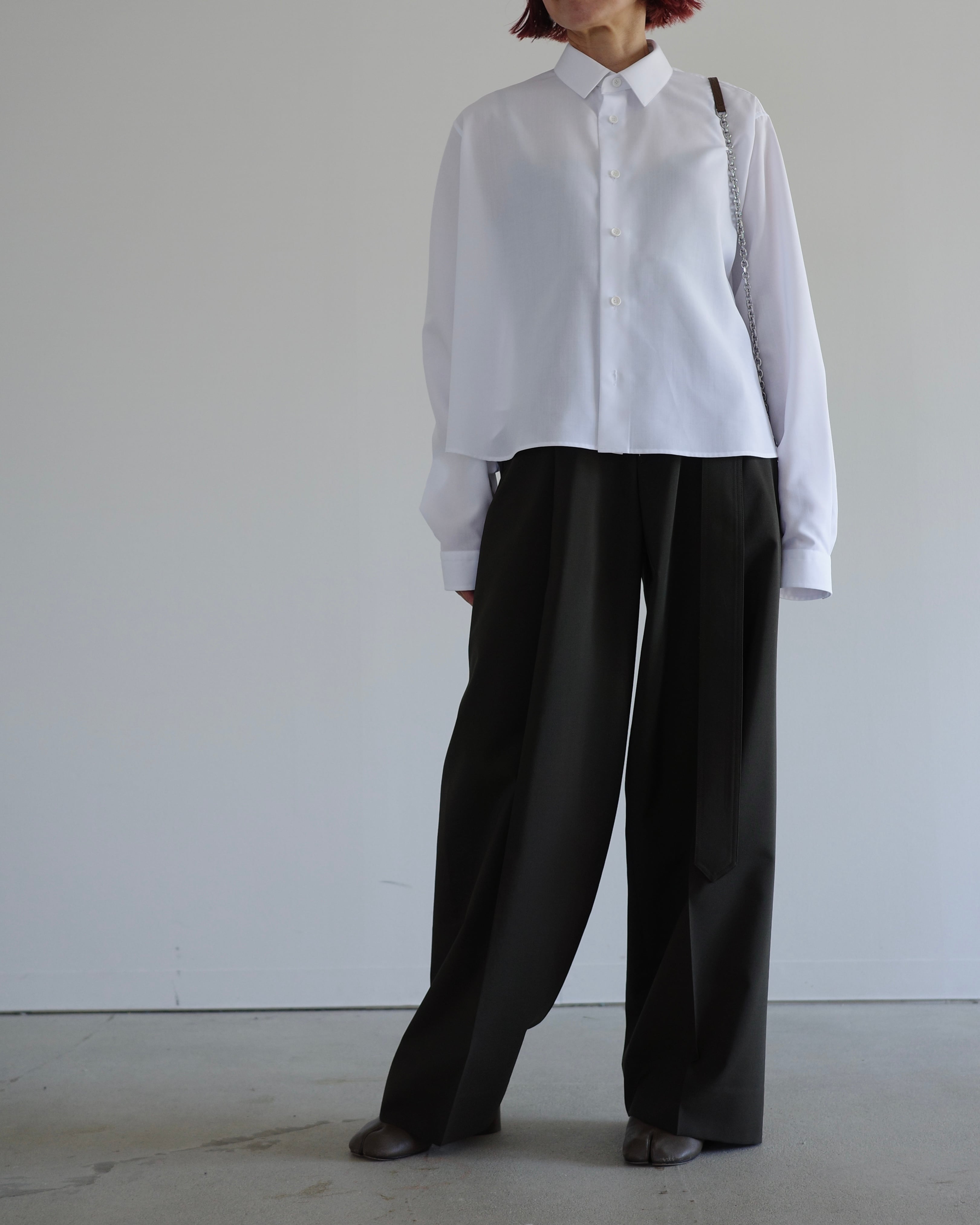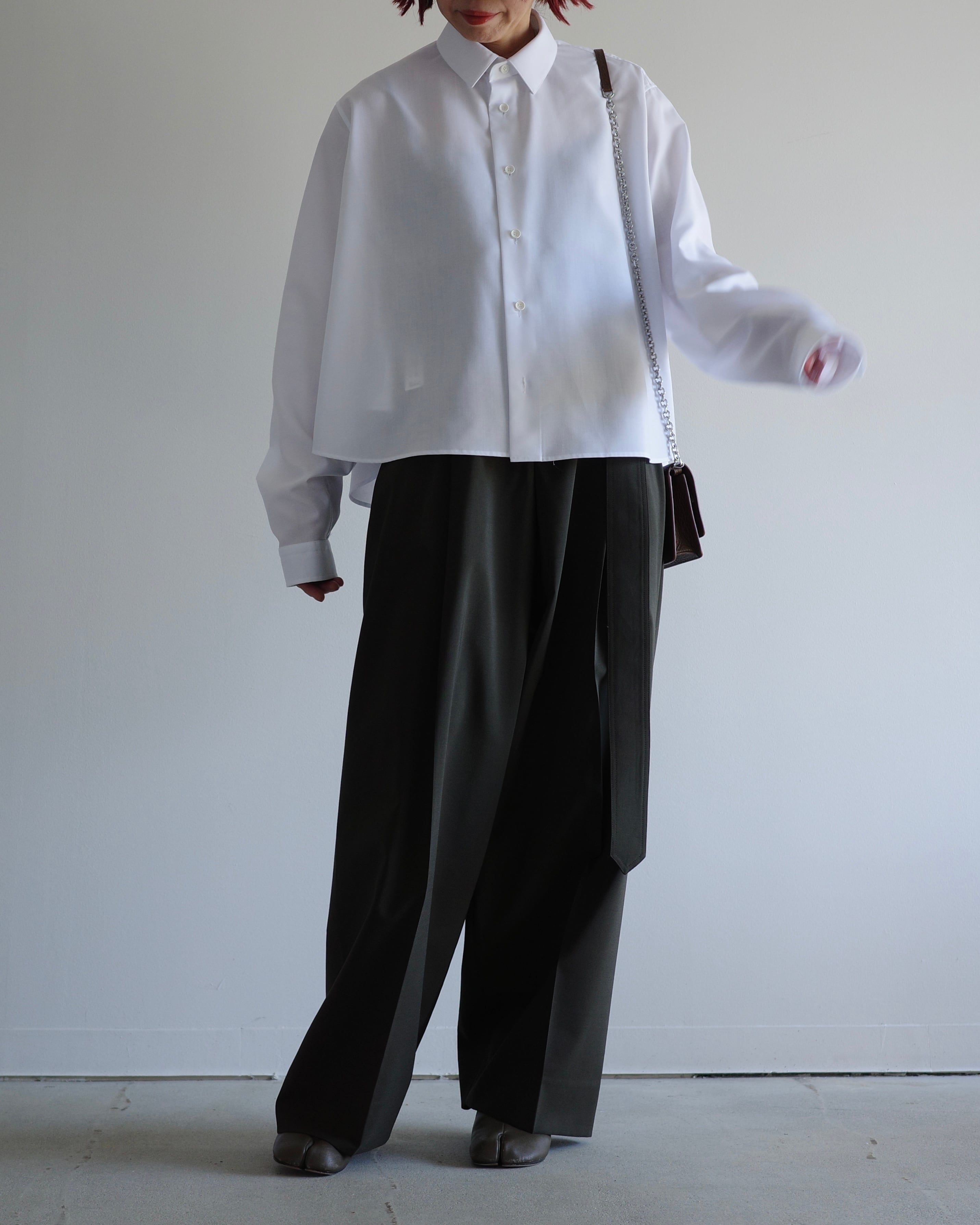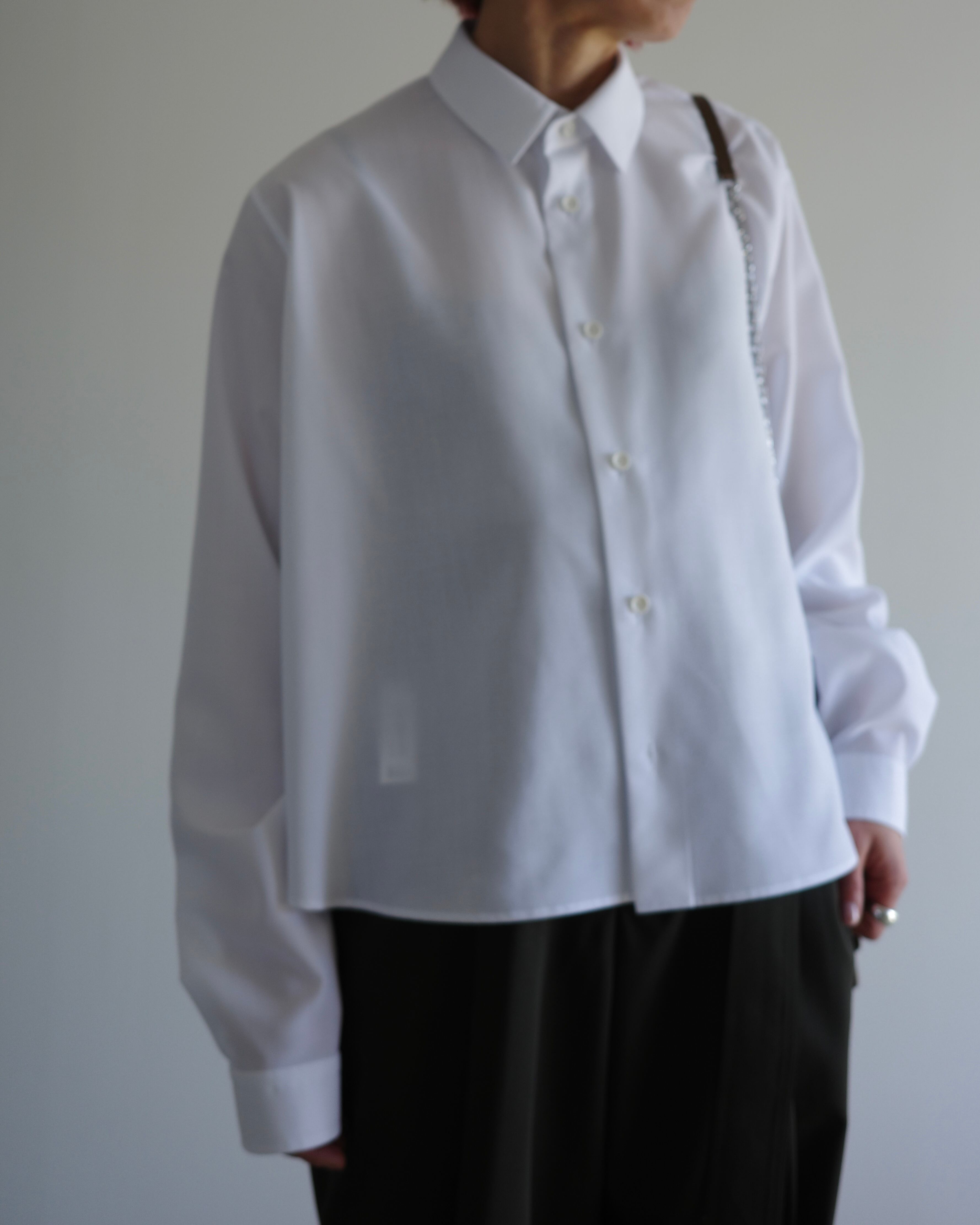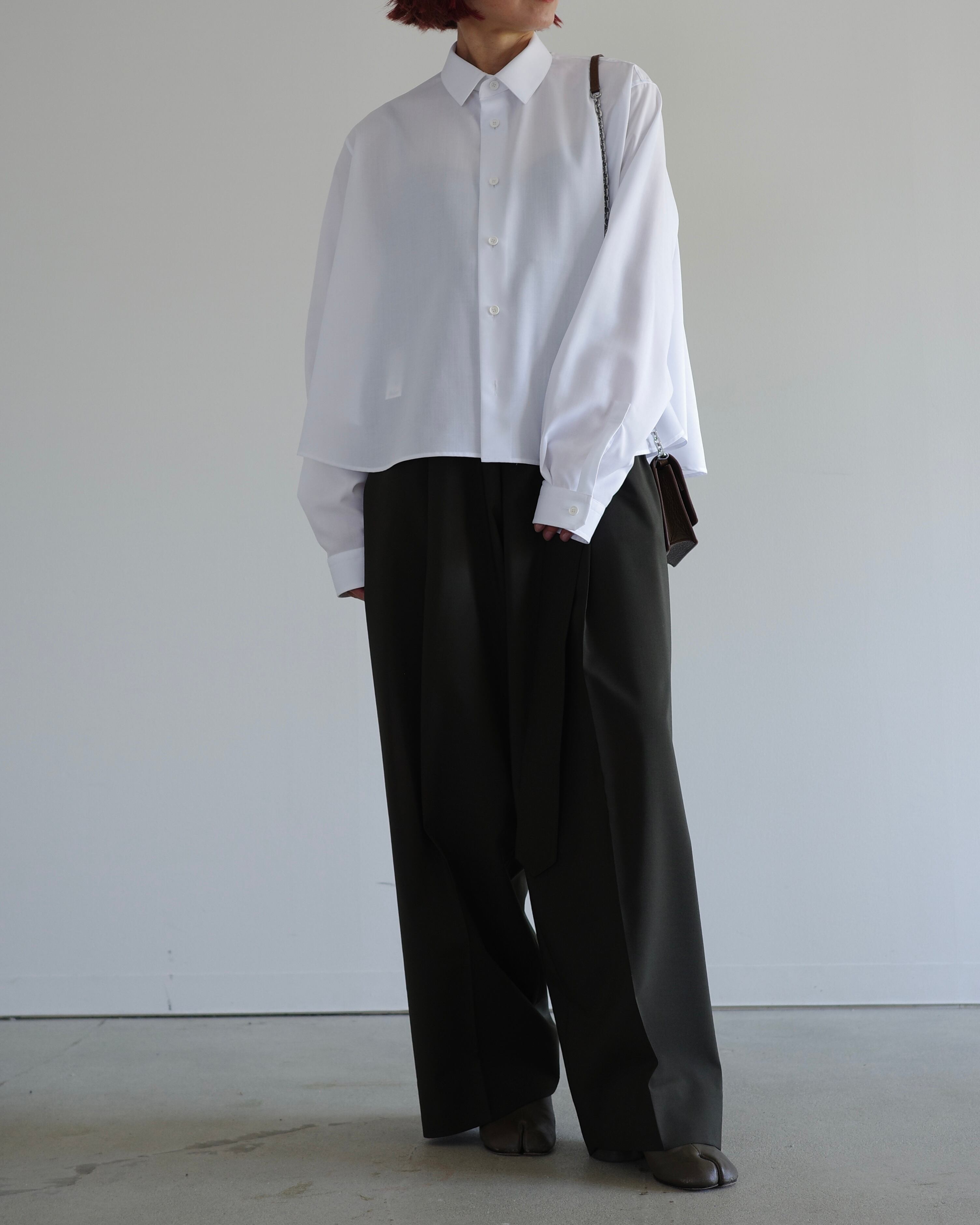 スーパーライトのスパンブロード素材を使用したレギュラーカラーのAラインシャツです。軽やかで滑らかな素材感が特徴で、動きやすく快適な着心地を叶えます。シンプルな前立てとドロップショルダーで肩回りに柔らかな印象を添え、裾に向かって広がるAラインが女性らしい立体感を演出します。襟元はレギュラーカラーで洗練された印象を保ち、長めの袖丈が自然にブラウジングして立体感を生み出します。軽やかで上質な素材感と美しいシルエットが、1枚でもレイヤードスタイルでも上品に映える、THE RERACSならではのシャツです。