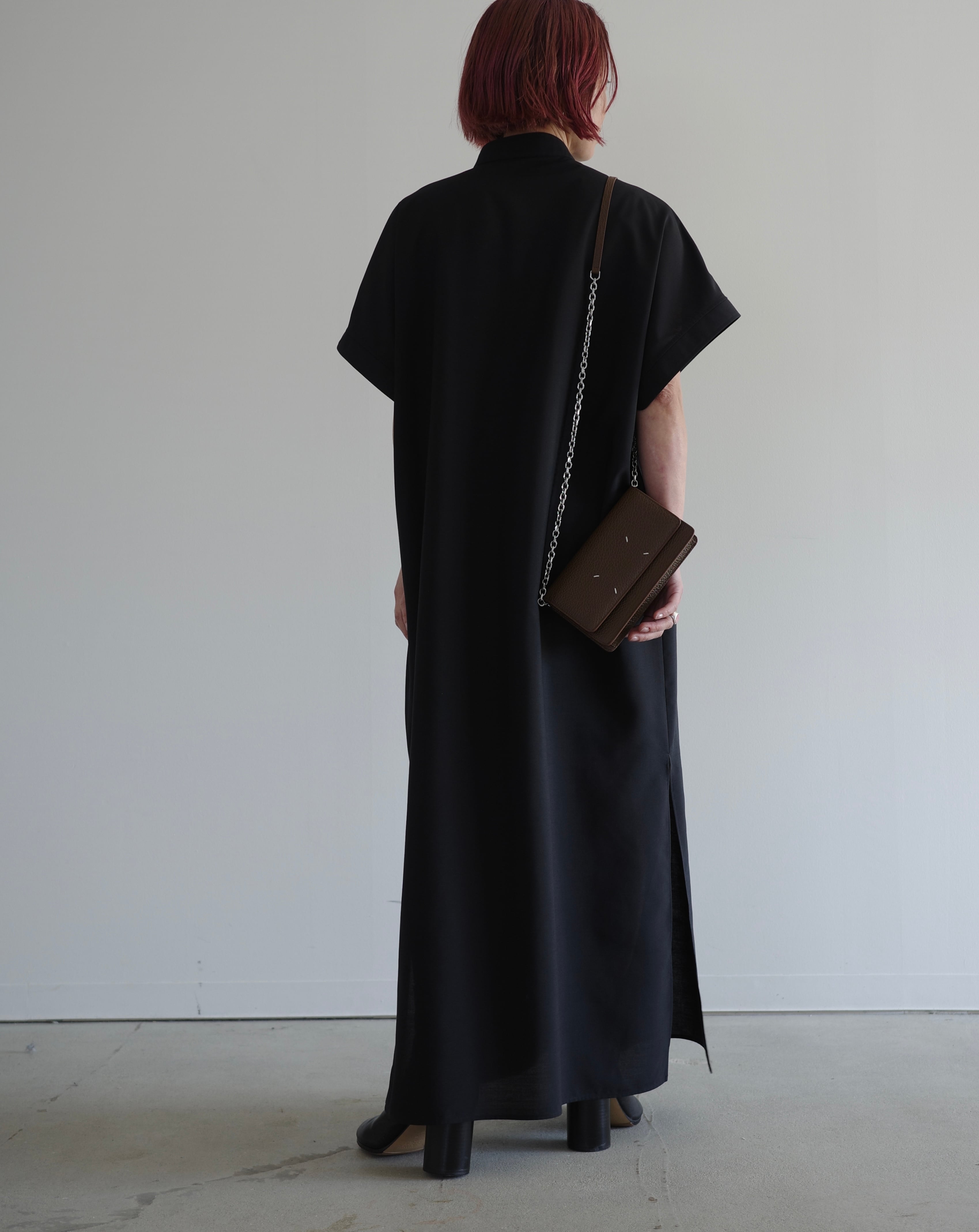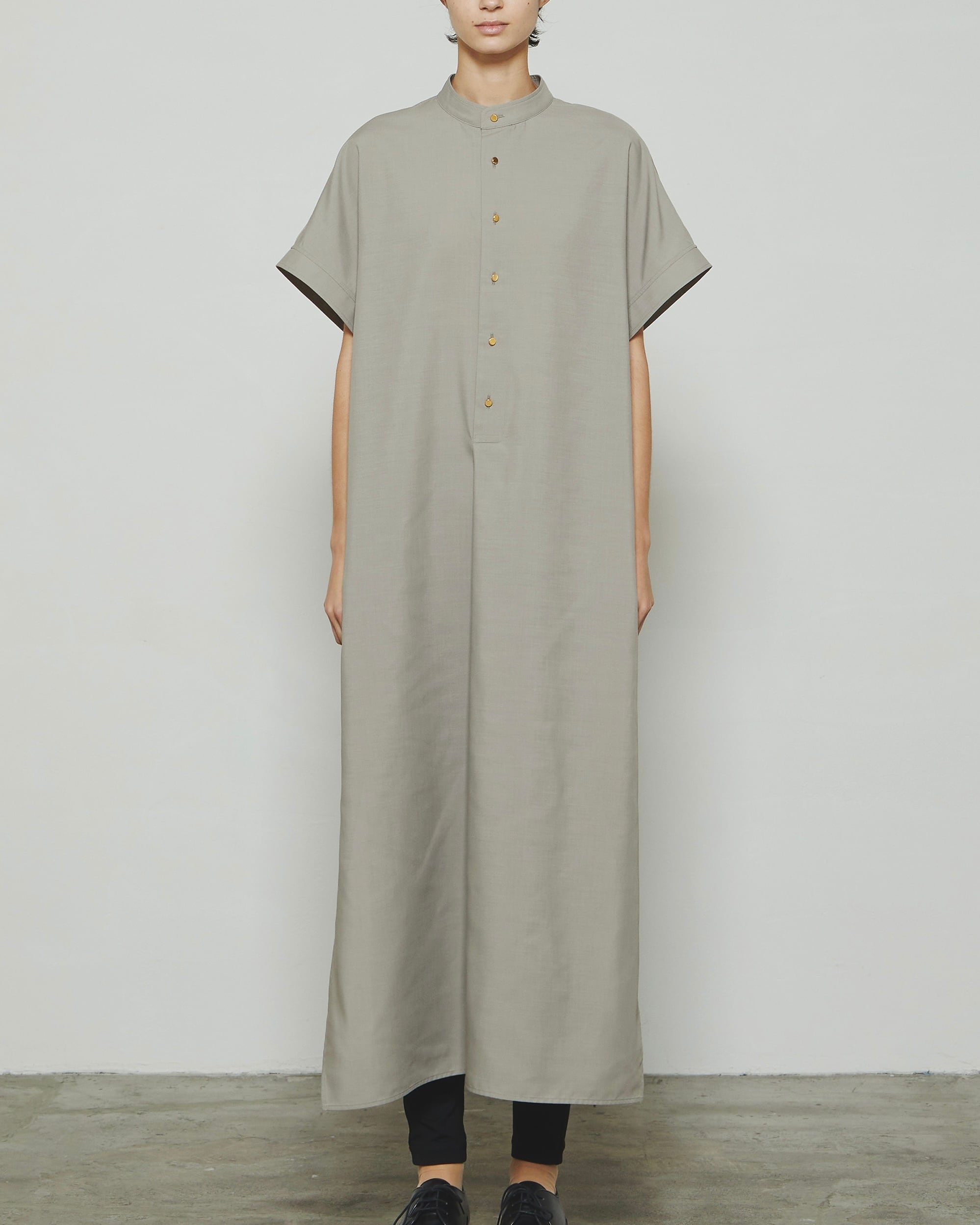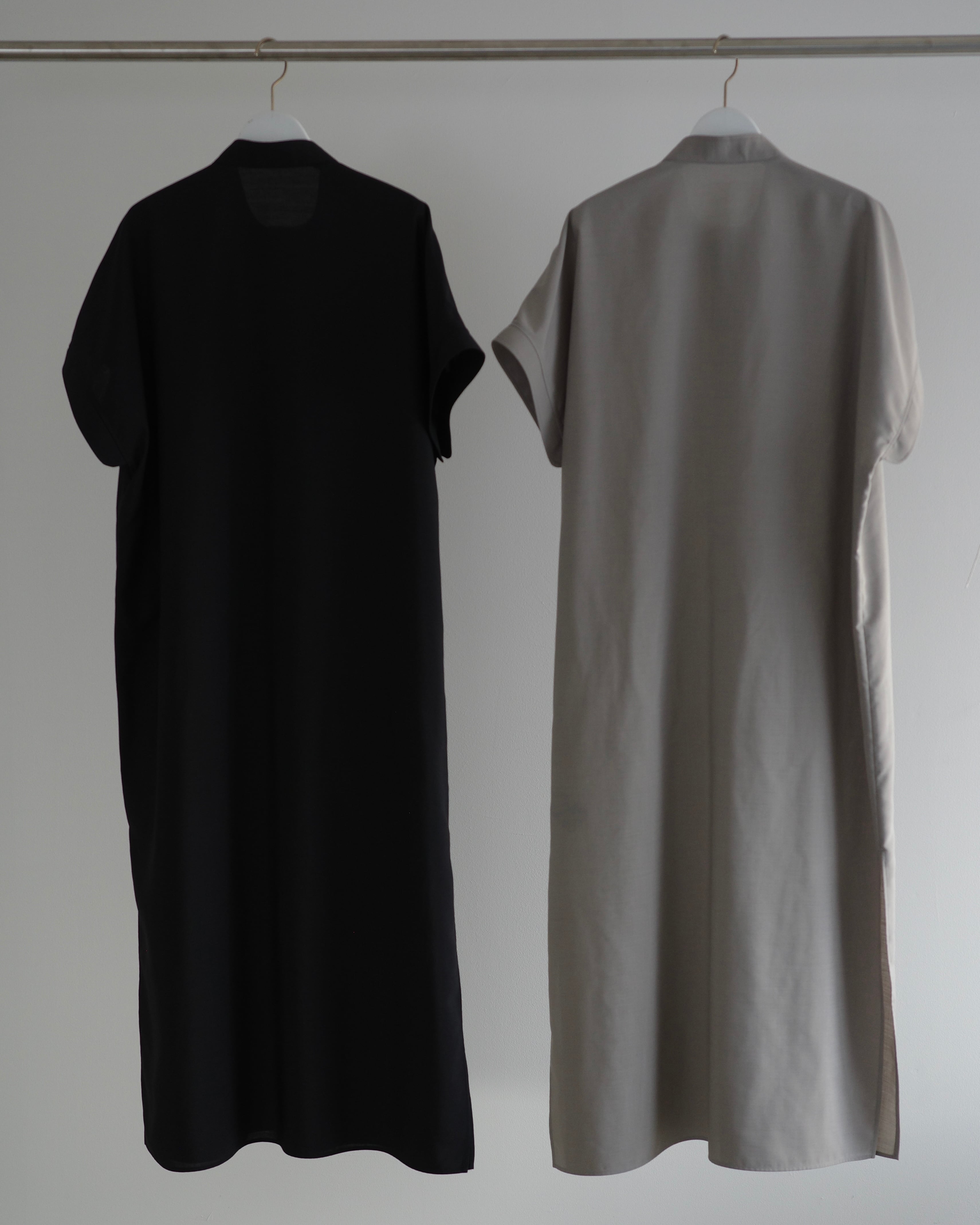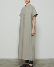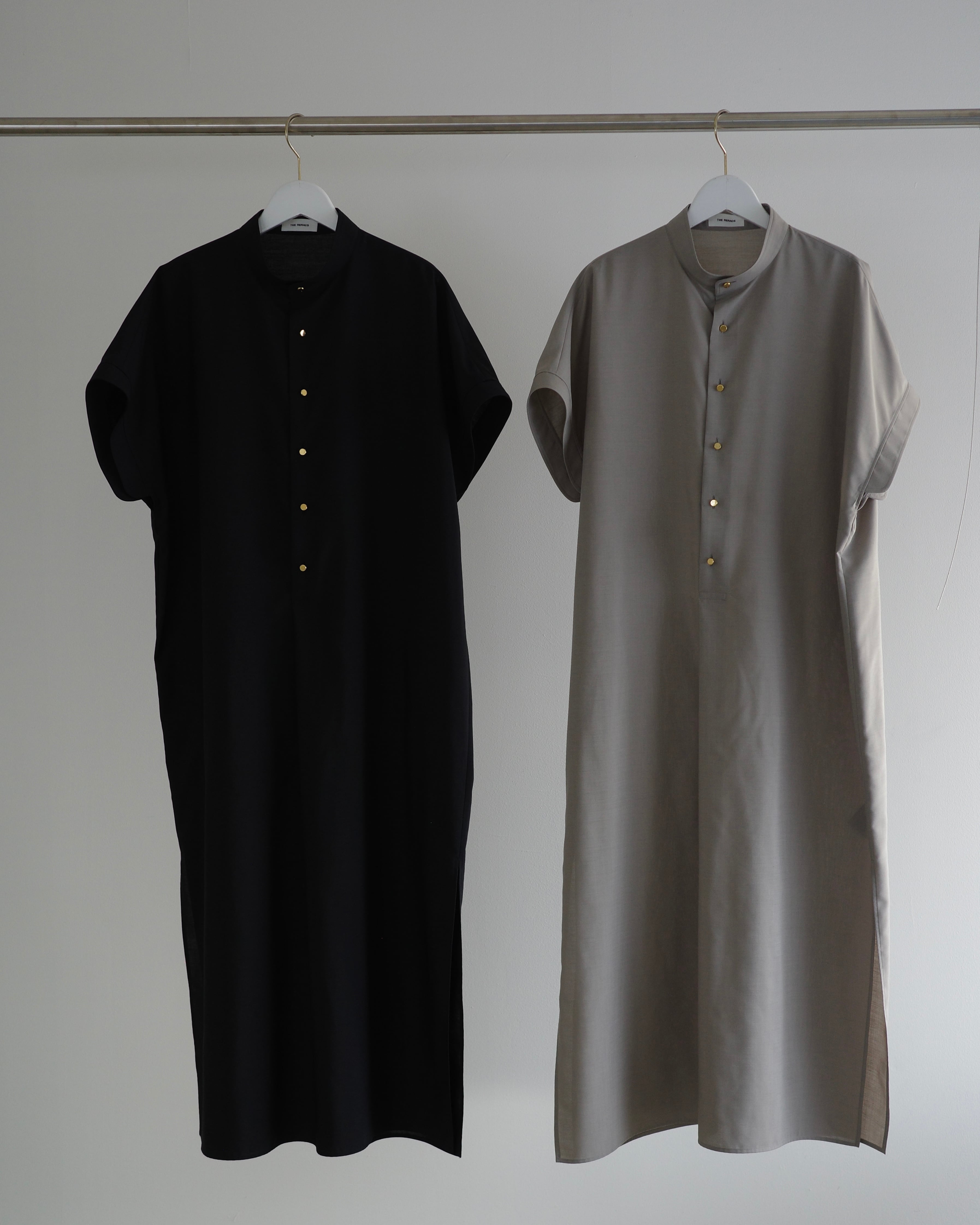 コットンのような質感を持つ薄手のスパンポリエステルを使用したフロントタックポロドレス。素材は、コットンライクな風合いを持つスパンポリエステルのブロード生地で、通気性に優れ、何度洗濯しても型崩れやシワが生じにくい、最先端の繊維技術を活かしたTHE RERACSオリジナルの素材です。衿はやや高めに設定されたシンプルなバンドカラーで、首元からフロントにかけて連なるTHE RERACSオリジナルの真鍮釦と、中央に深く入ったフロントタックがアクセントとなり、洗練された上品な印象を与えます。サイドスリットは深めにデザインされており、足さばきが良く、歩くたびに軽やかで美しいシルエットが生まれます。