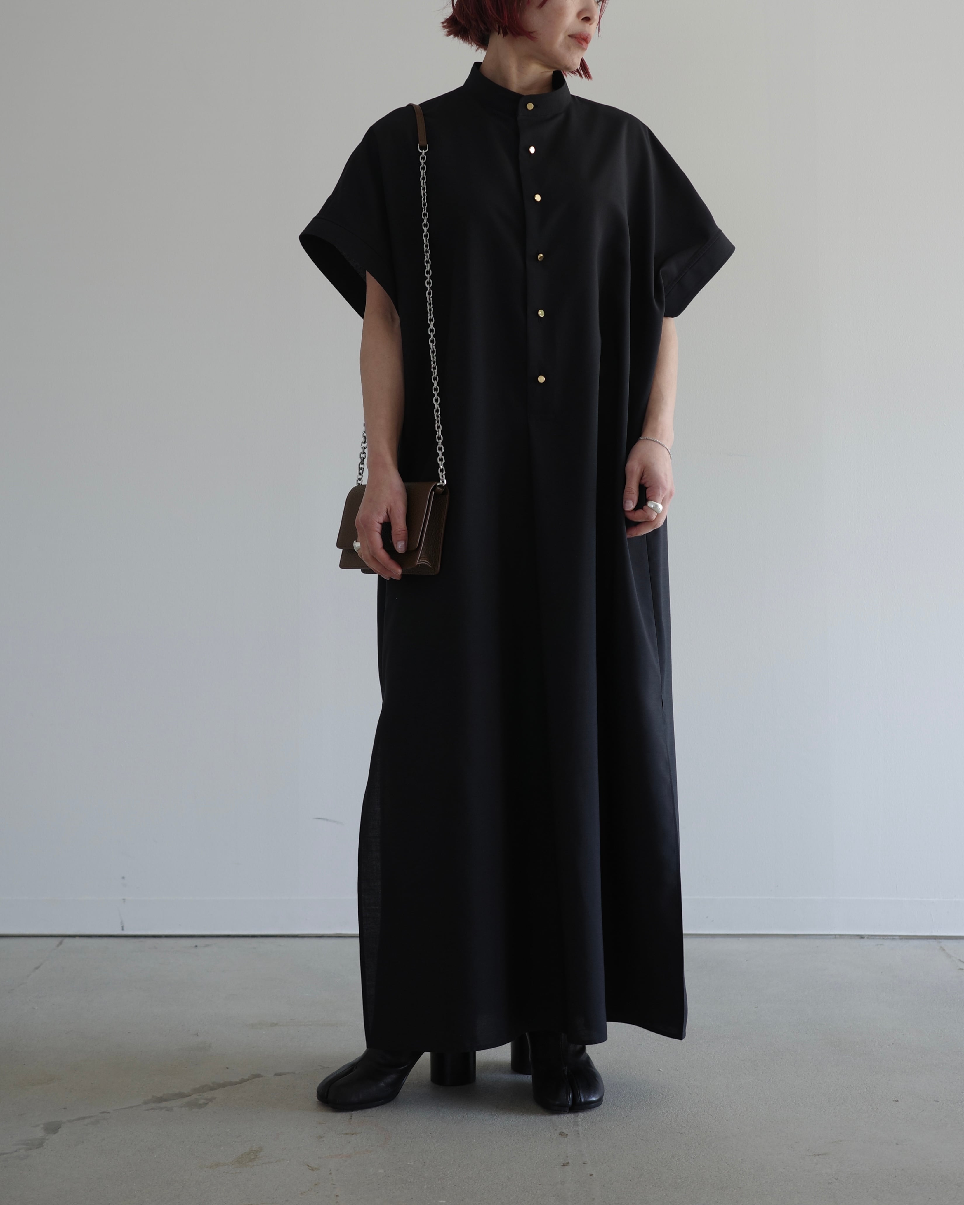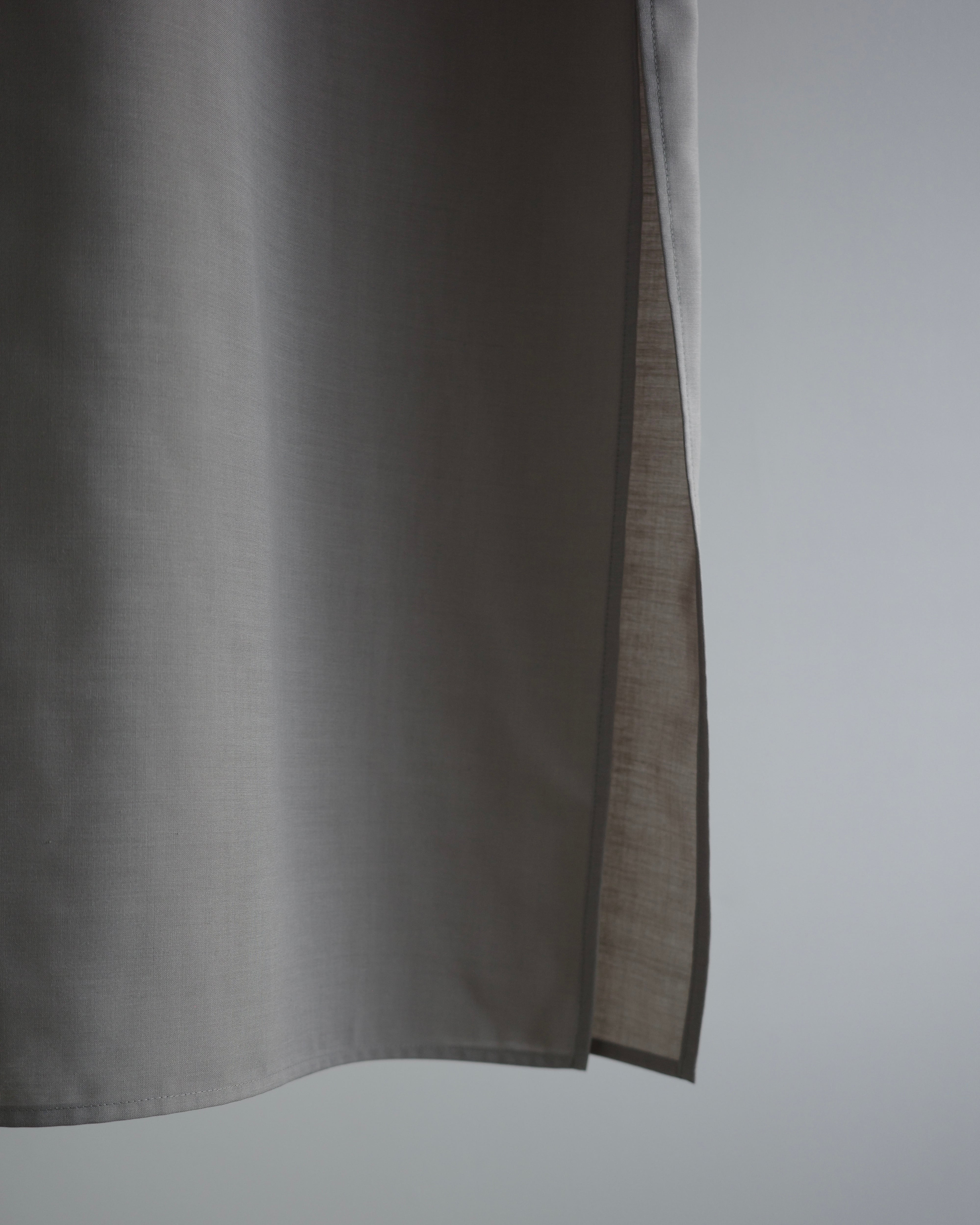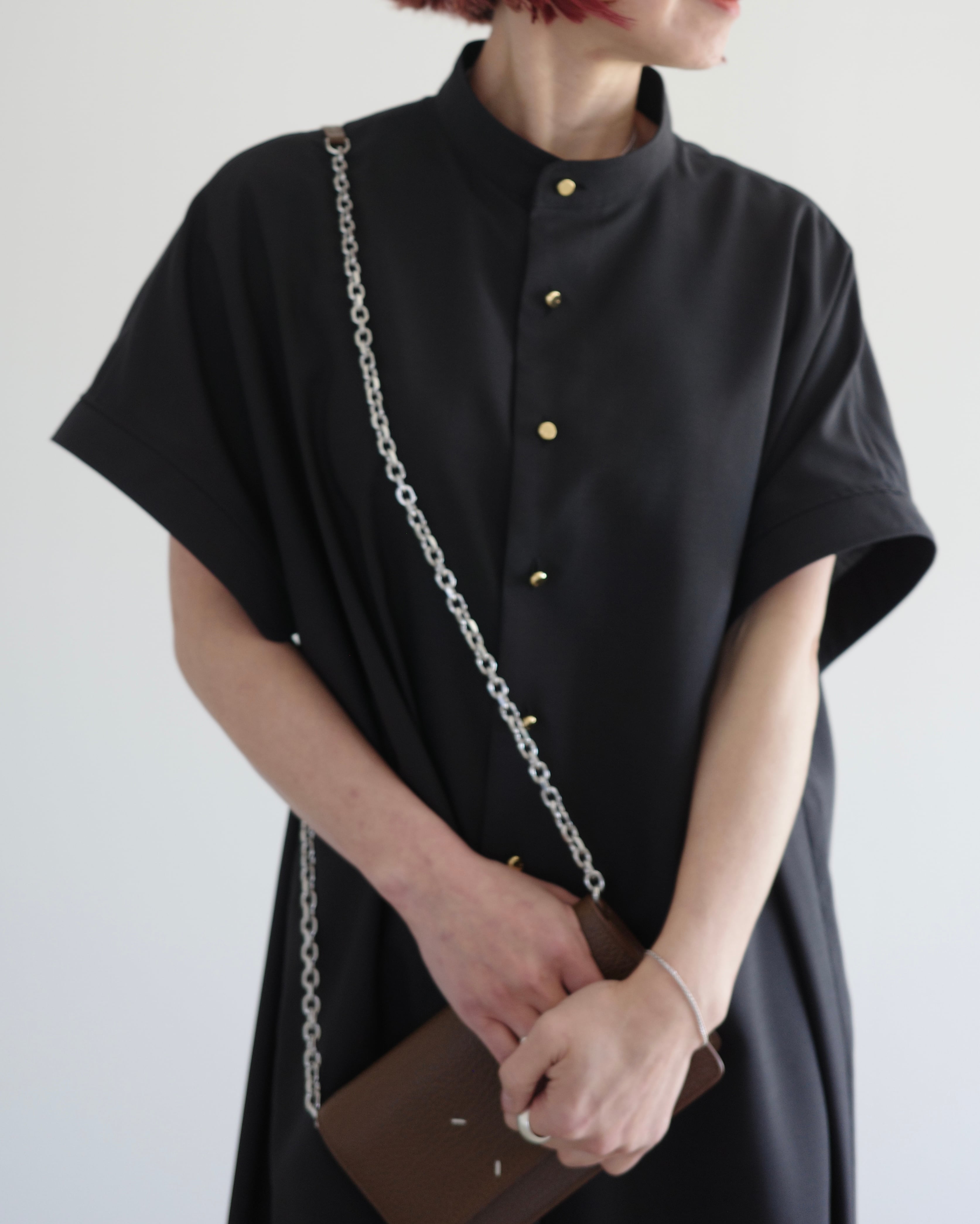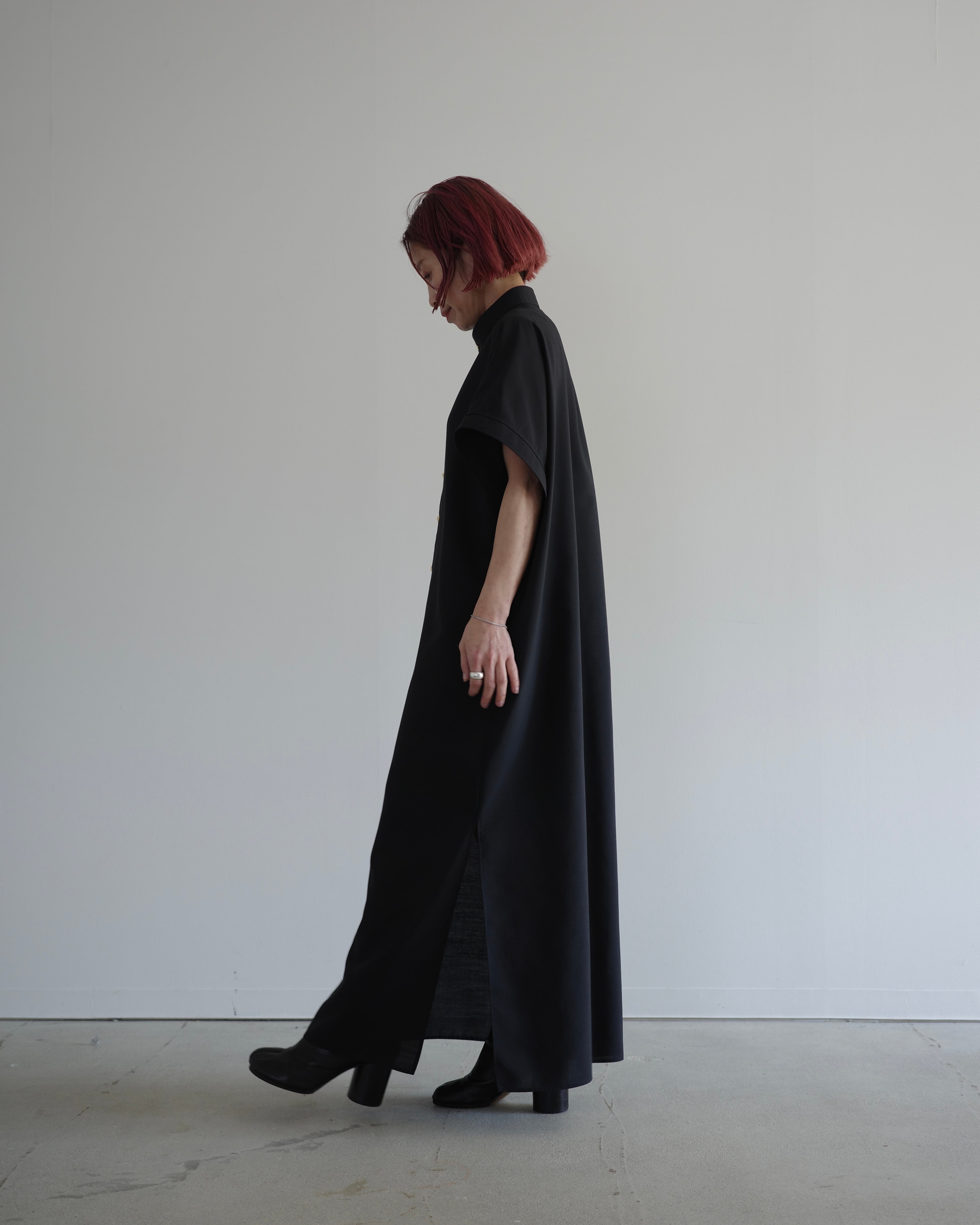 コットンのような質感を持つ薄手のスパンポリエステルを使用したフロントタックポロドレス。素材は、コットンライクな風合いを持つスパンポリエステルのブロード生地で、通気性に優れ、何度洗濯しても型崩れやシワが生じにくい、最先端の繊維技術を活かしたTHE RERACSオリジナルの素材です。衿はやや高めに設定されたシンプルなバンドカラーで、首元からフロントにかけて連なるTHE RERACSオリジナルの真鍮釦と、中央に深く入ったフロントタックがアクセントとなり、洗練された上品な印象を与えます。サイドスリットは深めにデザインされており、足さばきが良く、歩くたびに軽やかで美しいシルエットが生まれます。