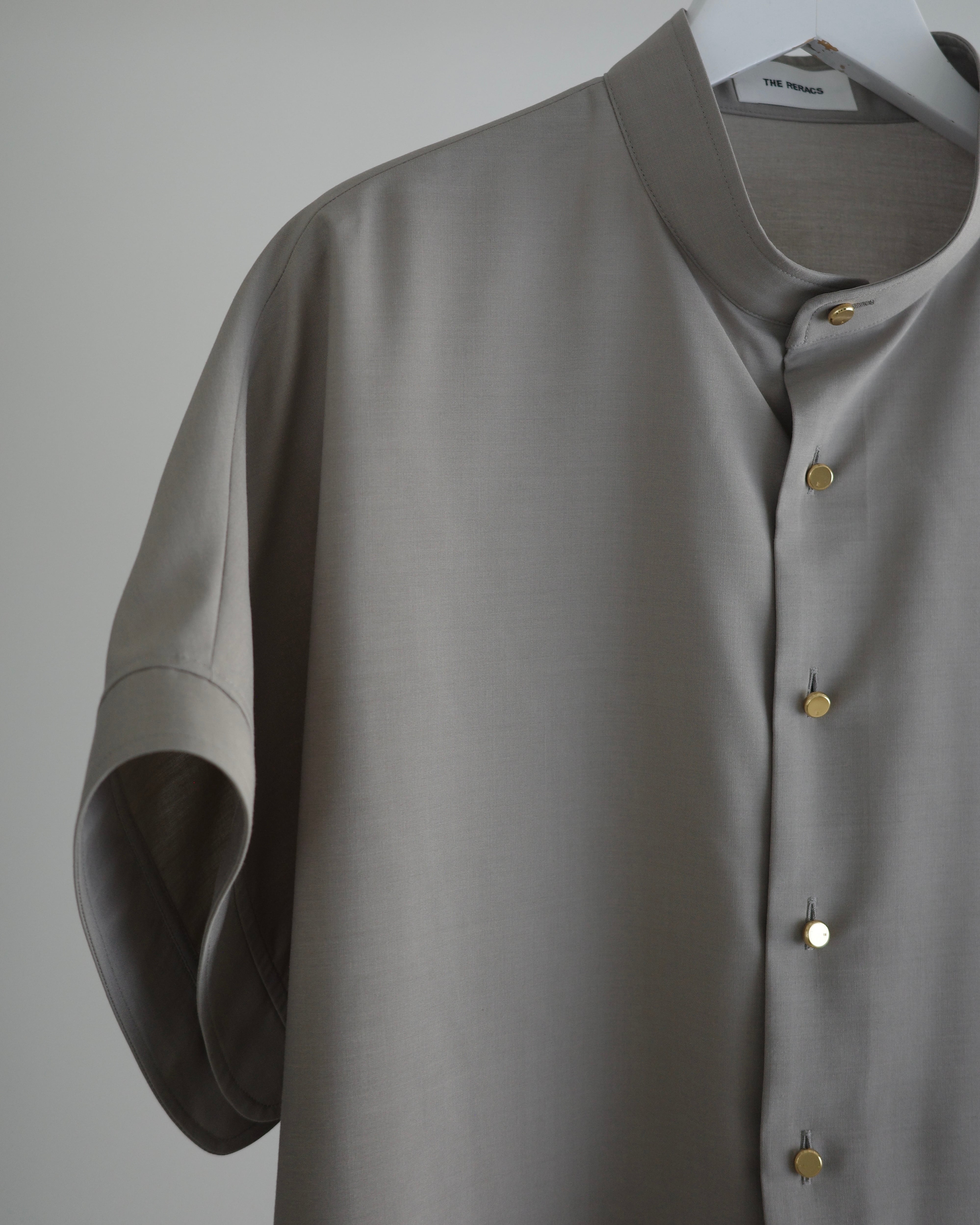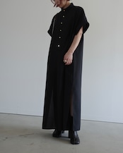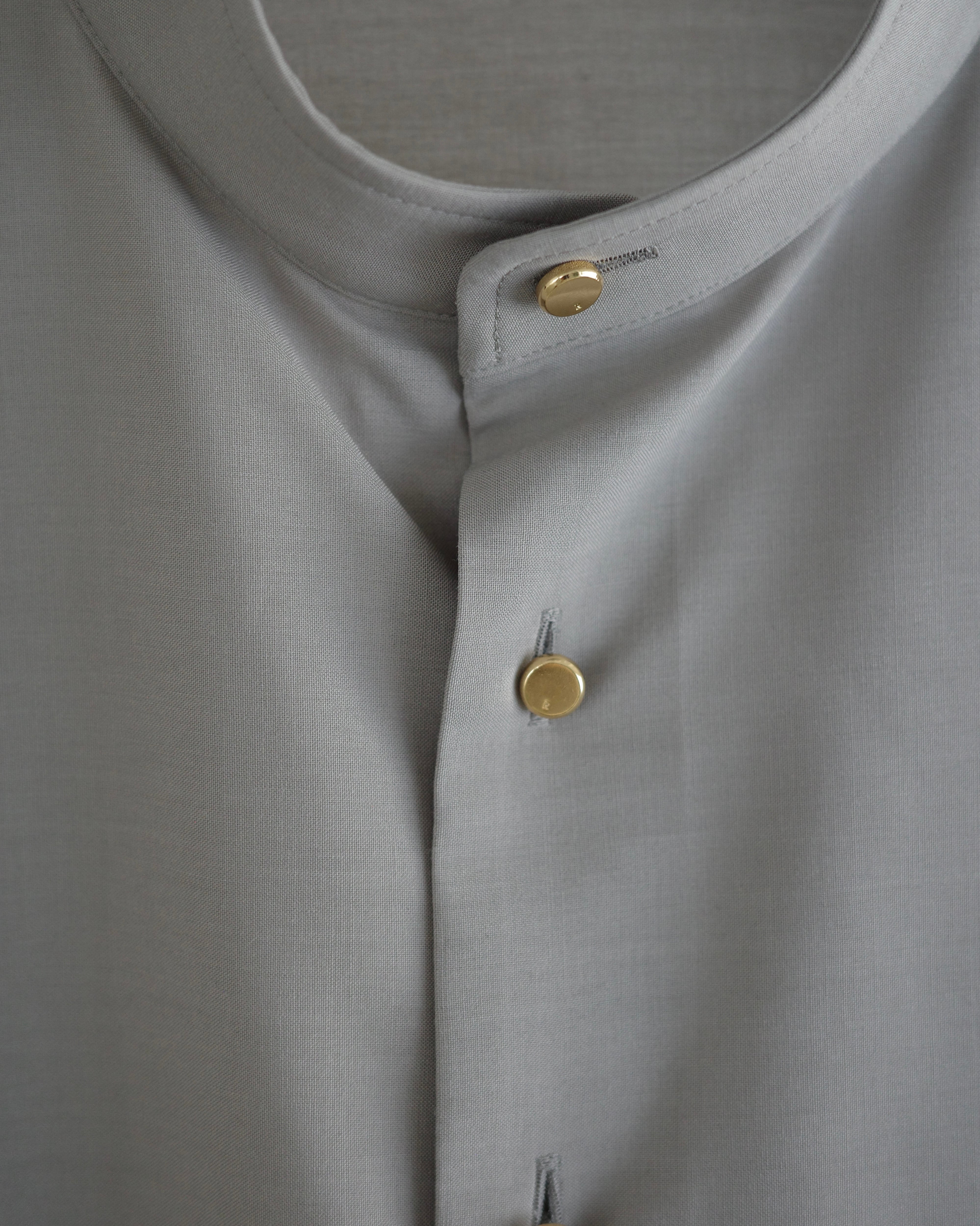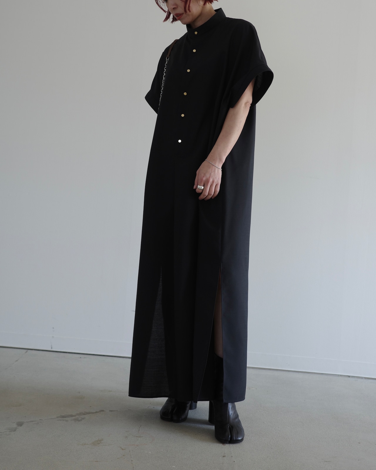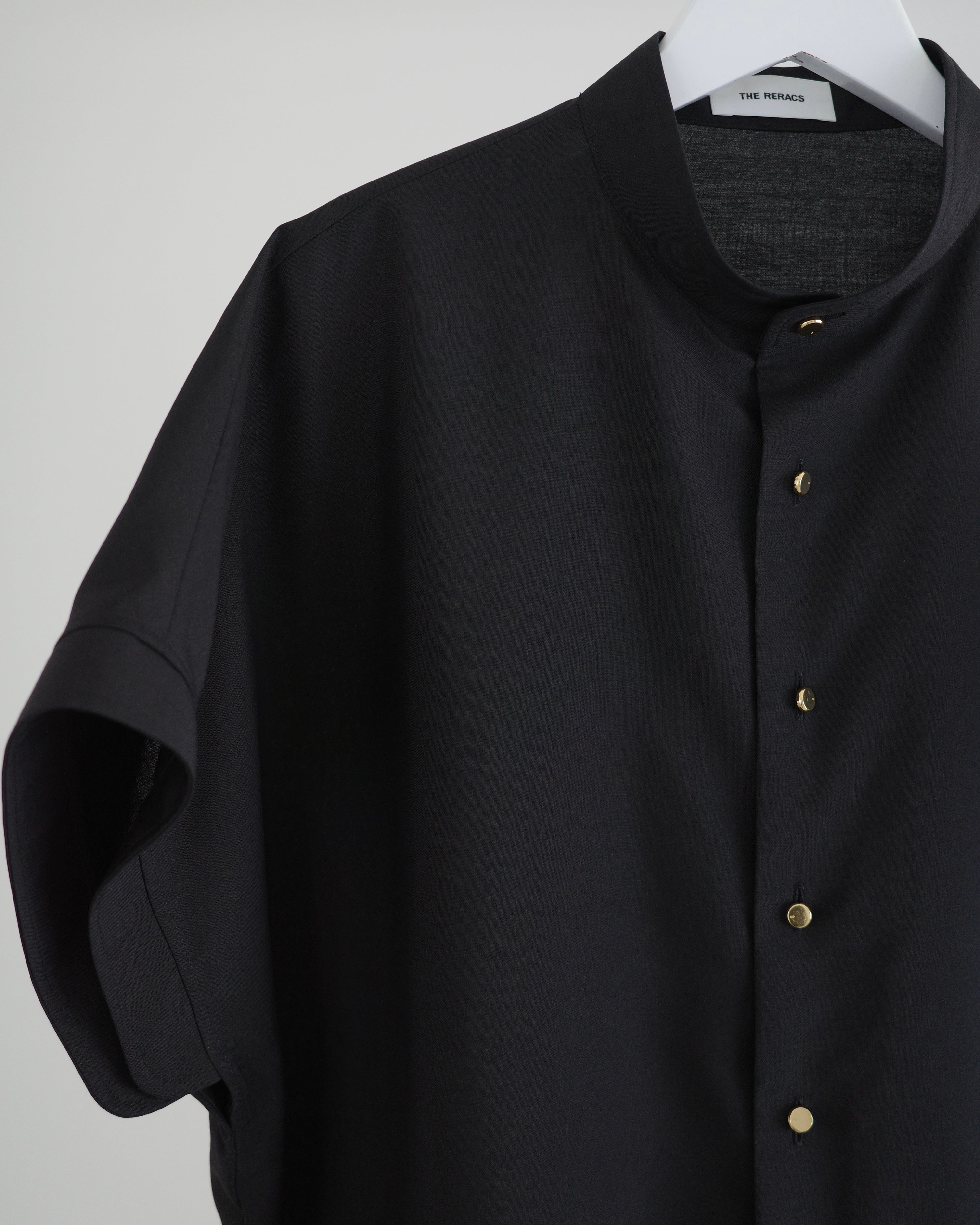 コットンのような質感を持つ薄手のスパンポリエステルを使用したフロントタックポロドレス。素材は、コットンライクな風合いを持つスパンポリエステルのブロード生地で、通気性に優れ、何度洗濯しても型崩れやシワが生じにくい、最先端の繊維技術を活かしたTHE RERACSオリジナルの素材です。衿はやや高めに設定されたシンプルなバンドカラーで、首元からフロントにかけて連なるTHE RERACSオリジナルの真鍮釦と、中央に深く入ったフロントタックがアクセントとなり、洗練された上品な印象を与えます。サイドスリットは深めにデザインされており、足さばきが良く、歩くたびに軽やかで美しいシルエットが生まれます。