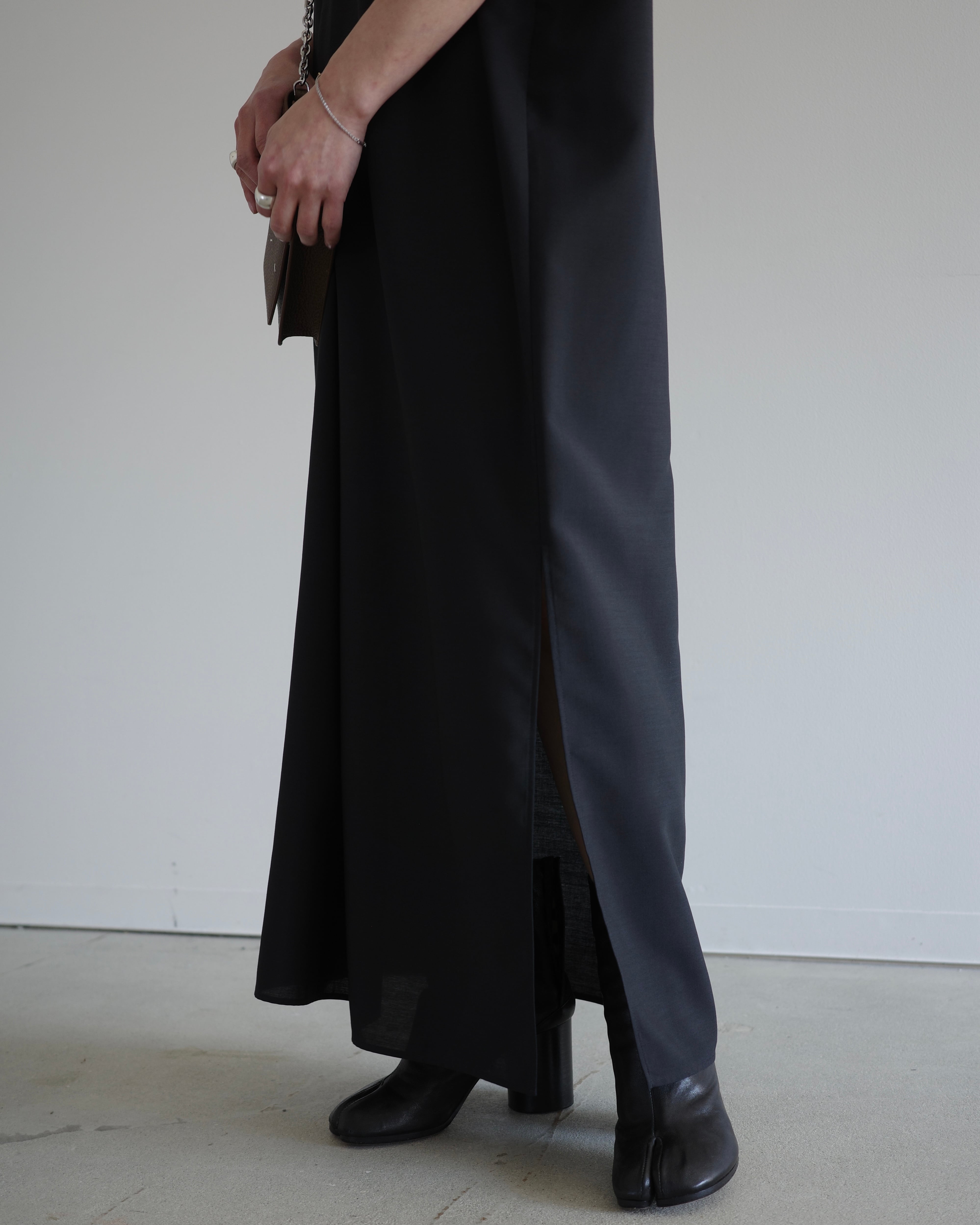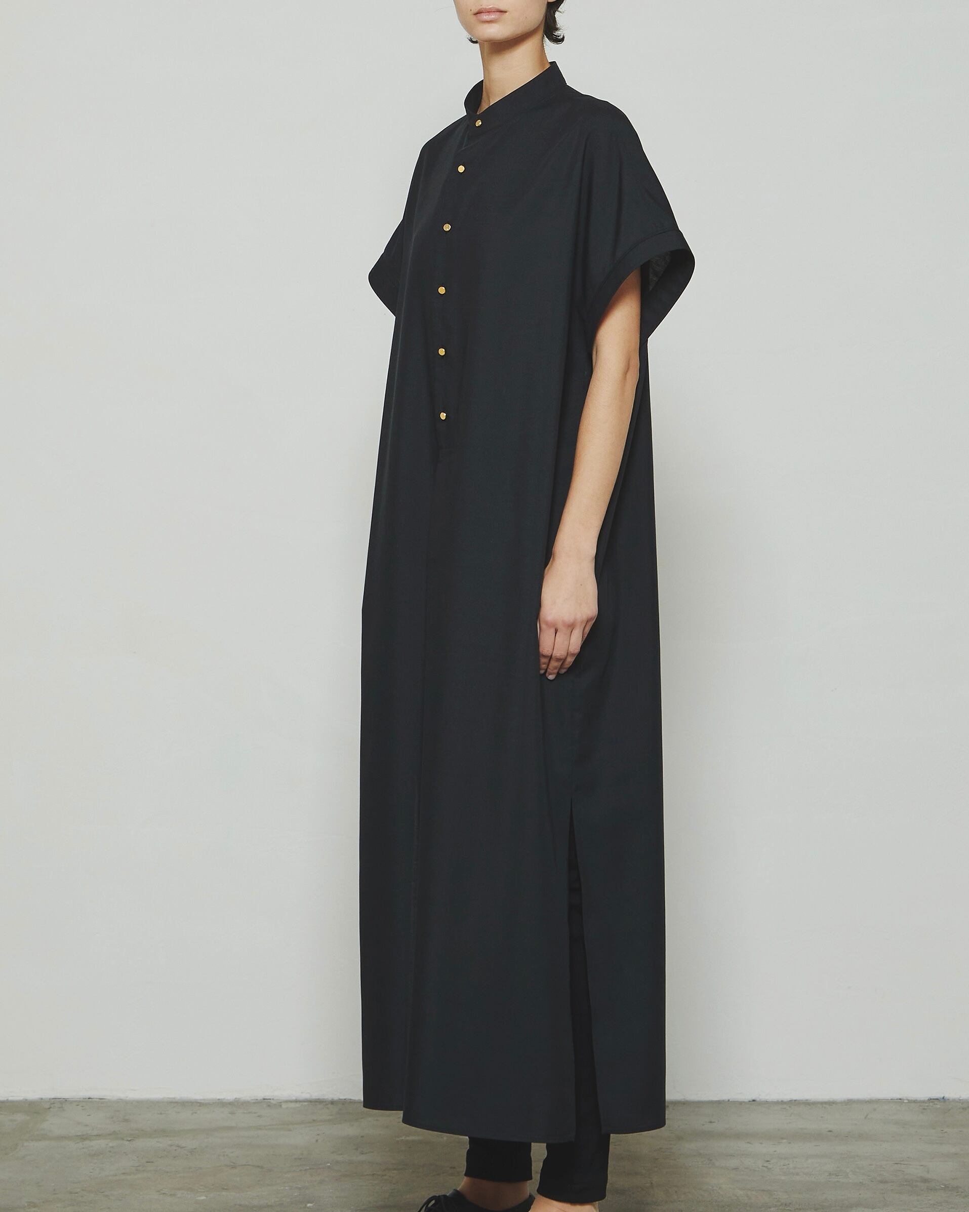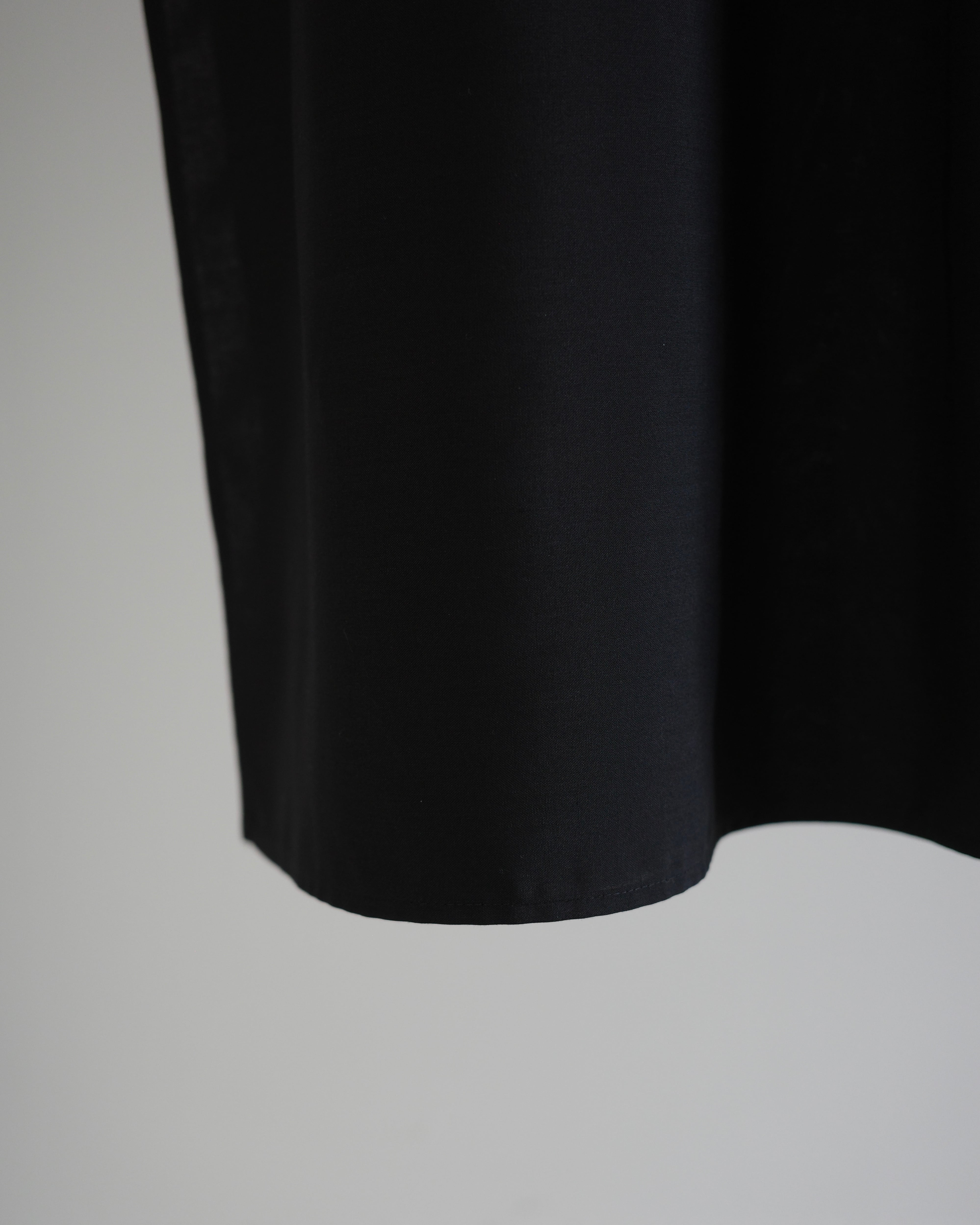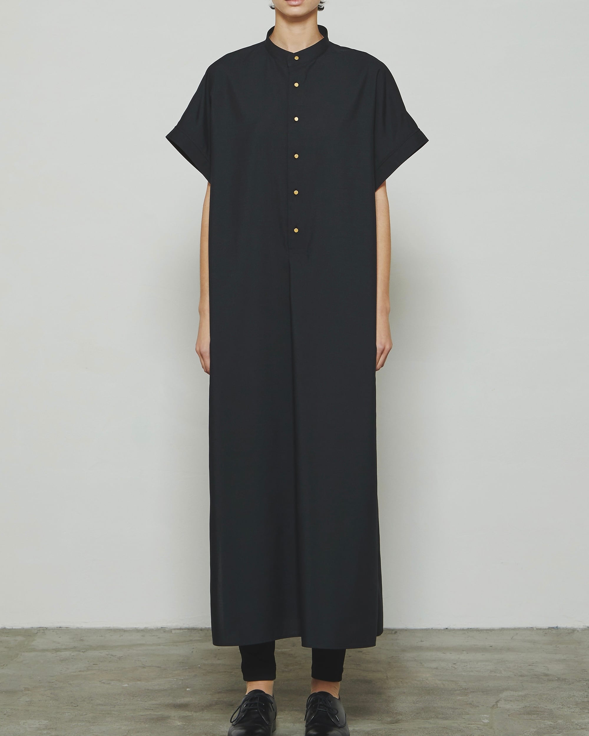 コットンのような質感を持つ薄手のスパンポリエステルを使用したフロントタックポロドレス。素材は、コットンライクな風合いを持つスパンポリエステルのブロード生地で、通気性に優れ、何度洗濯しても型崩れやシワが生じにくい、最先端の繊維技術を活かしたTHE RERACSオリジナルの素材です。衿はやや高めに設定されたシンプルなバンドカラーで、首元からフロントにかけて連なるTHE RERACSオリジナルの真鍮釦と、中央に深く入ったフロントタックがアクセントとなり、洗練された上品な印象を与えます。サイドスリットは深めにデザインされており、足さばきが良く、歩くたびに軽やかで美しいシルエットが生まれます。