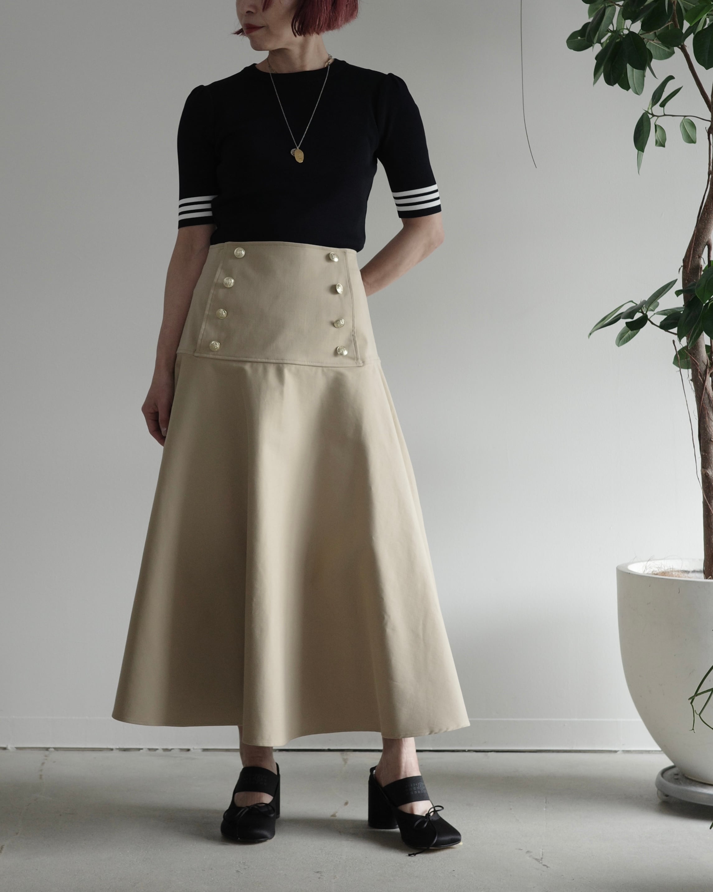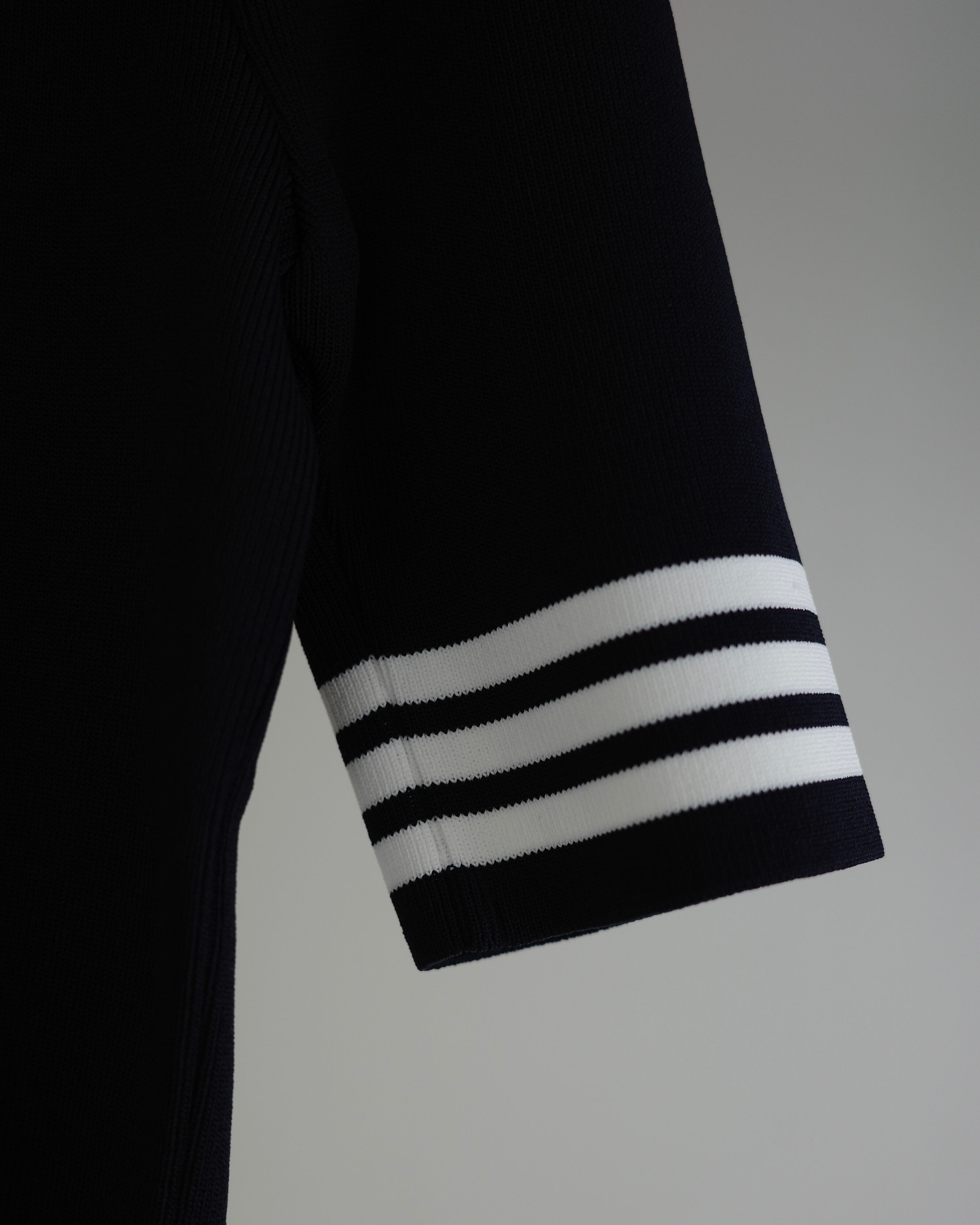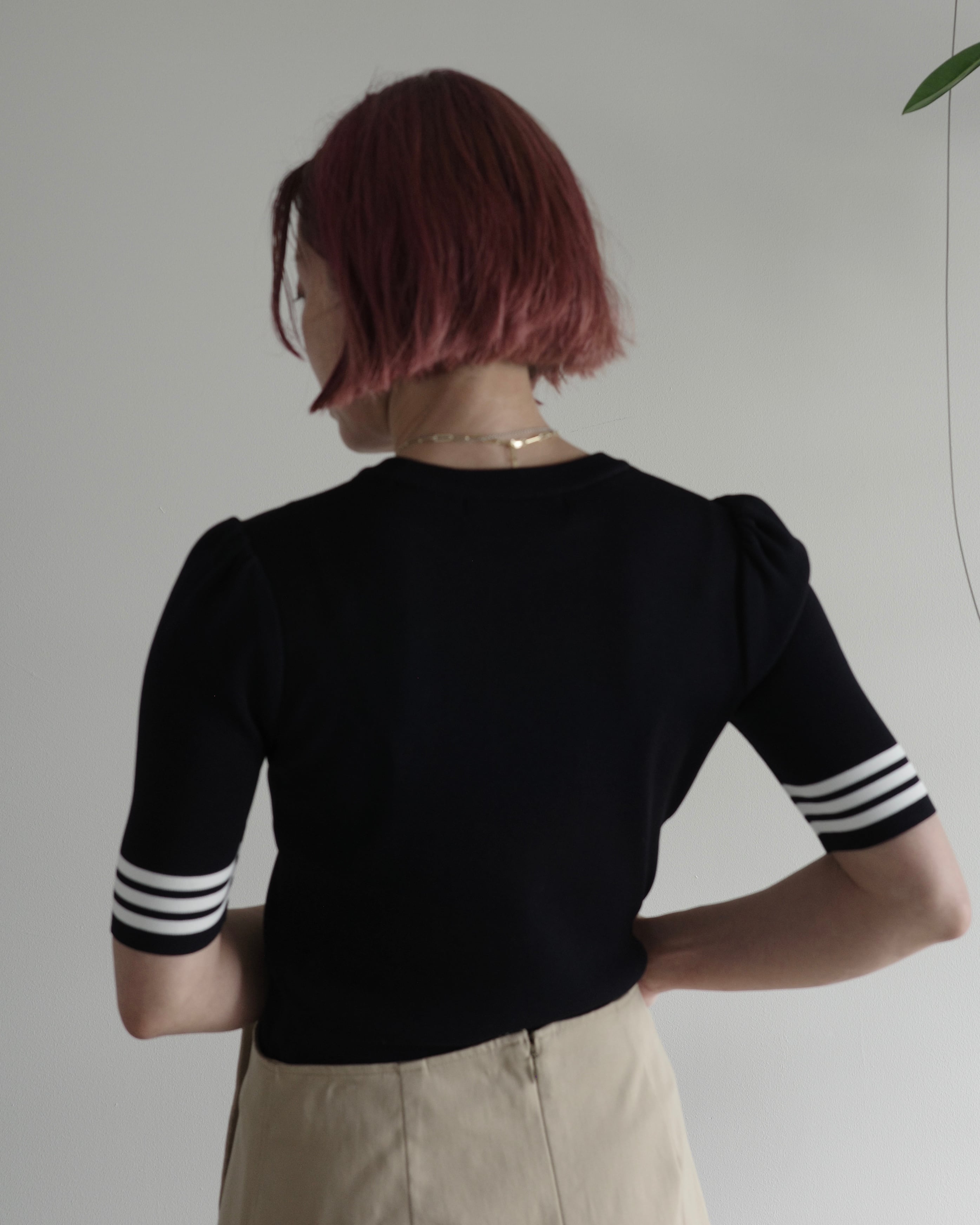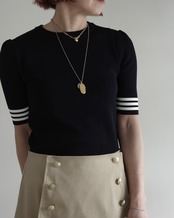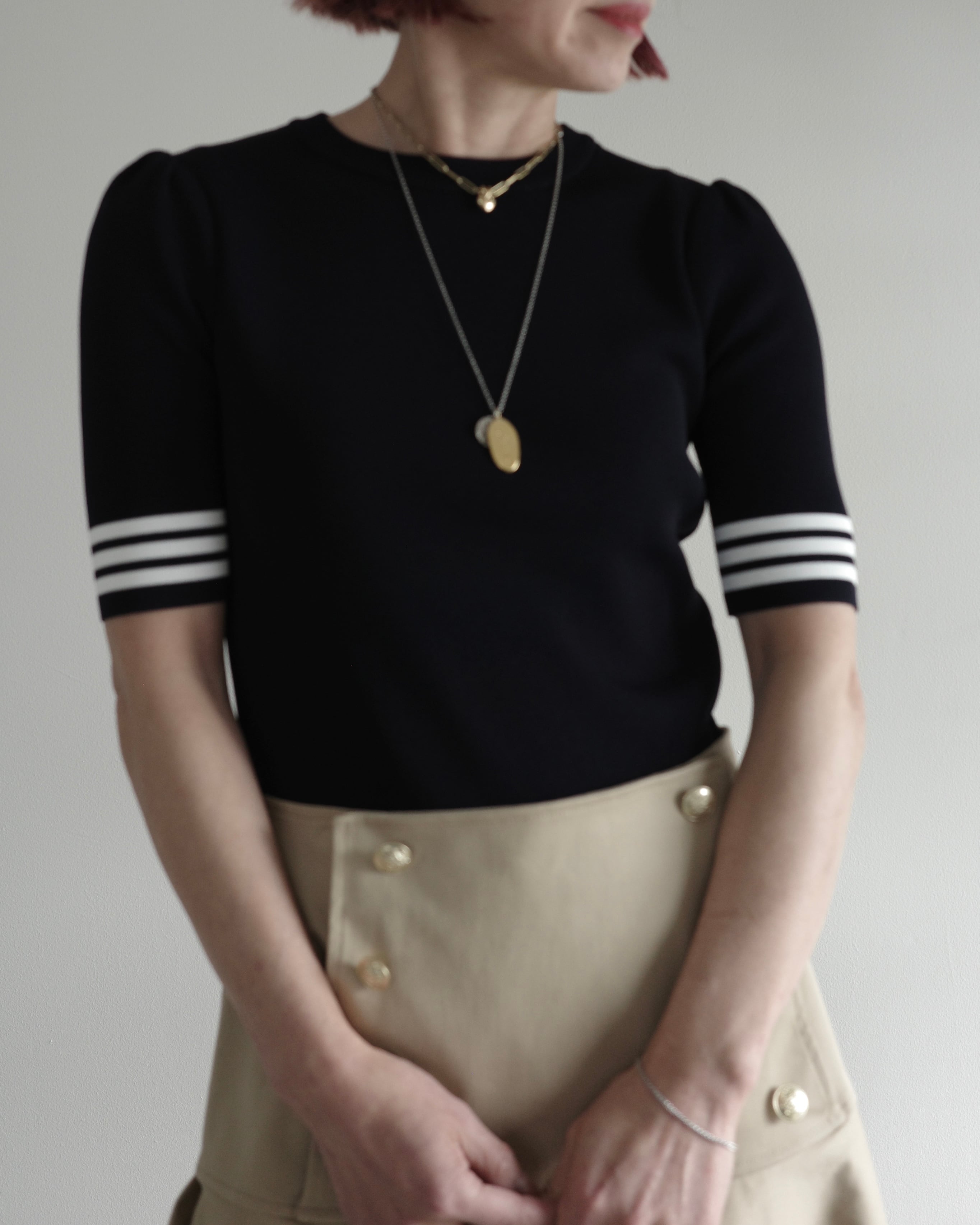 半袖のレーヨンニットはネックラインをクルーネックにし、より快適にお召しいただけるよう工夫いたしました。レーヨンニットならではの光沢感とフィット感はボディラインを美しく見せ、イン・アウトしやすいよう着丈も調整しました。裾のゴールドプレートがワンポイントです。