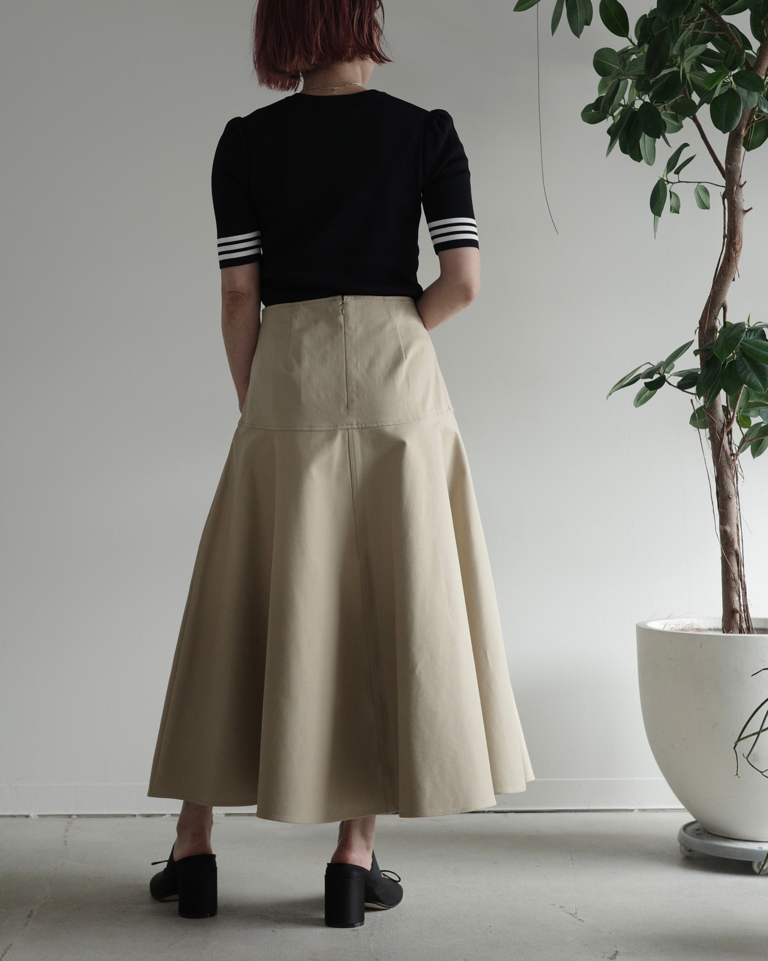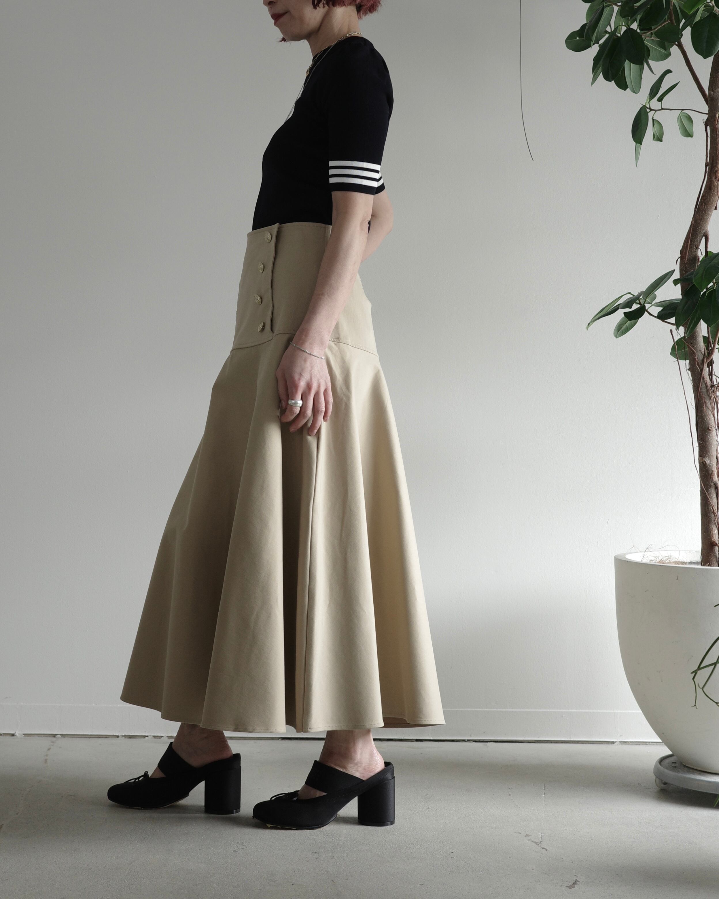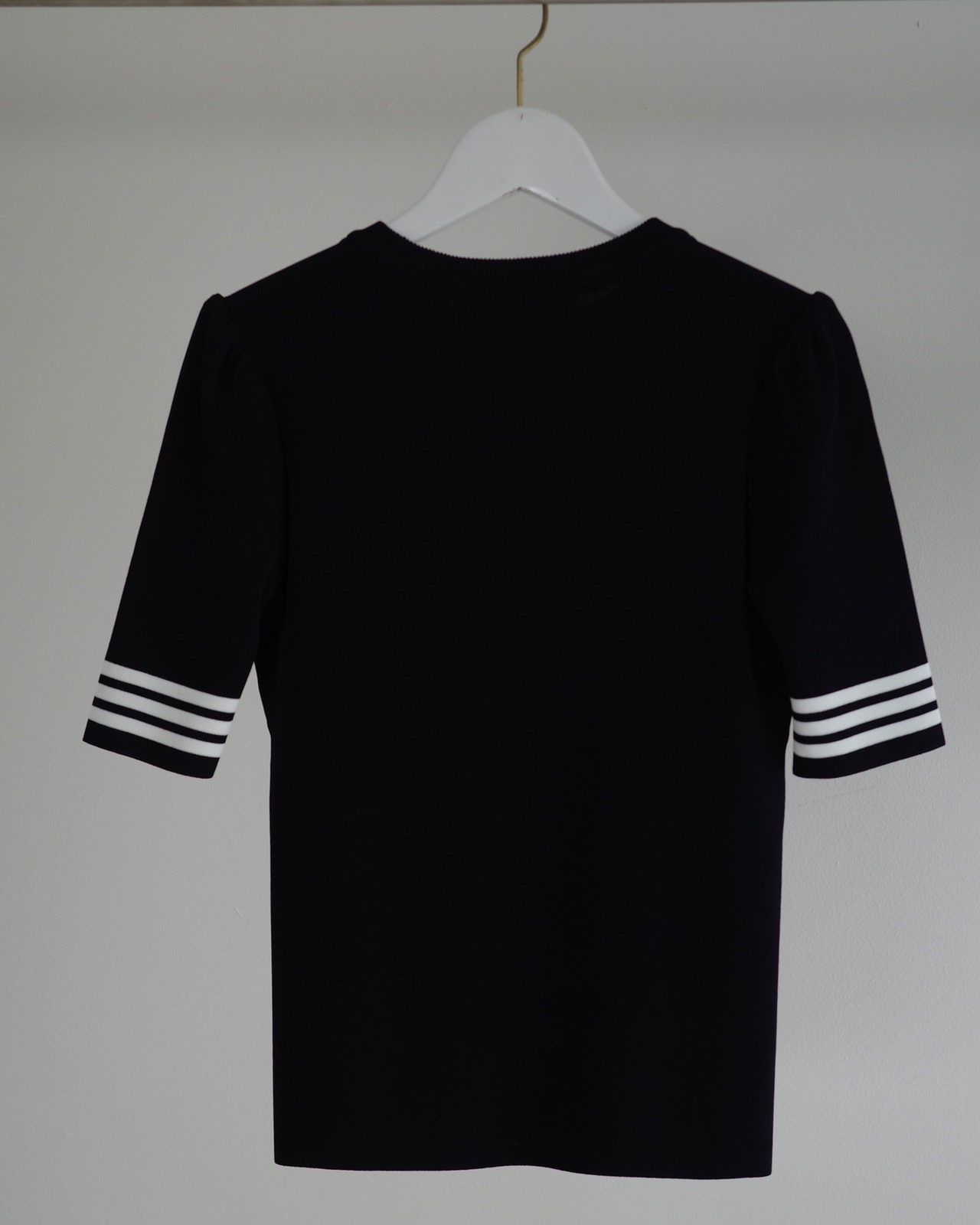 半袖のレーヨンニットはネックラインをクルーネックにし、より快適にお召しいただけるよう工夫いたしました。レーヨンニットならではの光沢感とフィット感はボディラインを美しく見せ、イン・アウトしやすいよう着丈も調整しました。裾のゴールドプレートがワンポイントです。