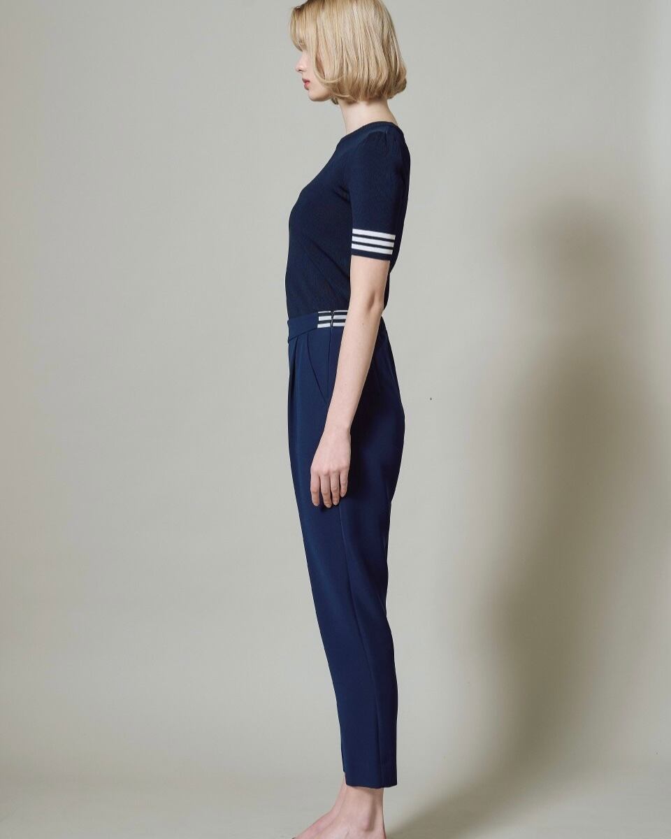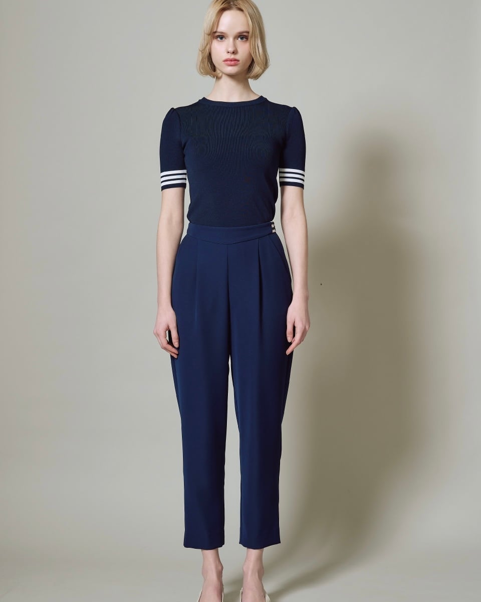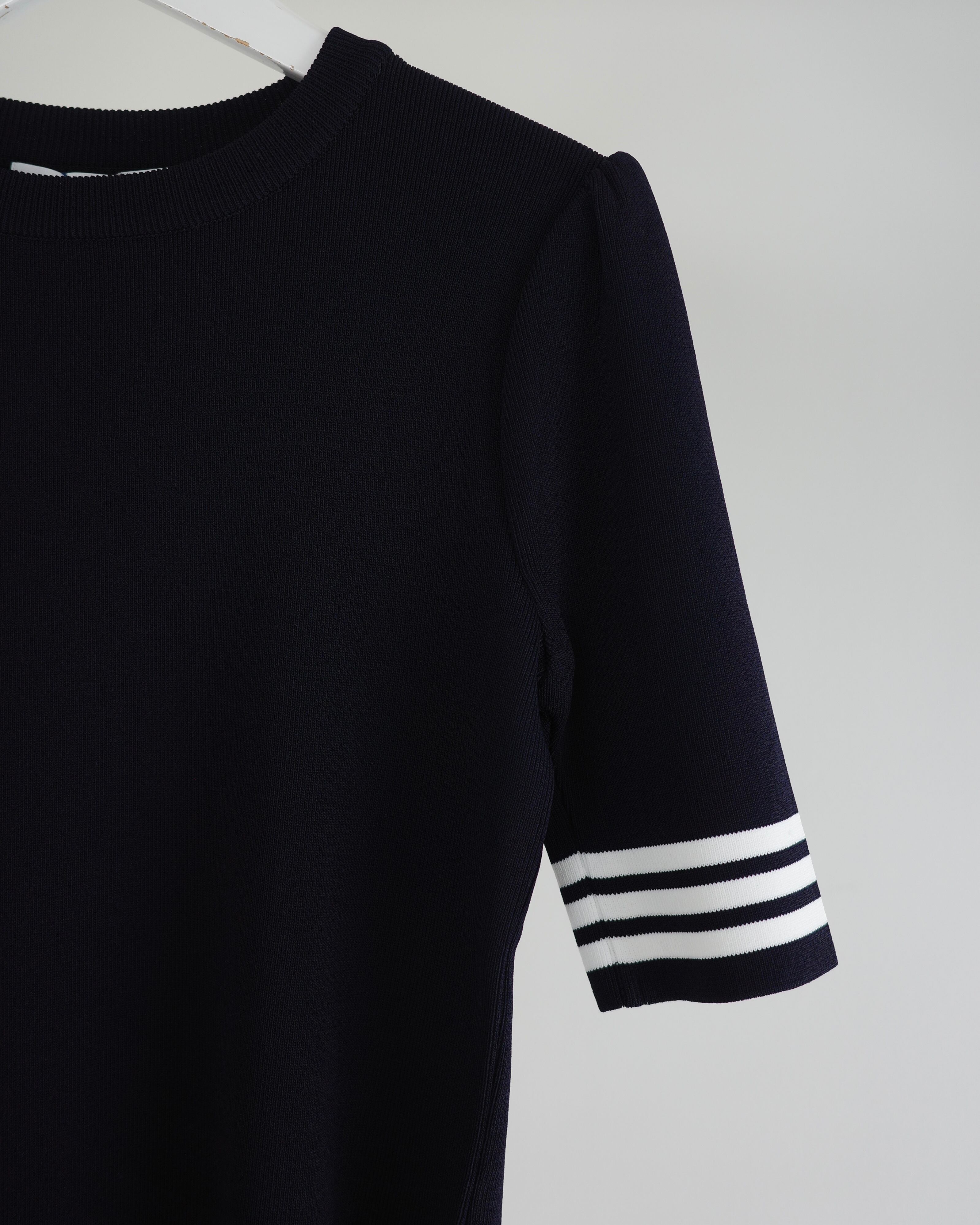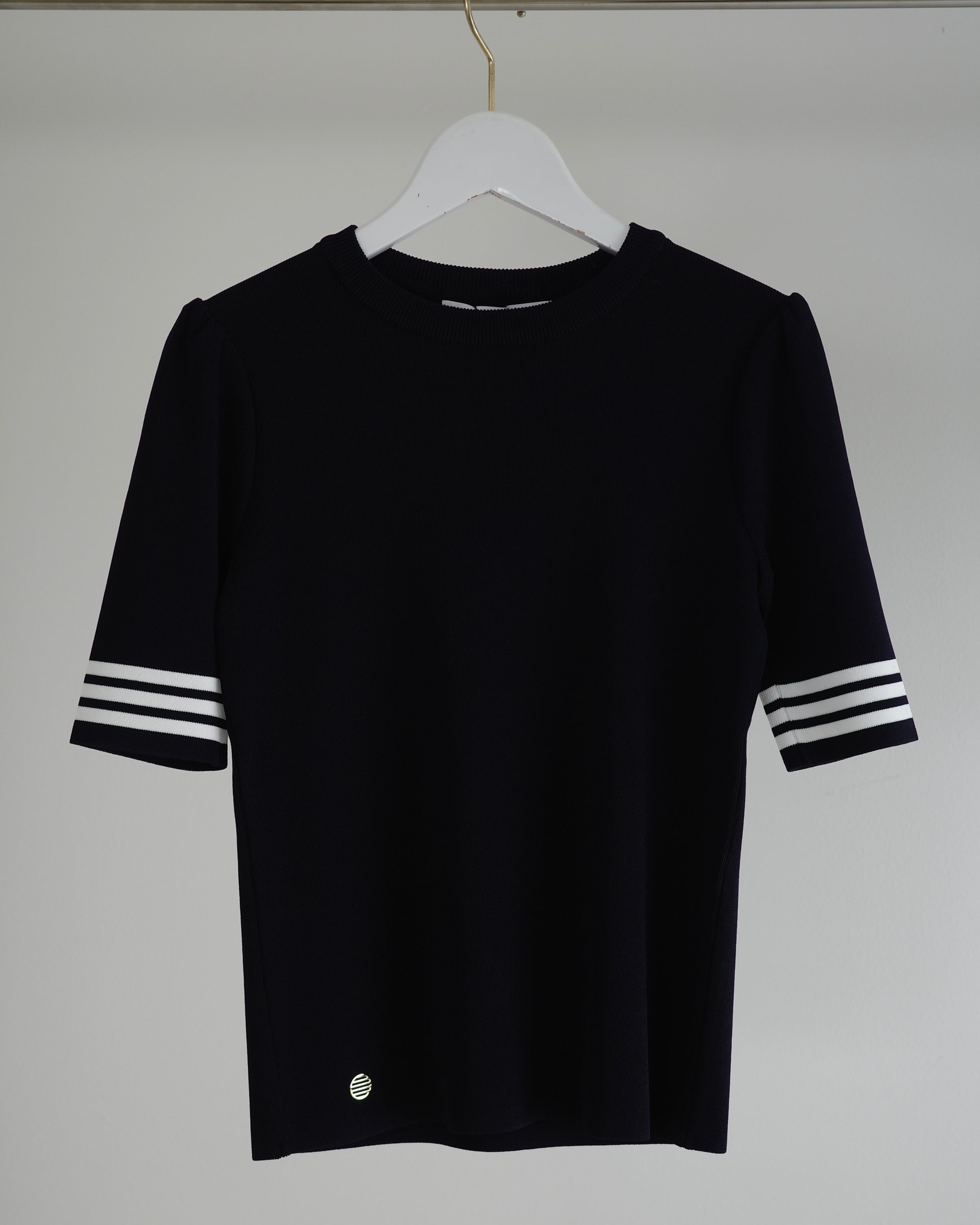 半袖のレーヨンニットはネックラインをクルーネックにし、より快適にお召しいただけるよう工夫いたしました。レーヨンニットならではの光沢感とフィット感はボディラインを美しく見せ、イン・アウトしやすいよう着丈も調整しました。裾のゴールドプレートがワンポイントです。