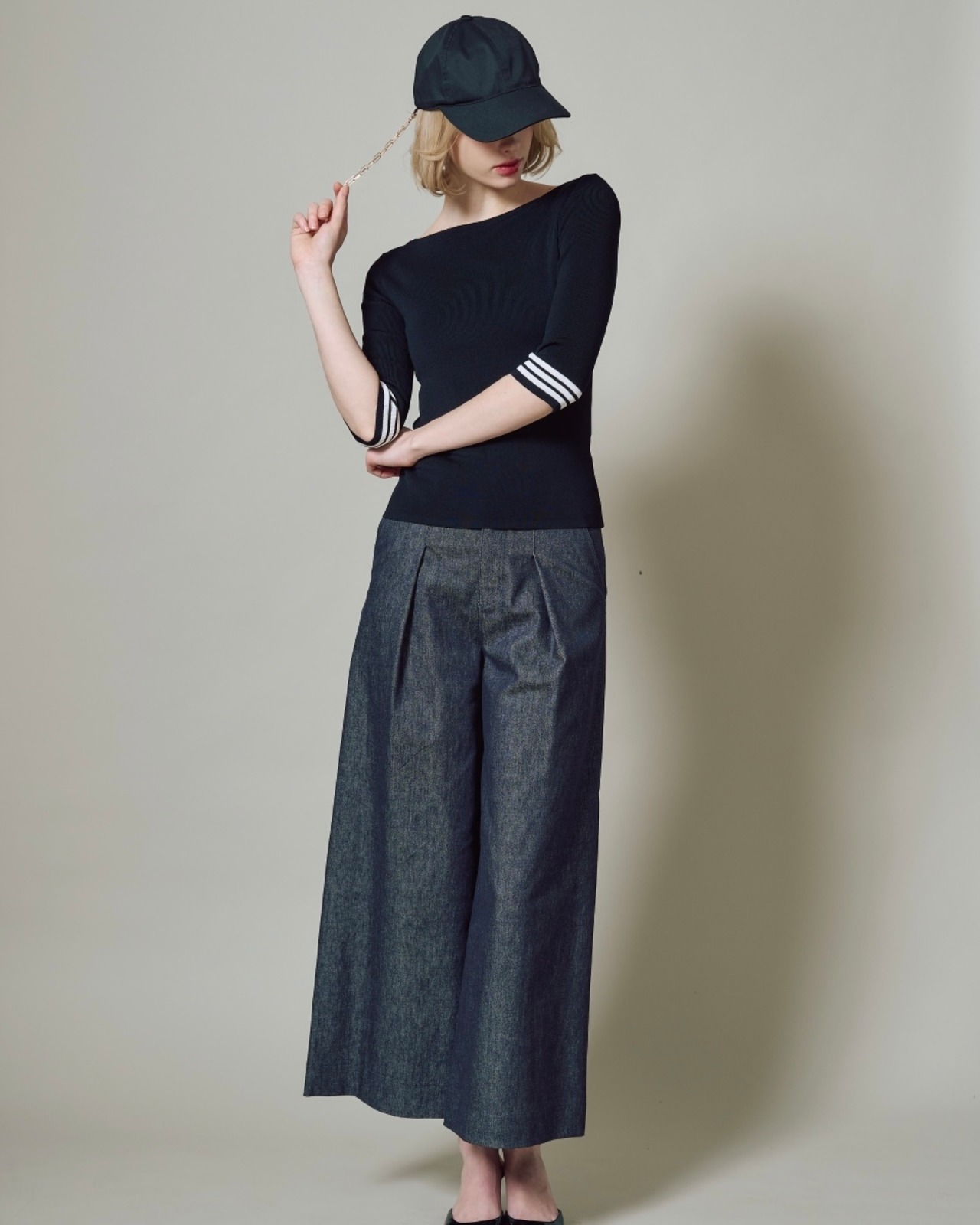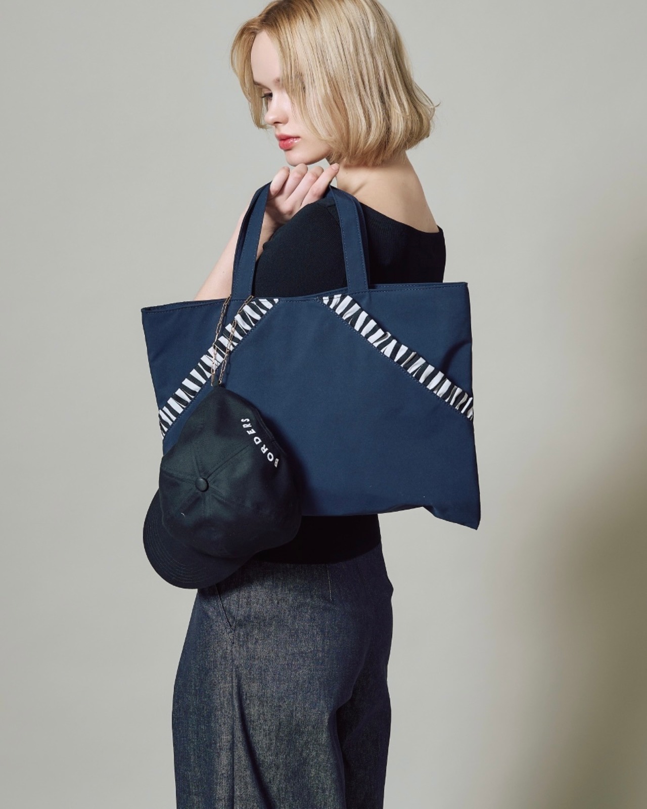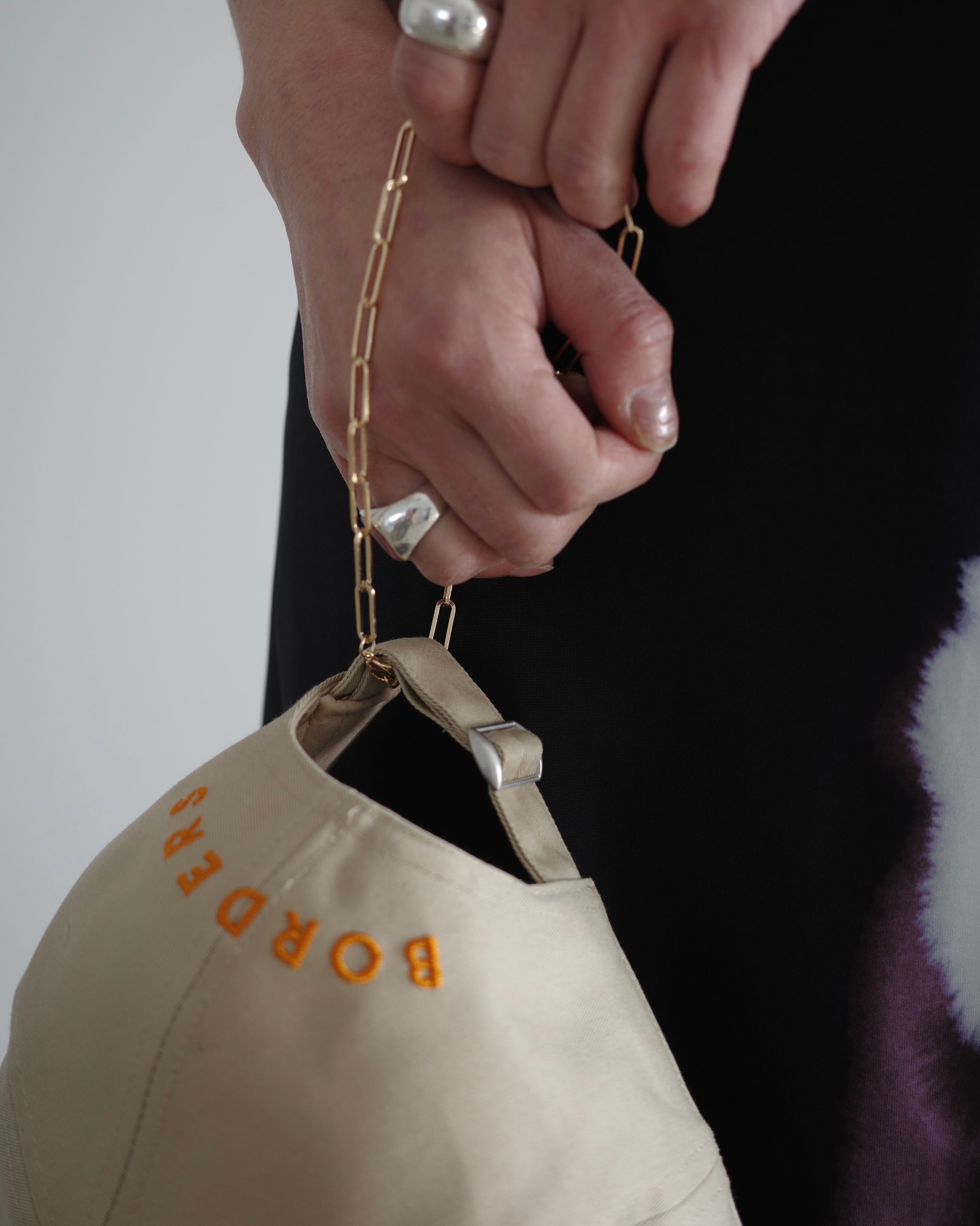 高密度でしっかりとした表面感で、ハリのあるやや厚手素材を採用しました。右耳後ろに取り付けたチェーンはさりげなくきらりと光るポイントに。腕に通しても、バッグやベルトループに着けてもアクセサリー感覚でお召しいただける商品です。
