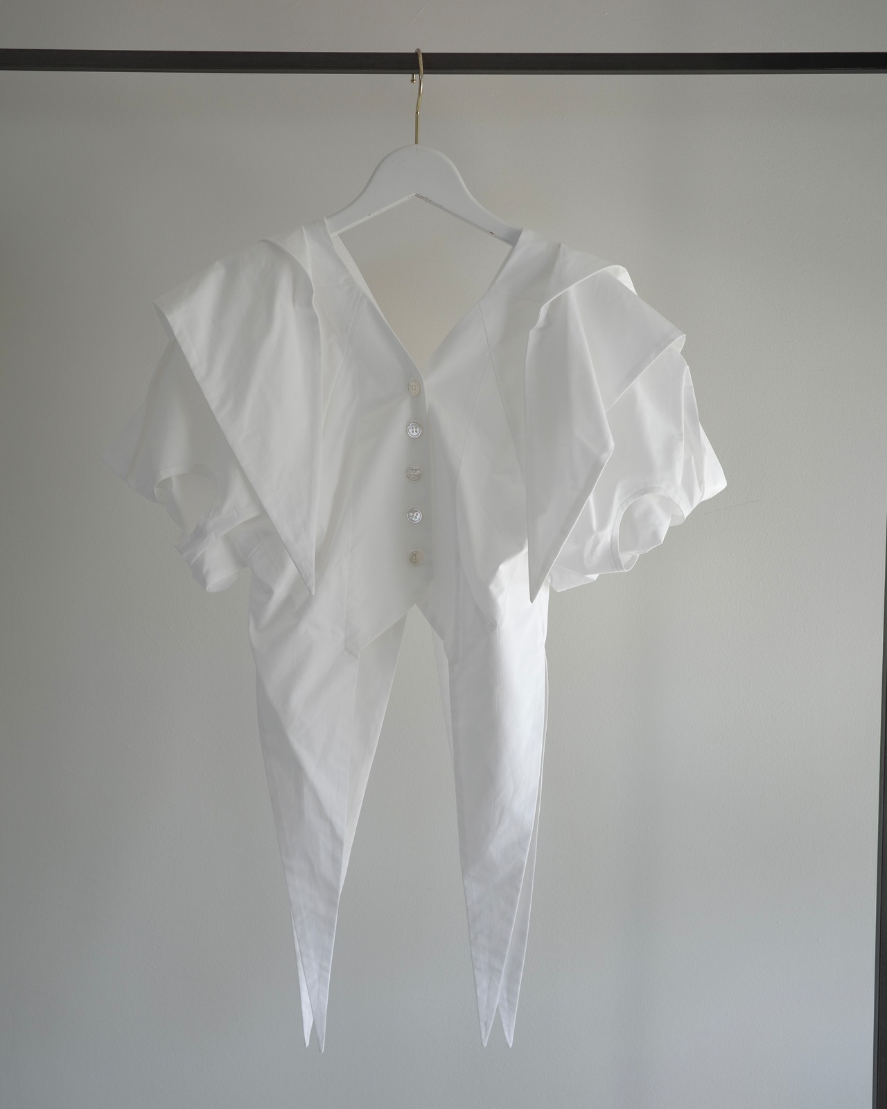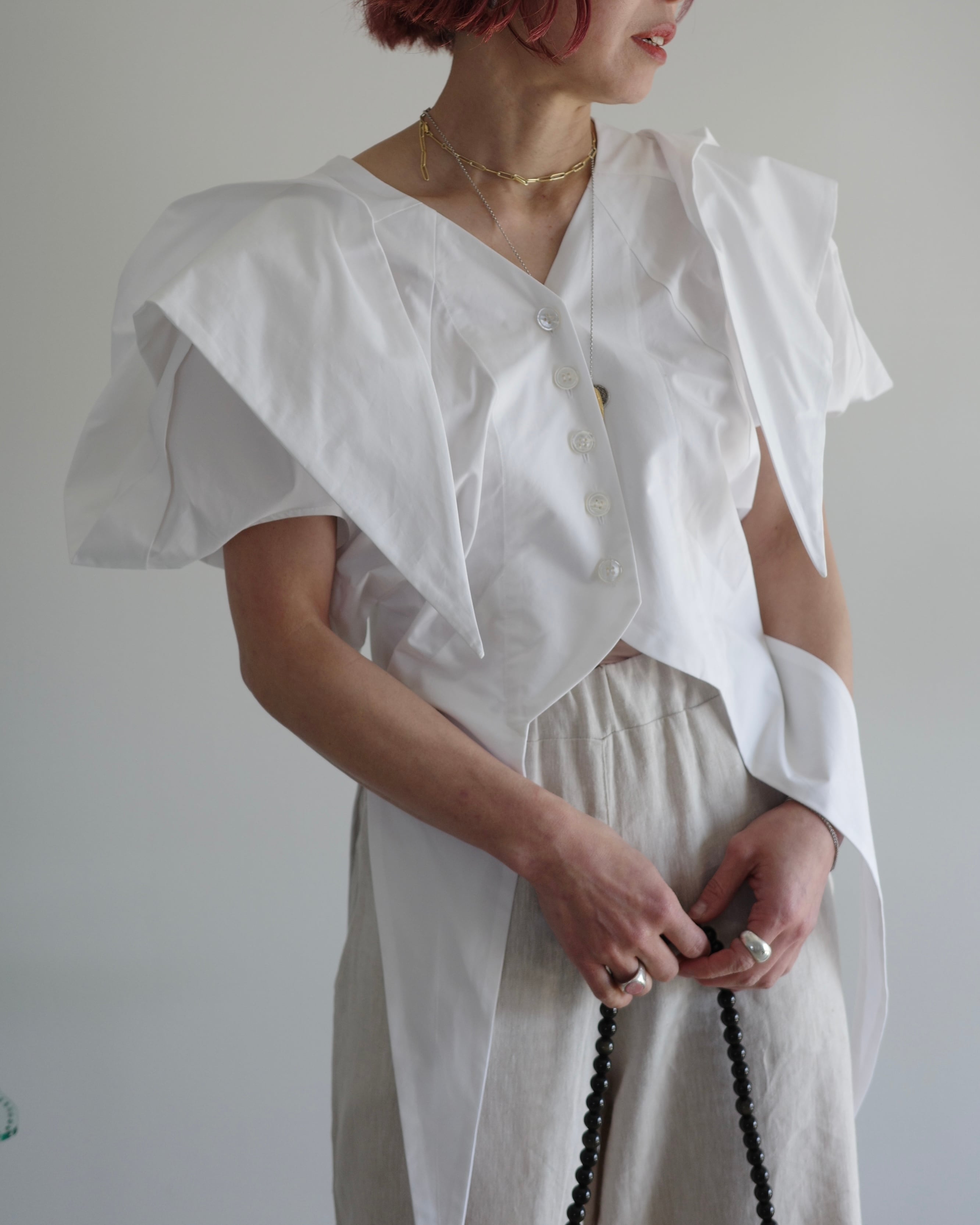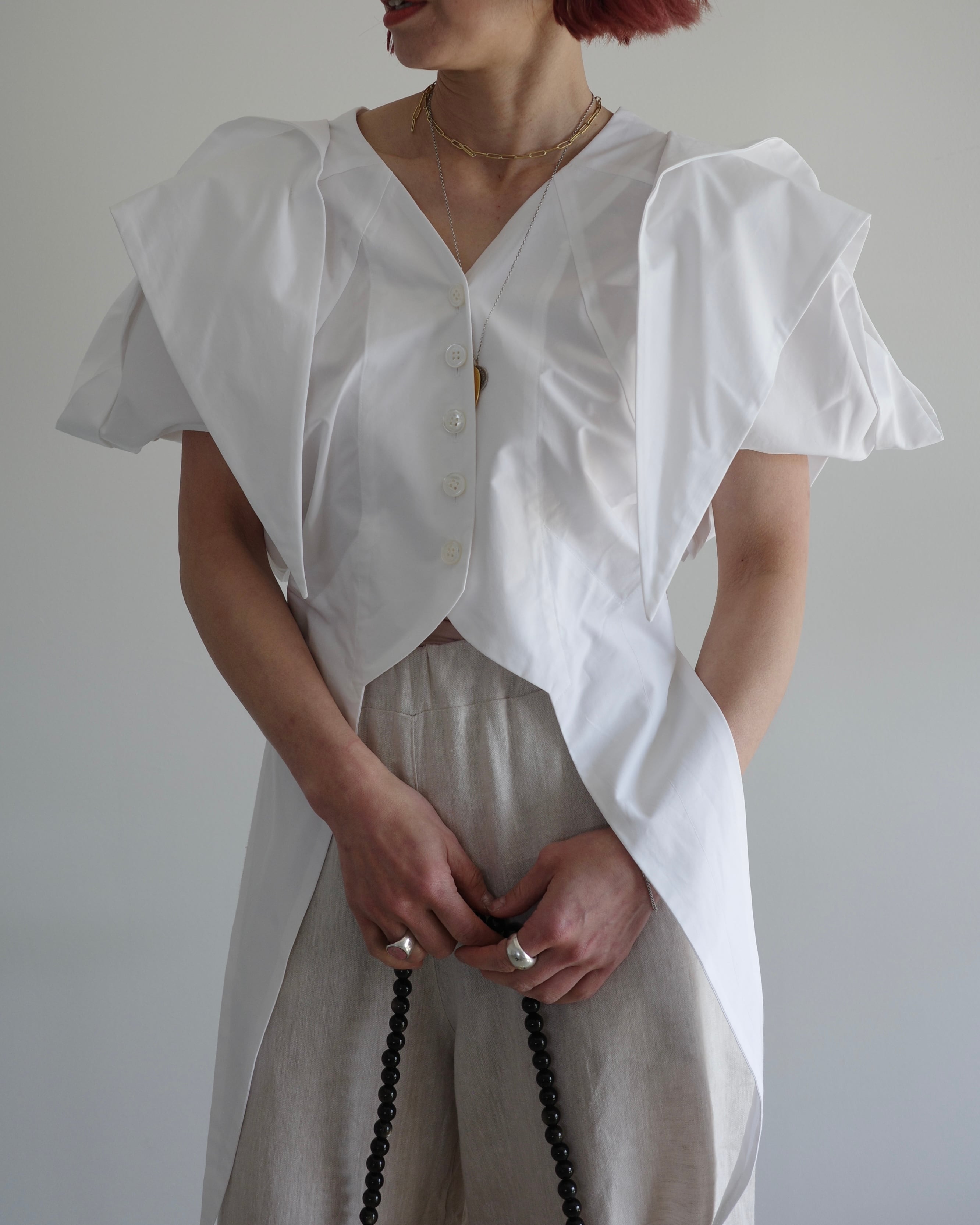 SPRING2025シーズンでデザインした、蔦の葉のような形のショート丈のブラウス。