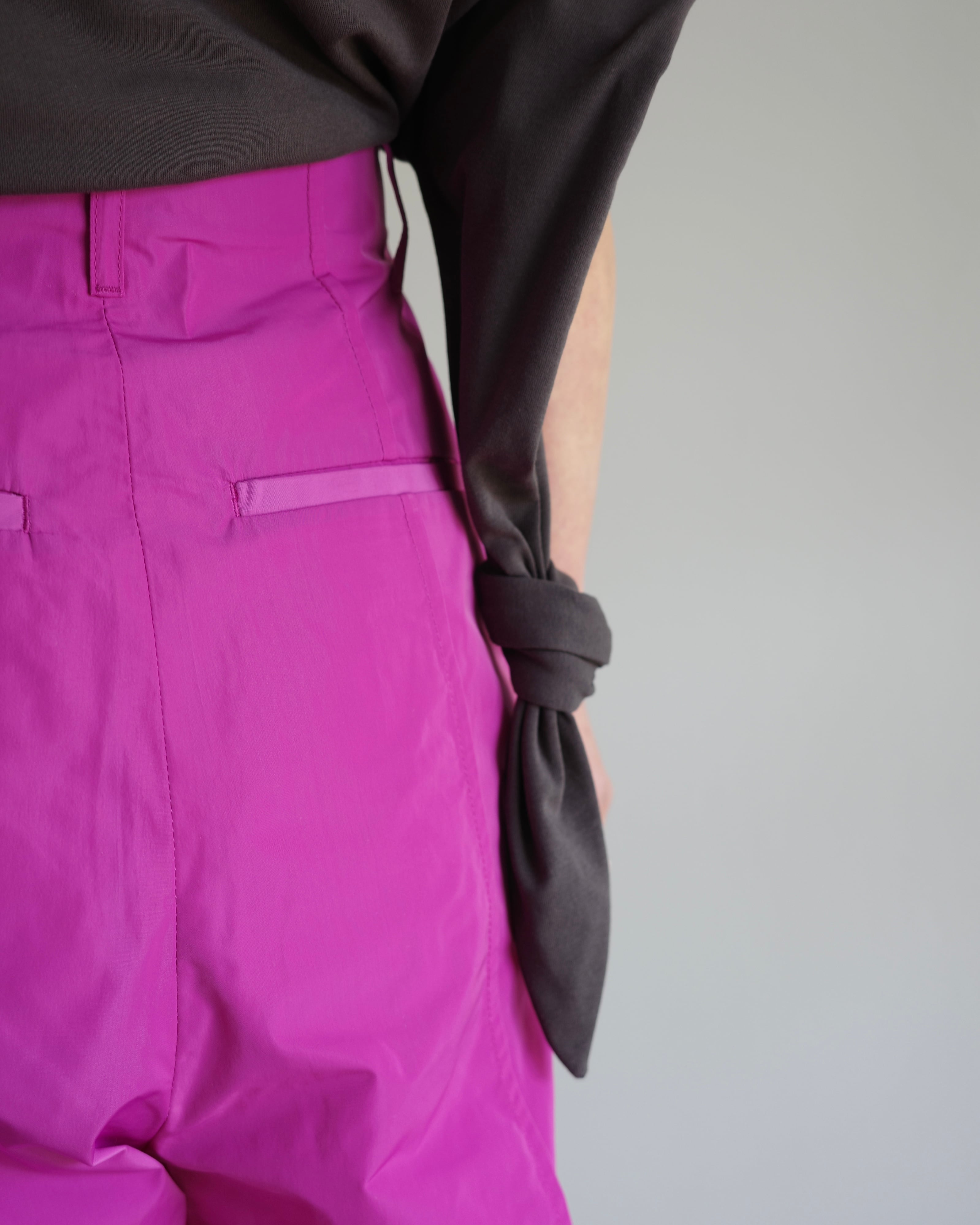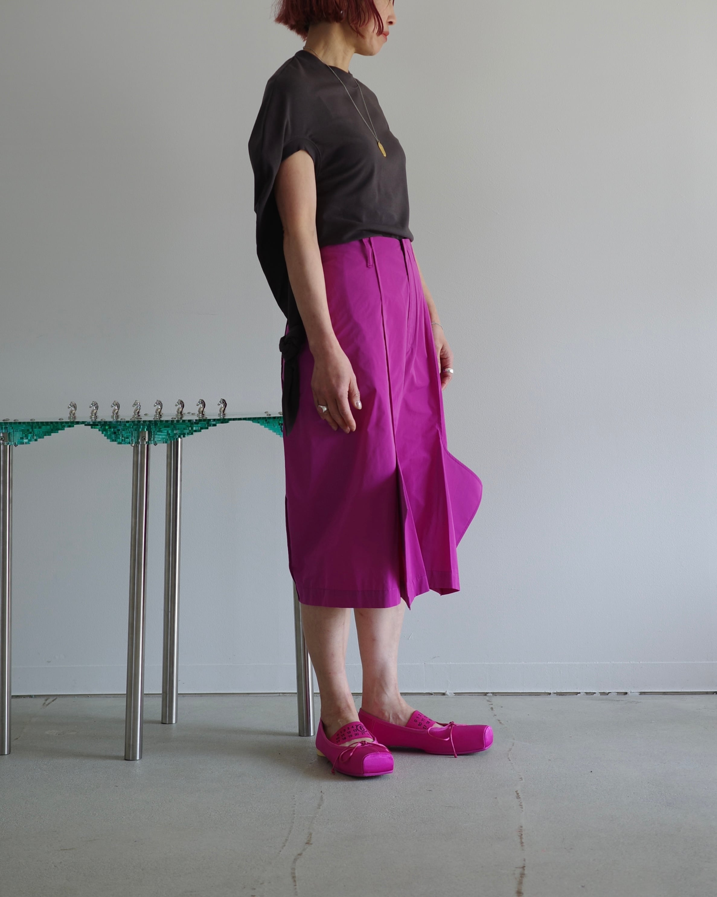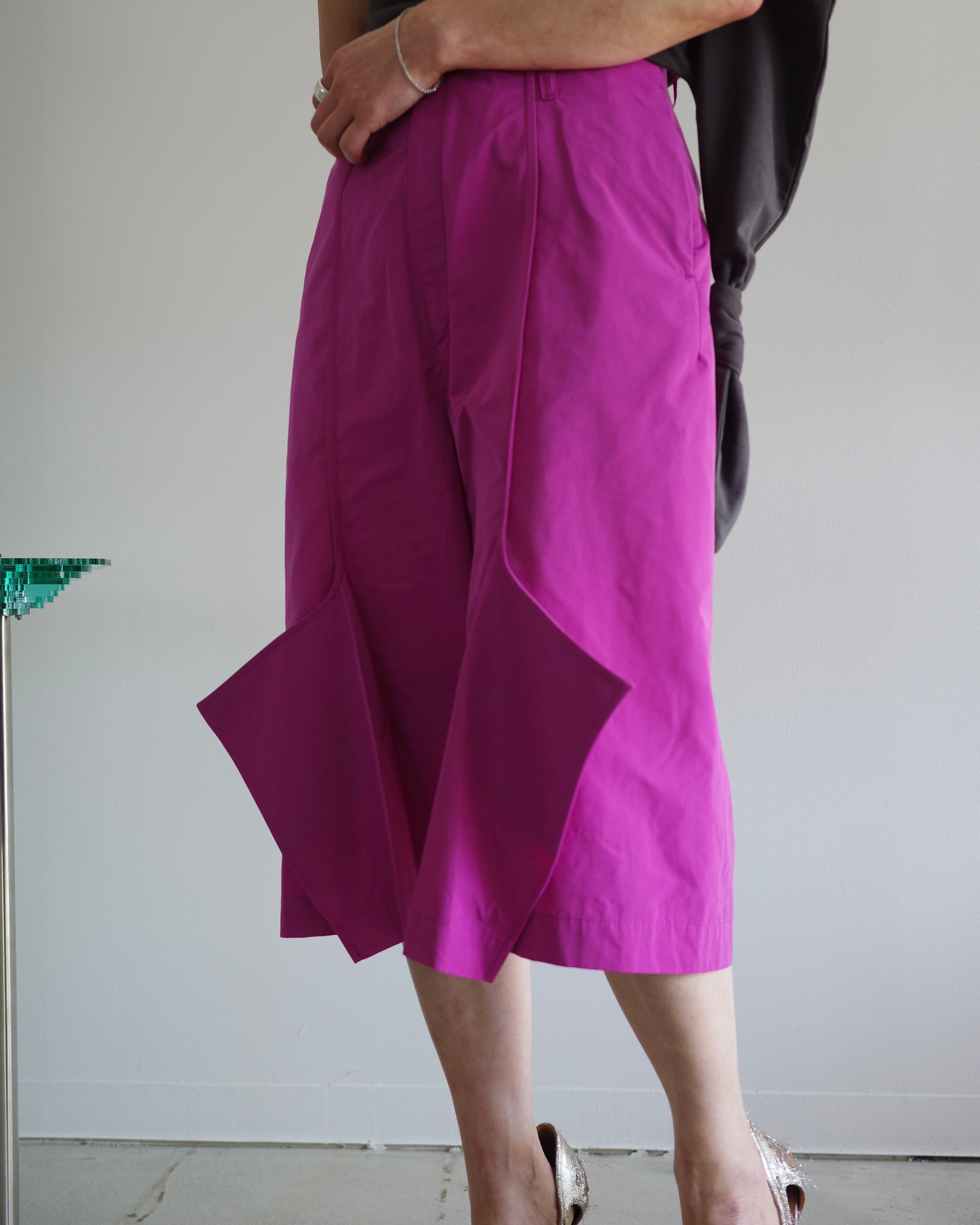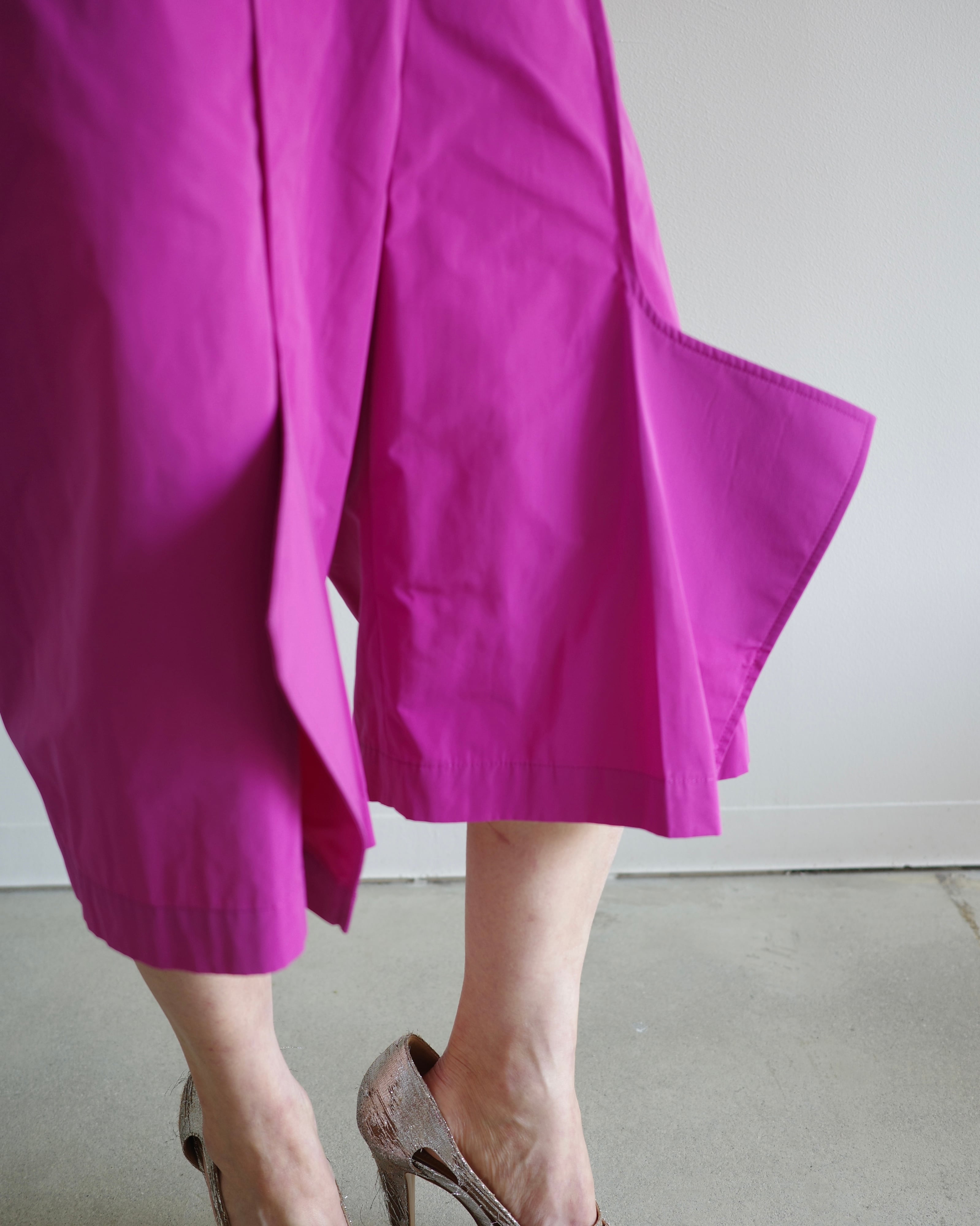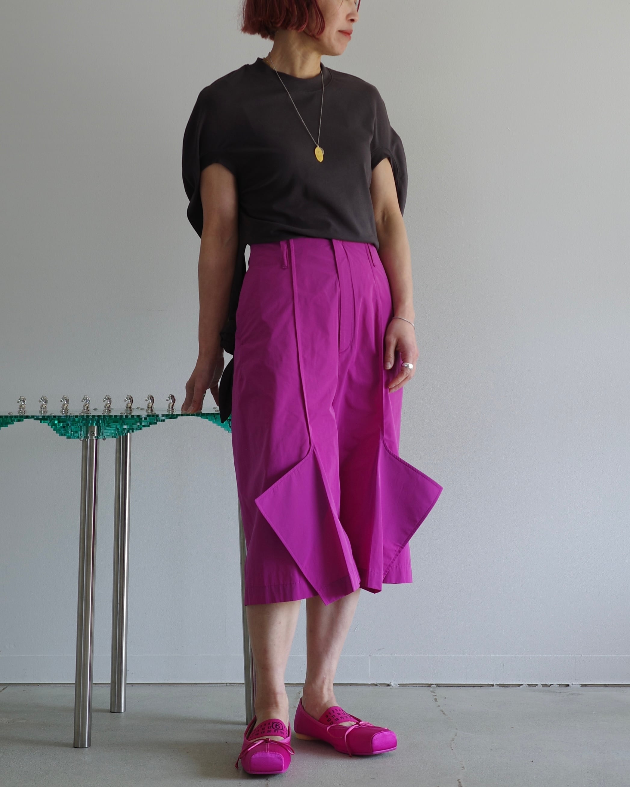 四角く張り出した裾が特徴の"Church"パンツをショート丈で作成した。