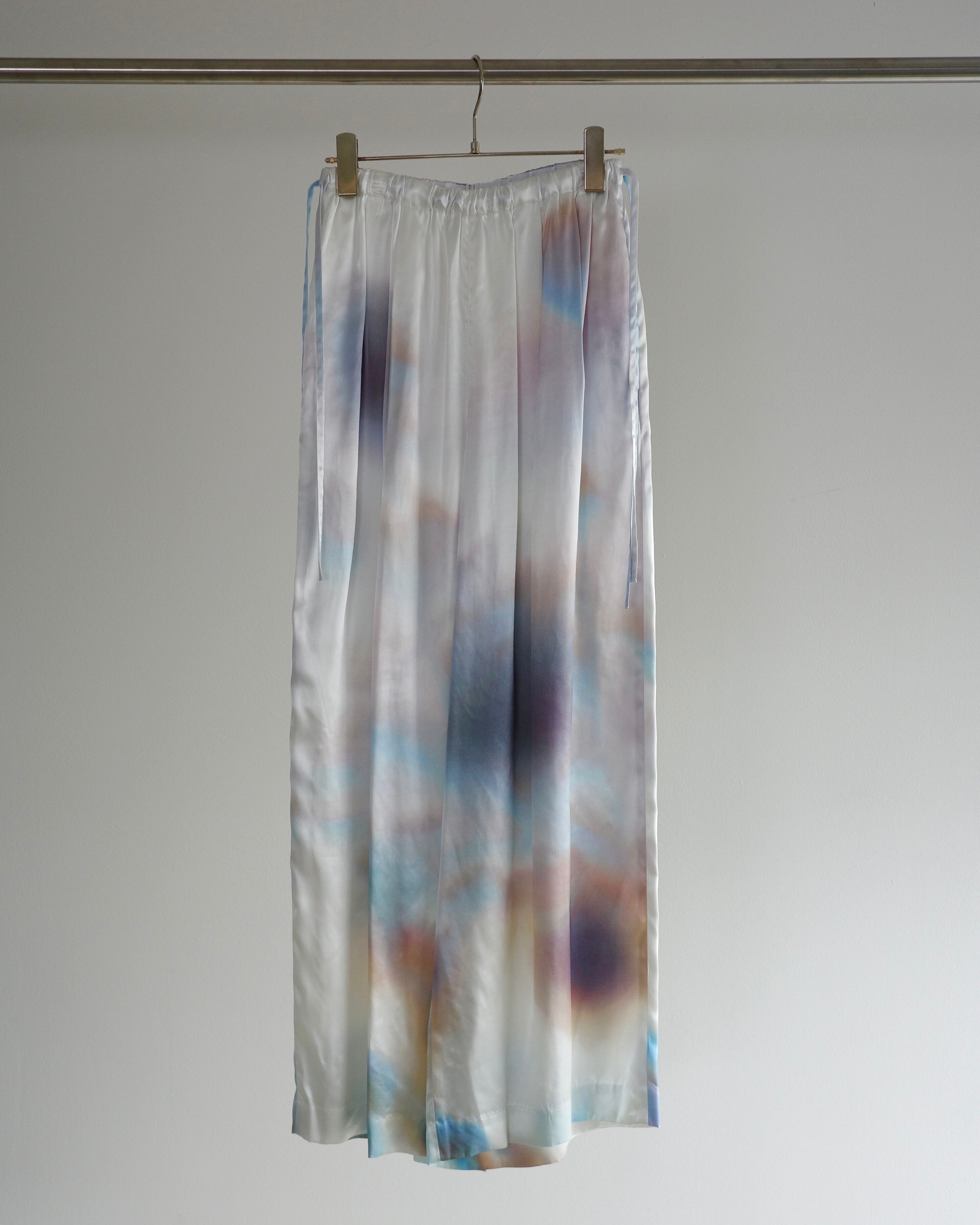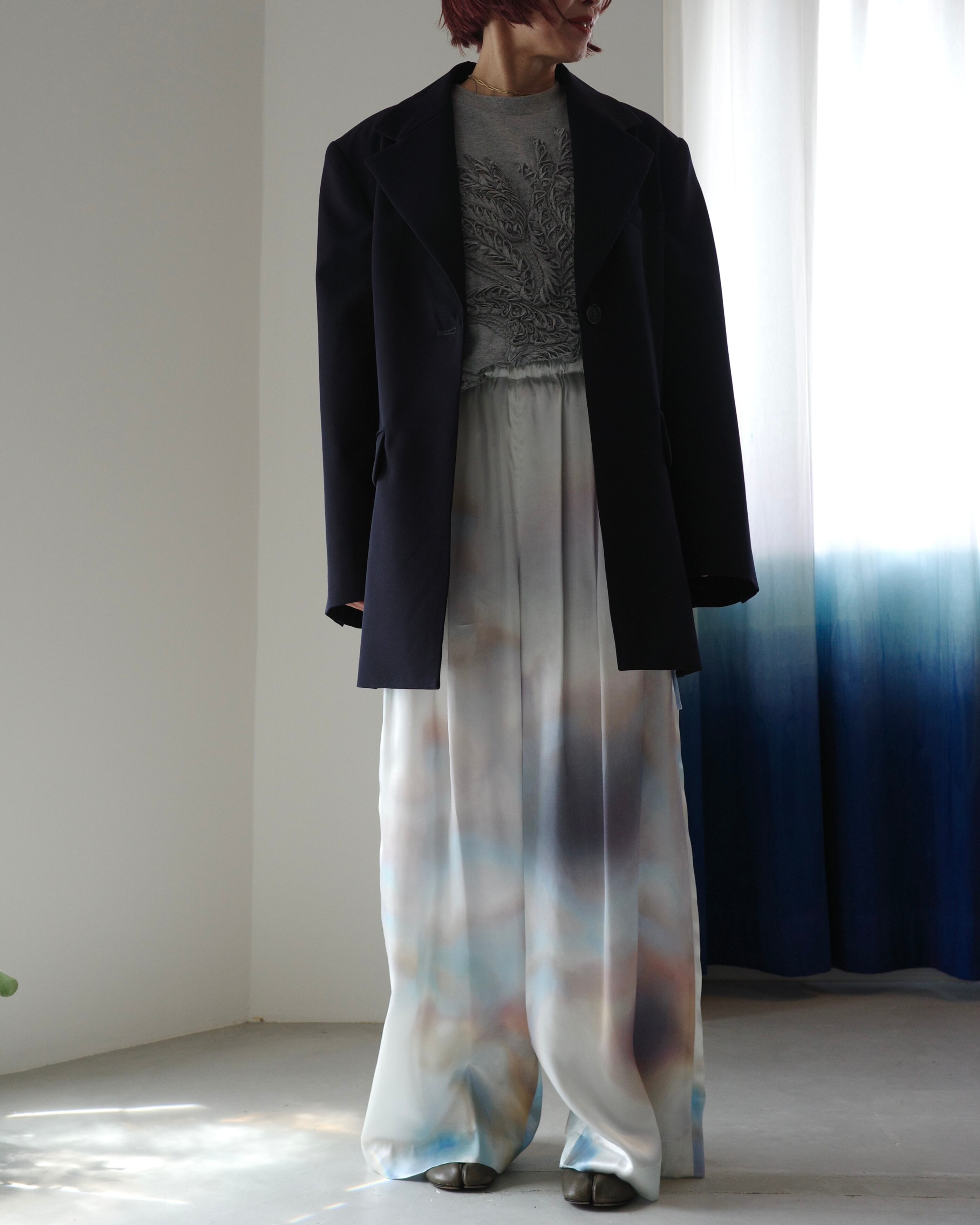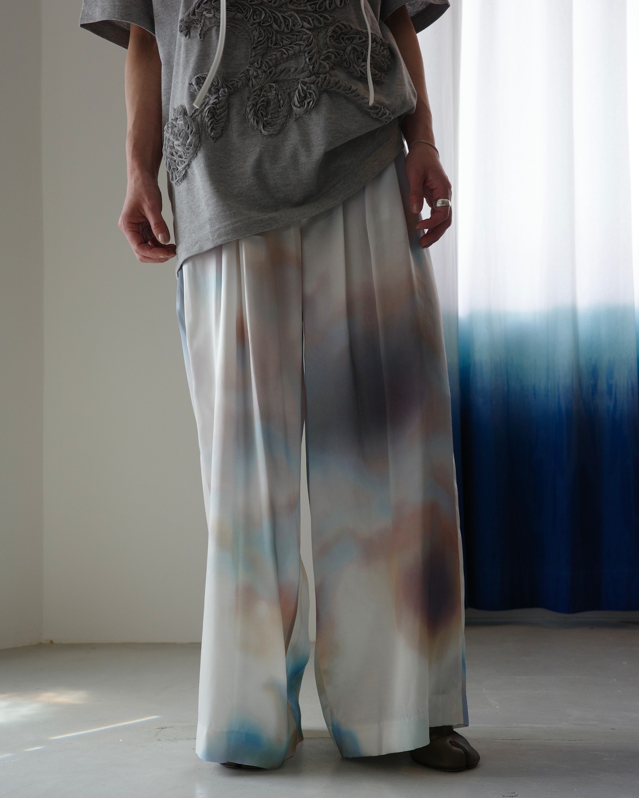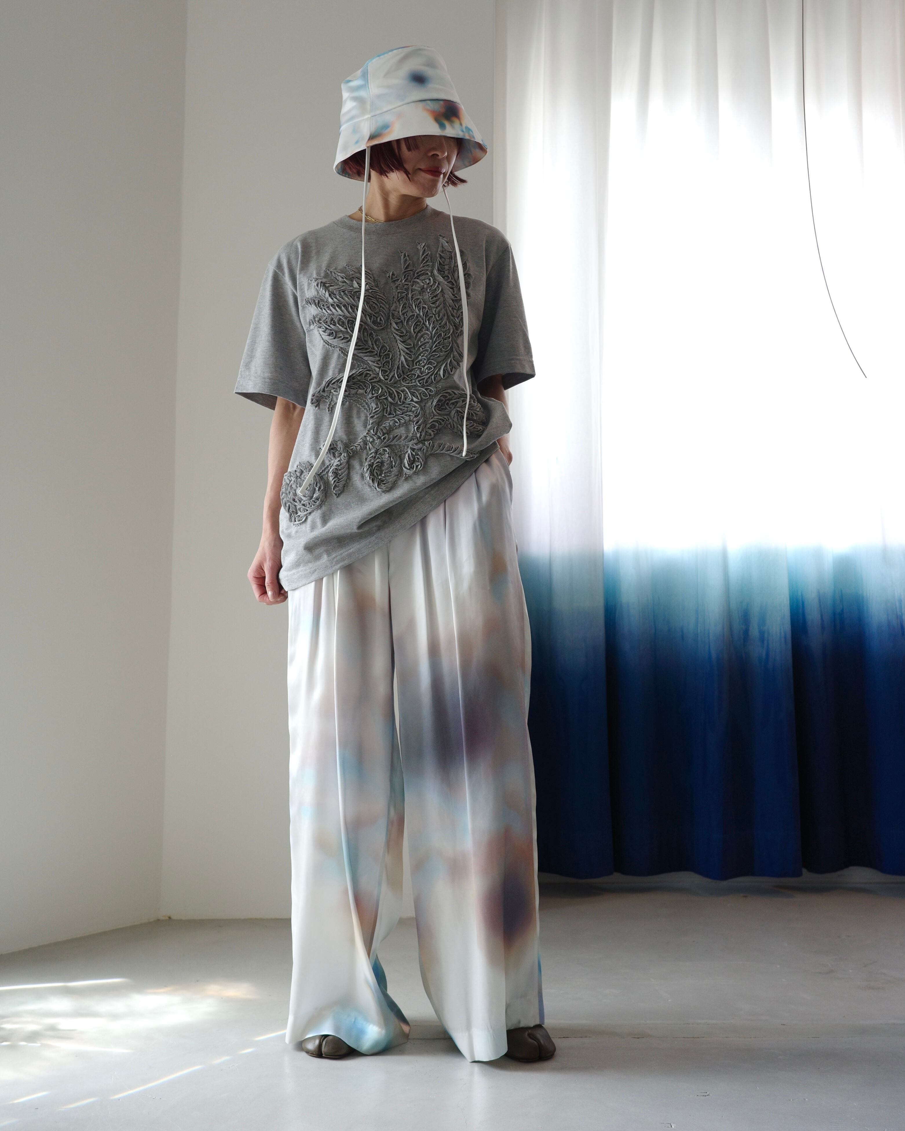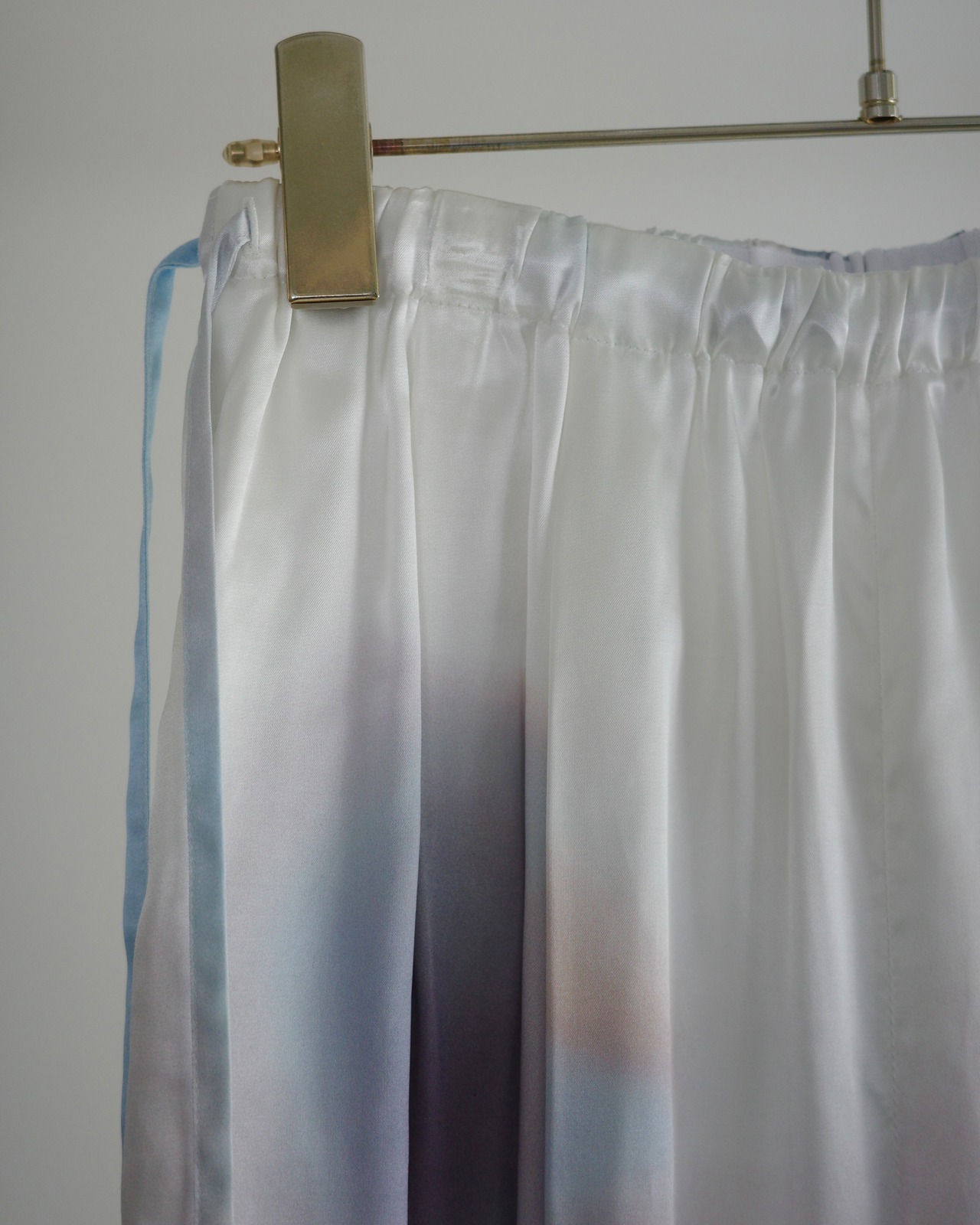 丸山さやか氏とのコラボレーション柄を大胆にプリントした、巾着のようなダブルストラップデザインで合わせやすいが少し新鮮に見えるフレッシュなディティールがポイントのパンツ。