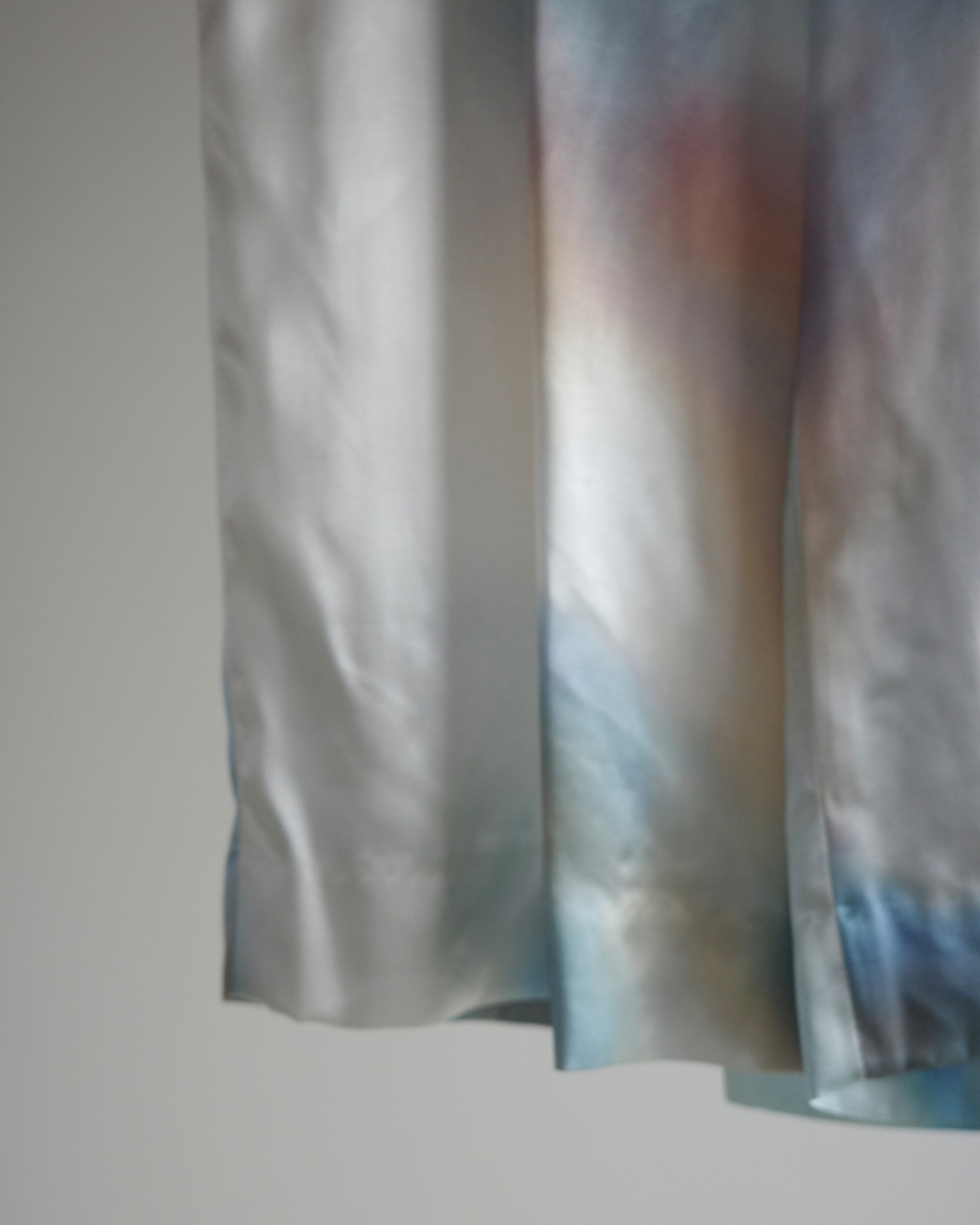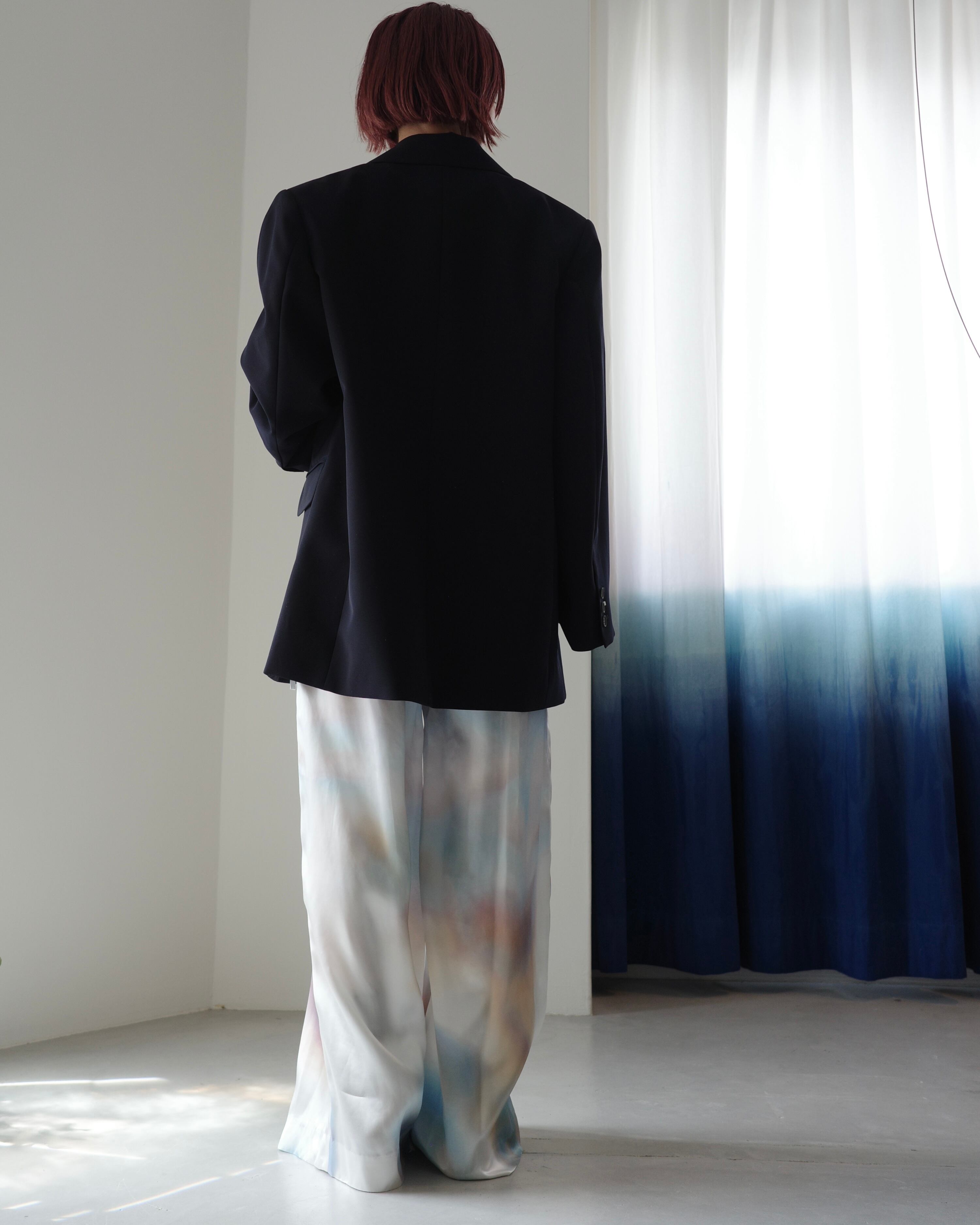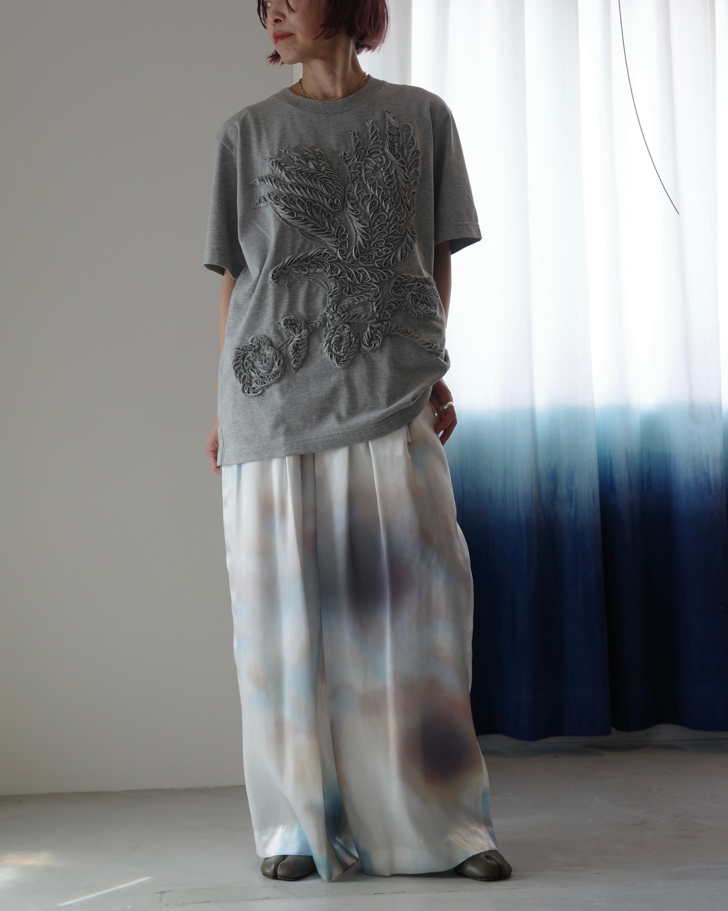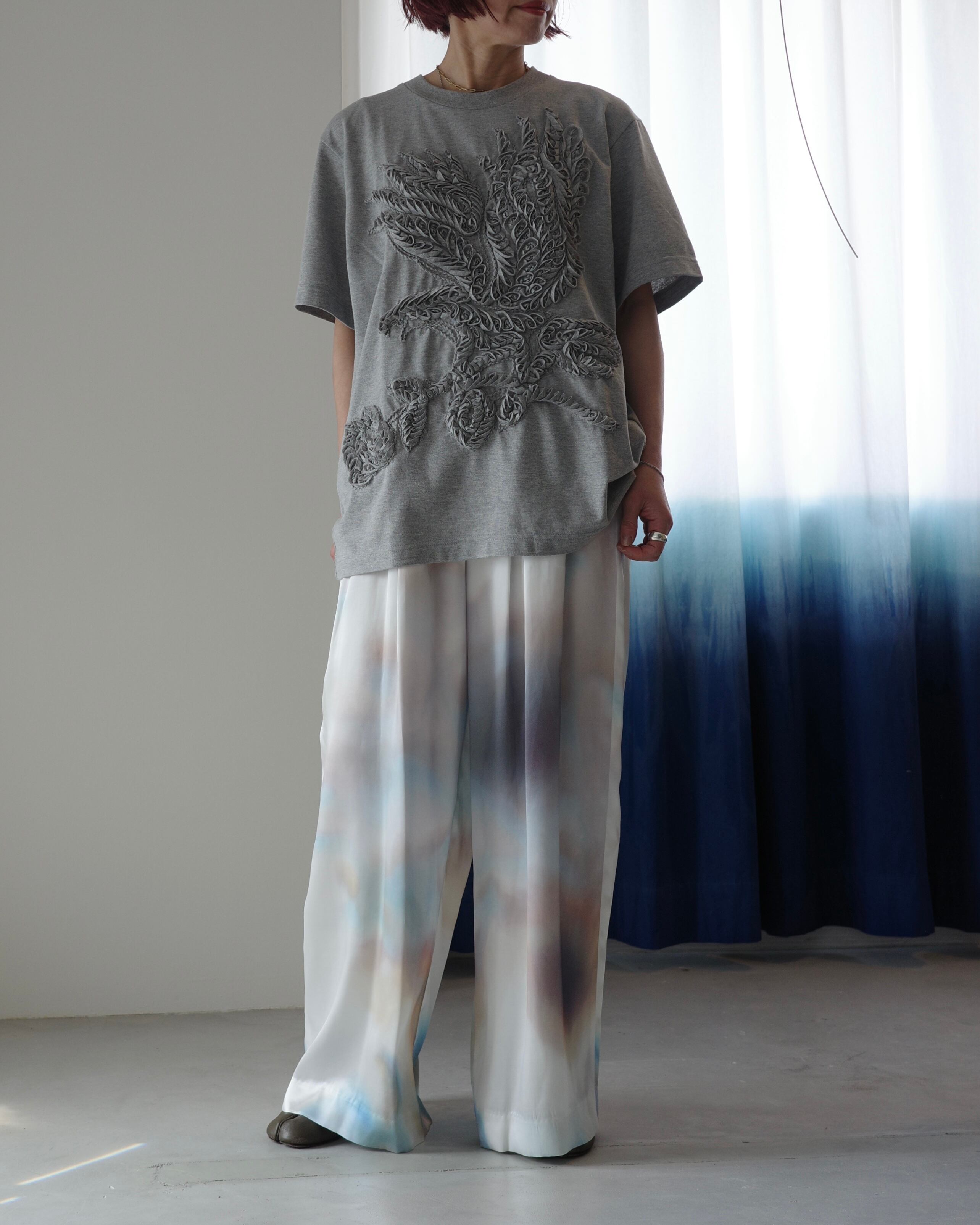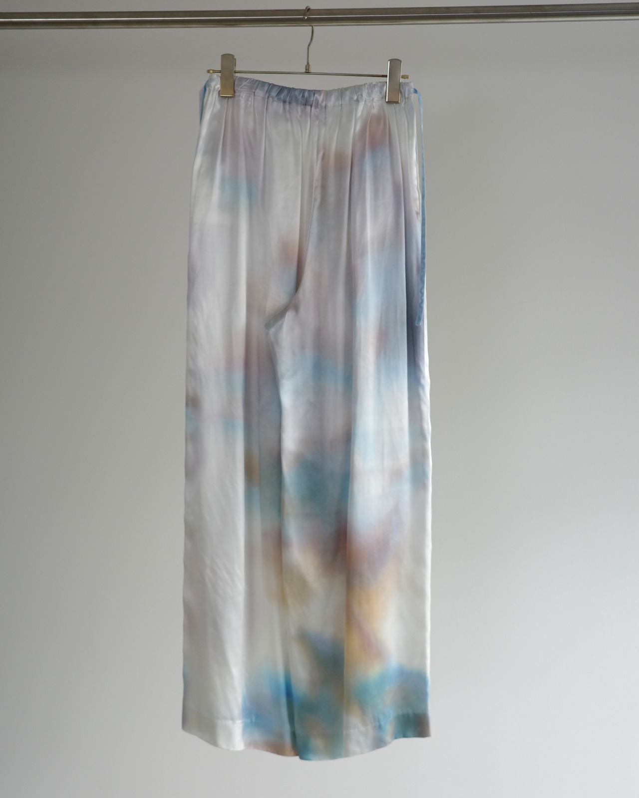丸山さやか氏とのコラボレーション柄を大胆にプリントした、巾着のようなダブルストラップデザインで合わせやすいが少し新鮮に見えるフレッシュなディティールがポイントのパンツ。