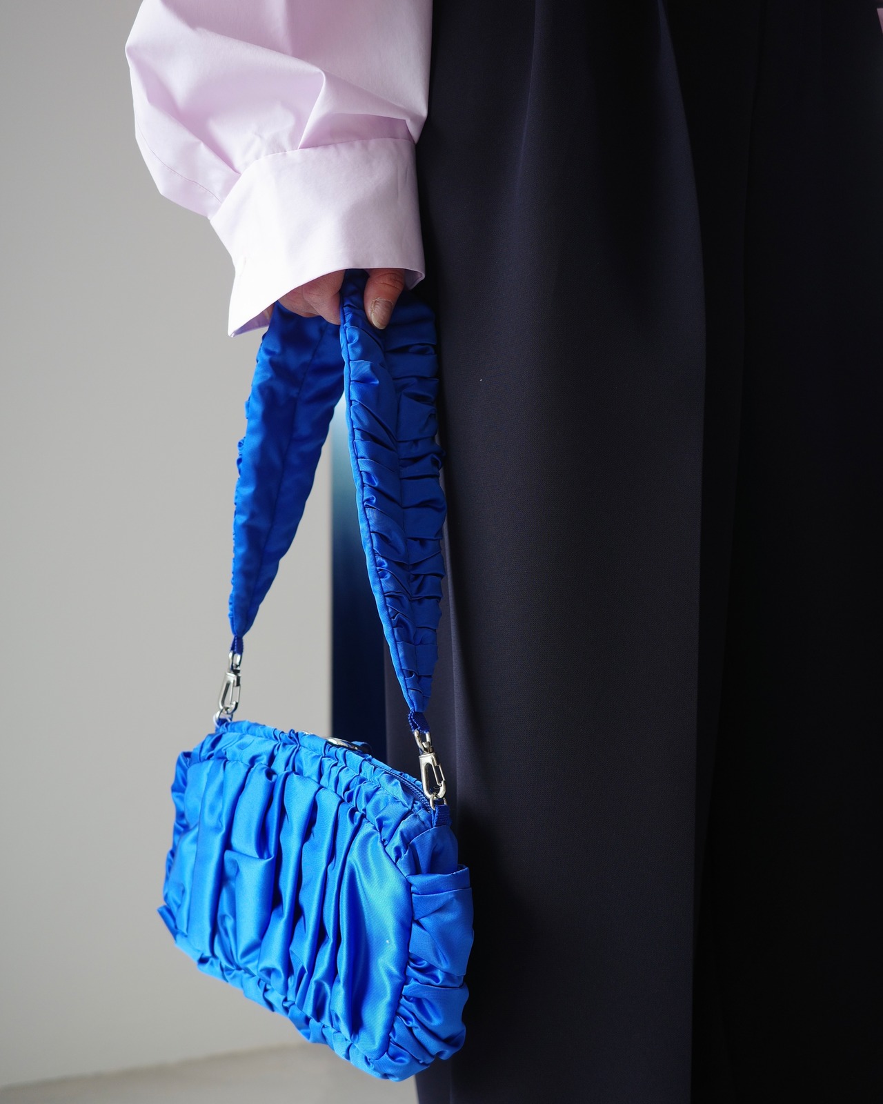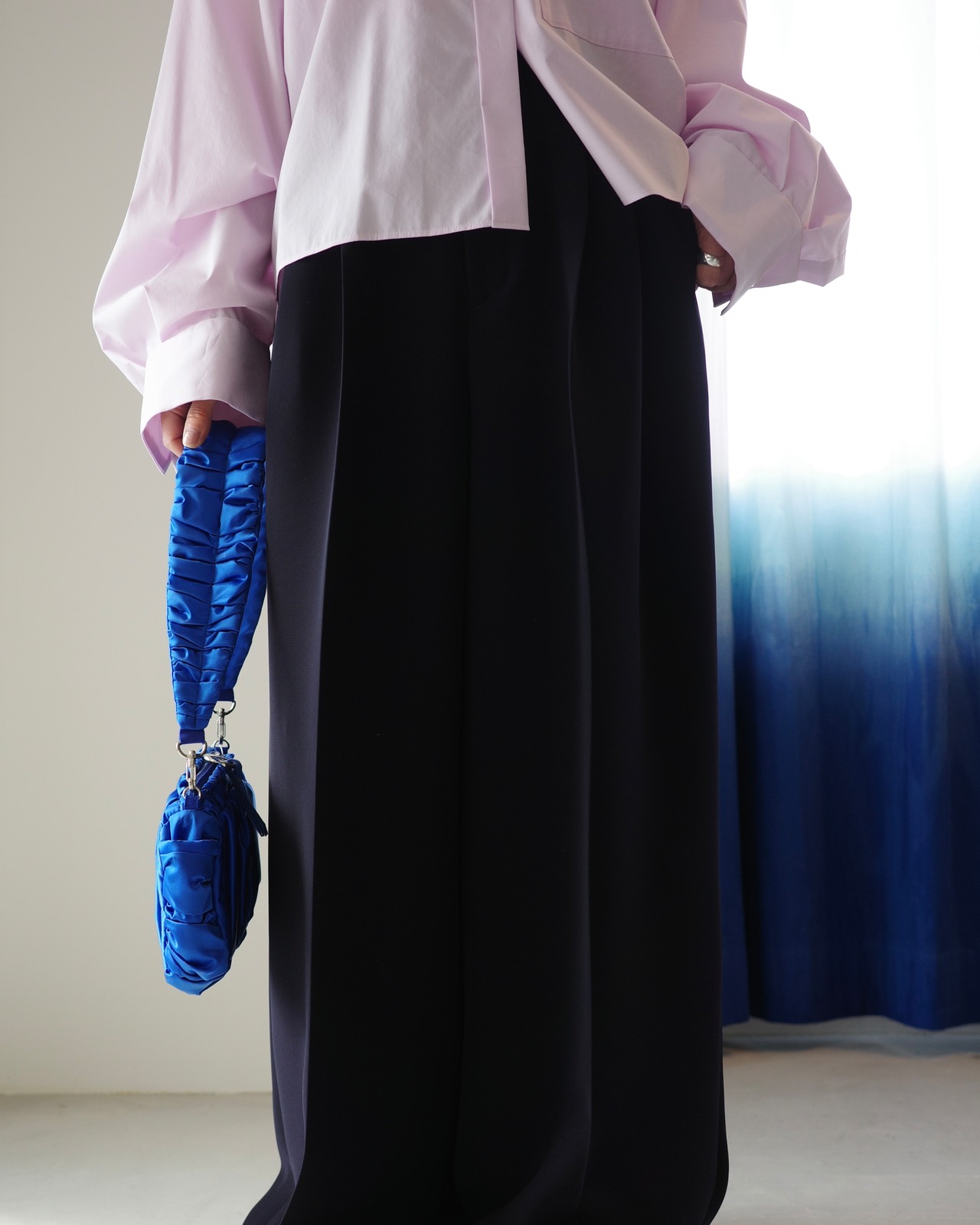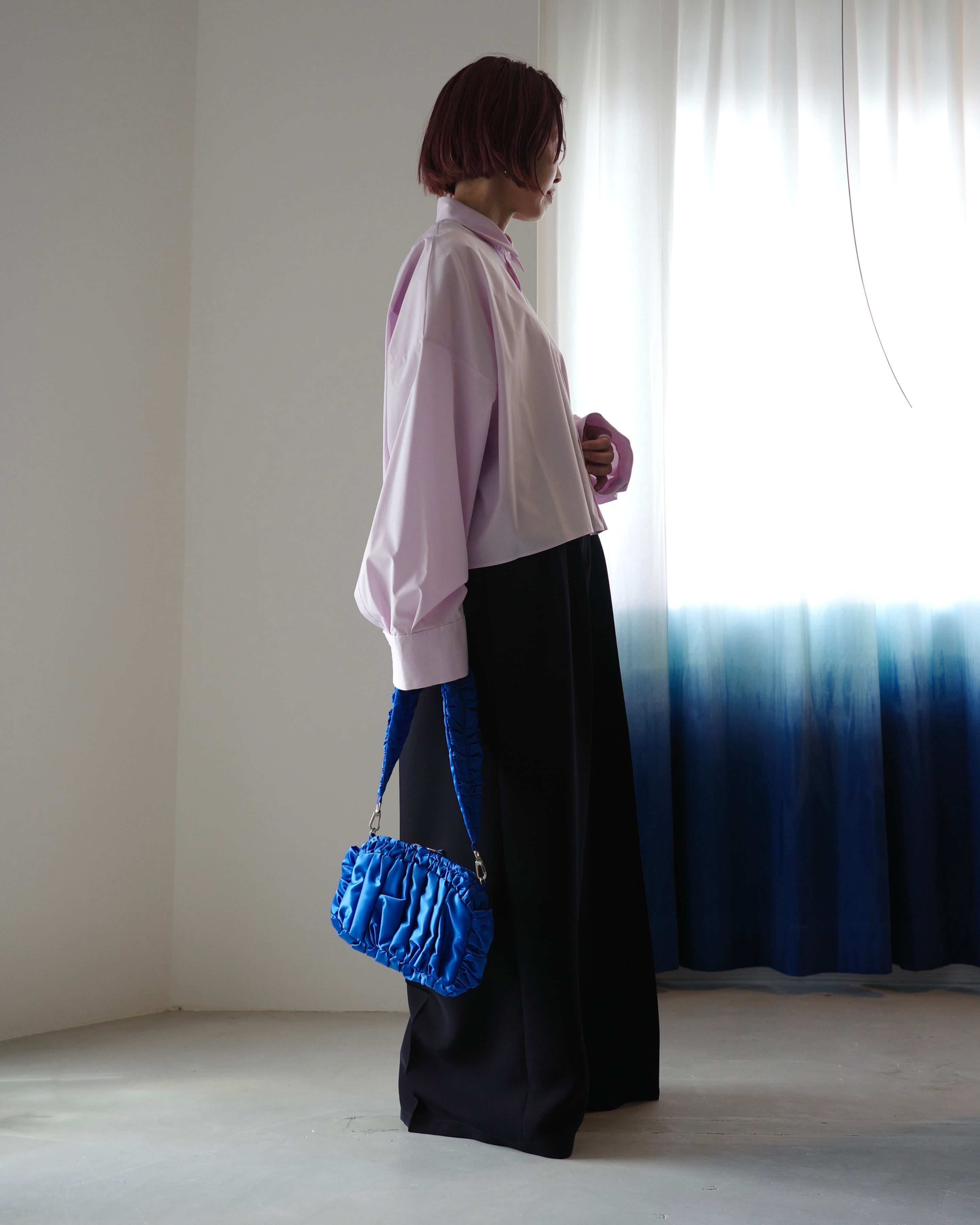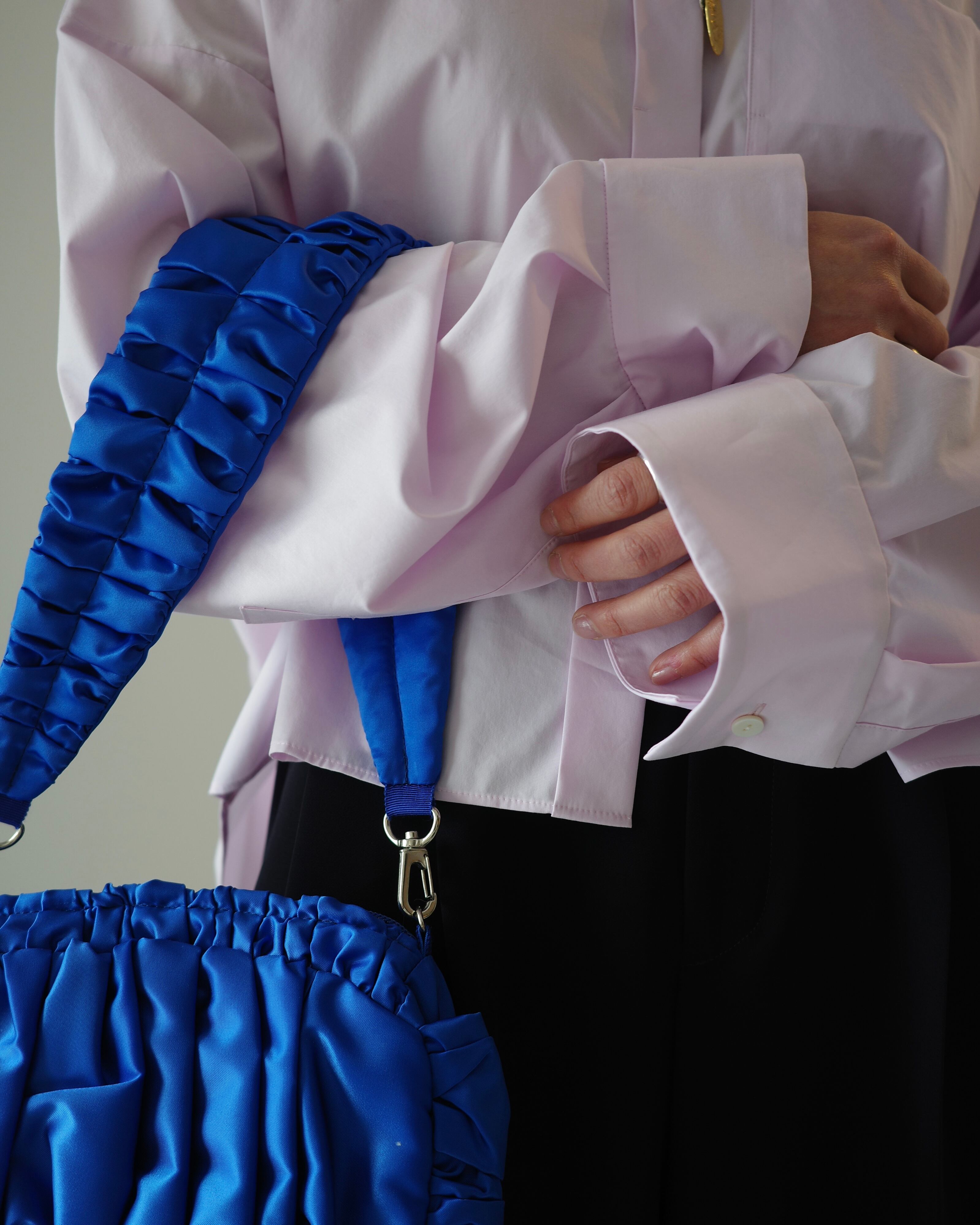 Fabric:前工程、後工程の両方で揉み洗いをし、さらにフィニッシュで特殊樹脂加工を施すことで反発感とトロみを共存させた合繊ライクのタフタ。