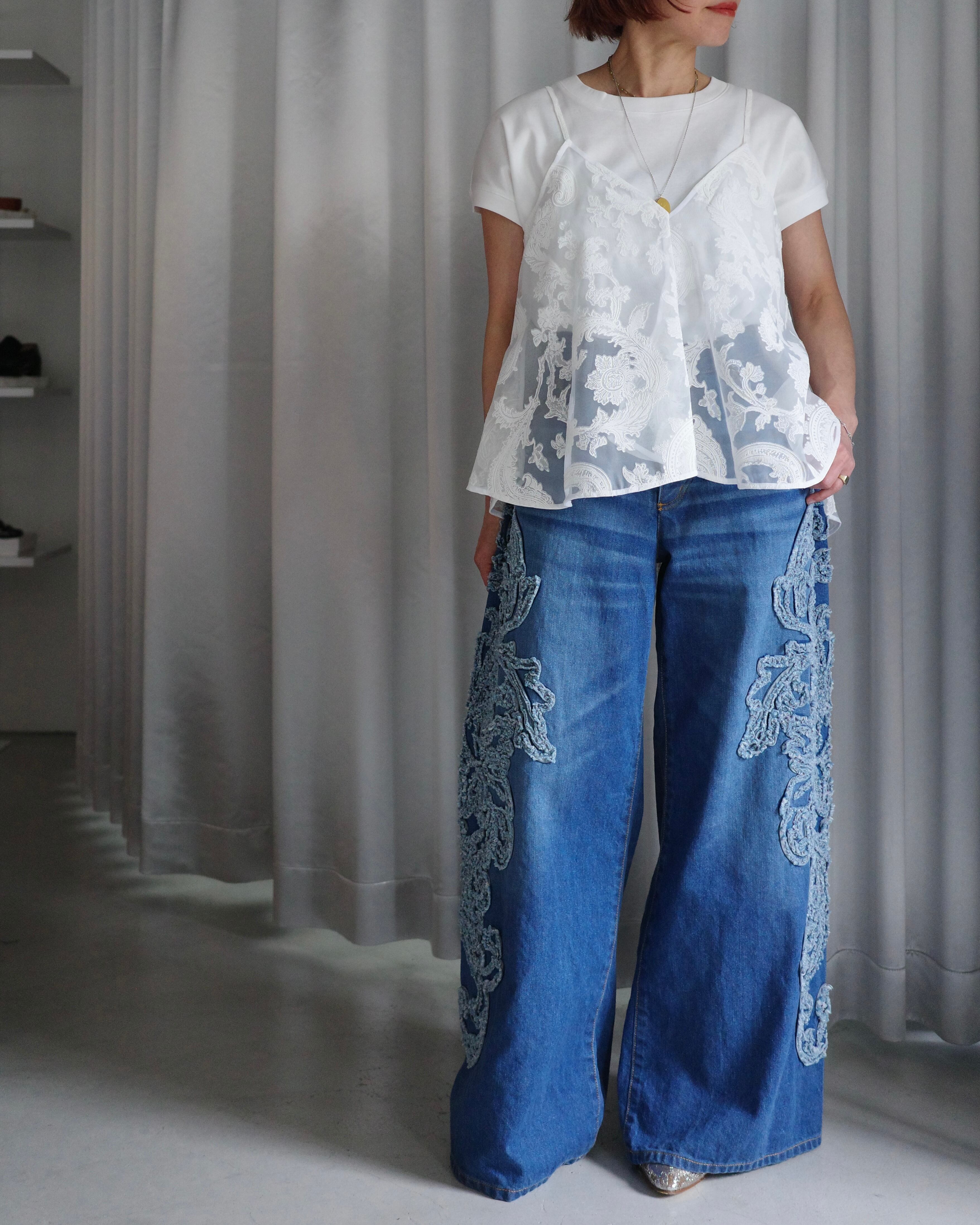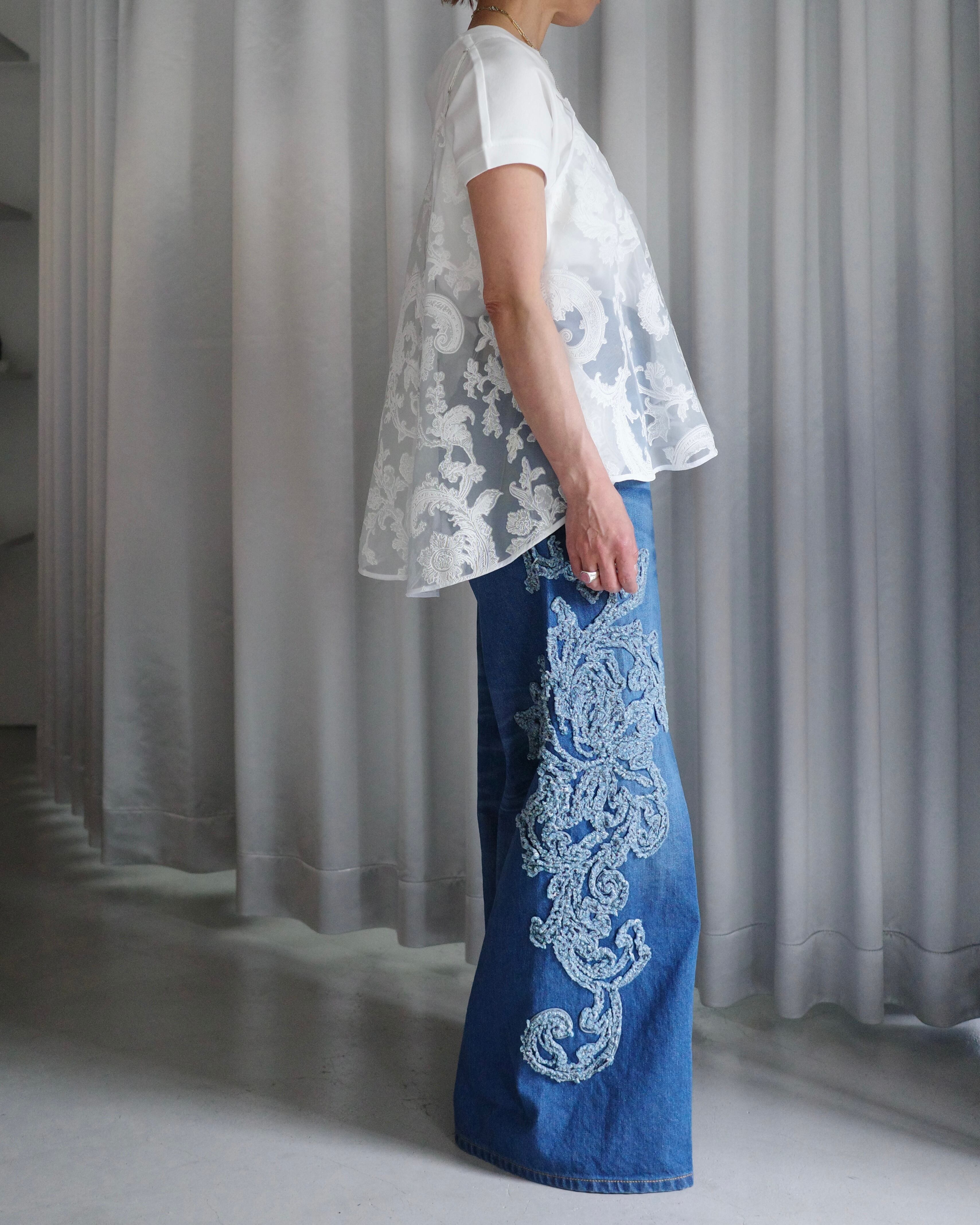 刺繍とは異なる方法で凹凸と透明感を同時に表現する、非常に高度なプリント技法から生まれた一着。