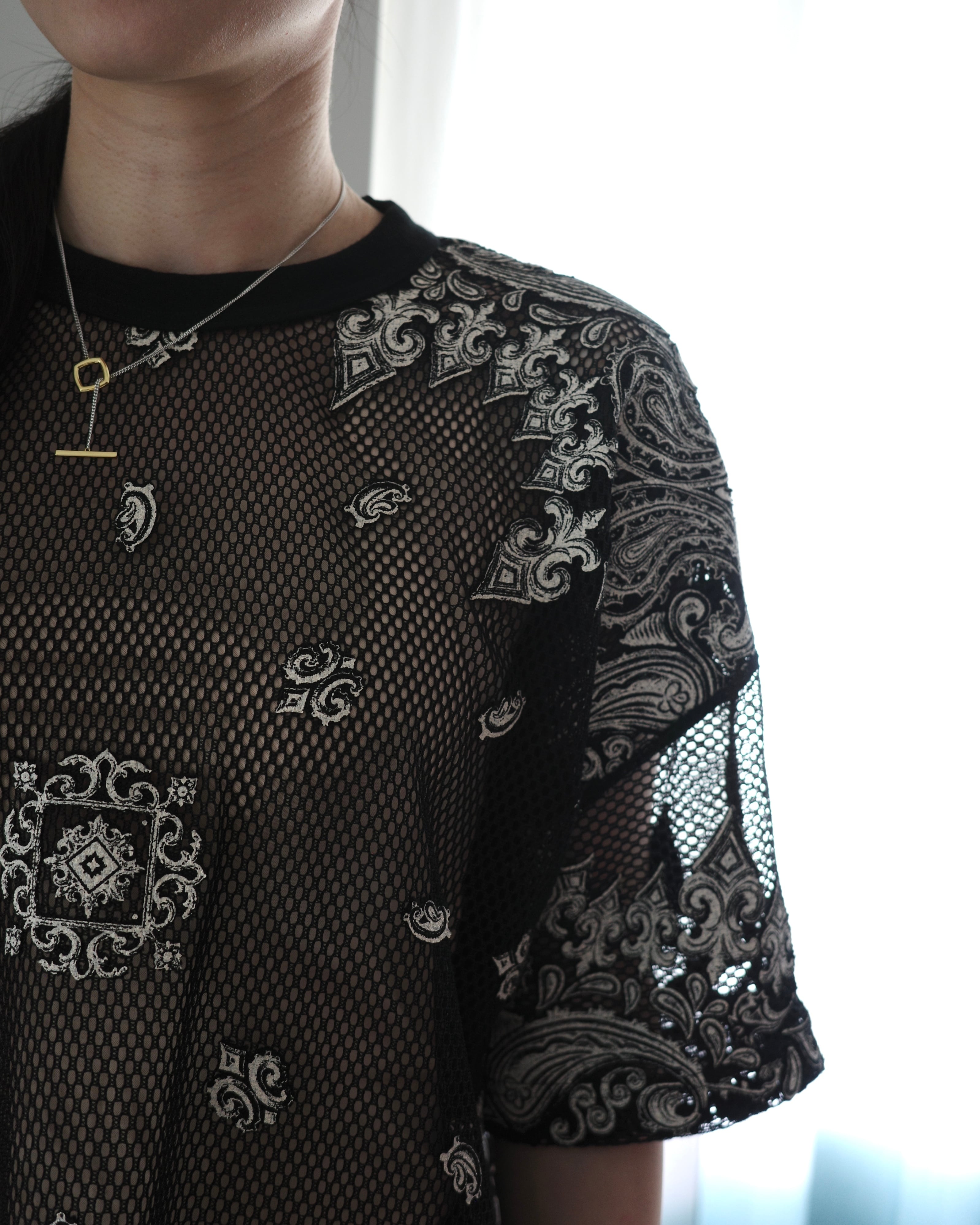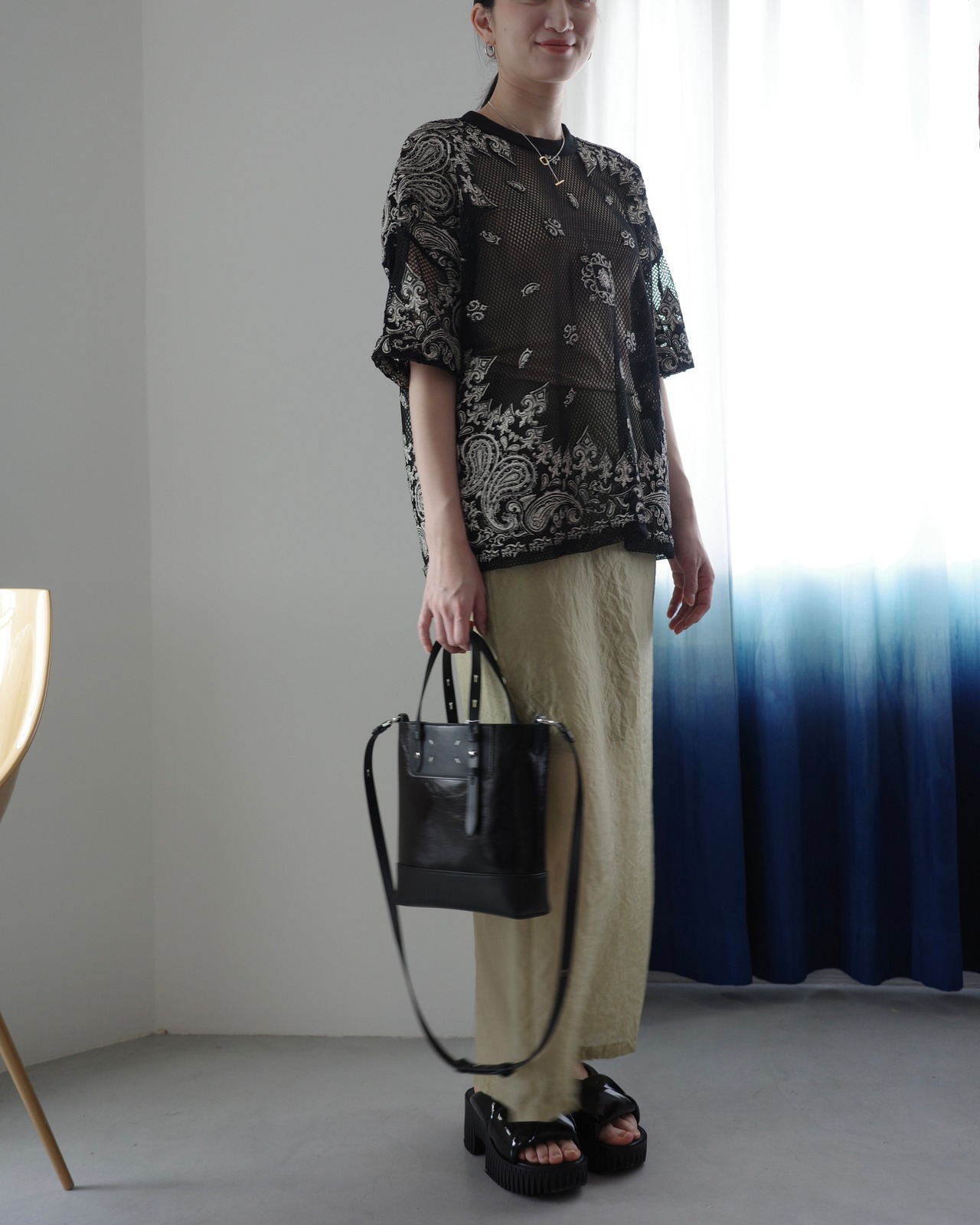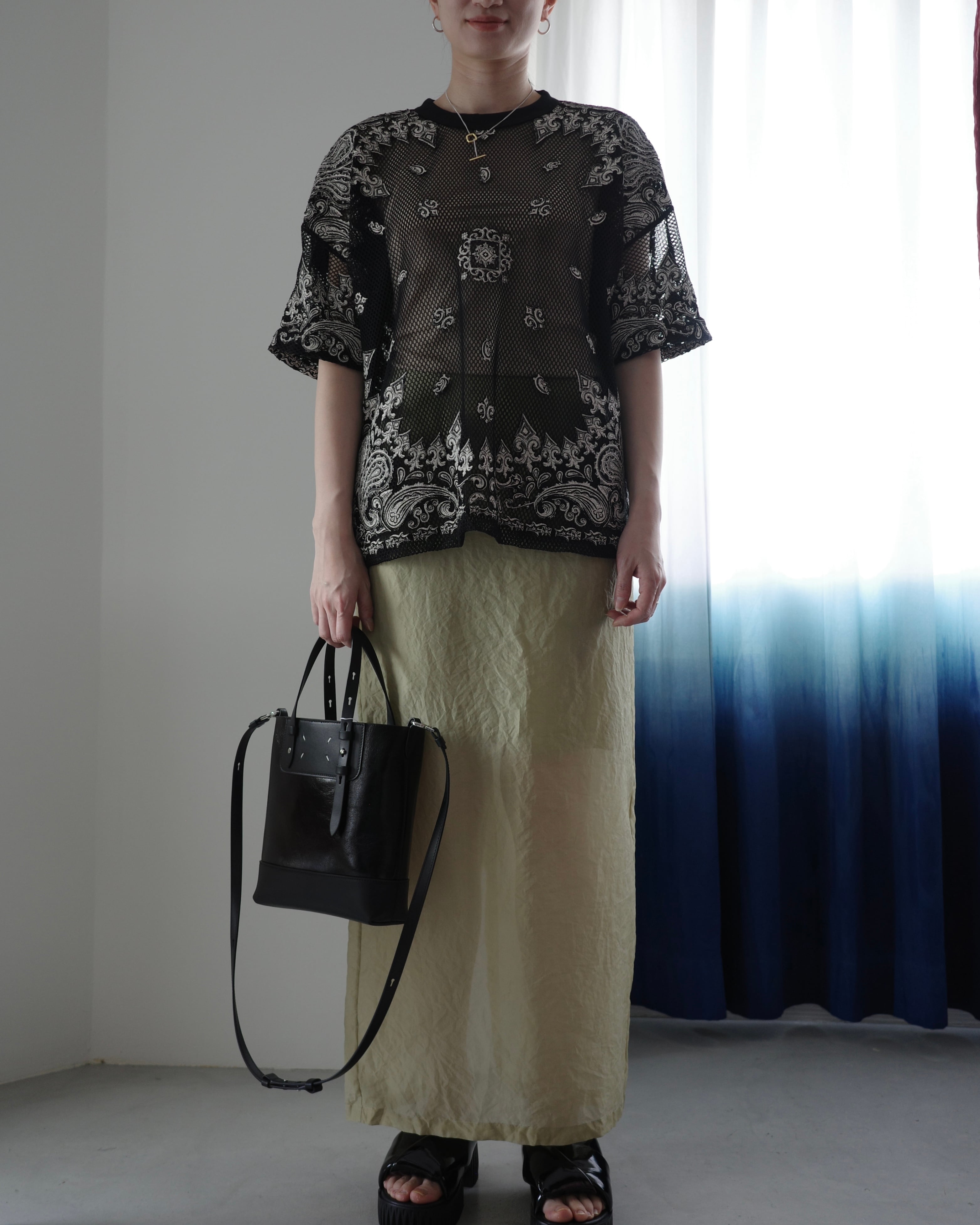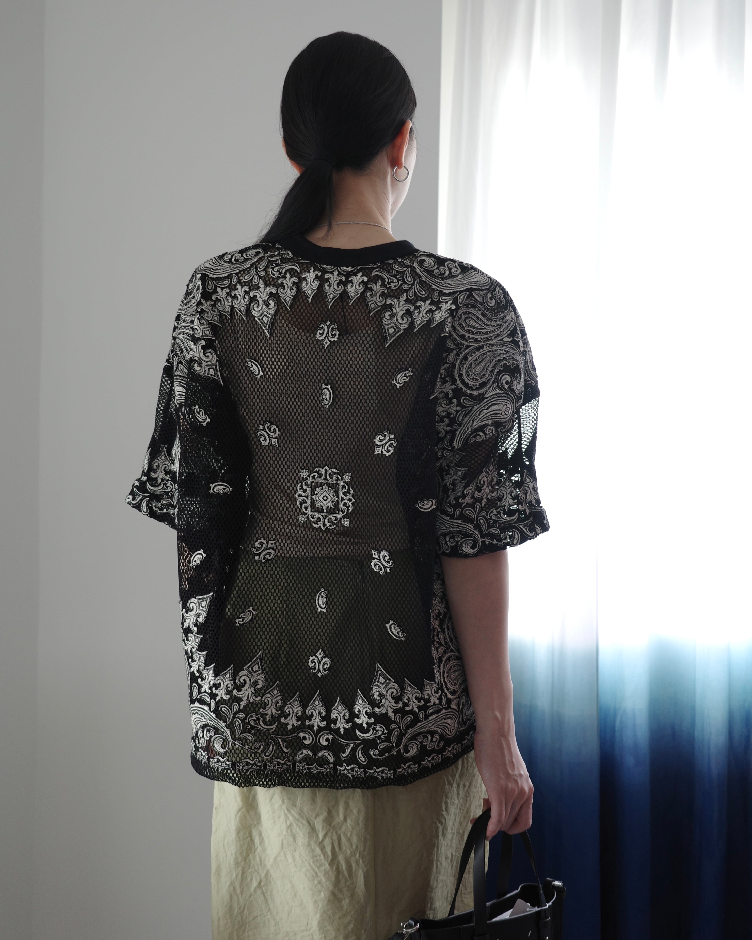 バンダナ柄の顔料プリントを施すことで、偶然と計算が交錯する視覚的レイヤーを生み出している。