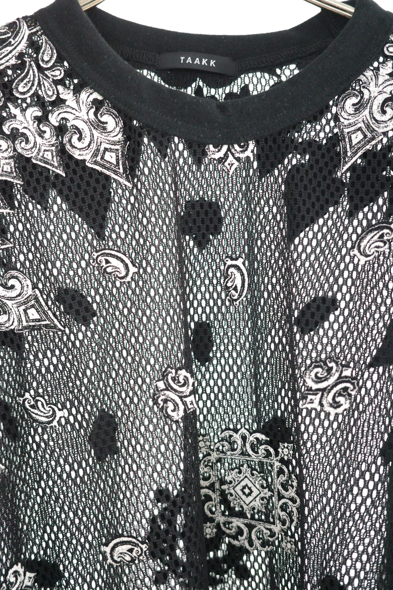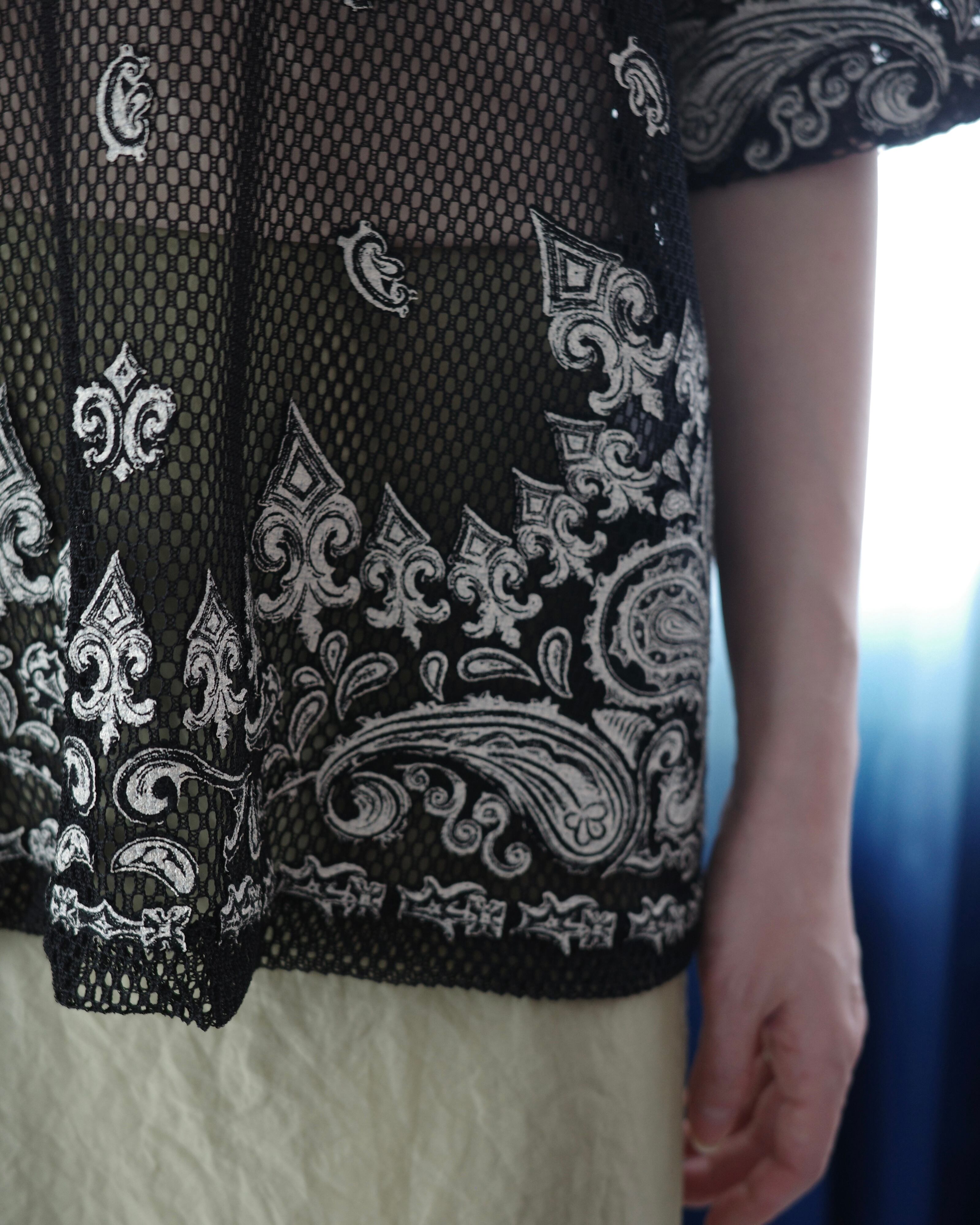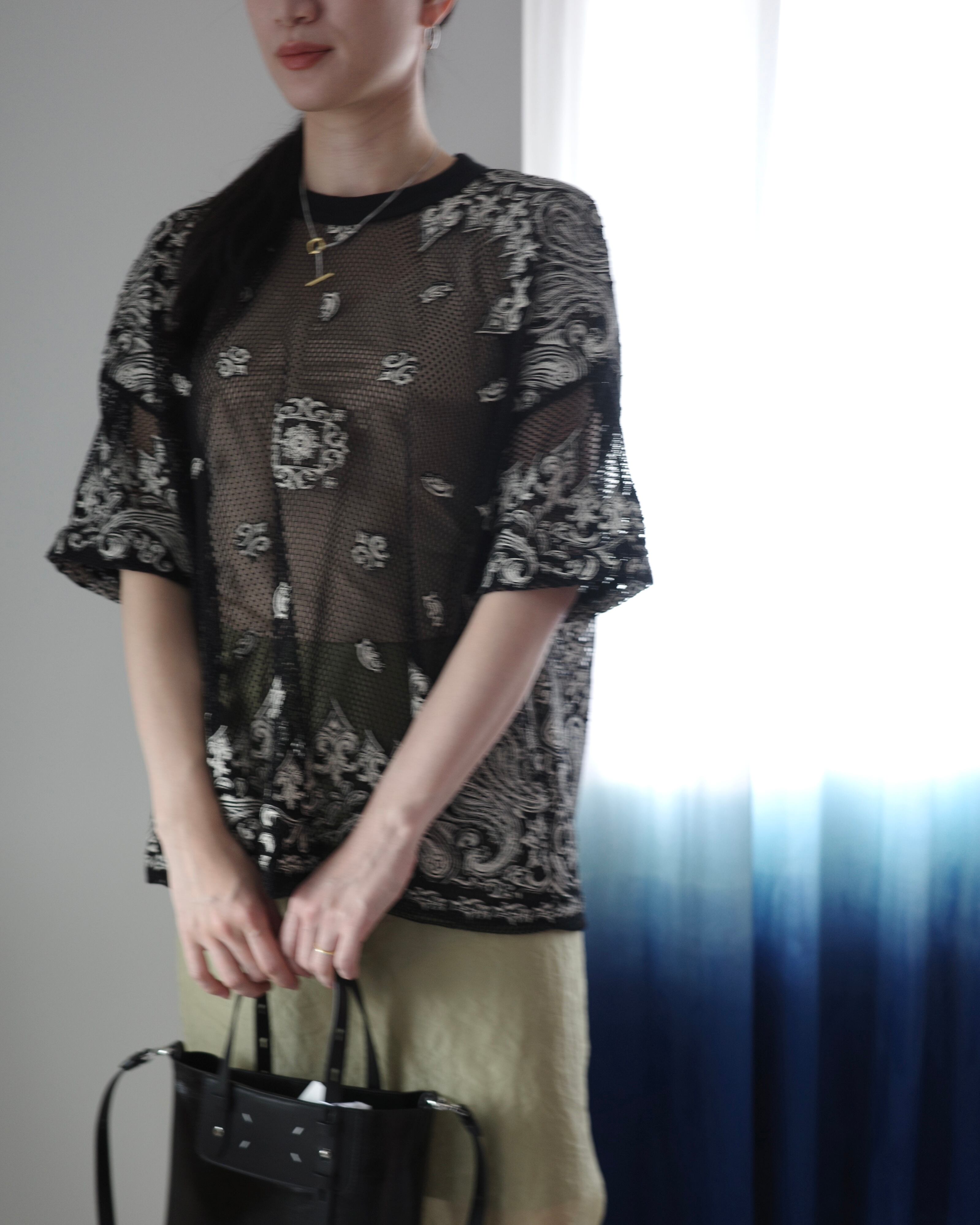 バンダナ柄の顔料プリントを施すことで、偶然と計算が交錯する視覚的レイヤーを生み出している。