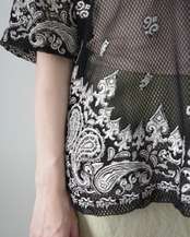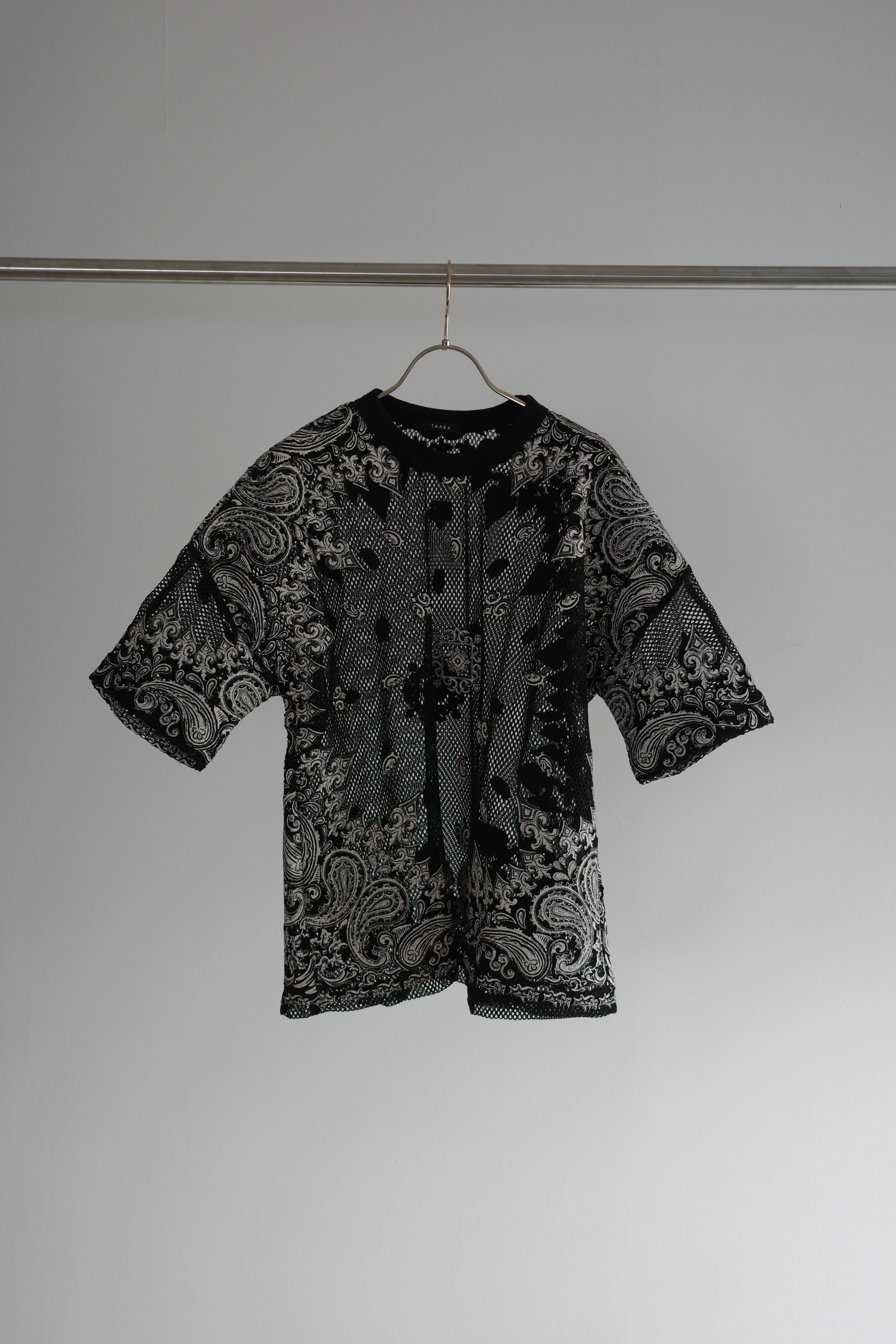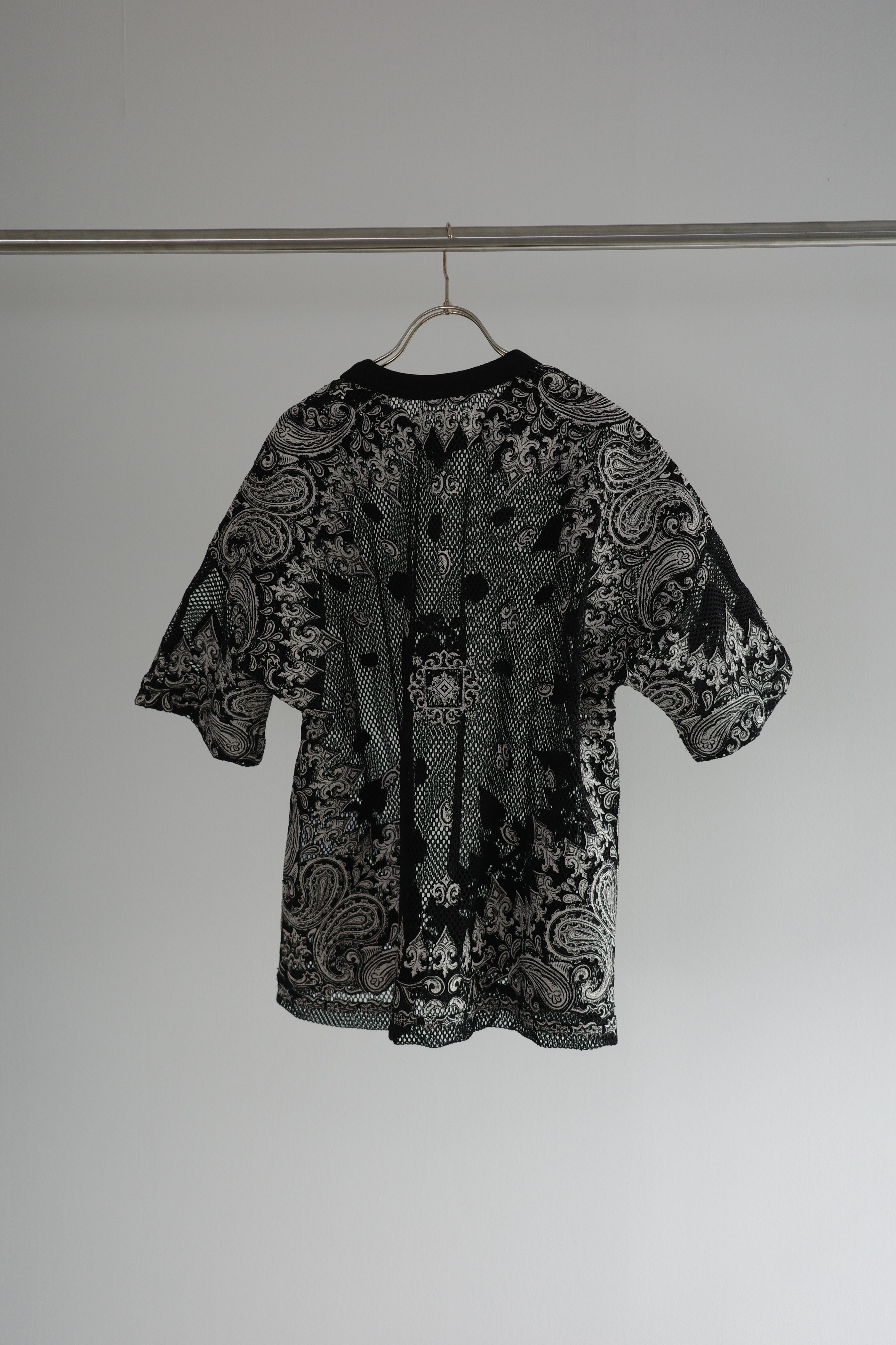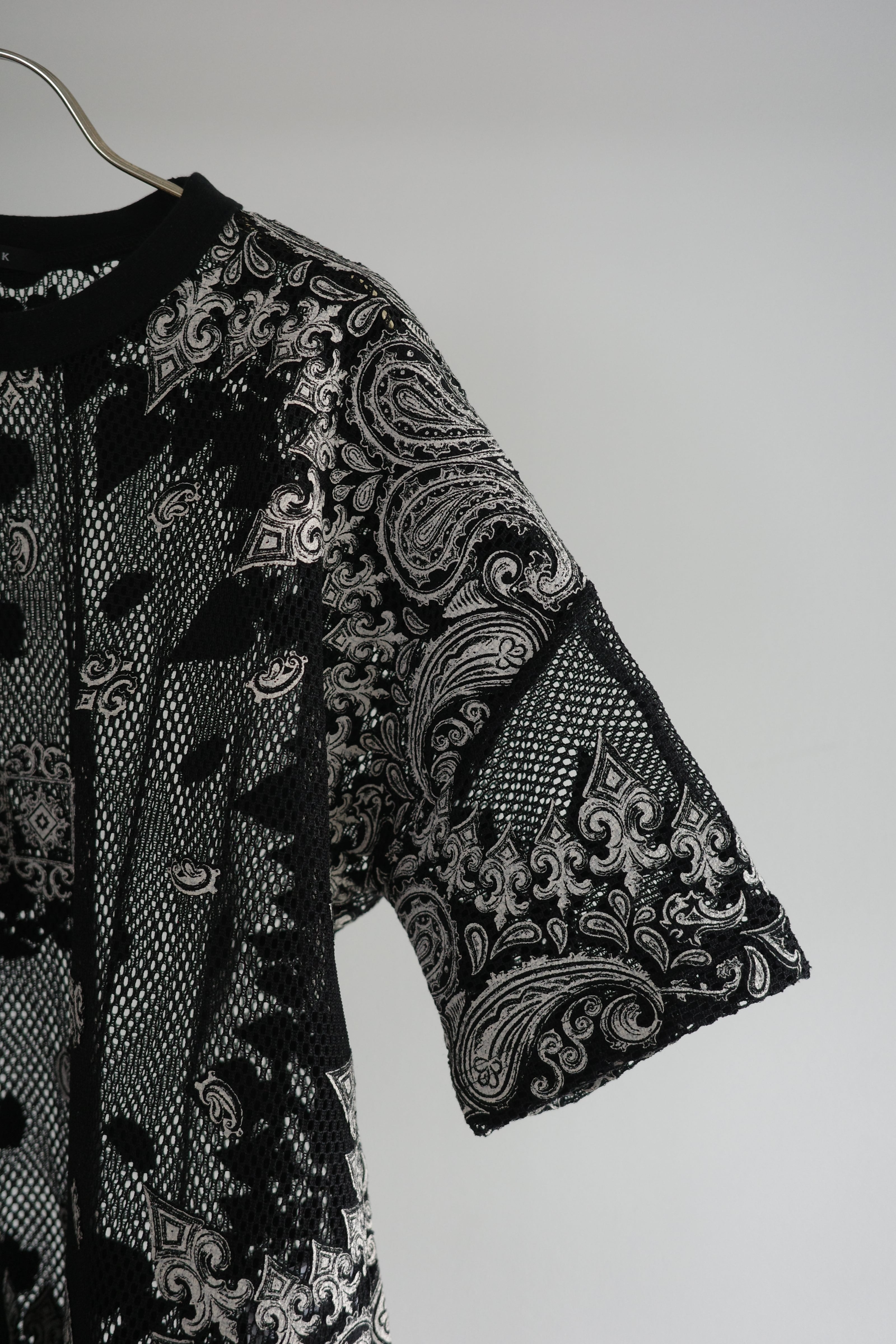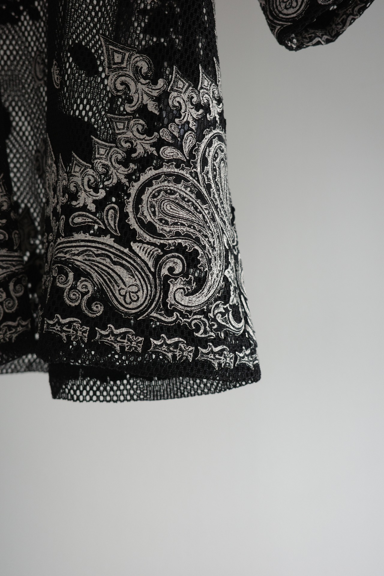 バンダナ柄の顔料プリントを施すことで、偶然と計算が交錯する視覚的レイヤーを生み出している。