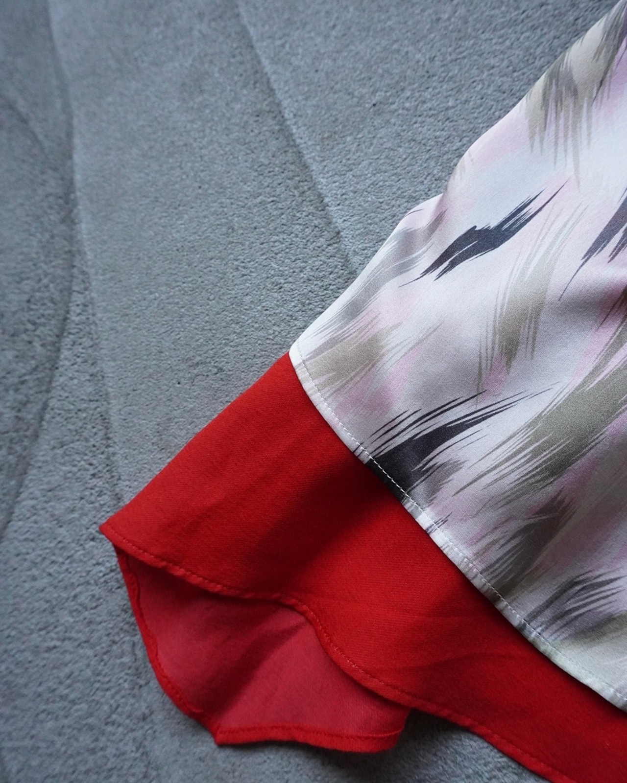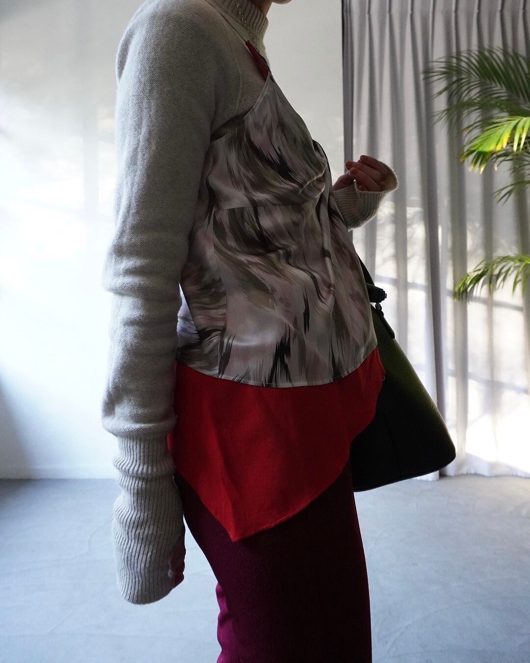 AKANEの定番であるキャミソールシリーズ。毎シーズン素材やテイストを変えてアップデートされています。今シーズンはKLAUSIEとのコラボプリントにアシンメトリーな赤い布帛がポイント。オールシーズン活躍する万能アイテムです。(着用スタッフ150cm)