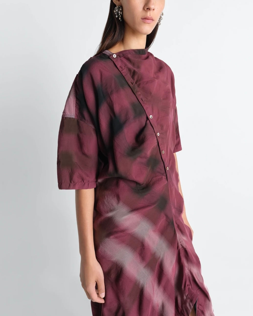 アシンメトリーなシャツドレスは、カウルネックラインが特徴で、首元はボタンで留めたり、開けたままでも着用できます。ビスコースコットンの混紡素材で仕立てられ、特殊な織りとチェック柄が豊かな表情を生み出し、バイアスカットのスカートが、流れるようなシルエットと動きをもたらします。