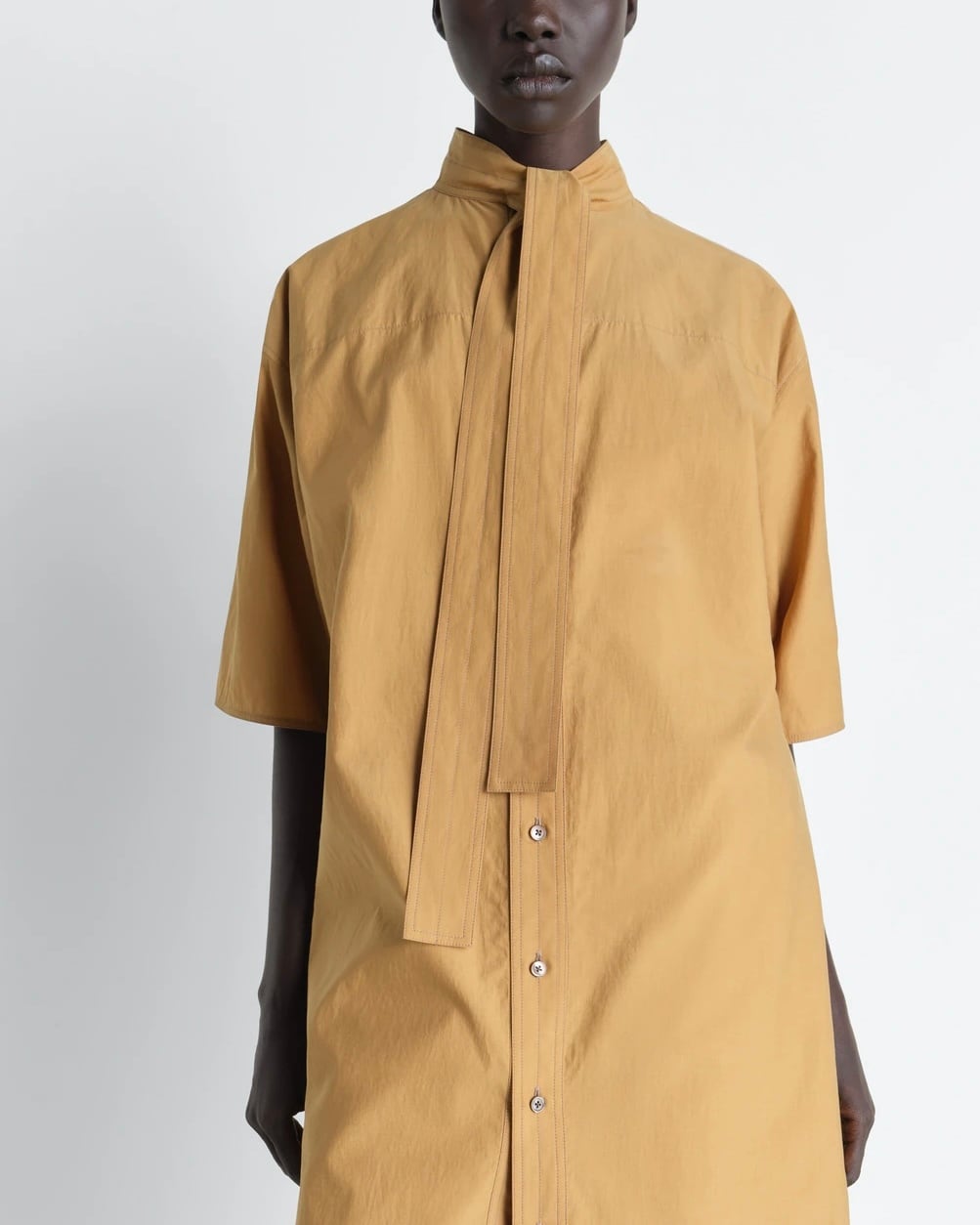 ボリューム感を再構築したロングチューブドレス。タイネックのスカーフをあしらいシャツドレスをモダンにアップデートしています。