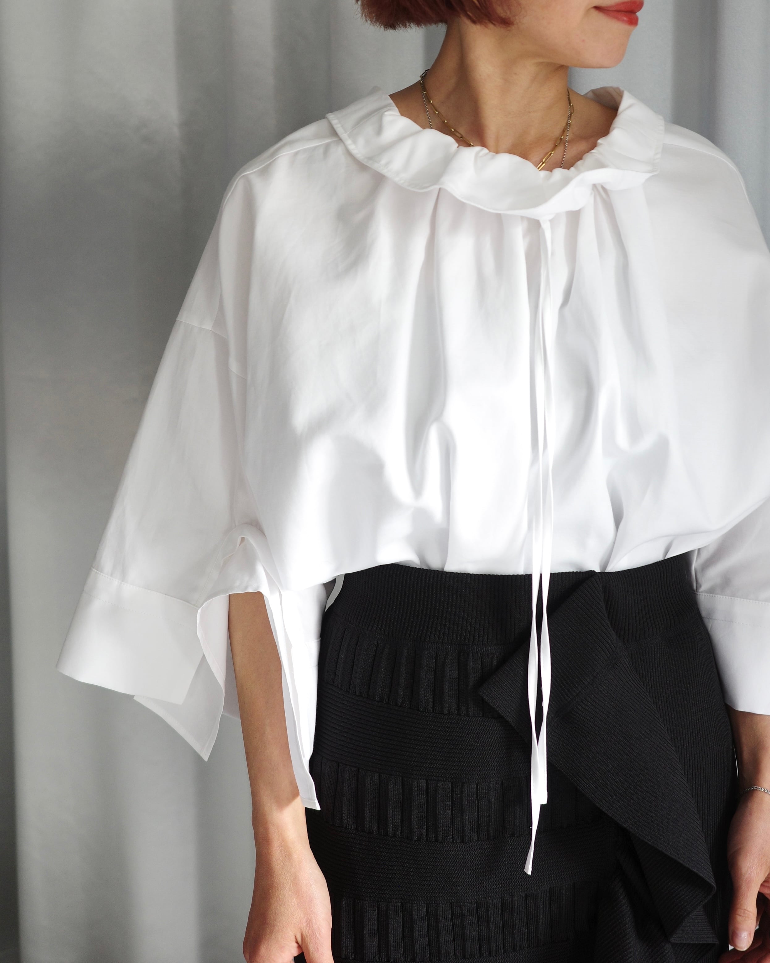 フロントのみ共地のスピンドルで絞れるハイネックで、細かなギャザーが現れ顔周りを華やかな印象にしてくれます。