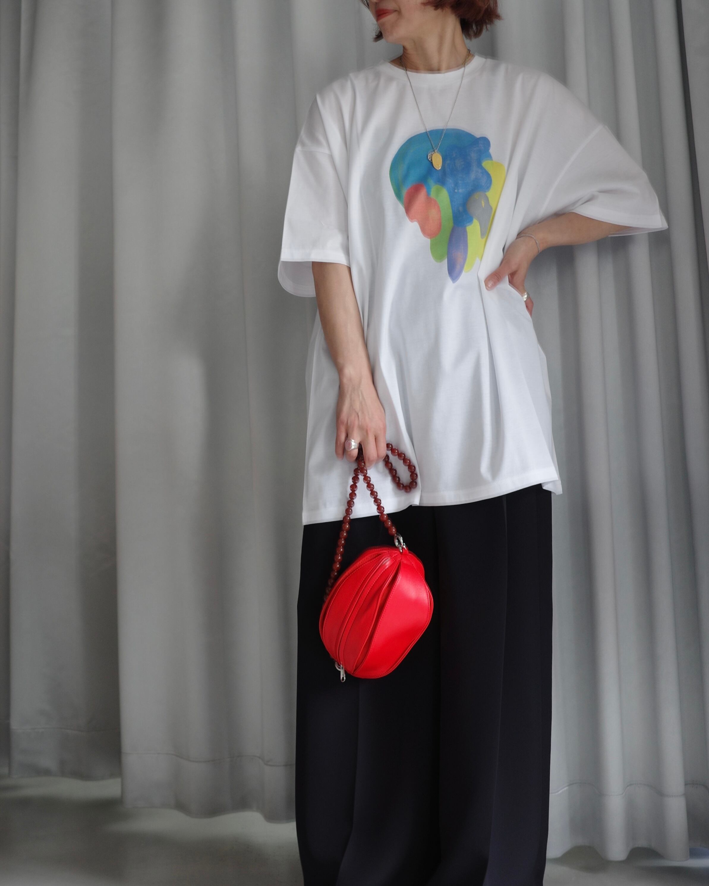 上手に二の腕を隠せて、大人の女性も子供っぽくならないアートプリントTシャツの新作です。