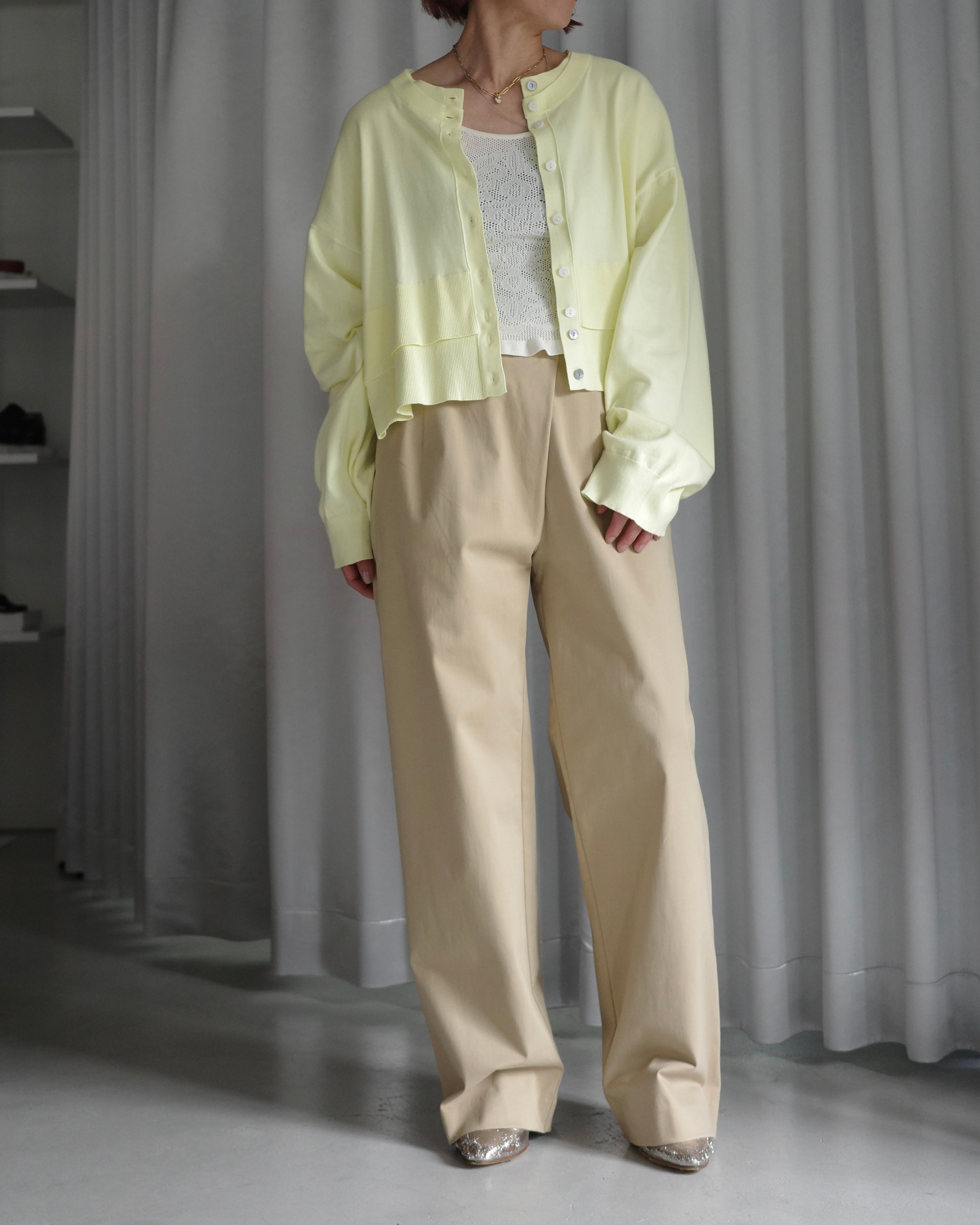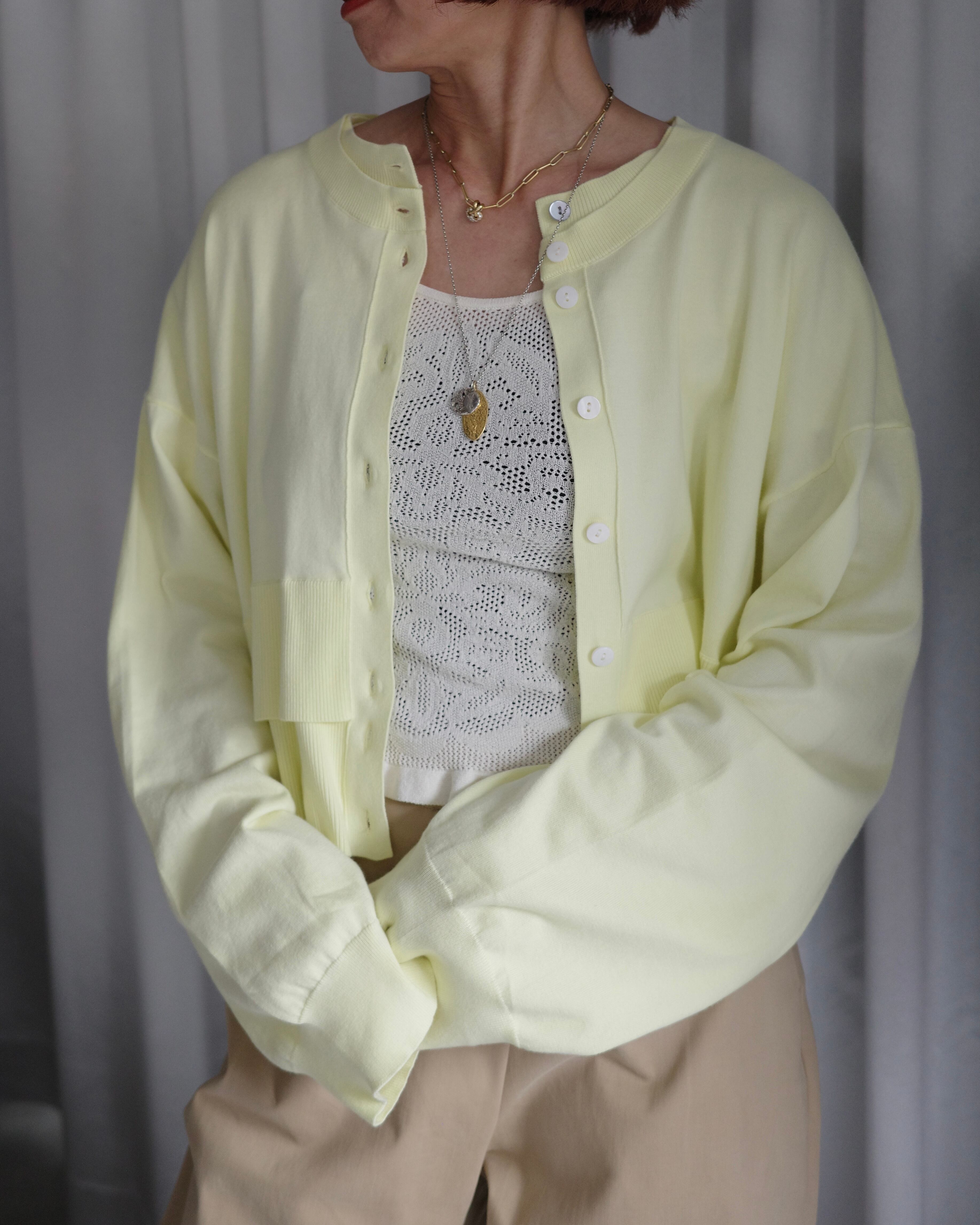 ニットスタイリングが難しい薄着になる季節にも使えるトップスとして着れるカーディガン。