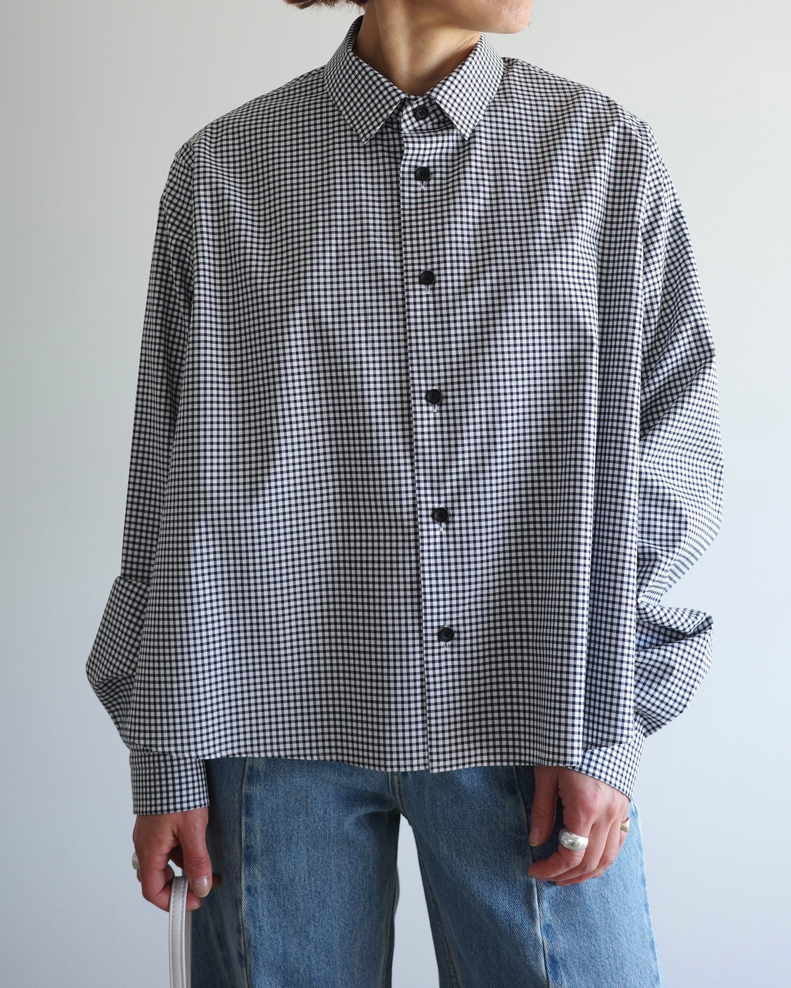 THOMAS MAISON社のブロード素材を使用したレギュラーカラーのAラインシャツです。軽やかで滑らかな素材感が特徴で、動きやすく快適な着心地を叶えます。シンプルな前立てとドロップショルダーで肩回りに柔らかな印象を添え、裾に向かって広がるAラインが女性らしい立体感を演出します。襟元はレギュラーカラーで洗練された印象を保ち、長めの袖丈が自然にブラウジングして立体感を生み出します。軽やかで上質な素材感と美しいシルエットが、1枚でもレイヤードスタイルでも上品に映える、THE RERACSならではのシャツです。