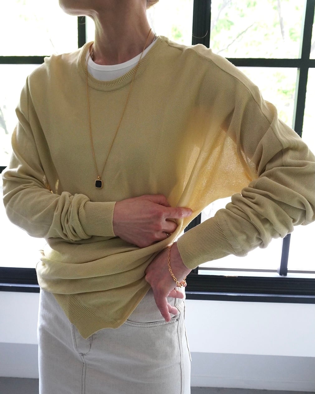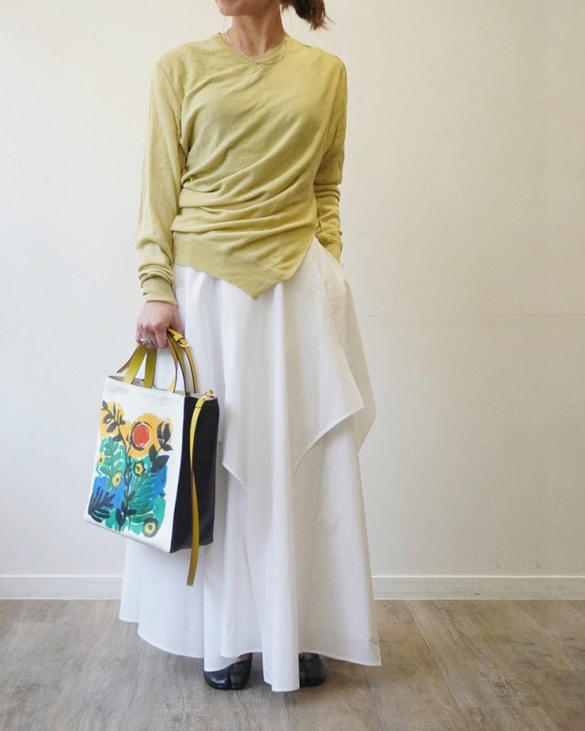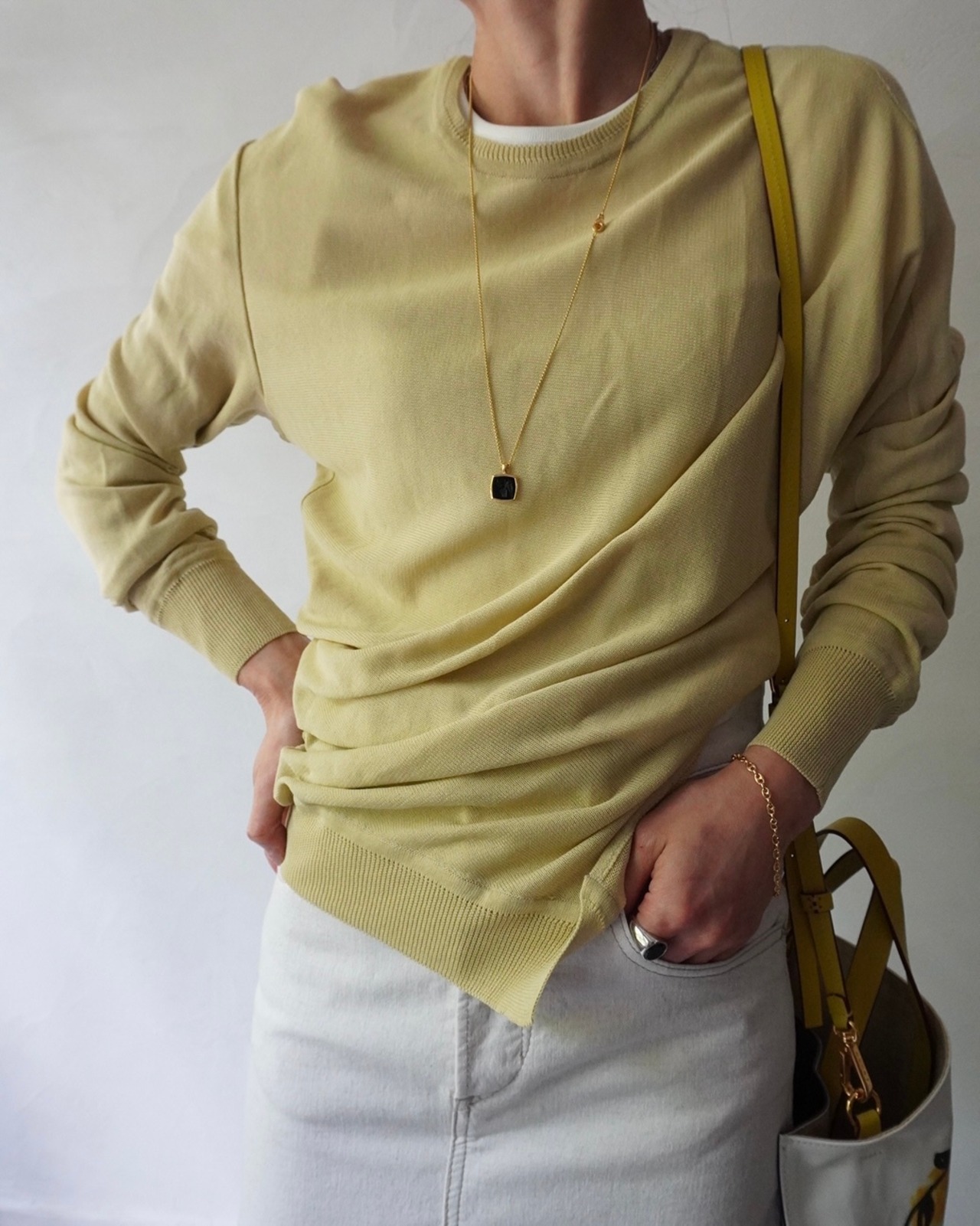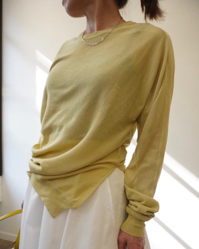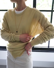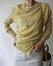 春の日差しのような柔らかなイエローのニットは肌触りも滑らか。一見ベーシックなようでいてウエストのサイドに施されたスリットとタックのディティールが特徴。シンプルなスタイリングに溶け込み、そして引き立たせてくれる一枚です。