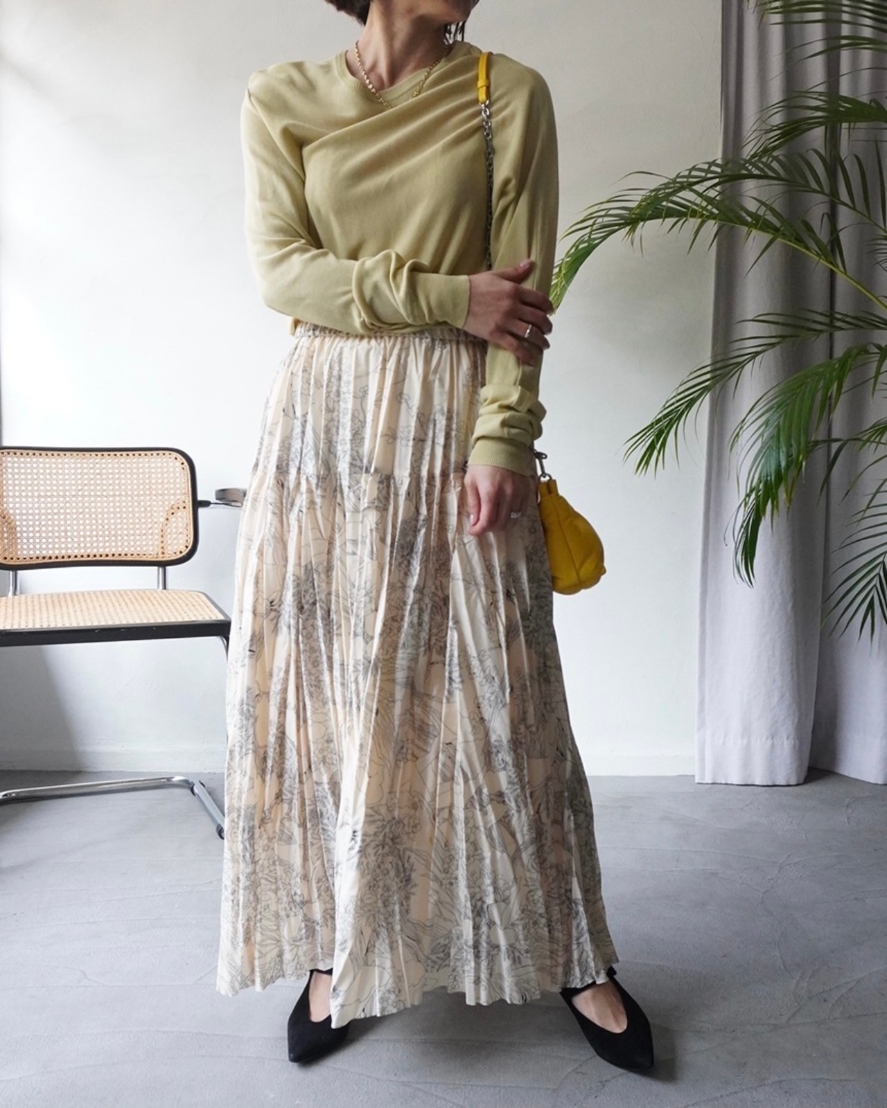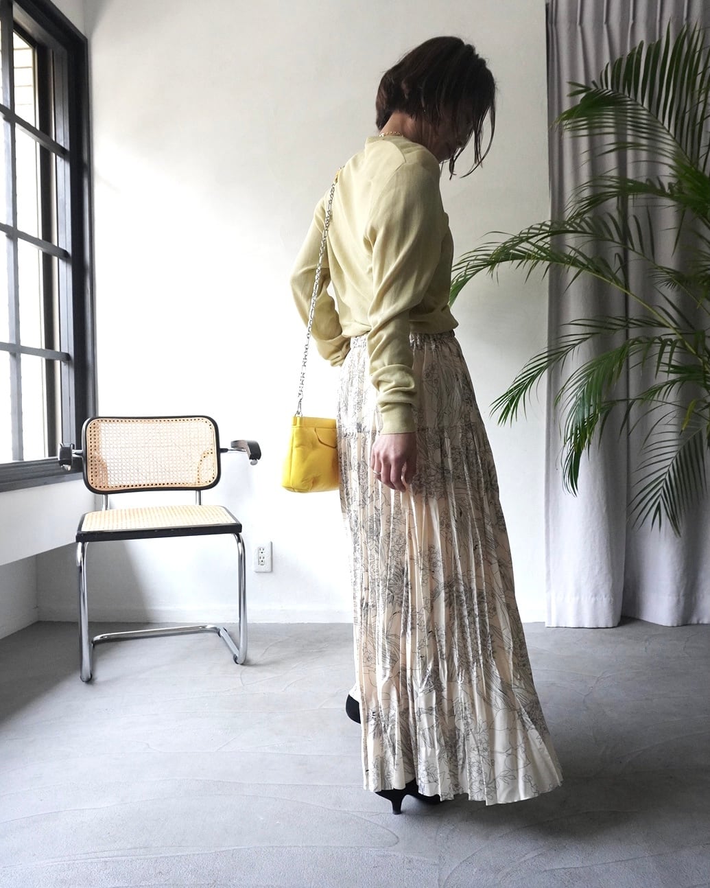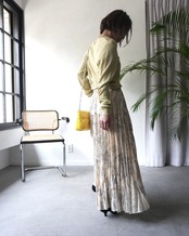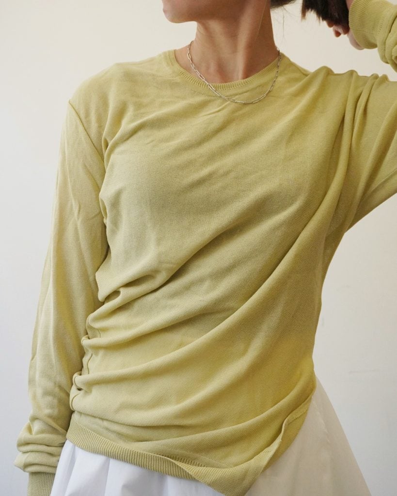 春の日差しのような柔らかなイエローのニットは肌触りも滑らか。一見ベーシックなようでいてウエストのサイドに施されたスリットとタックのディティールが特徴。シンプルなスタイリングに溶け込み、そして引き立たせてくれる一枚です。