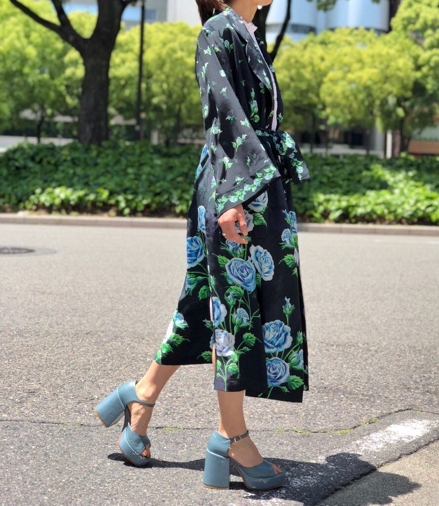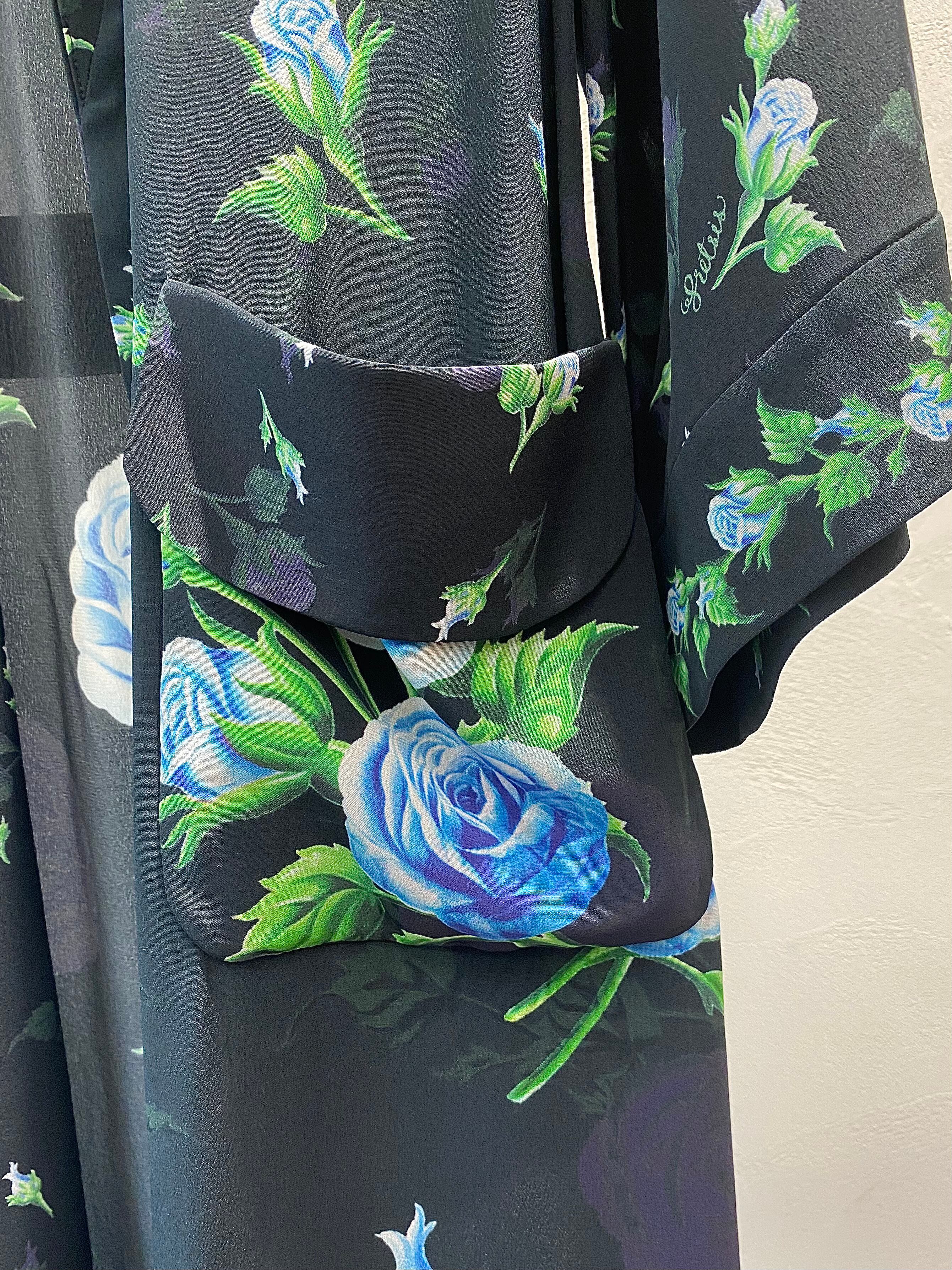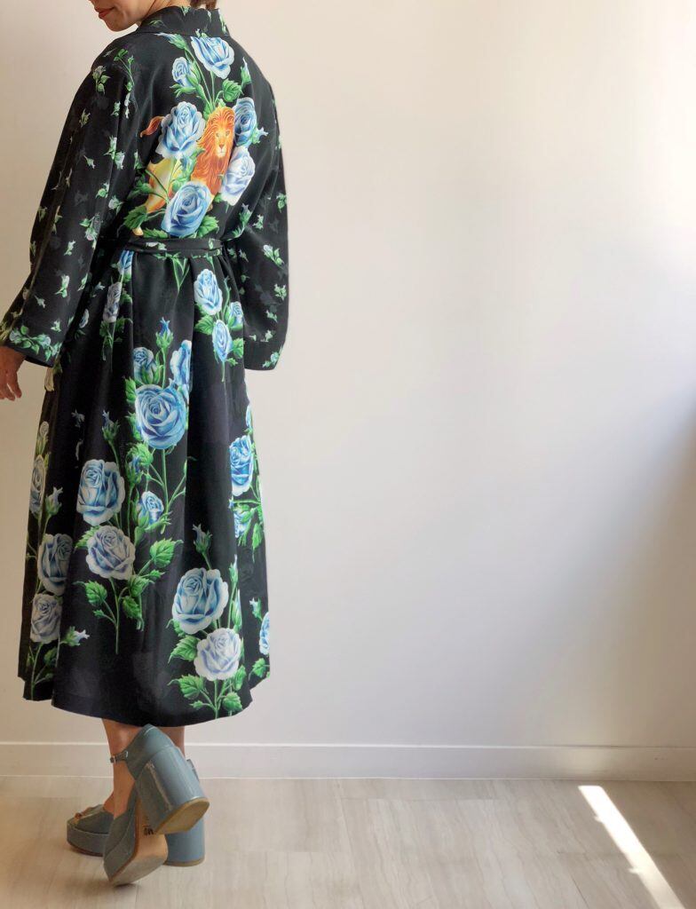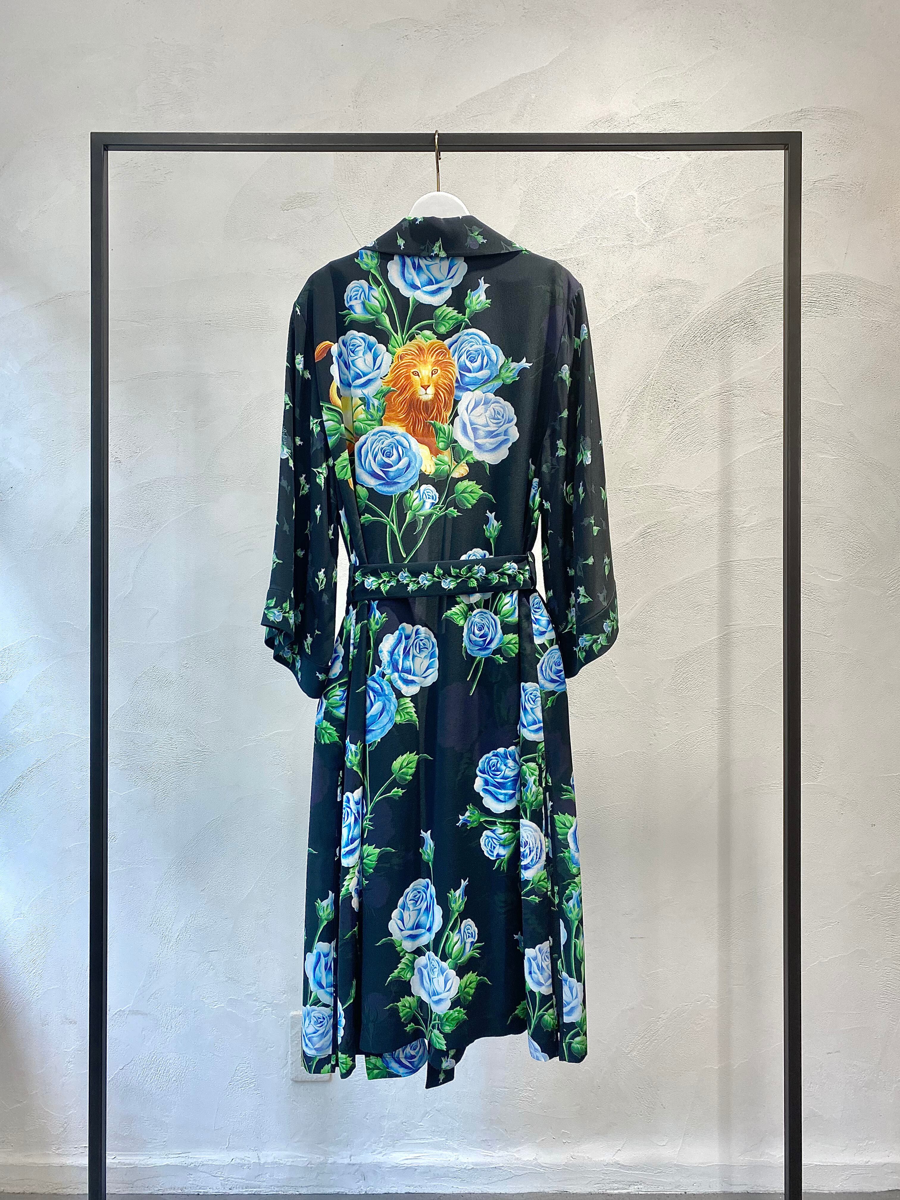 鮮やかなデジタルプリントで描かれた青薔薇は裾に向かって大輪に。背中のレオが印象的なシルクのガウンコートです。