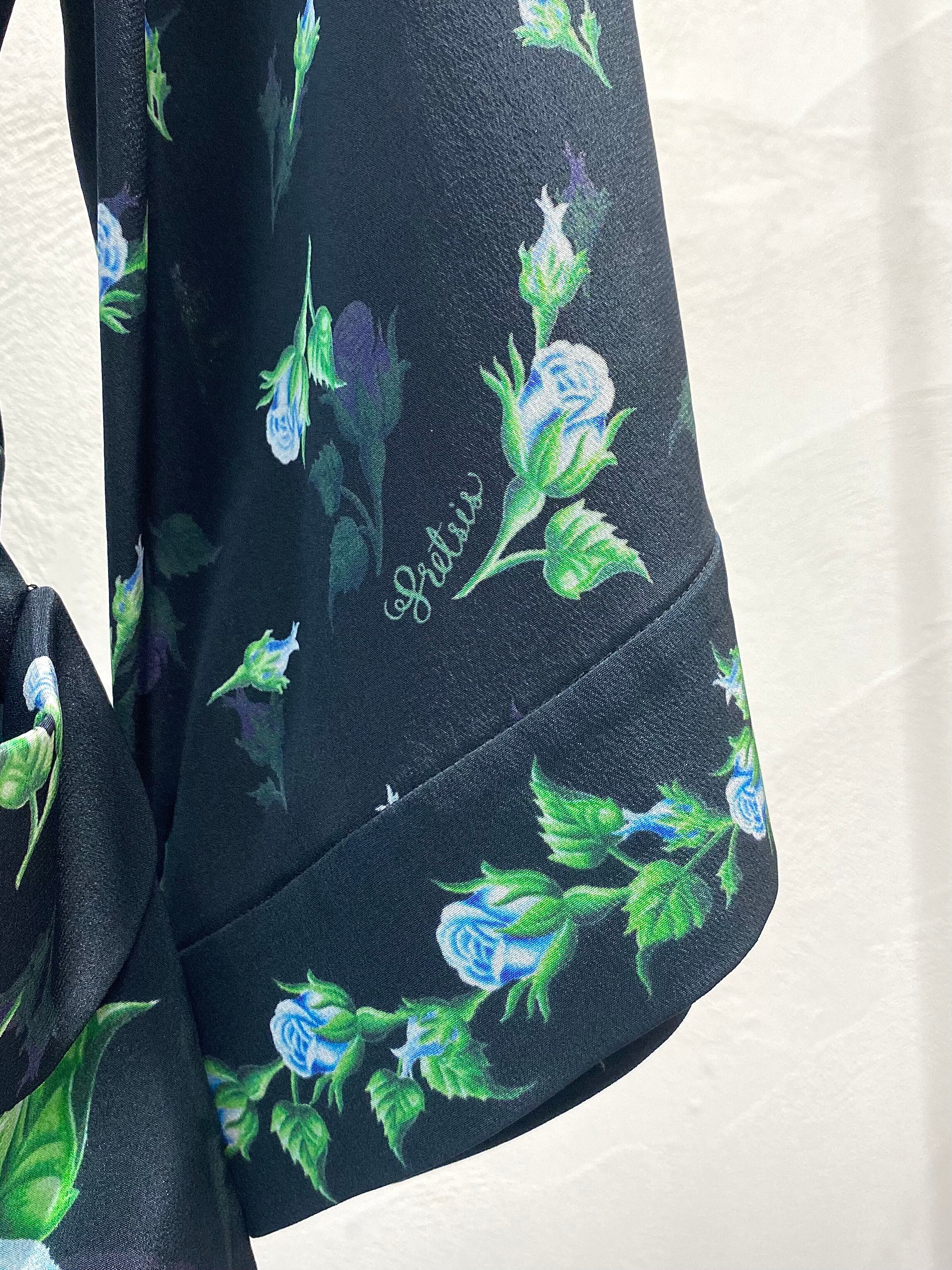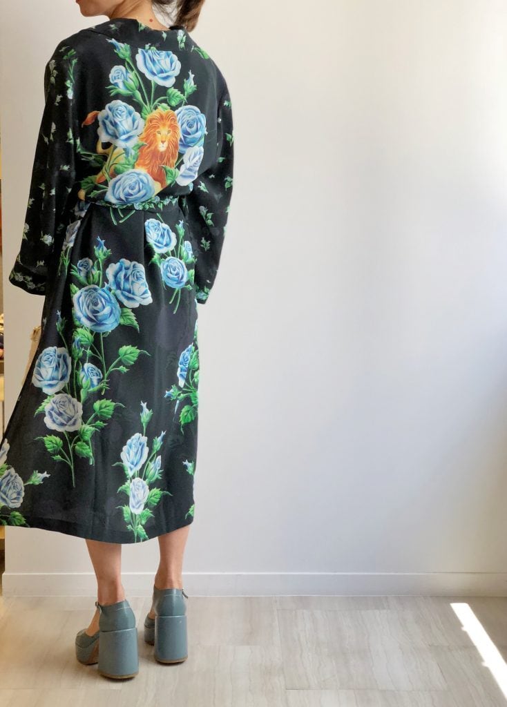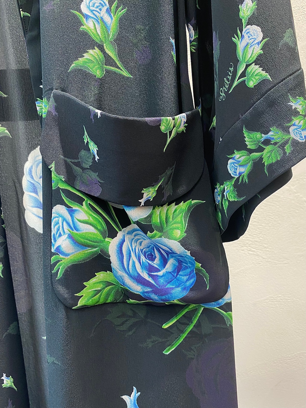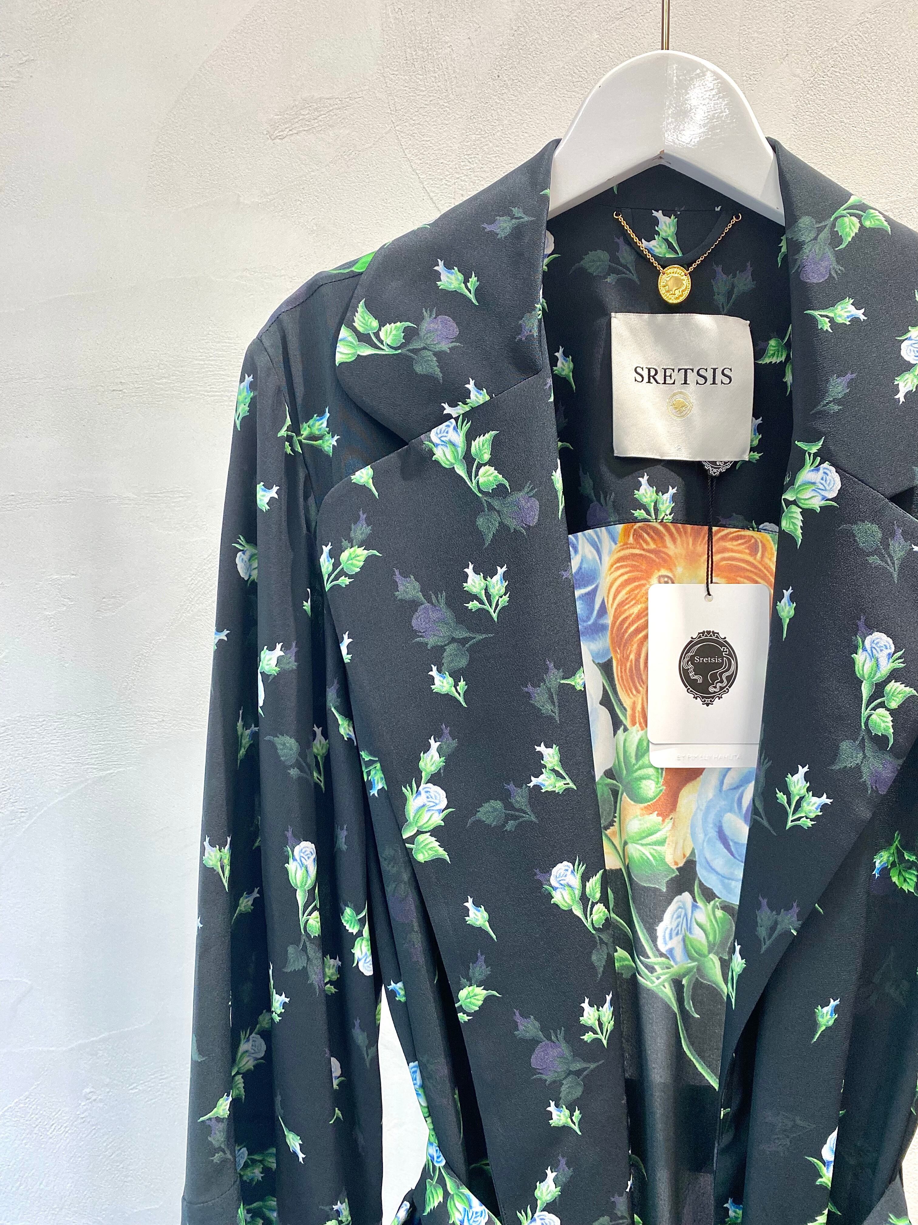 鮮やかなデジタルプリントで描かれた青薔薇は裾に向かって大輪に。背中のレオが印象的なシルクのガウンコートです。