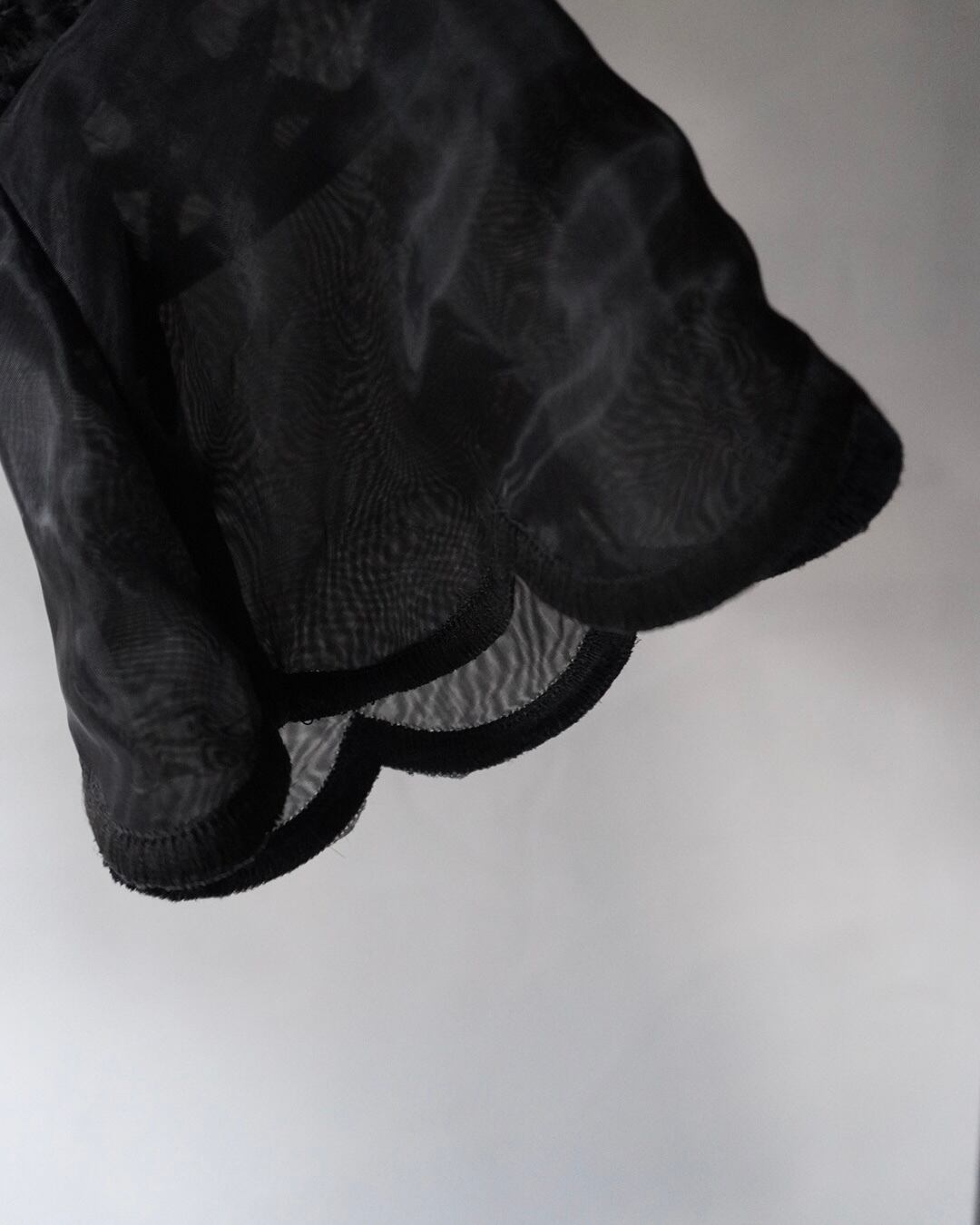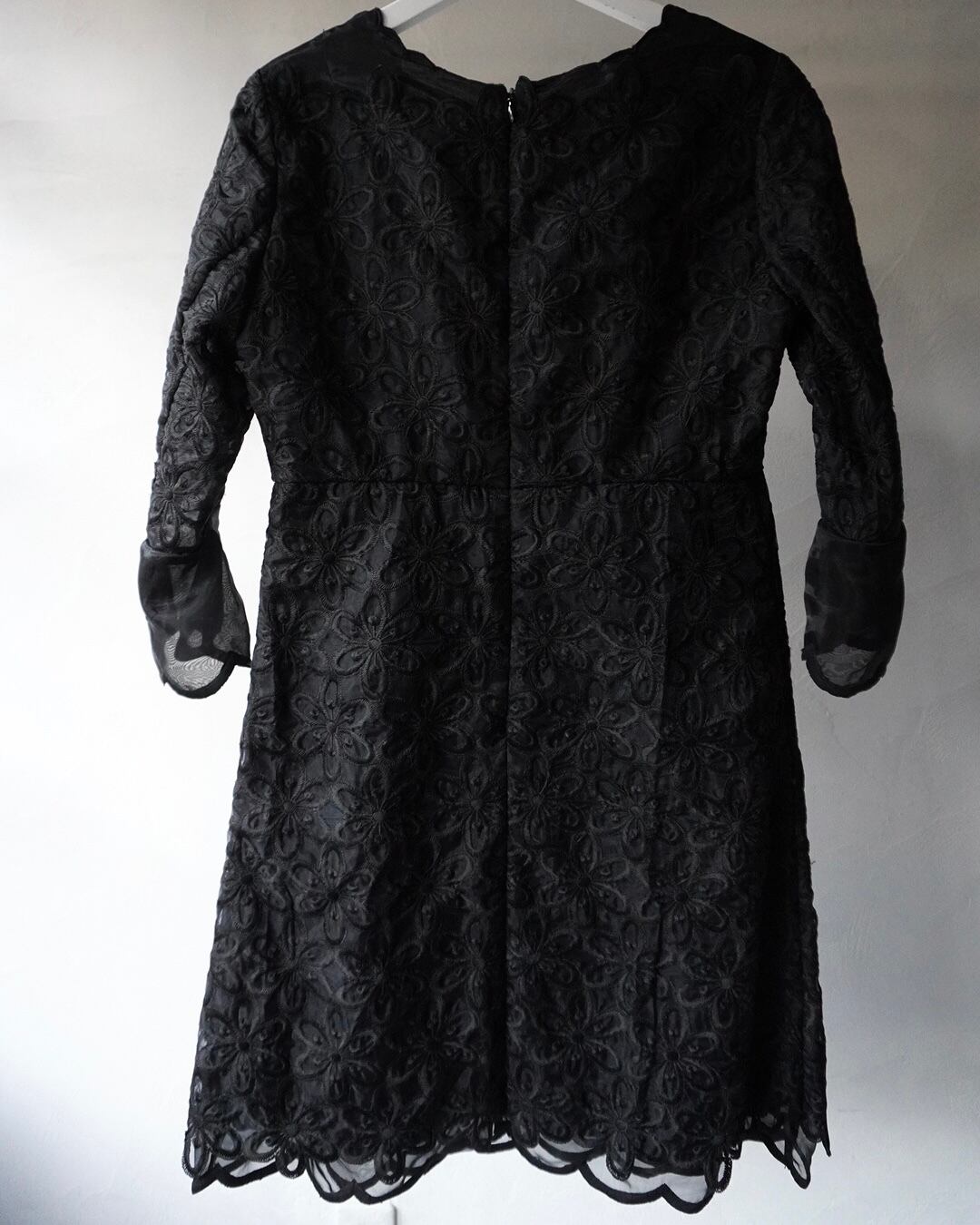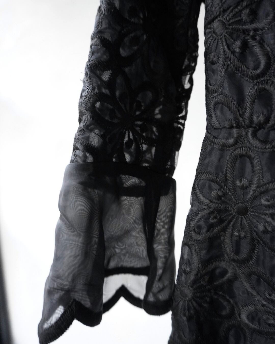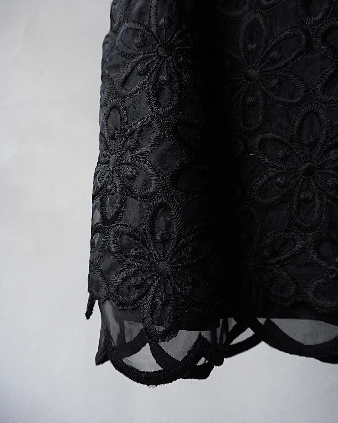 袖口や胸元、裾のスカラップ、同色で施されたフラワー刺繍。