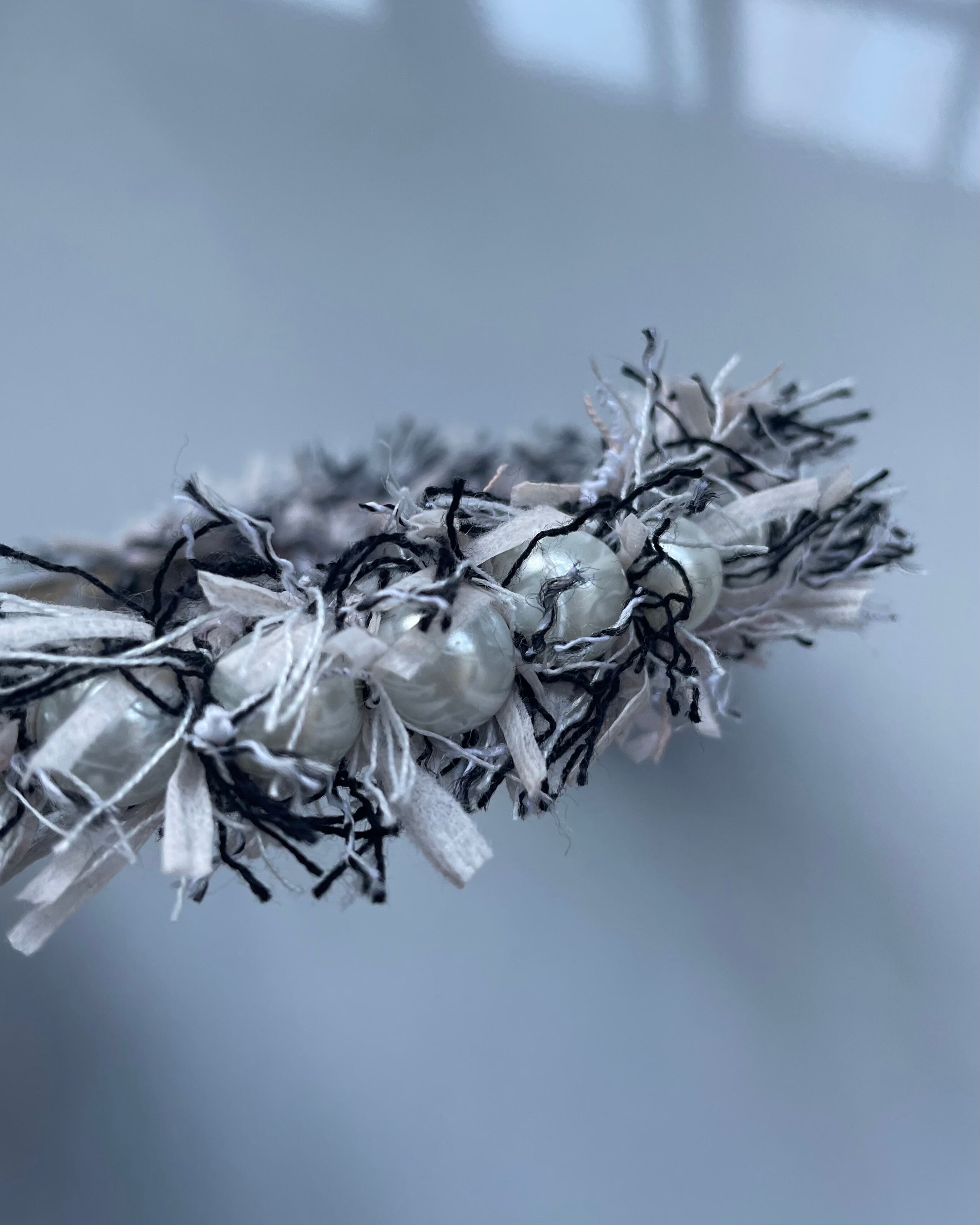 ファブリックがフェザーのように散りばめられたカチューシャ。